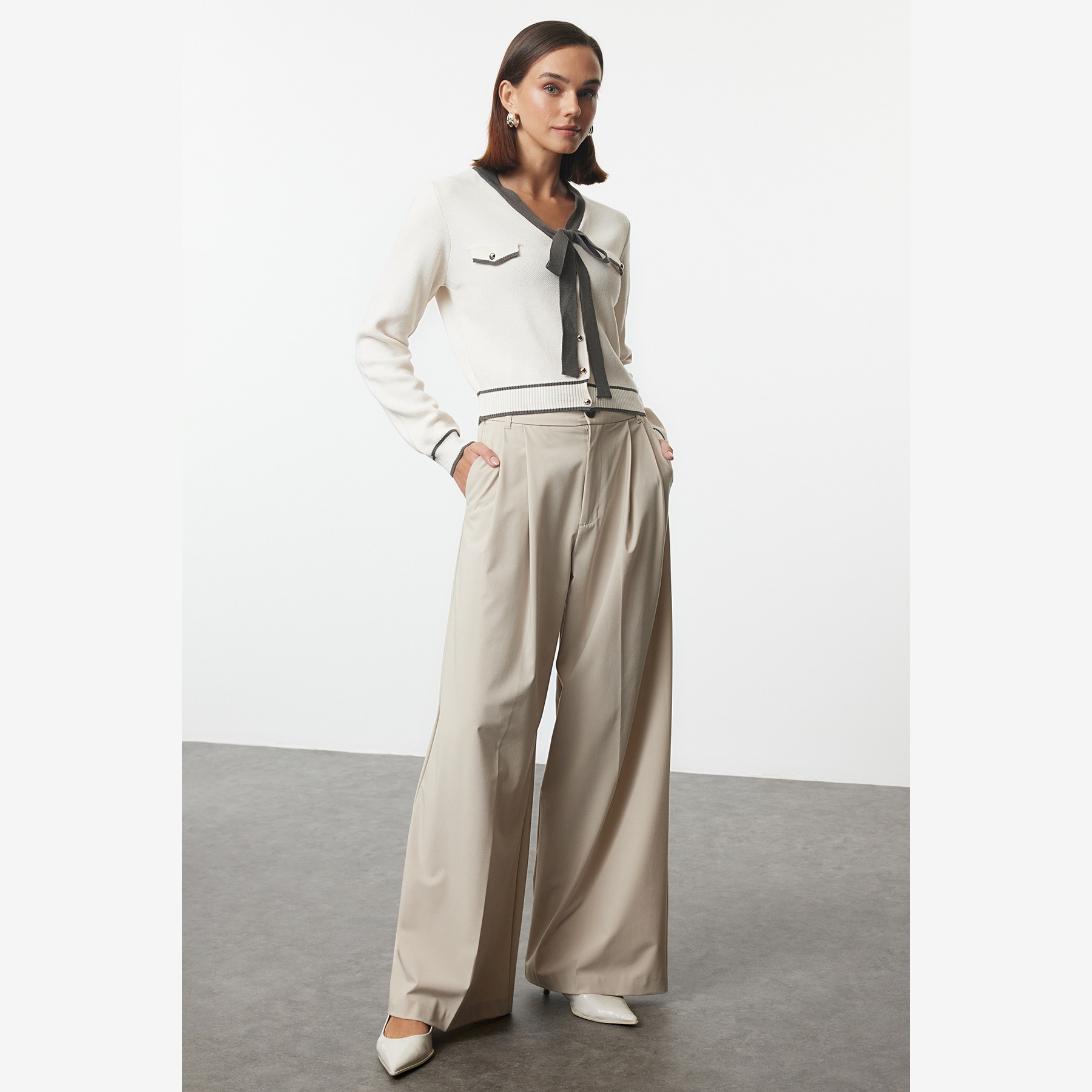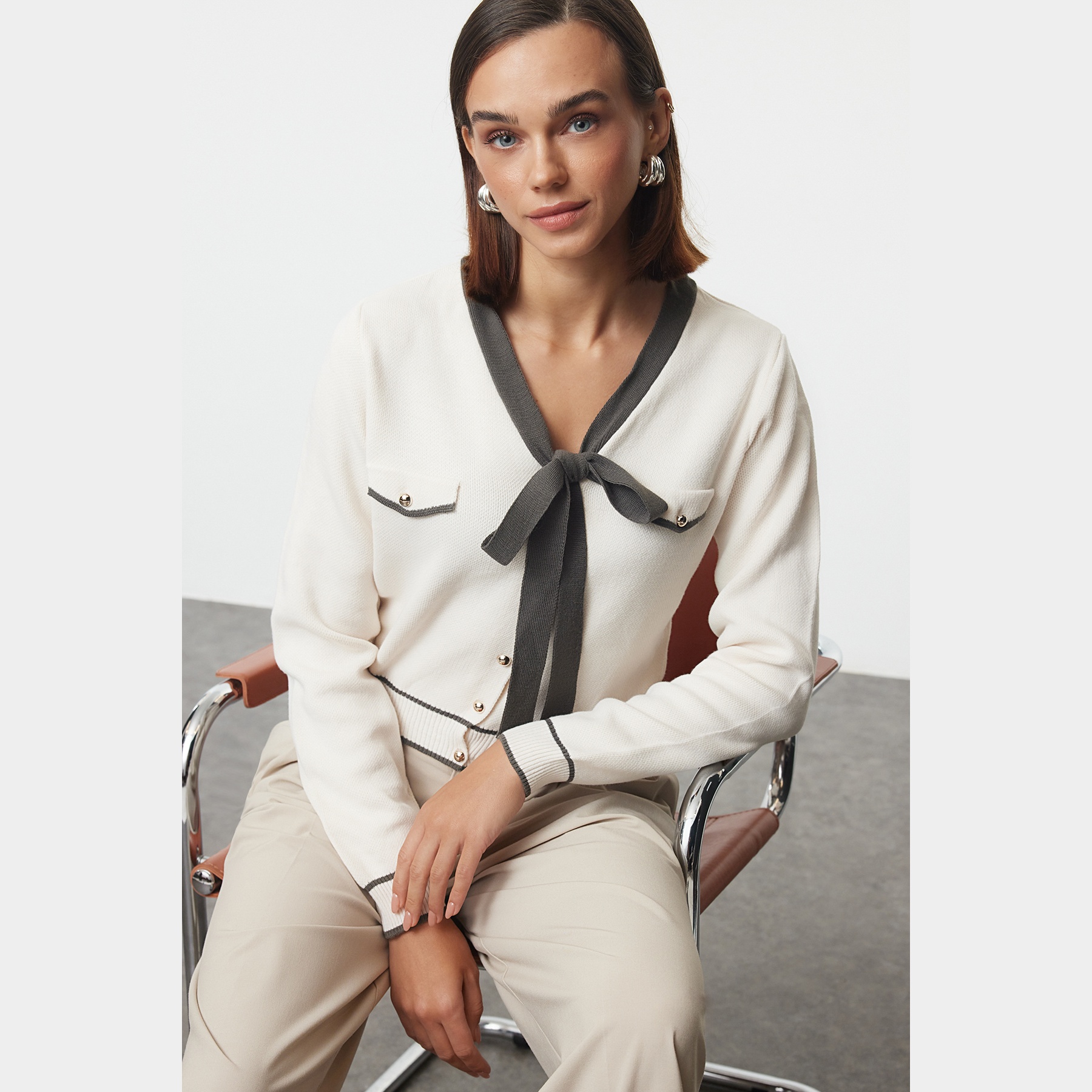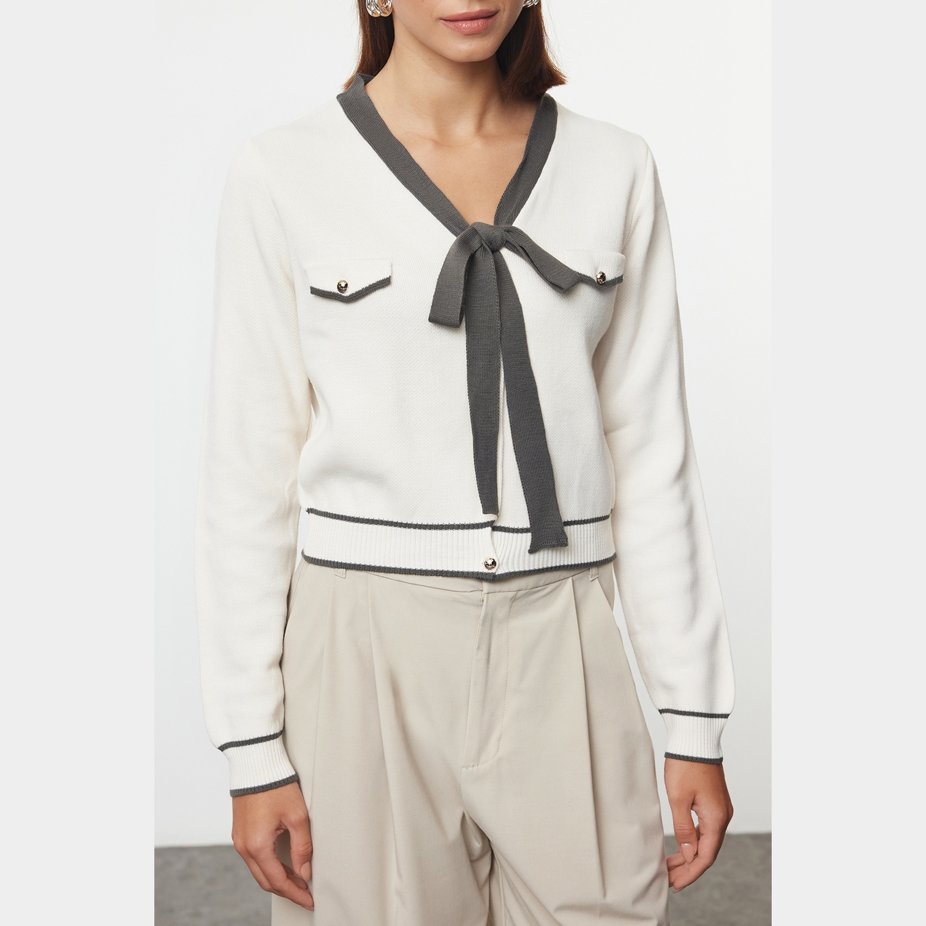 كارديغان نسائي بلون رمادي بتصميم لوني متداخل، مصنوع من خامة تريكو محاكة بالكامل من الأكريليك، يتميز بملمس متوسط السماكة وتفاصيل فيونكة أنثوية تضيف لمسة مرحة ناعمة. يأتي بقصة منتظمة (Regular) وياقة V وأكمام طويلة، ما يجعله خيارًا مثاليًا للإطلالات اليومية في فصل الشتاء.