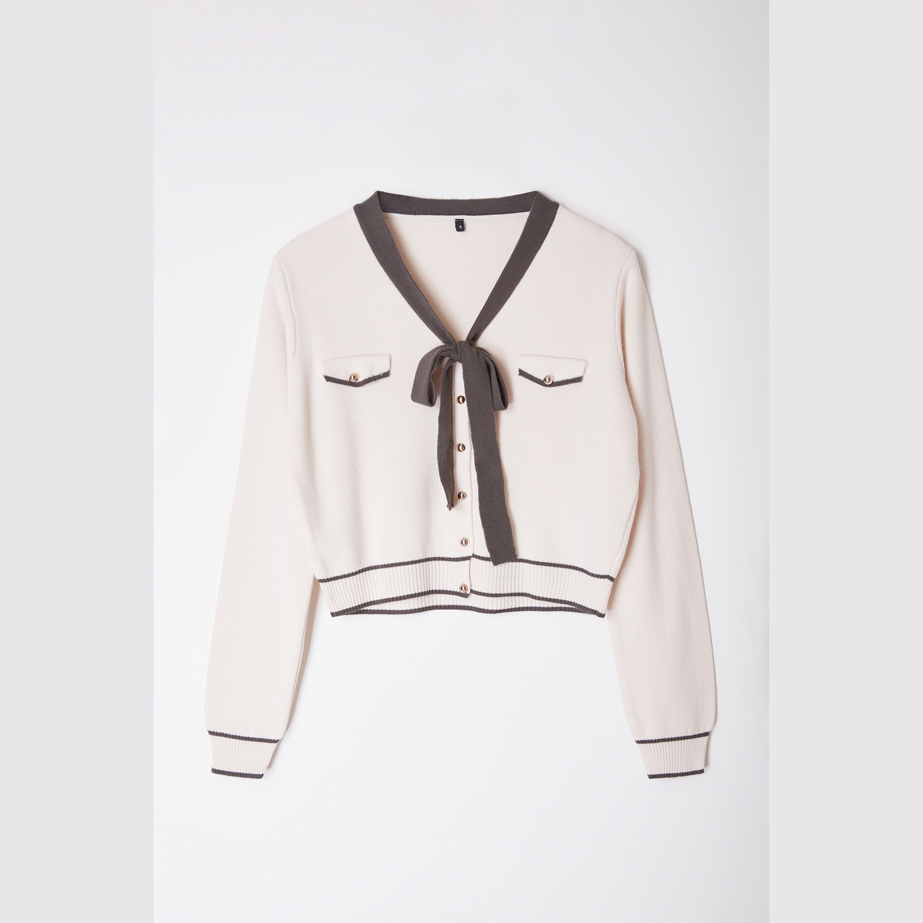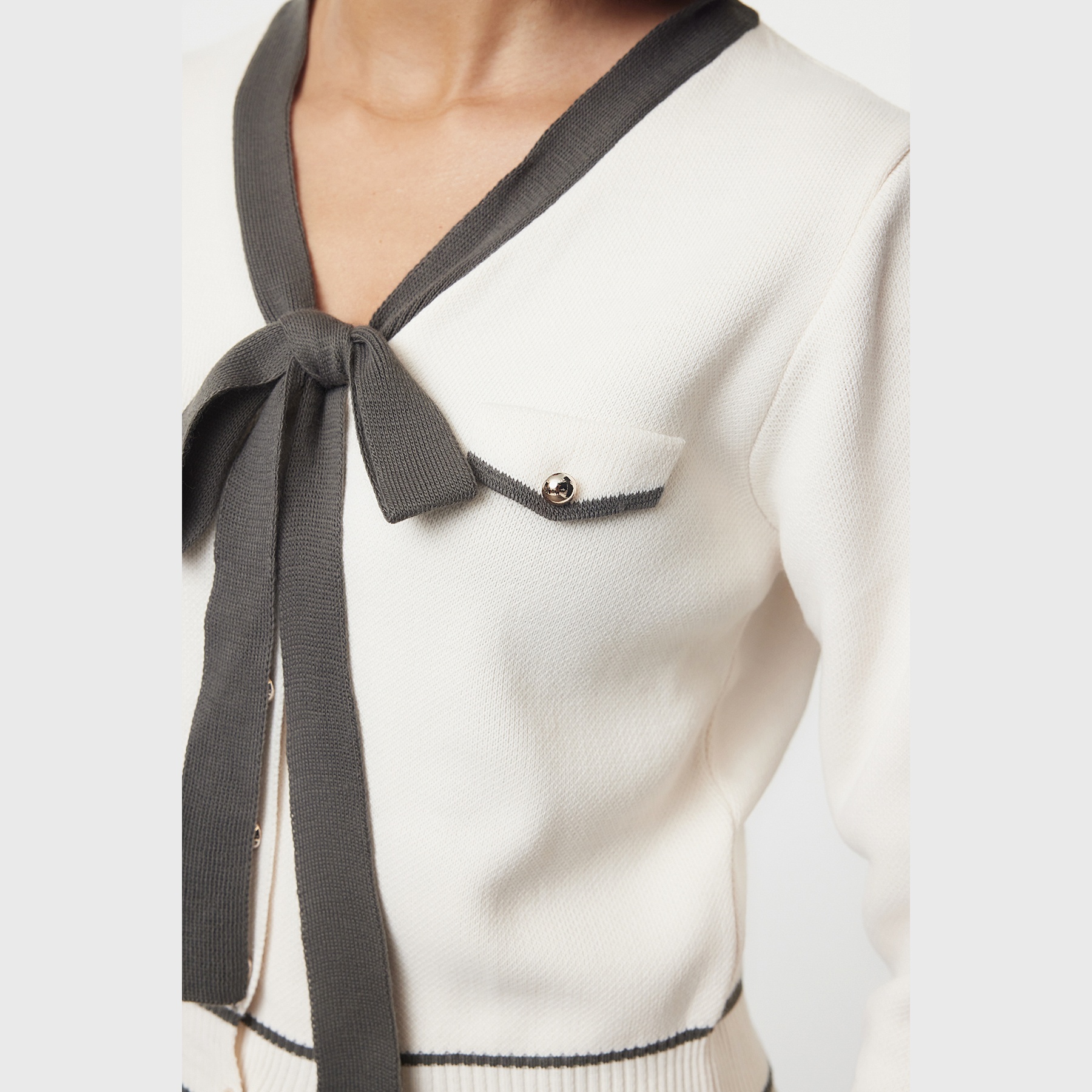 كارديغان نسائي – رمادي بتفاصيل فيونكة ونقشة لونية (أنوثة ناعمة بلمسة مرحة)