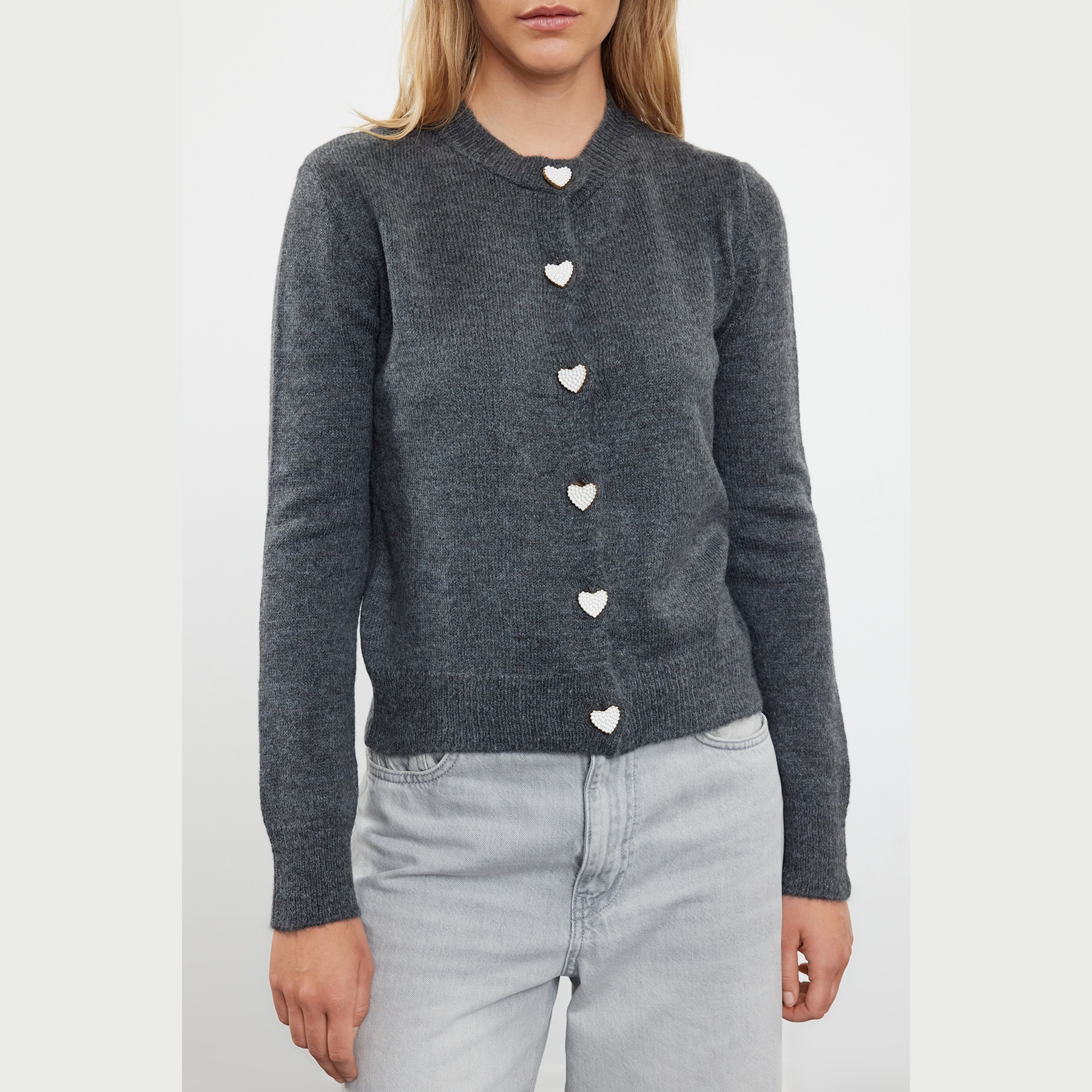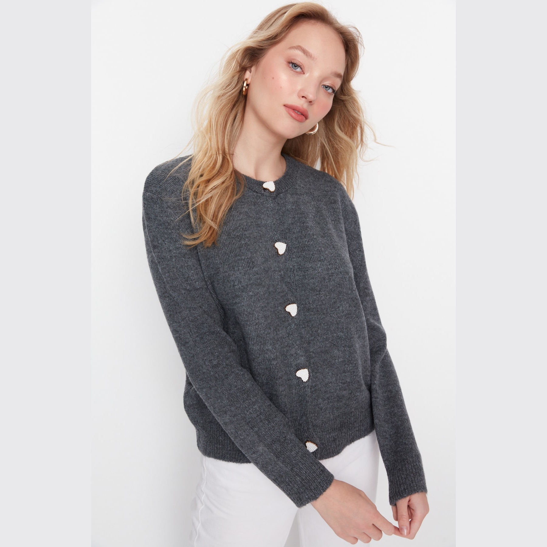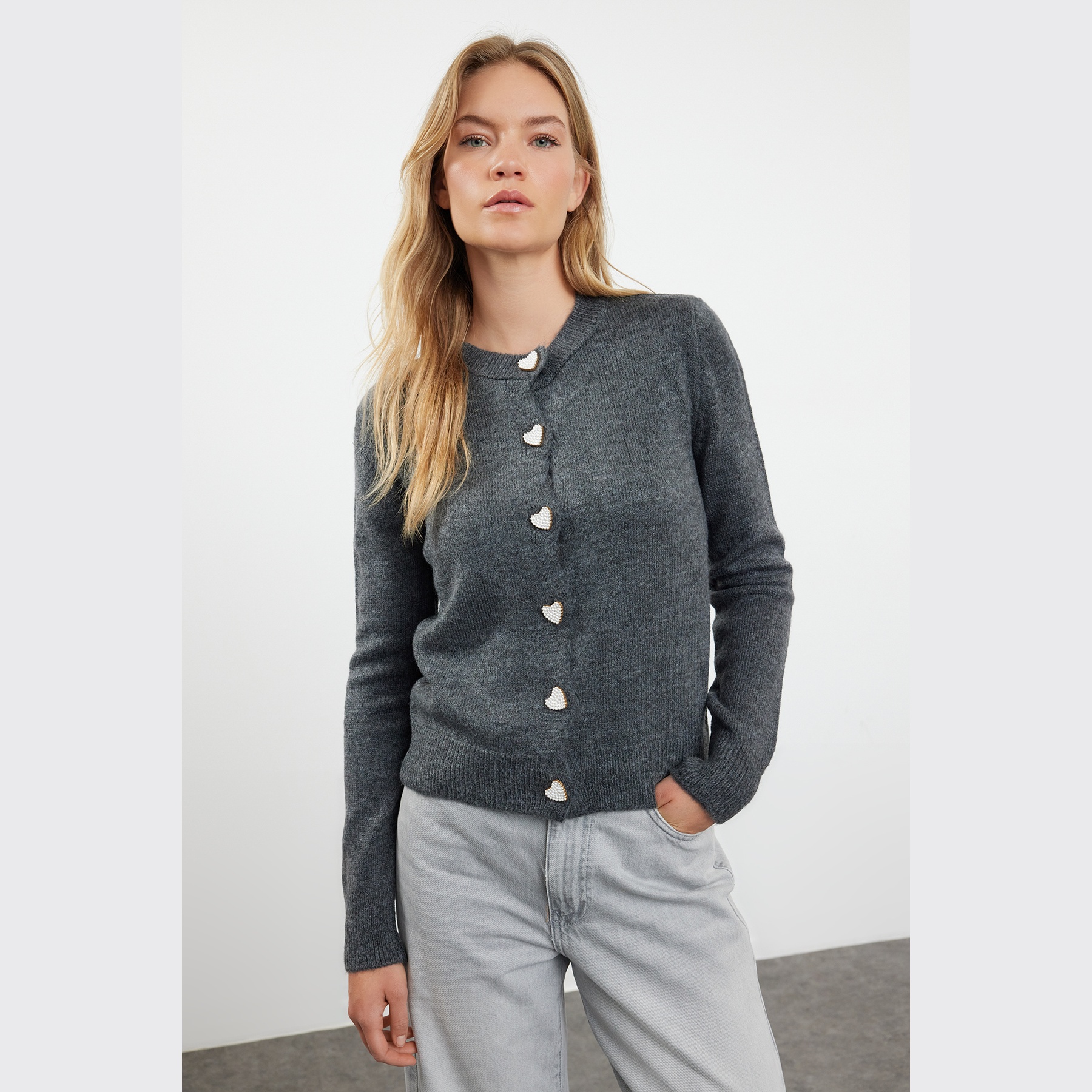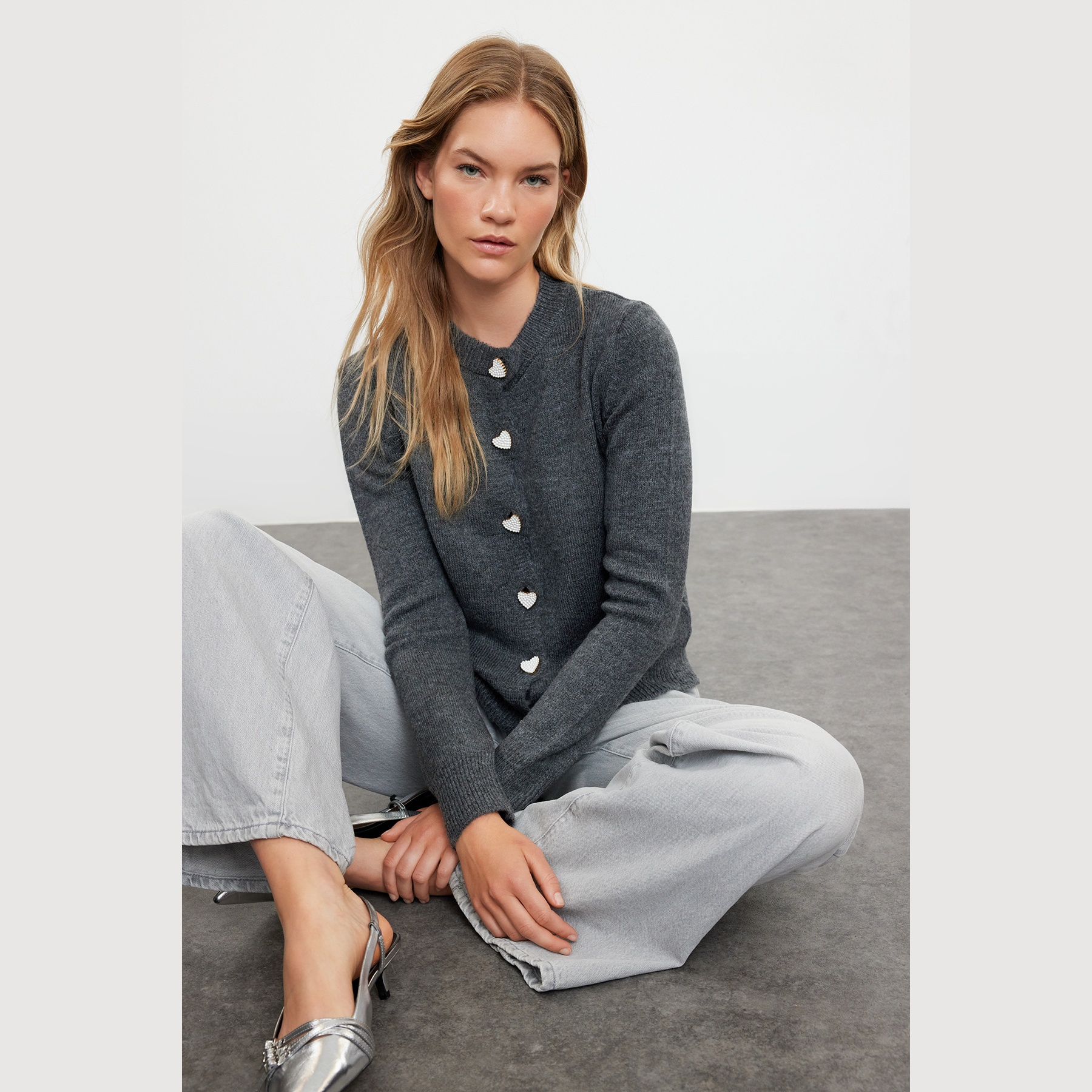 كارديغان نسائي – رمادي بملمس ناعم وأزرار مجوهرات بتصميم يشبه السترة (أناقة شتوية بلمسة فاخرة)