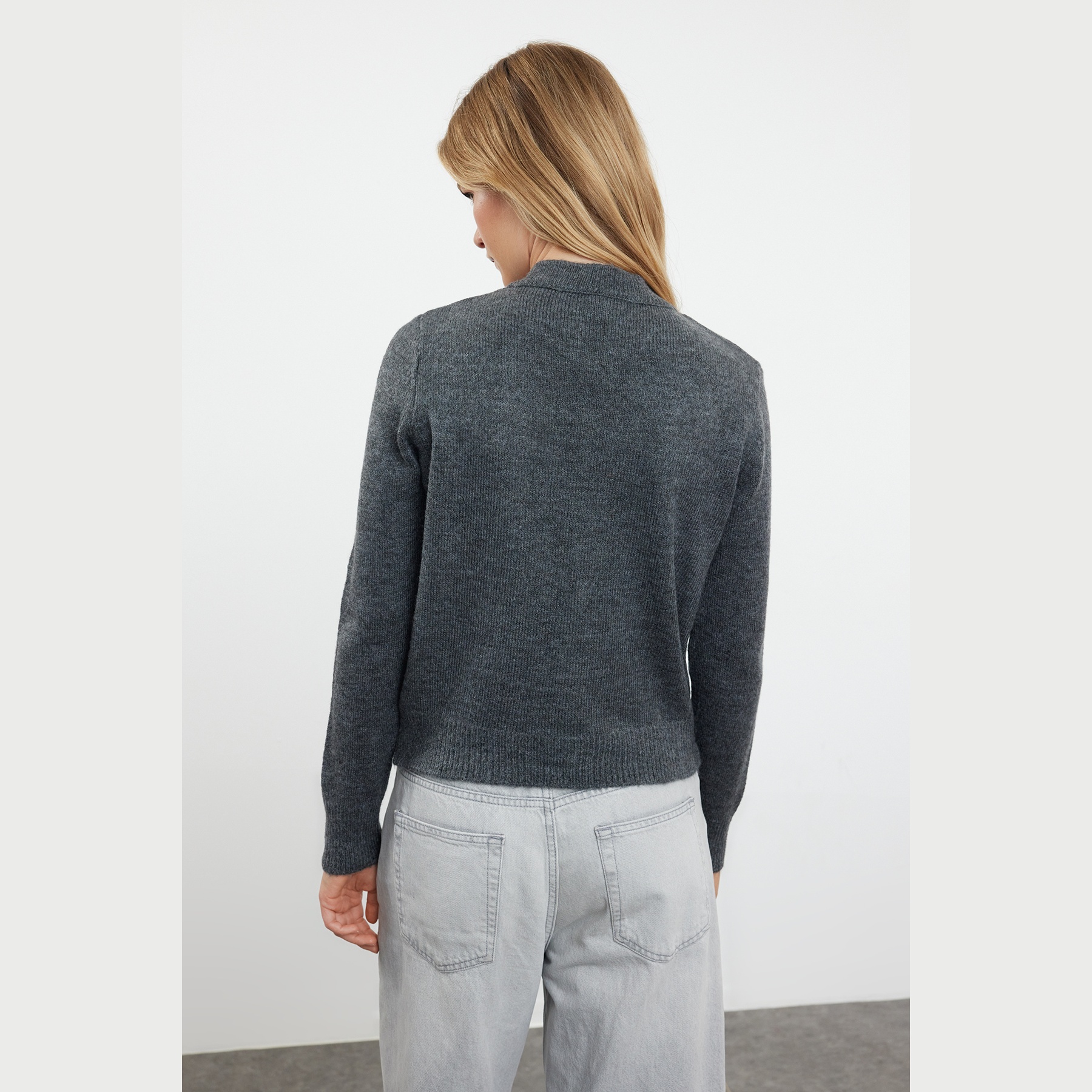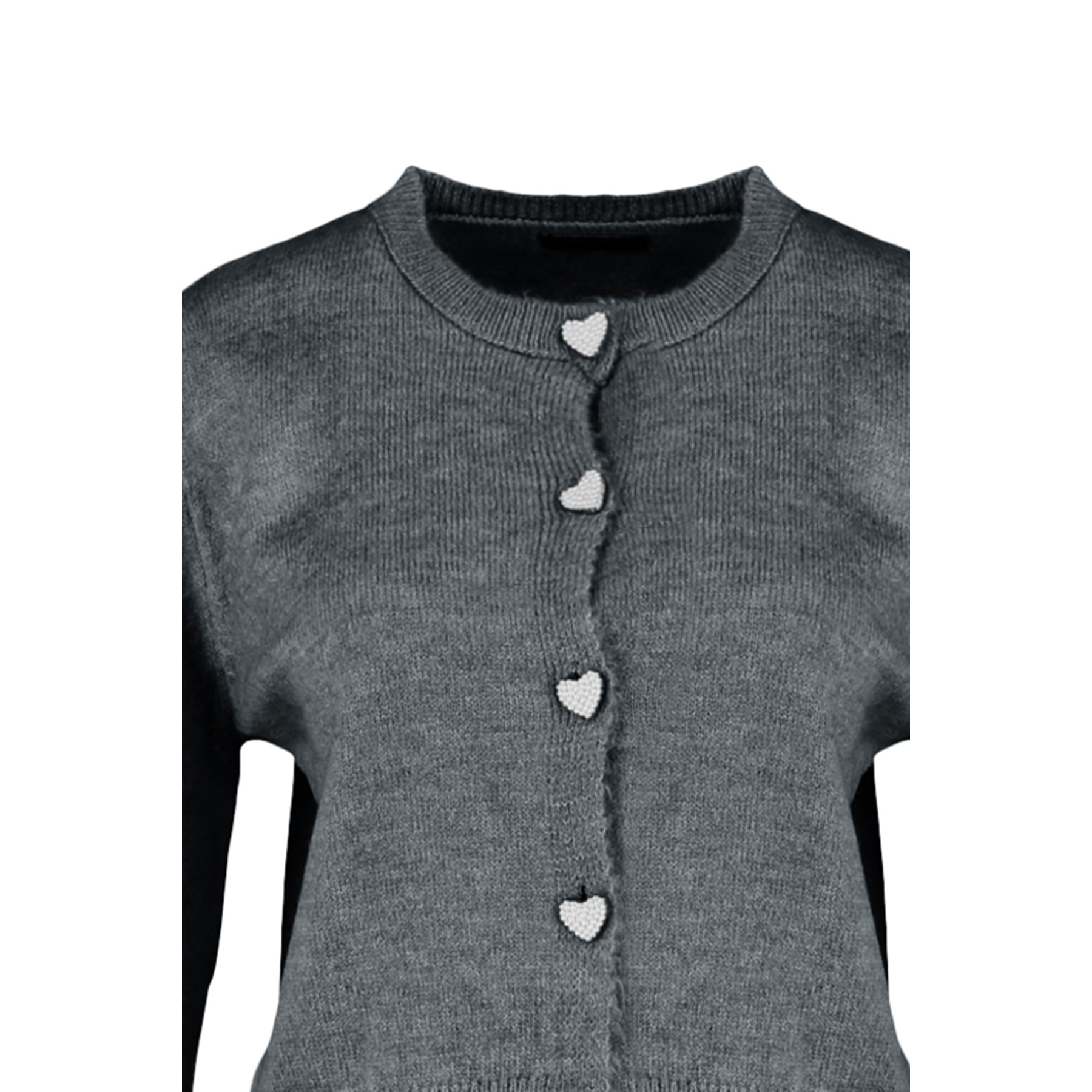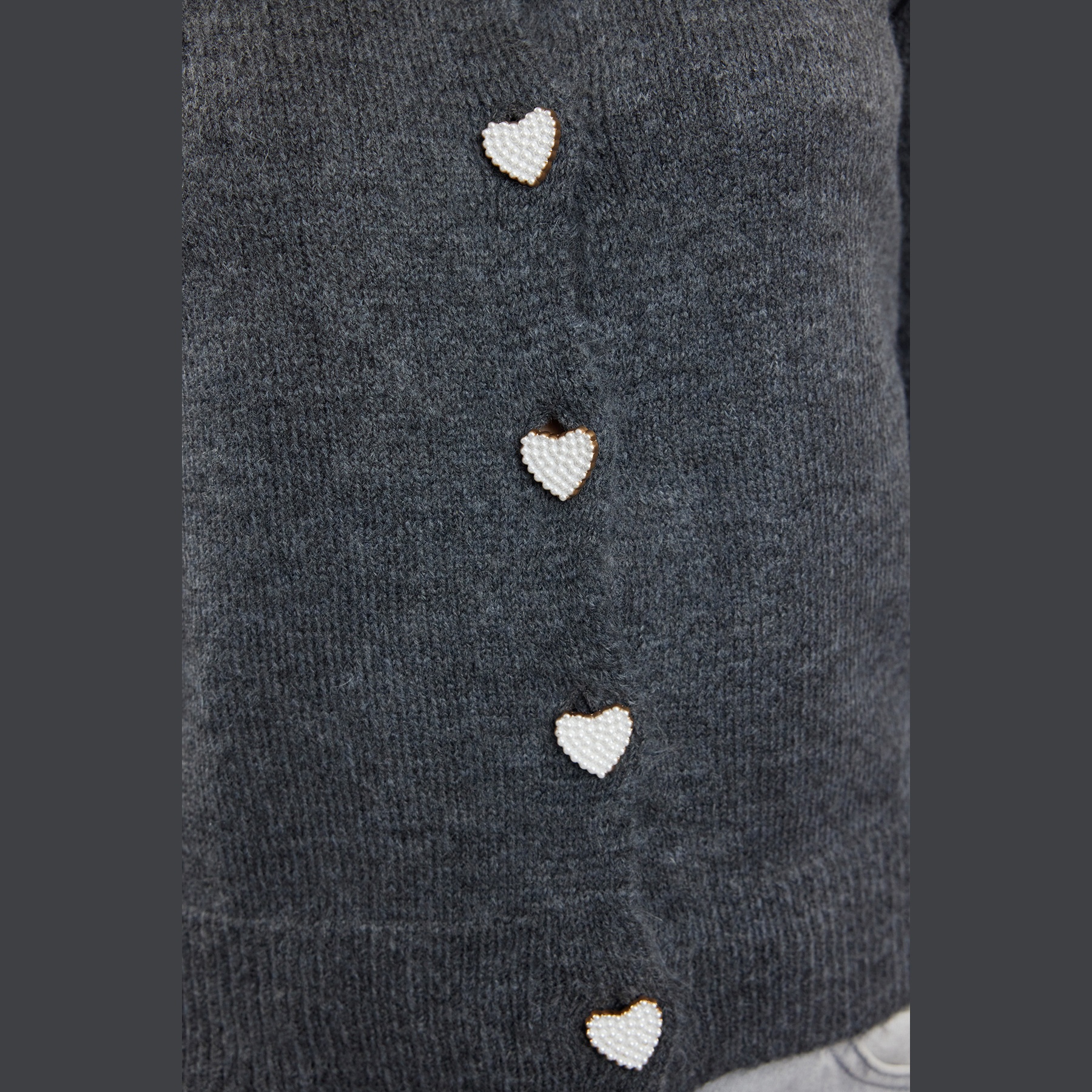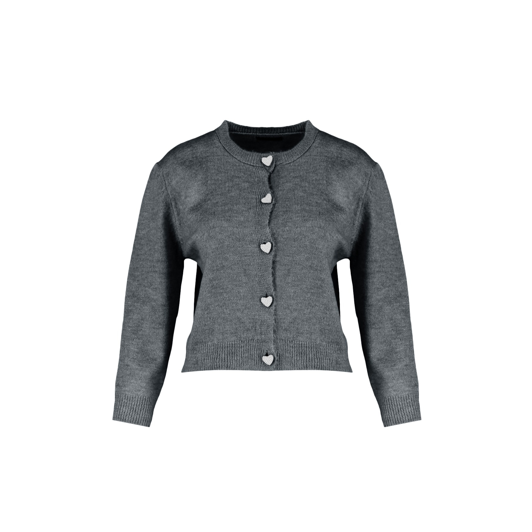 كارديغان نسائي – رمادي بملمس ناعم وأزرار مجوهرات بتصميم يشبه السترة (أناقة شتوية بلمسة فاخرة)