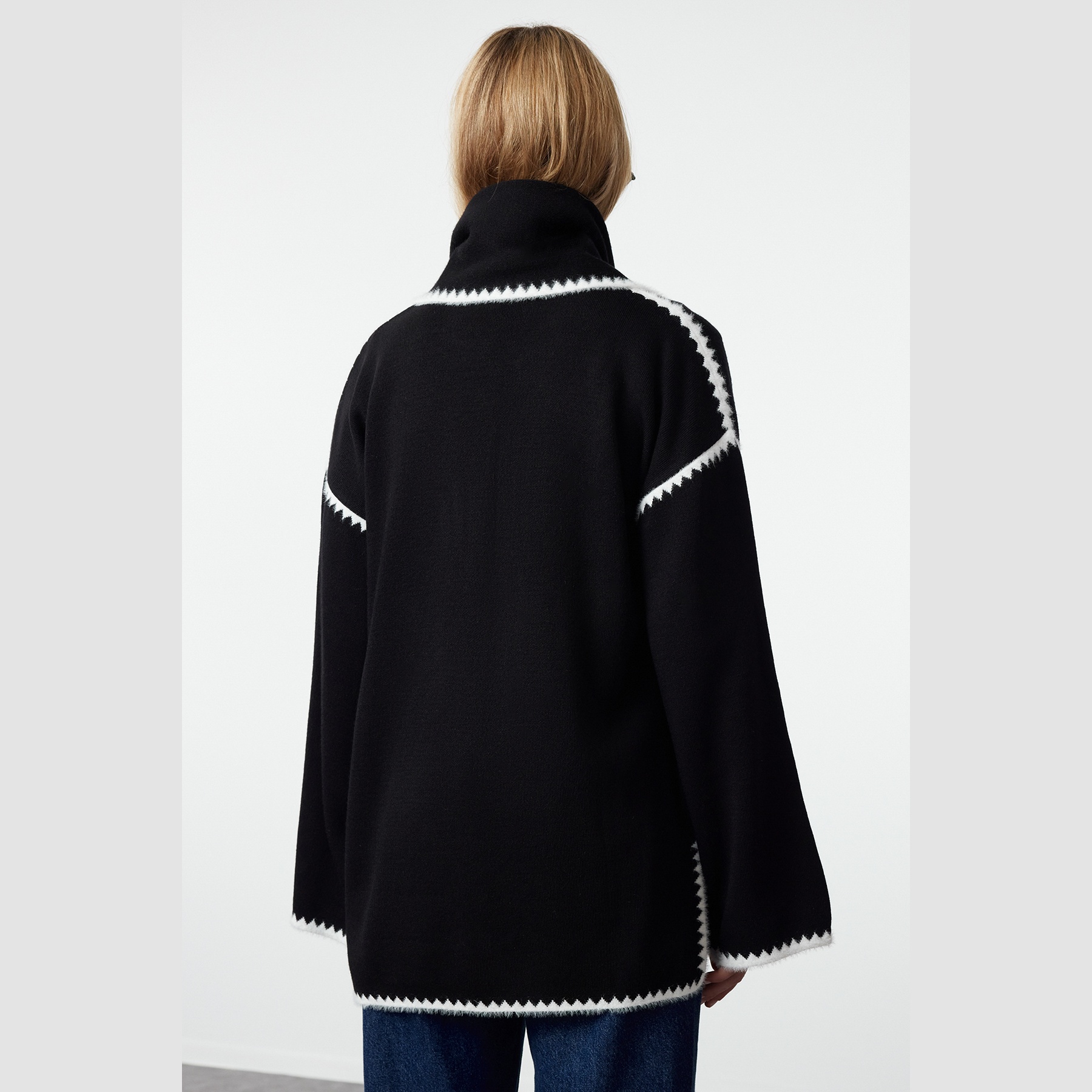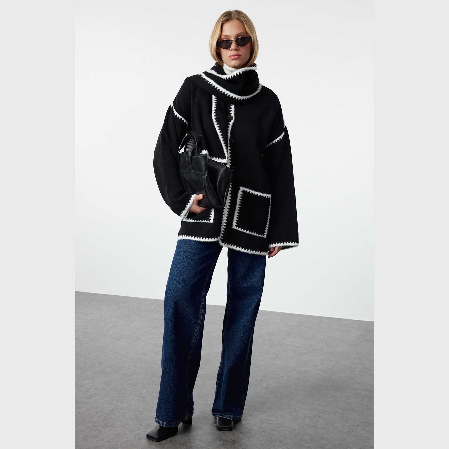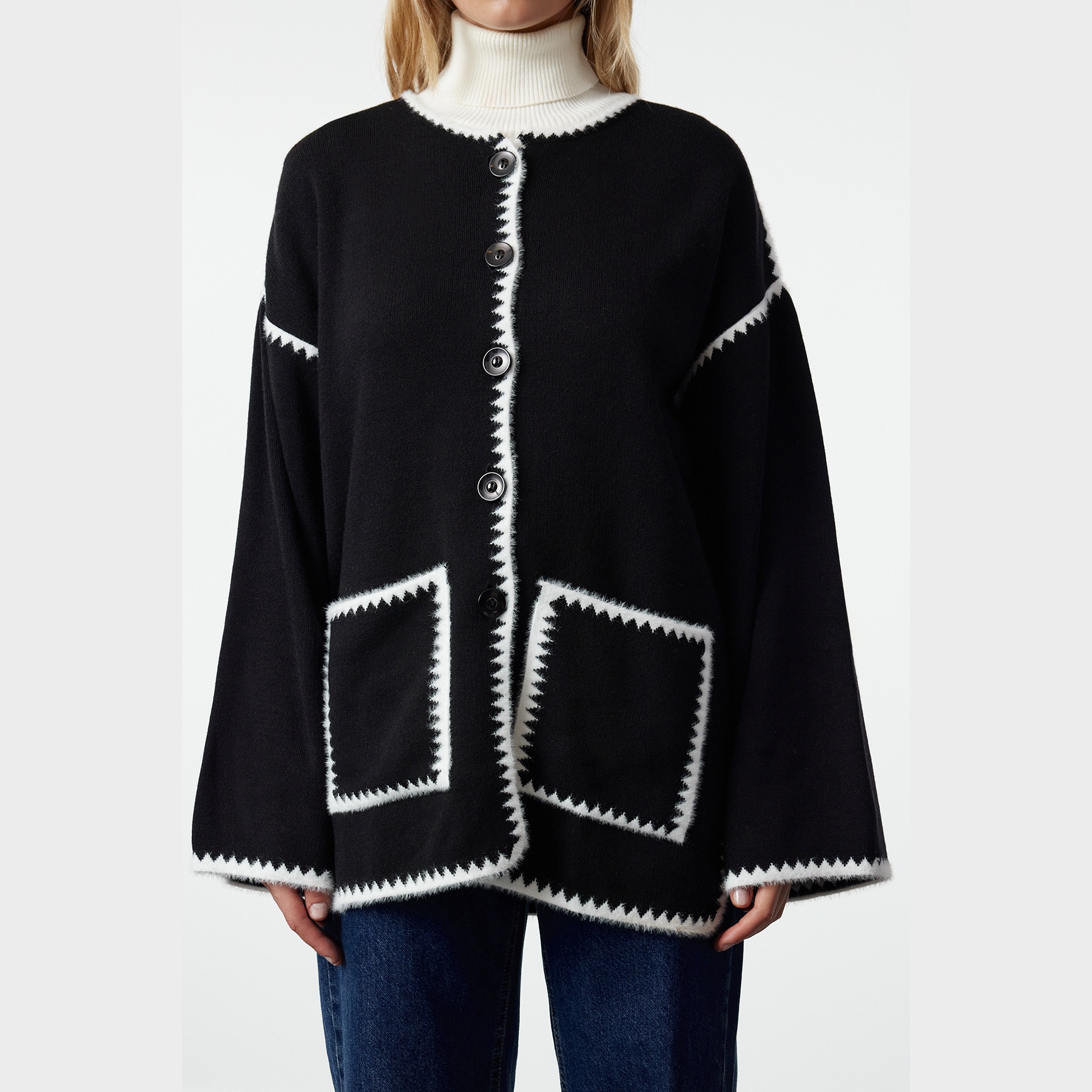 كارديغان نسائي بلون أسود أنيق، مصنوع من خامة تريكو محاكة بالكامل من الأكريليك، يتميز بملمس ناعم وسُمك سميك مثالي للأجواء الباردة. يأتي بقصة واسعة وياقة دائرية وأكمام طويلة بتصميم كتف منخفض، ويُرفق معه وشاح بنفس الخامة واللون، ما يمنح إطلالة متكاملة تجمع بين الدفء والأناقة.