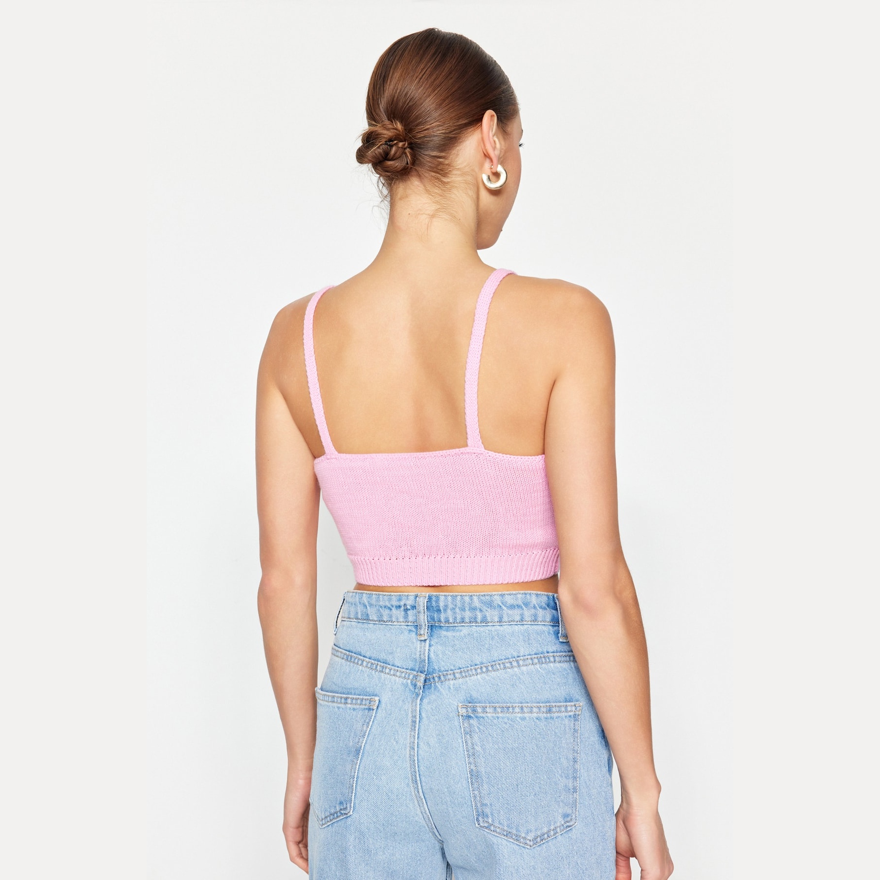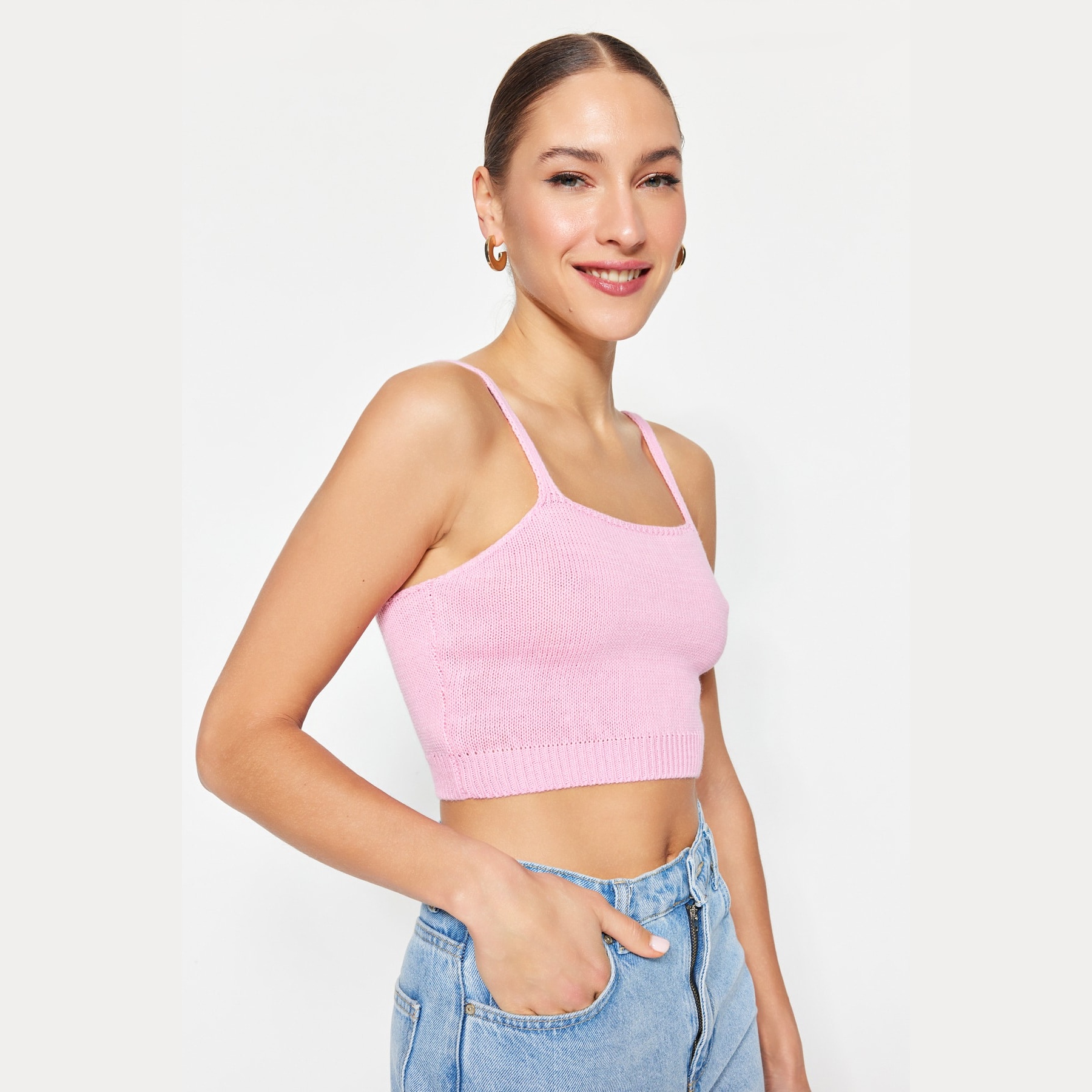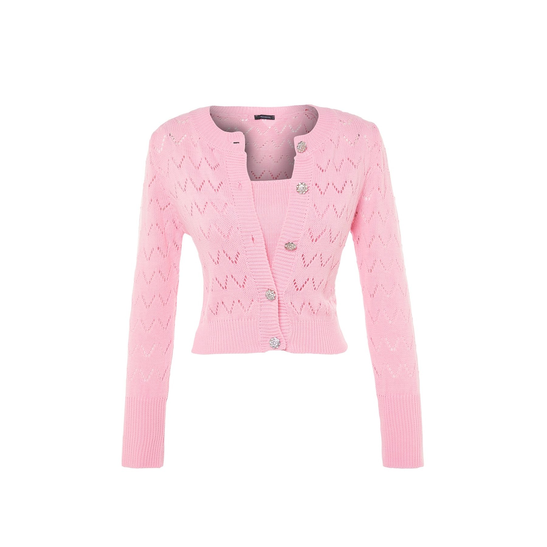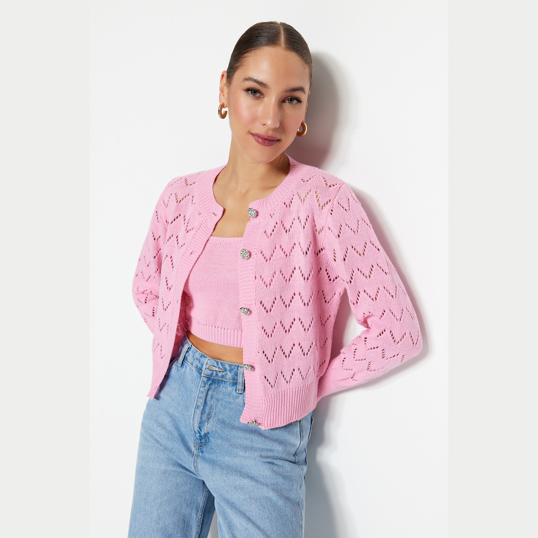 طقم نسائي مكون من بلوزة قصيرة Ajurlu بدون أكمام وهُرْكة بأزرار، بلون وردي ناعم، مصنوع بالكامل من خامة تريكو محاكة من الأكريليك، يتميز بتصميم Ajurlu مفرغ يمنح تهوية مثالية ولمسة أنثوية عصرية. مناسب للإطلالات الصيفية اليومية أو التنسيقات الخفيفة.