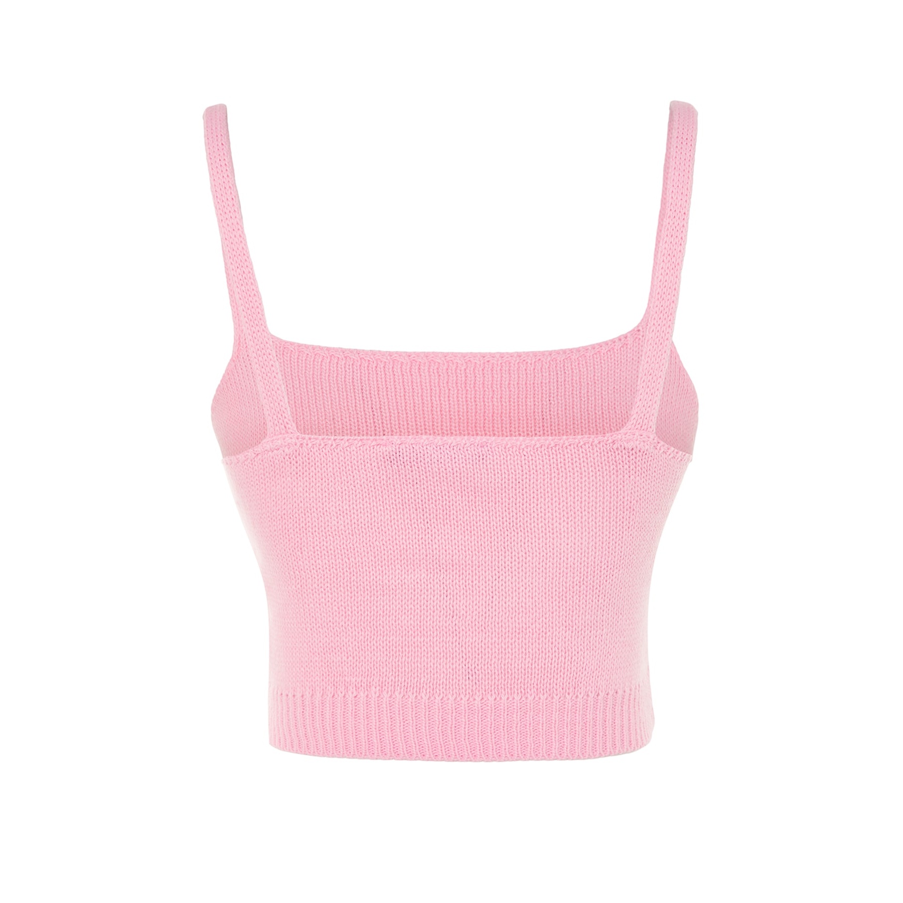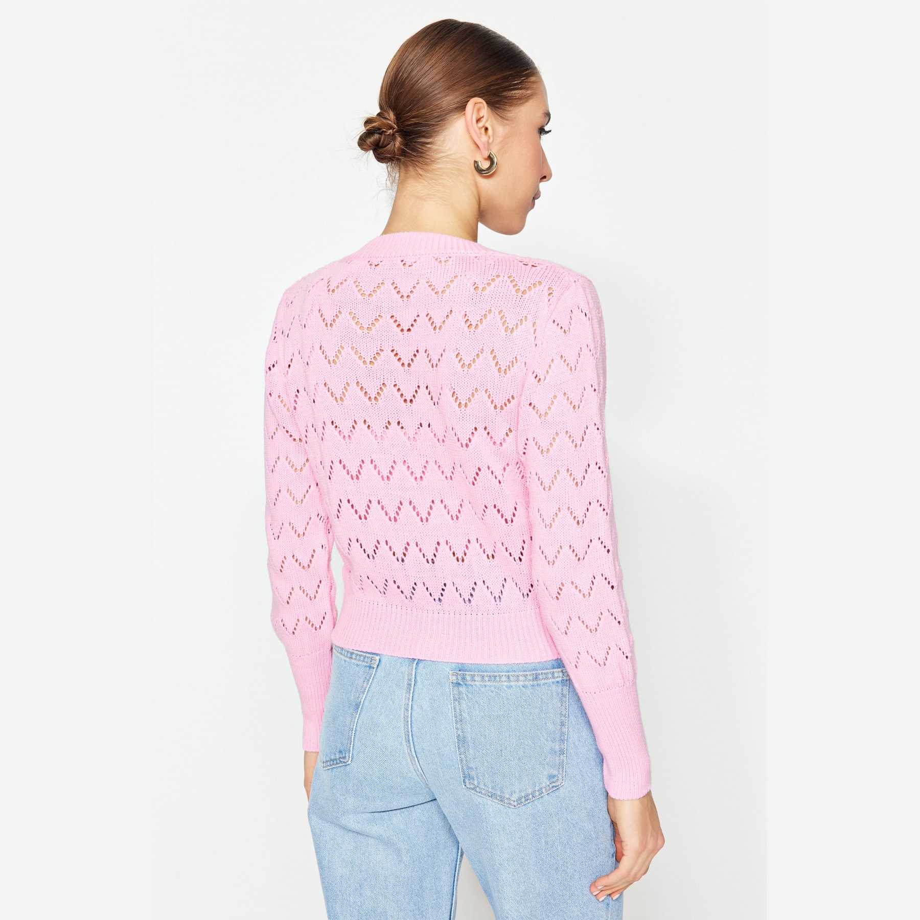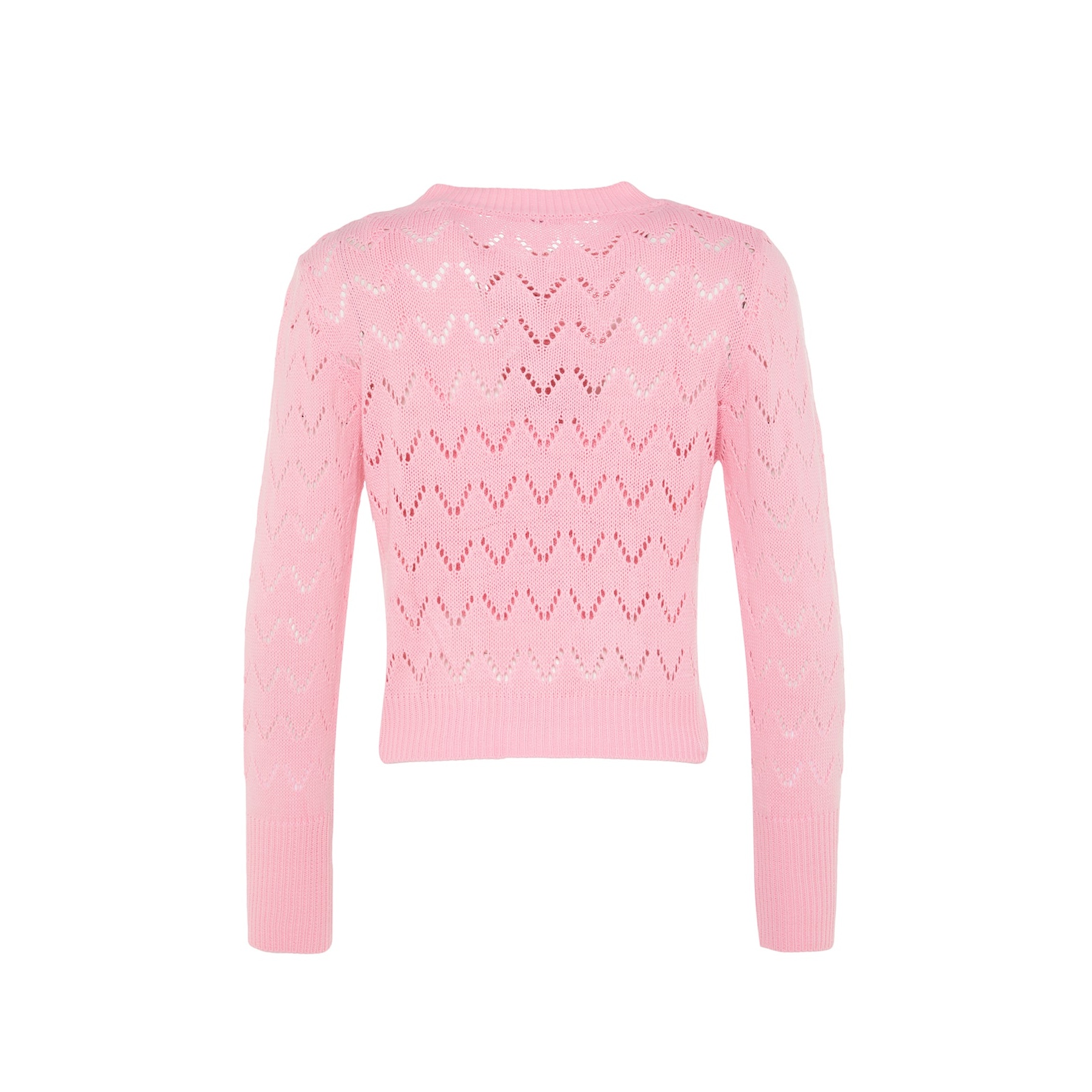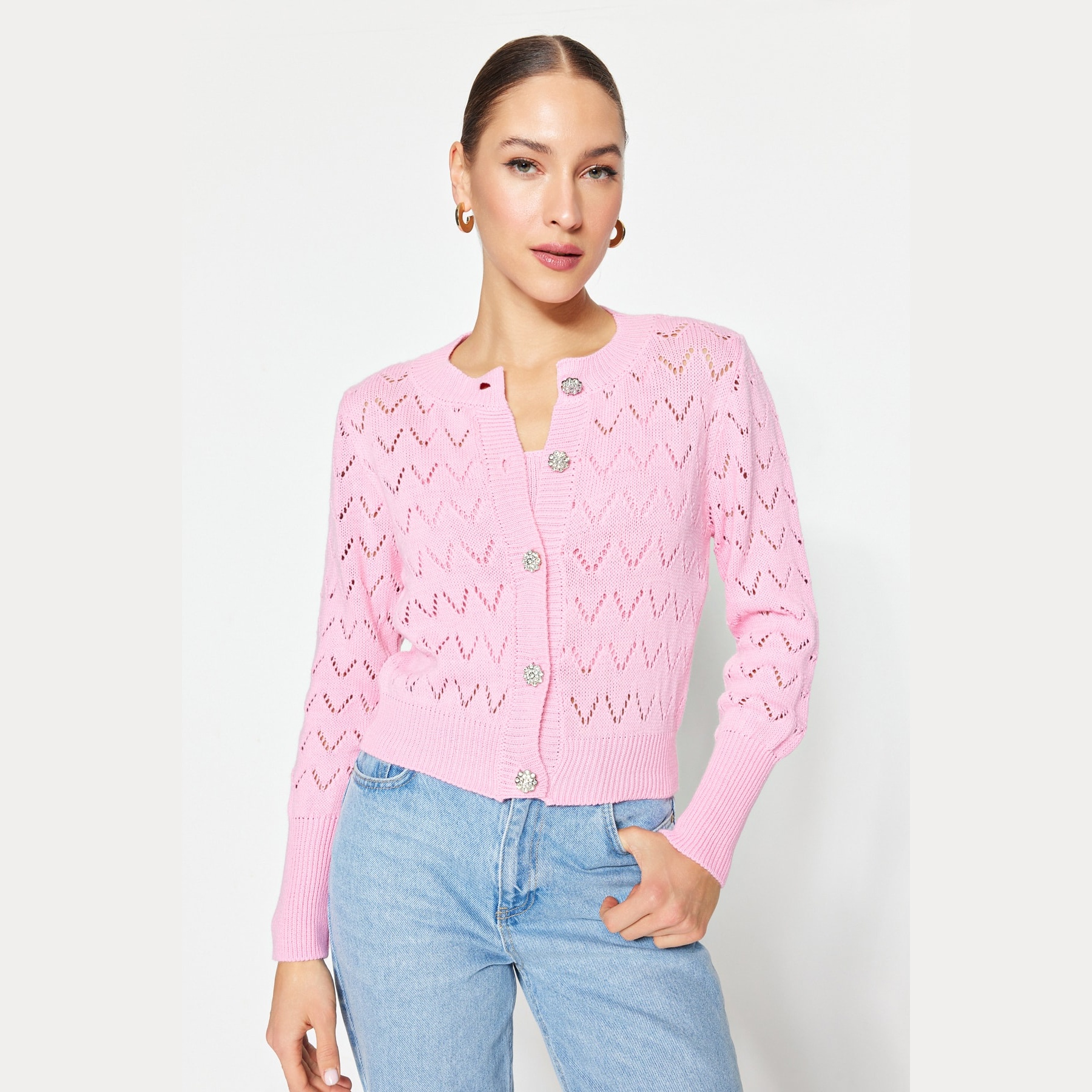 طقم نسائي مكون من بلوزة قصيرة Ajurlu بدون أكمام وهُرْكة بأزرار، بلون وردي ناعم، مصنوع بالكامل من خامة تريكو محاكة من الأكريليك، يتميز بتصميم Ajurlu مفرغ يمنح تهوية مثالية ولمسة أنثوية عصرية. مناسب للإطلالات الصيفية اليومية أو التنسيقات الخفيفة.