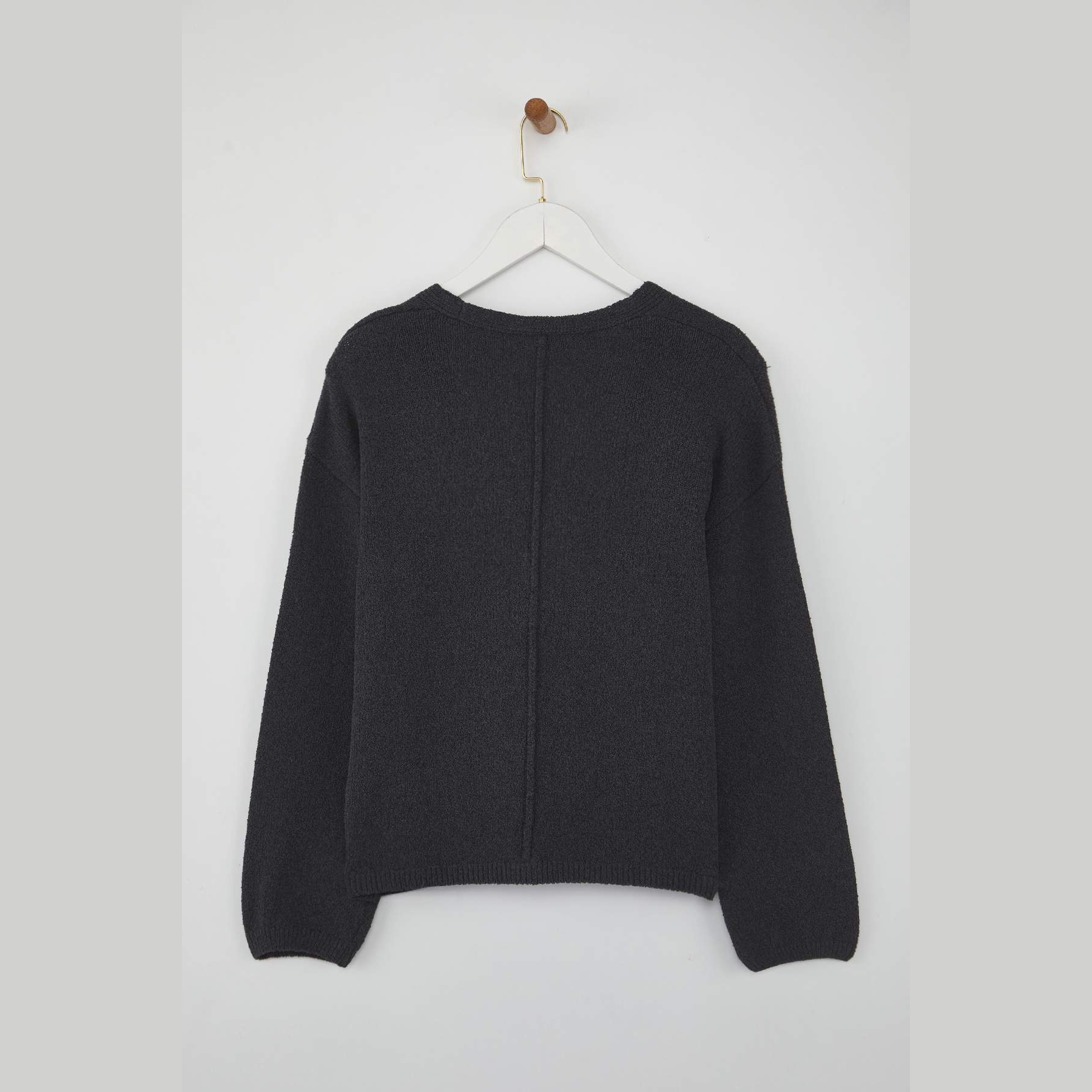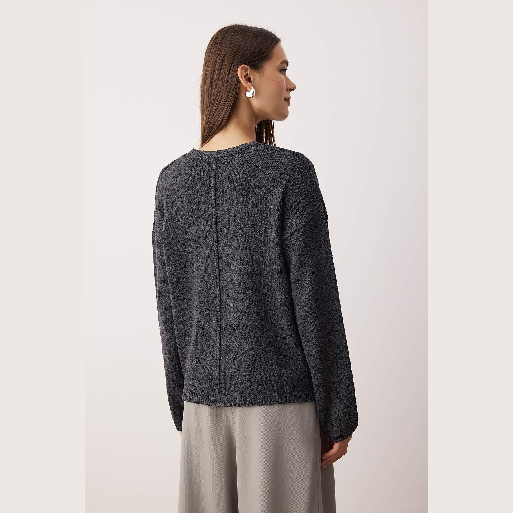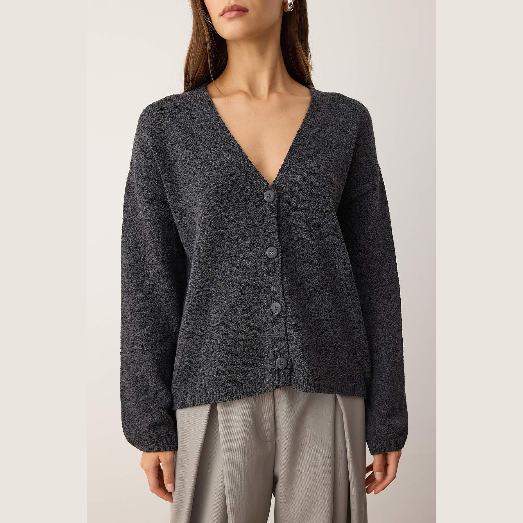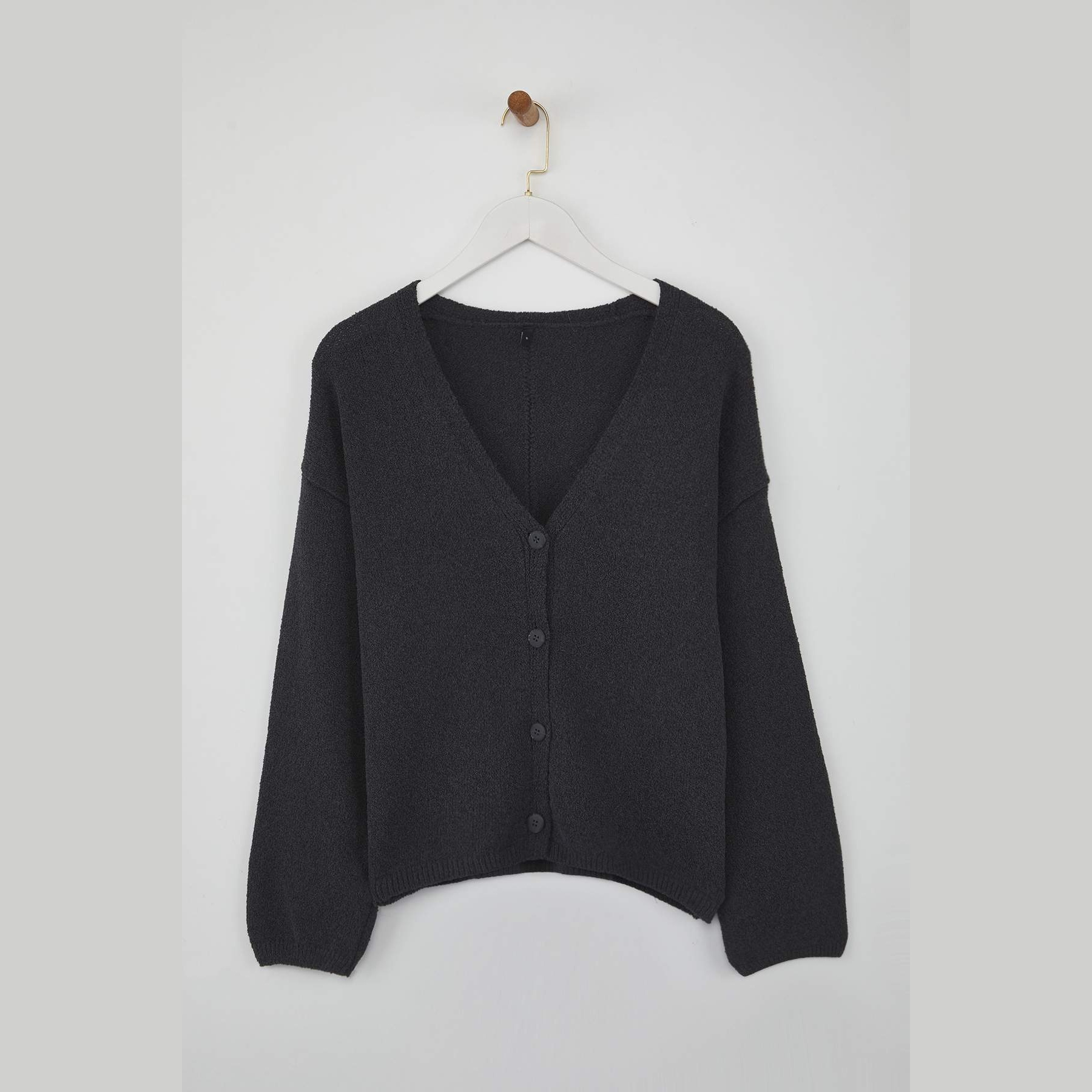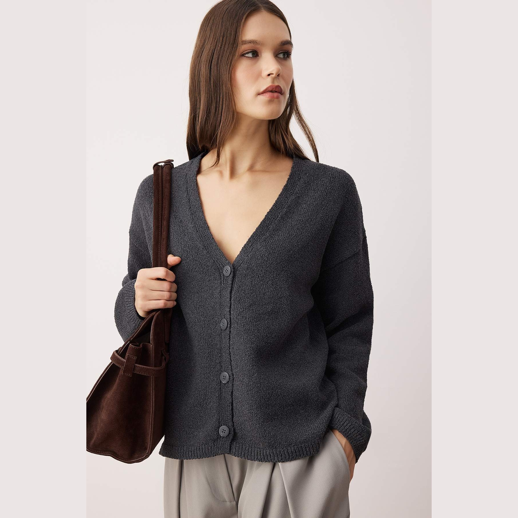 كارديغان نسائي بلون رمادي أنيق، مصنوع من خامة تريكو محاكة بتركيبة متوازنة من القطن والبوليستر، يتميز بملمس متوسط السماكة وقصة منتظمة تمنح راحة وأناقة في آنٍ واحد. يأتي بياقة V وأكمام طويلة بتصميم كتف منخفض، ما يجعله خيارًا مثاليًا للإطلالات اليومية في فصل الشتاء، ضمن خط الإنتاج المستدام من Trendyolmilla.