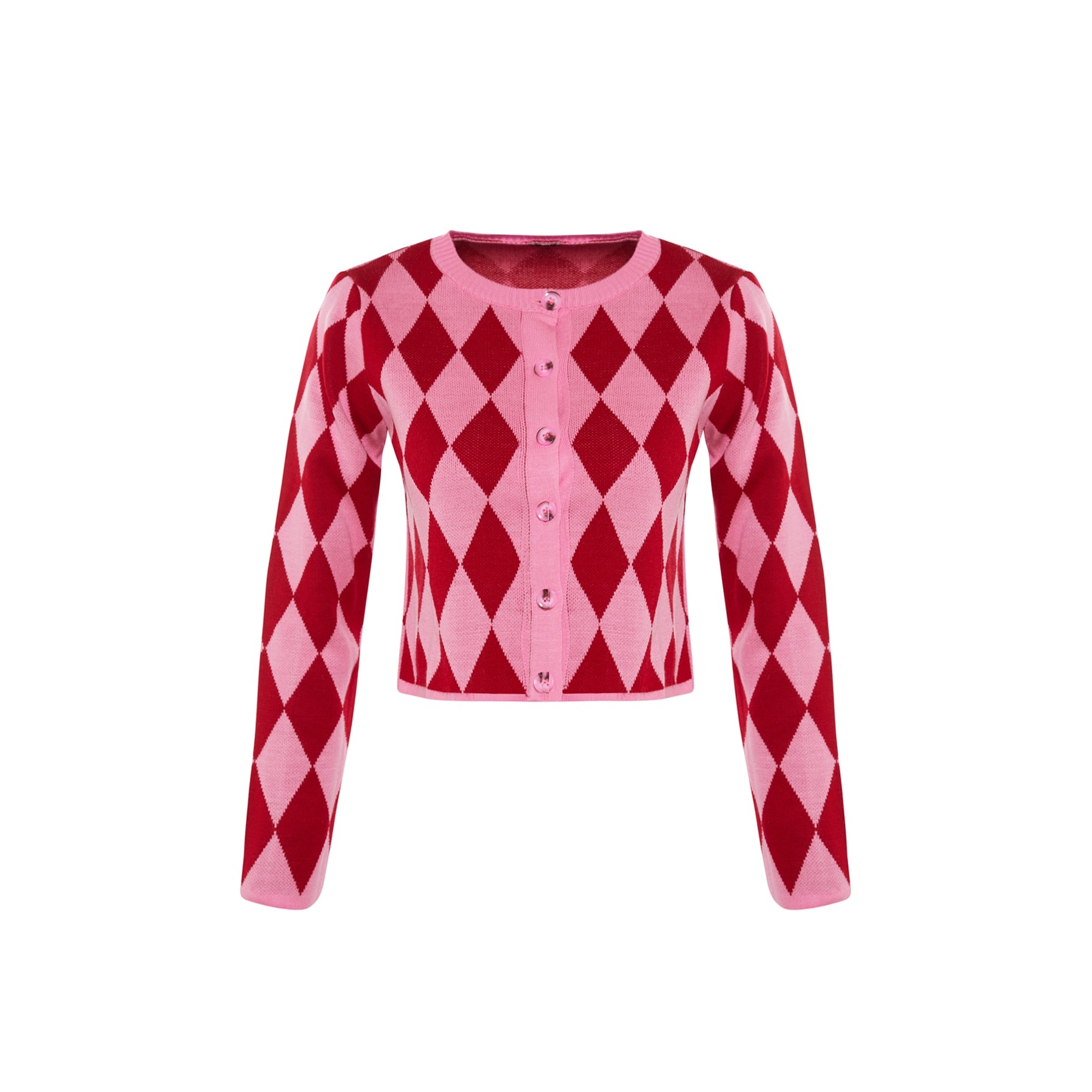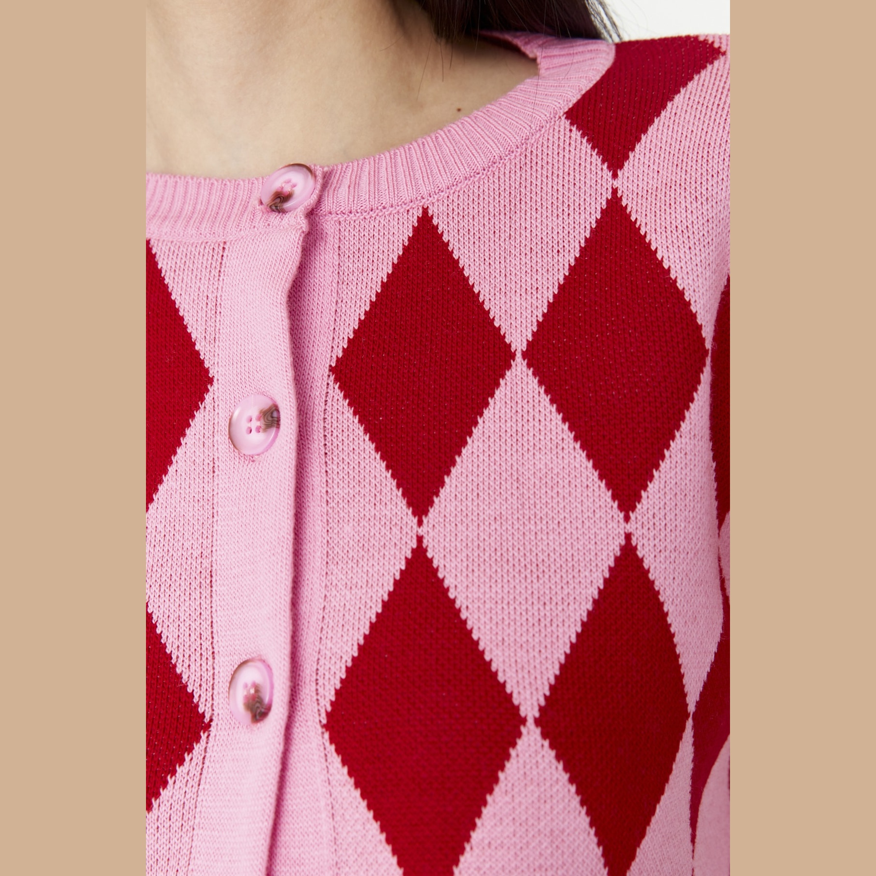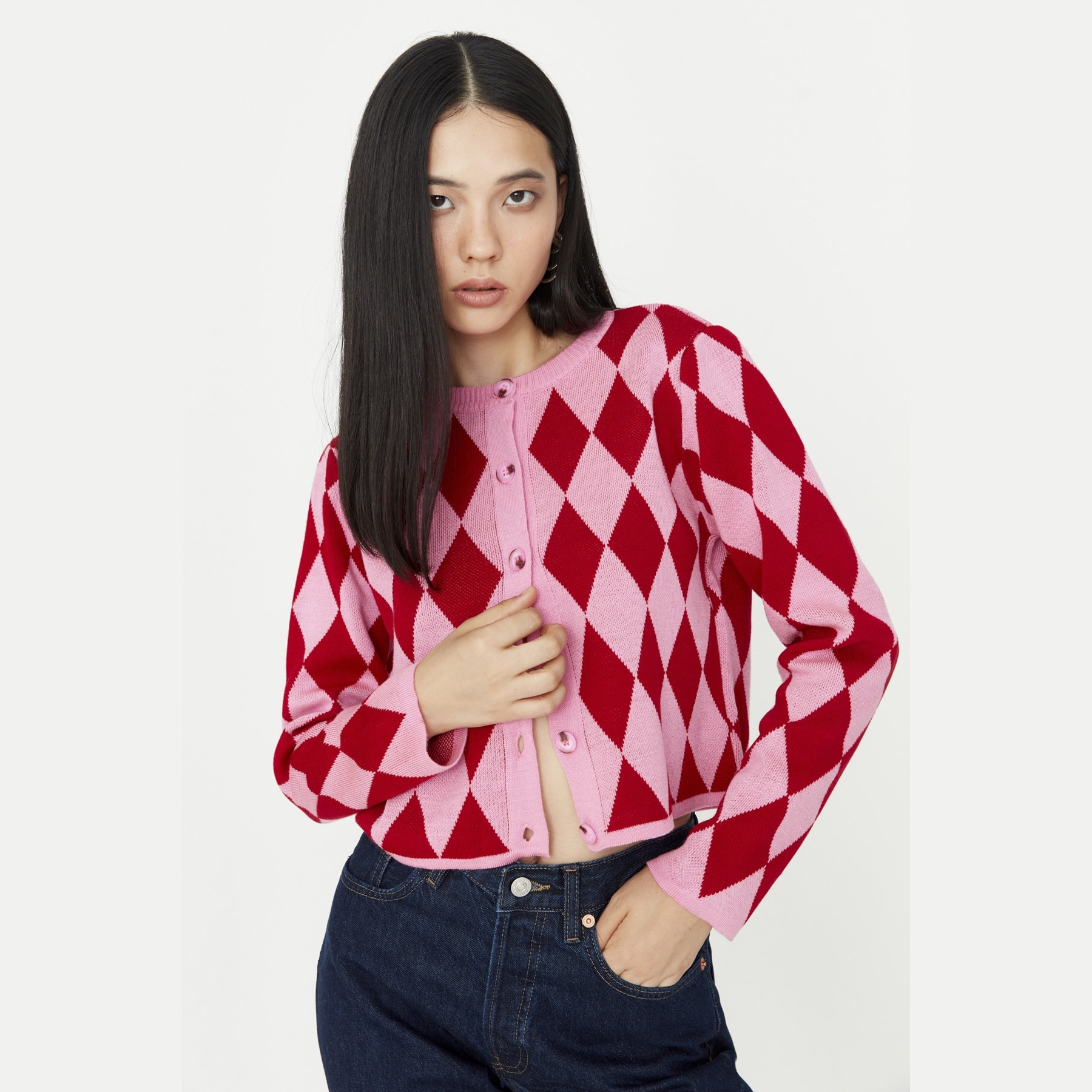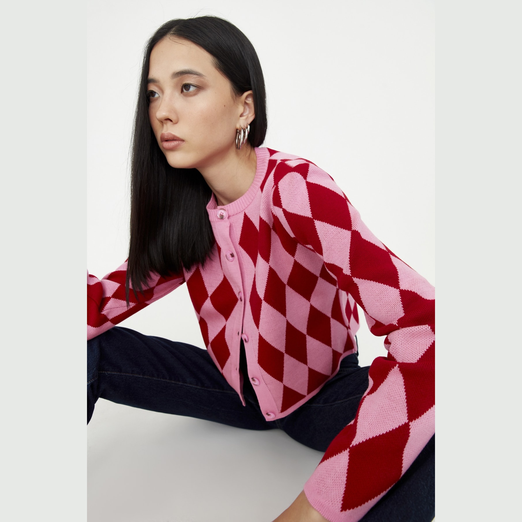 كارديغان نسائي بلون وردي ناعم، مصنوع بالكامل من خامة تريكو محاكة من الأكريليك، يتميز بملمس متوسط السماكة وتصميم جاكار بنقشة هندسية تضيف طابعًا عصريًا. يأتي بقصة قصيرة (Crop) وياقة دائرية وأكمام طويلة، ويمنح مظهرًا يشبه الجاكيت بفضل تفاصيله البنيوية، ما يجعله خيارًا مثاليًا للإطلالات اليومية في فصول الانتقال.