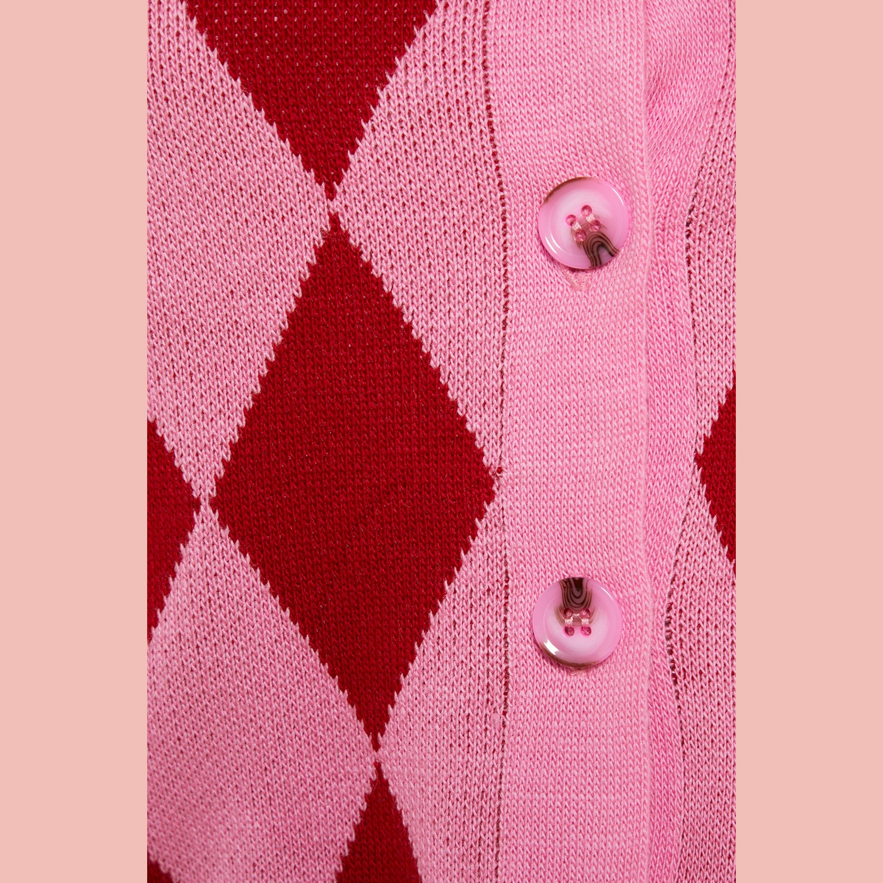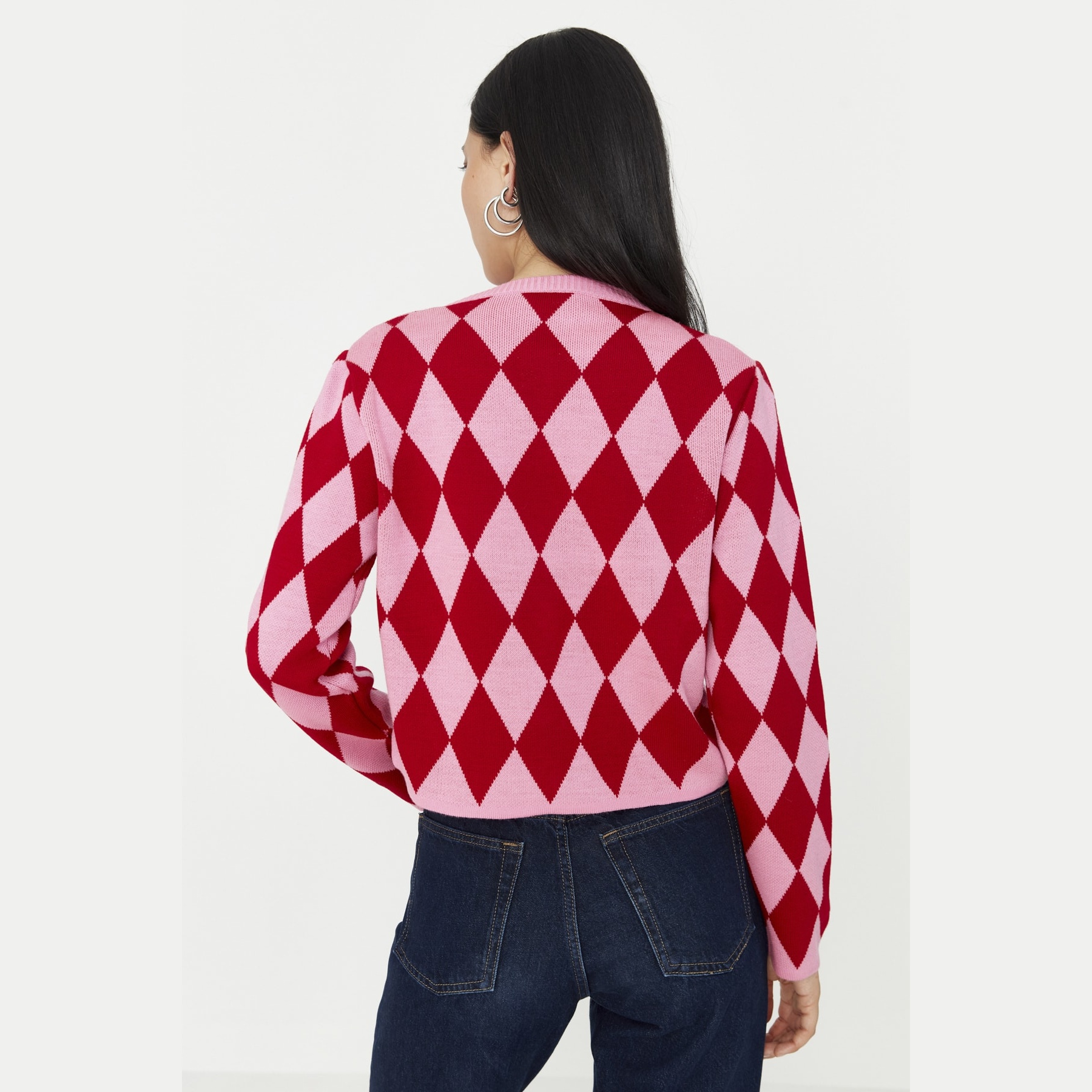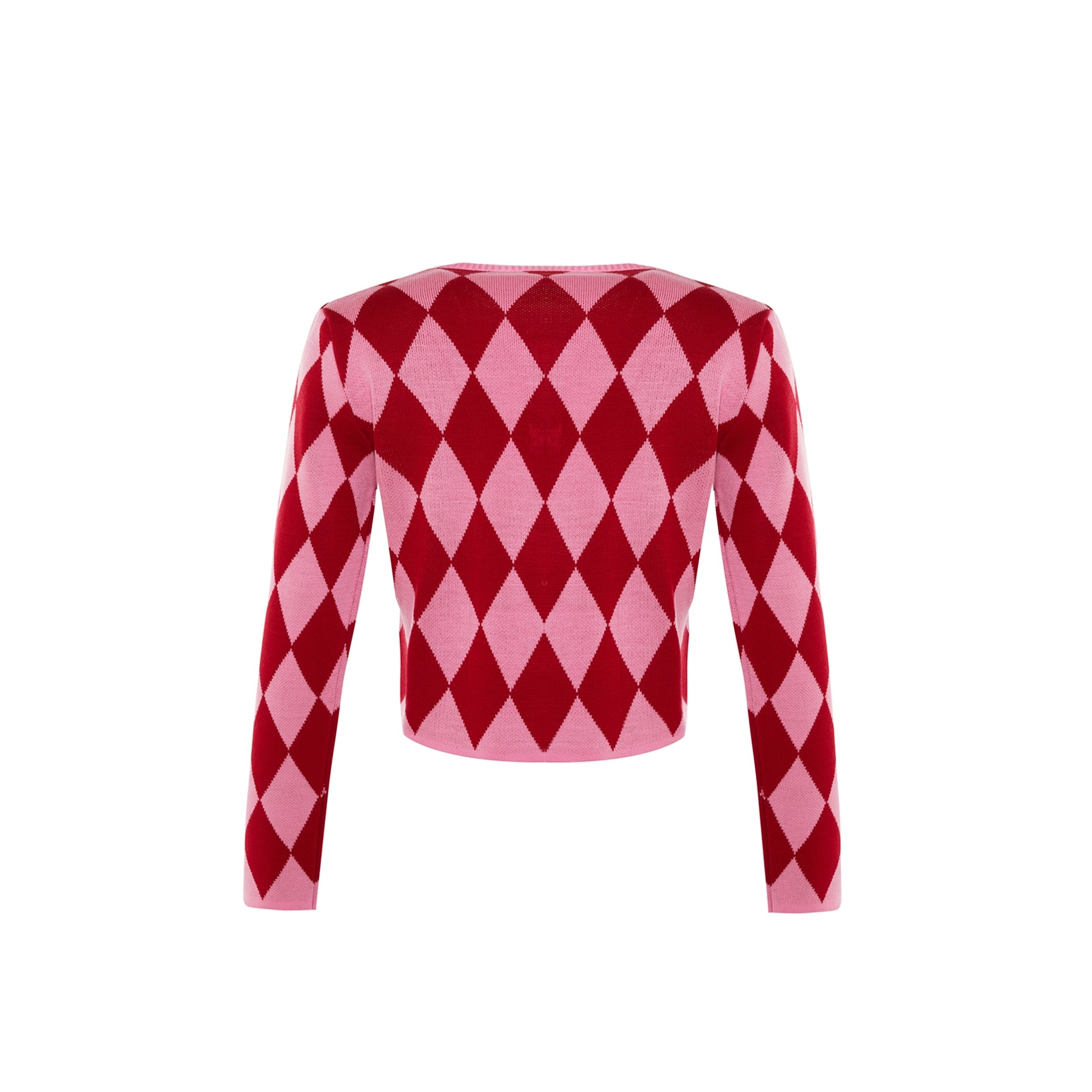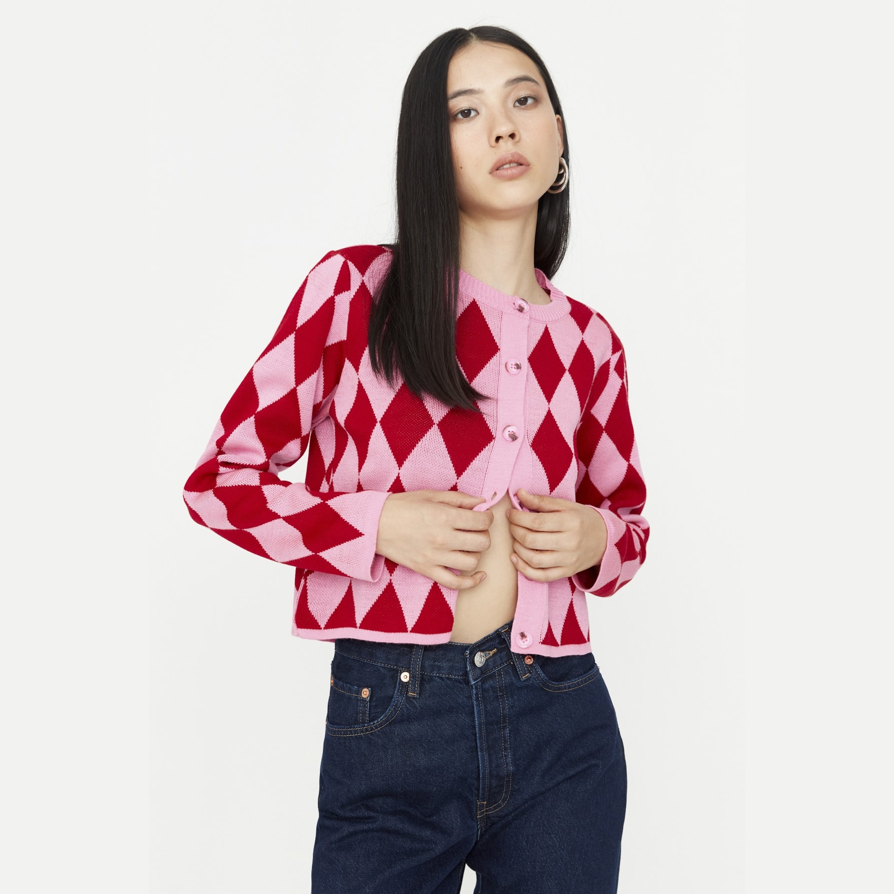 كارديغان نسائي بلون وردي ناعم، مصنوع بالكامل من خامة تريكو محاكة من الأكريليك، يتميز بملمس متوسط السماكة وتصميم جاكار بنقشة هندسية تضيف طابعًا عصريًا. يأتي بقصة قصيرة (Crop) وياقة دائرية وأكمام طويلة، ويمنح مظهرًا يشبه الجاكيت بفضل تفاصيله البنيوية، ما يجعله خيارًا مثاليًا للإطلالات اليومية في فصول الانتقال.