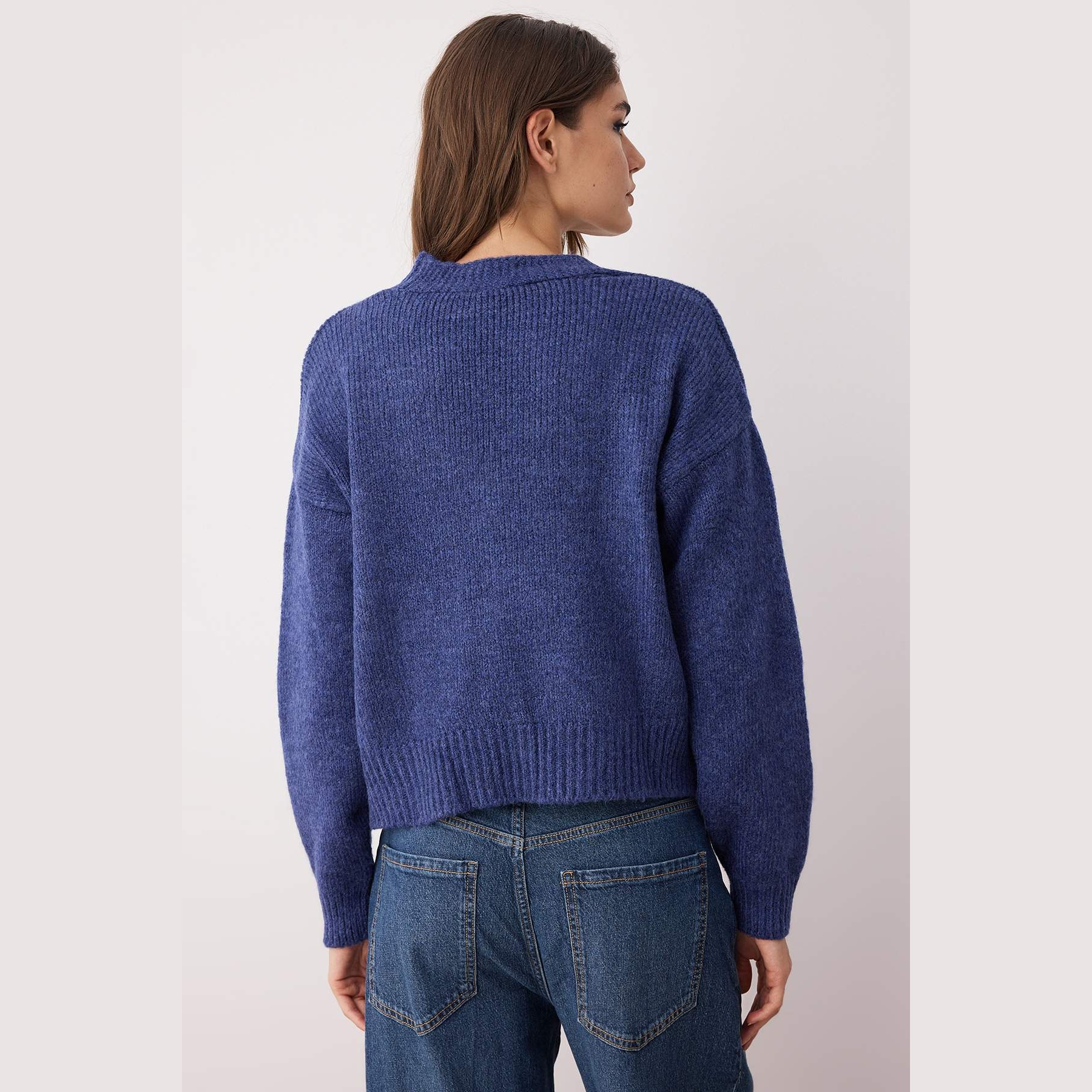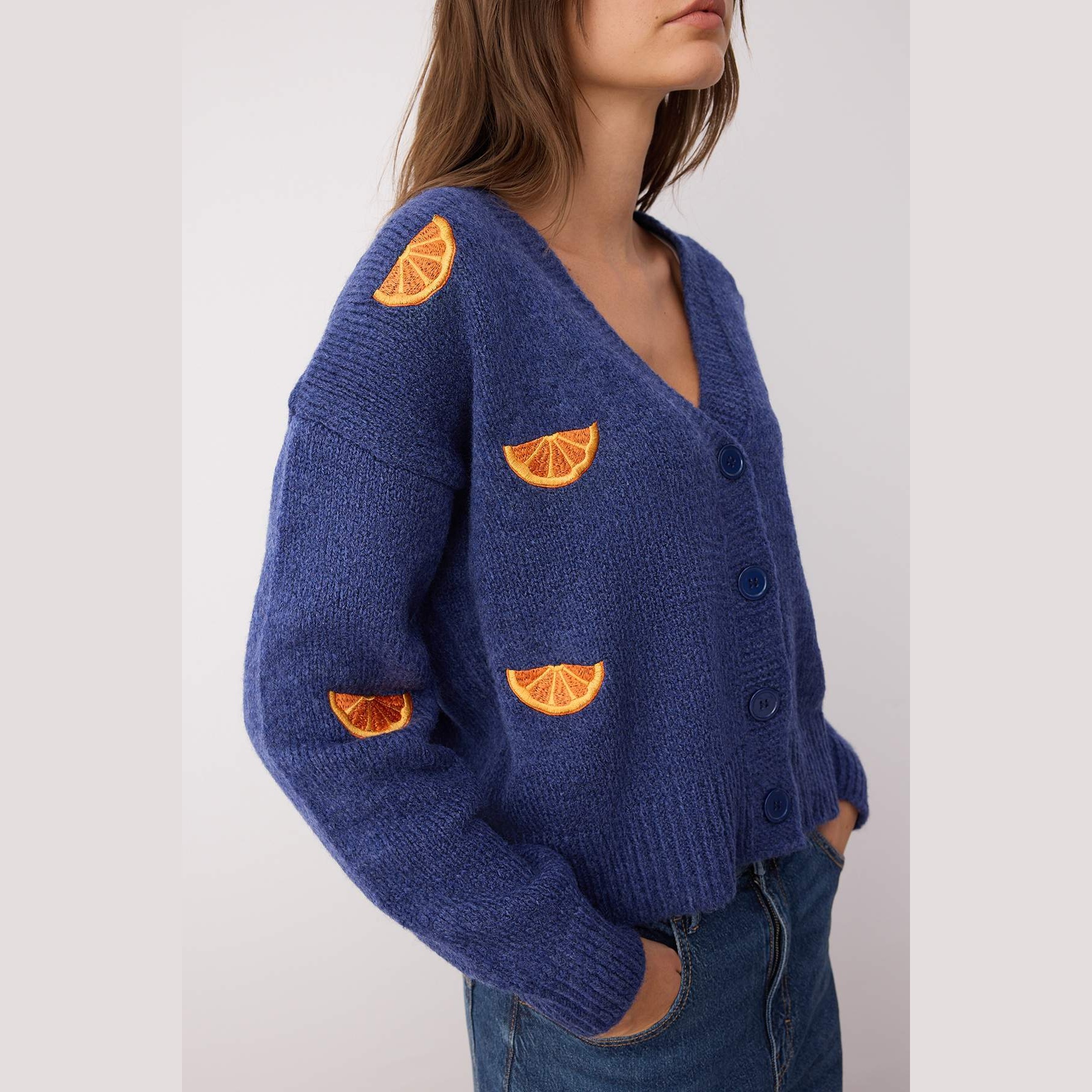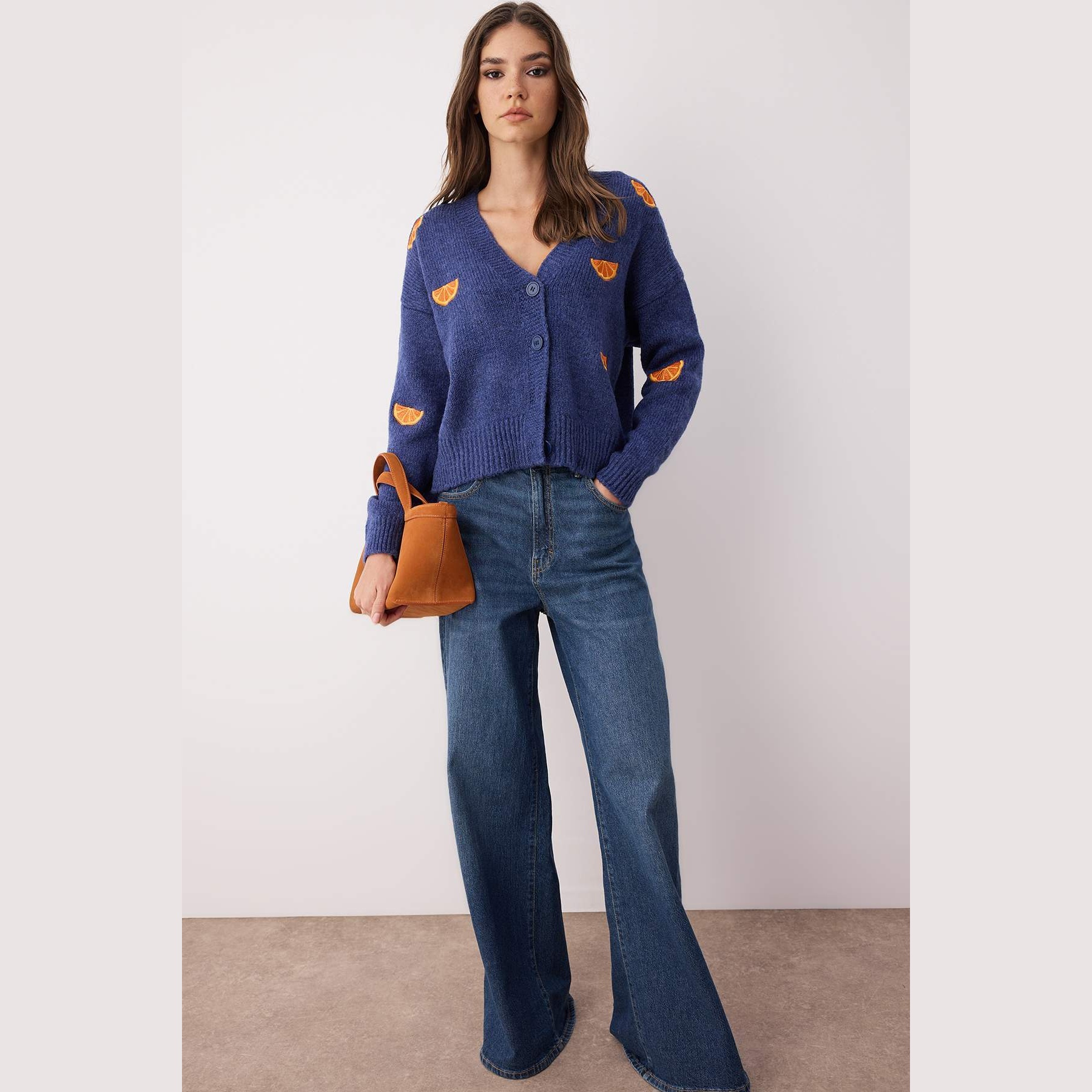 كارديغان نسائي بلون كحلي غني، مصنوع من خامة تريكو محاكة بتركيبة مزدوجة من الأكريليك والبوليستر، يتميز بملمس ناعم وسُمك متوسط مثالي للأجواء الشتوية. يأتي بقصة واسعة وياقة V وأكمام طويلة بتصميم كتف منخفض، ويبرز بتفاصيل تطريز ناعمة تضيف لمسة فنية أنثوية.