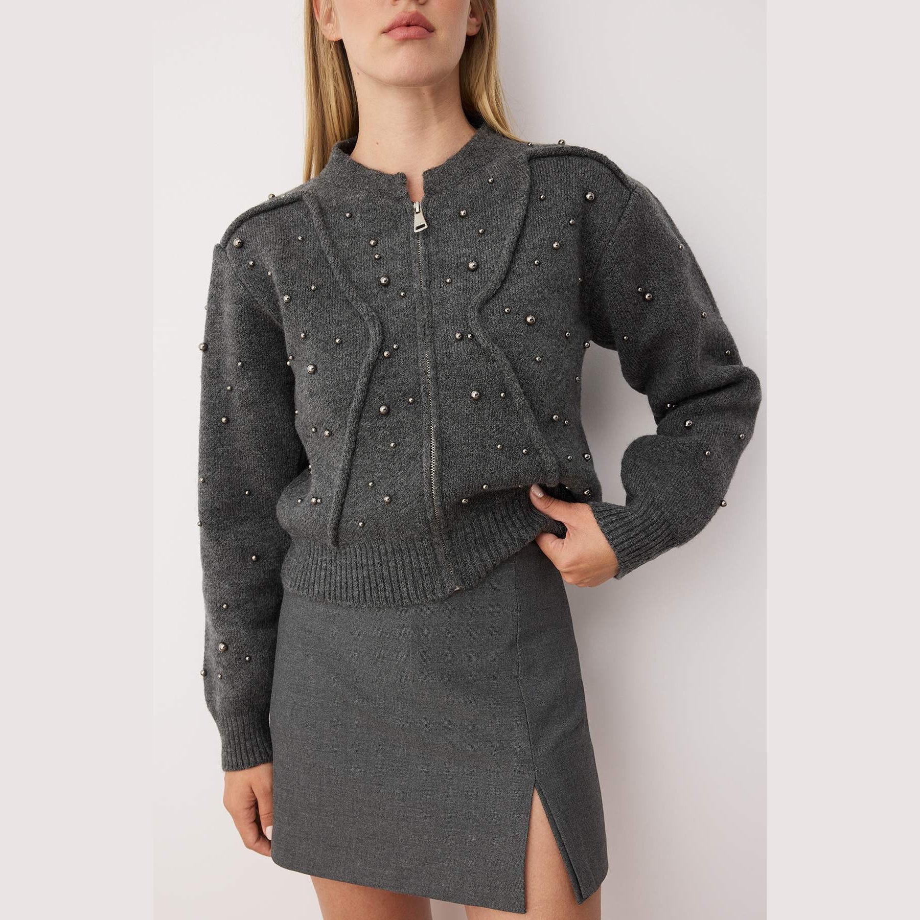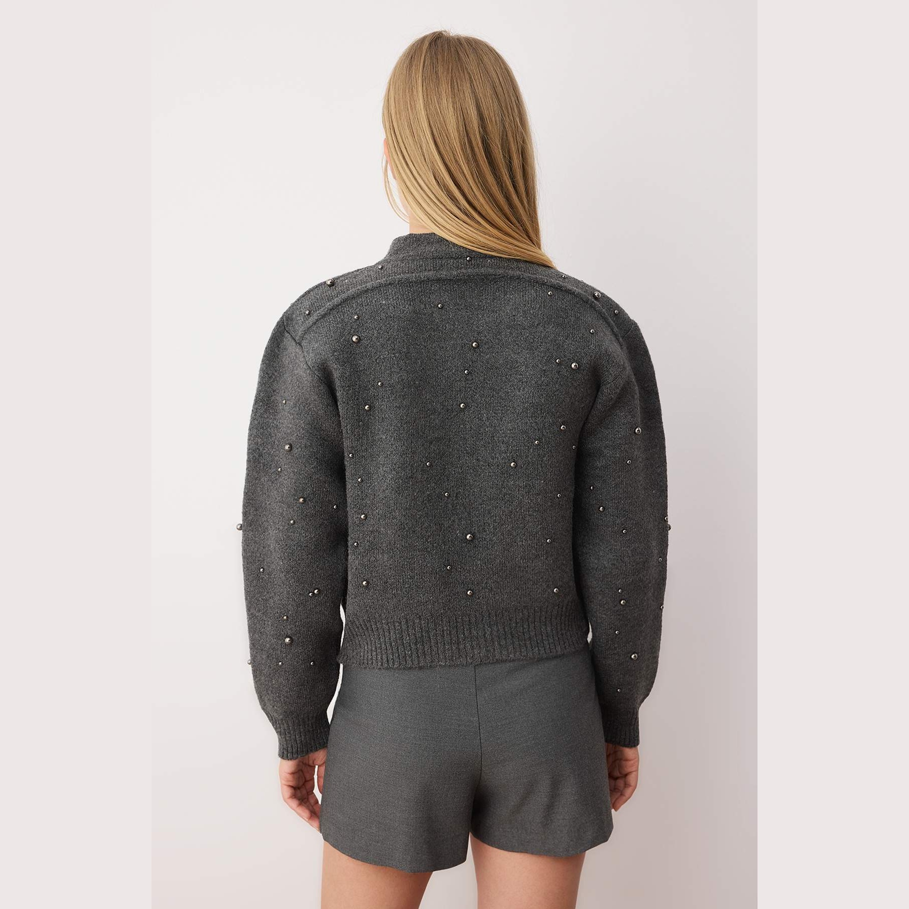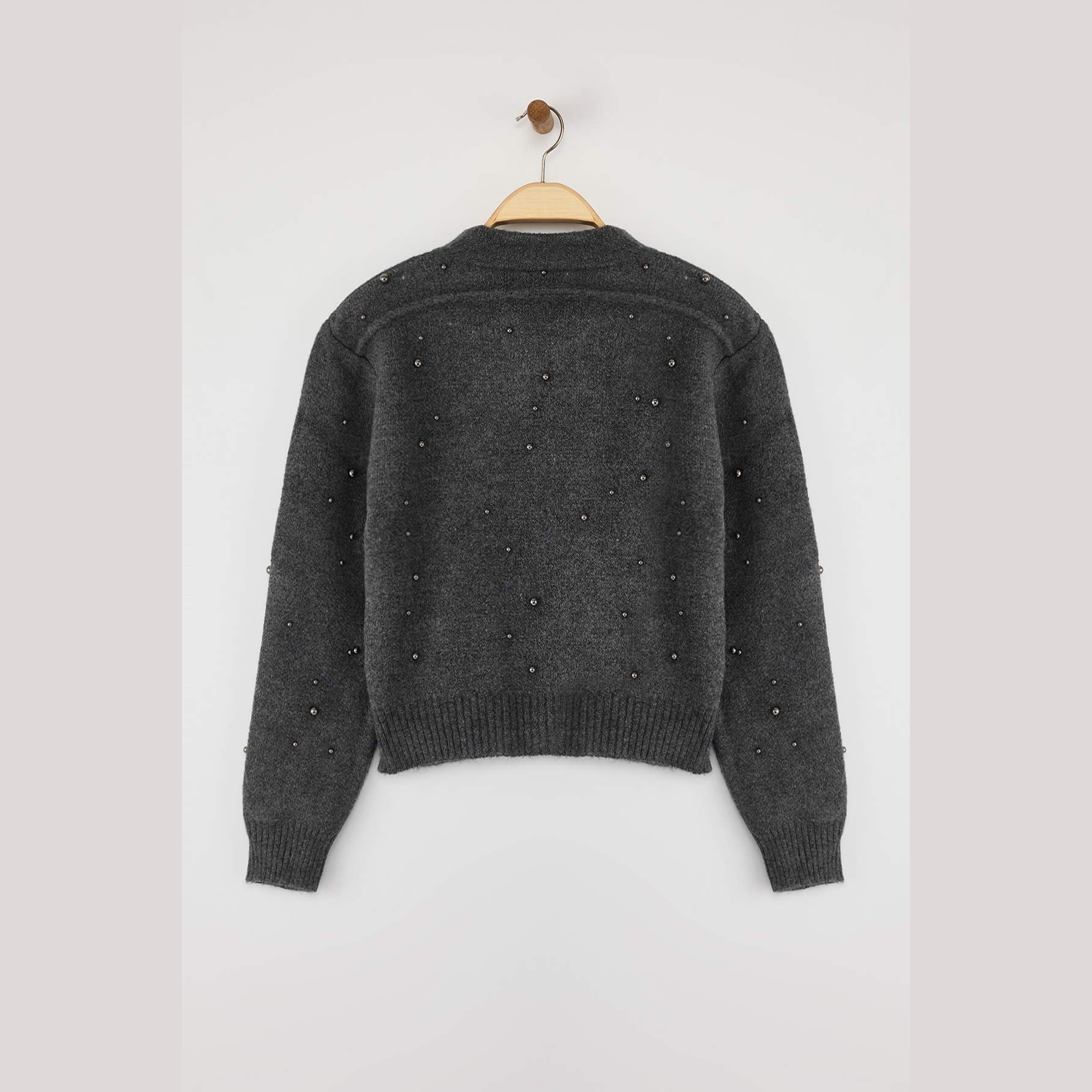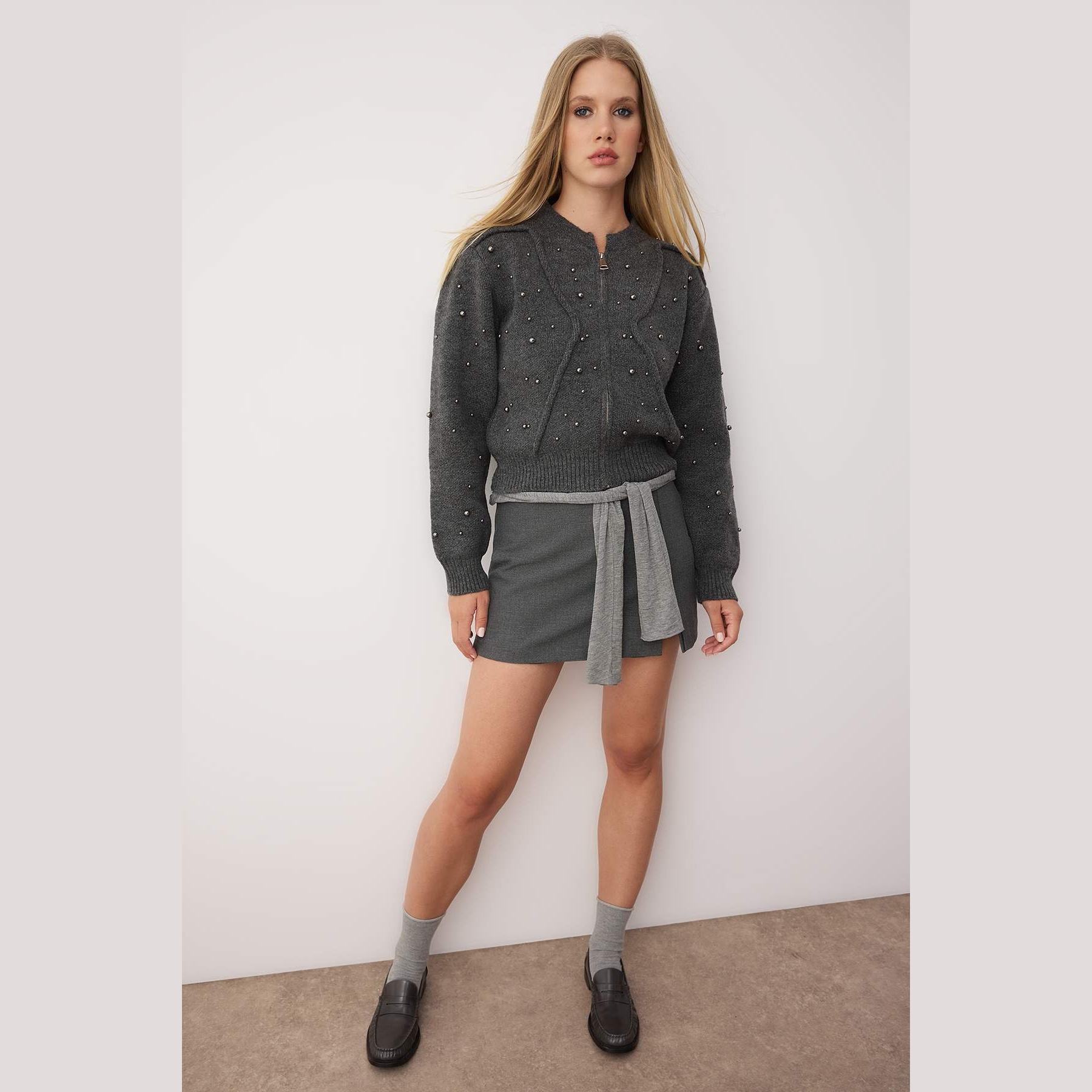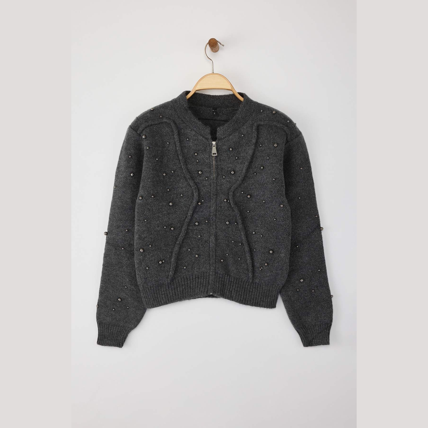 كارديغان نسائي بلون رمادي أنثراسايت، مصنوع من خامة تريكو محاكة بتركيبة ثلاثية من الأكريليك والبوليستر والإيلاستان، يتميز بملمس ناعم وسُمك سميك مثالي للأجواء الباردة. يأتي بقصة منتظمة وياقة دائرية وأكمام طويلة بتصميم كتف قياسي، ويبرز بتفاصيل ترتر لامعة وسحاب أمامي يمنح مظهرًا يشبه الجاكيت الشتوي.