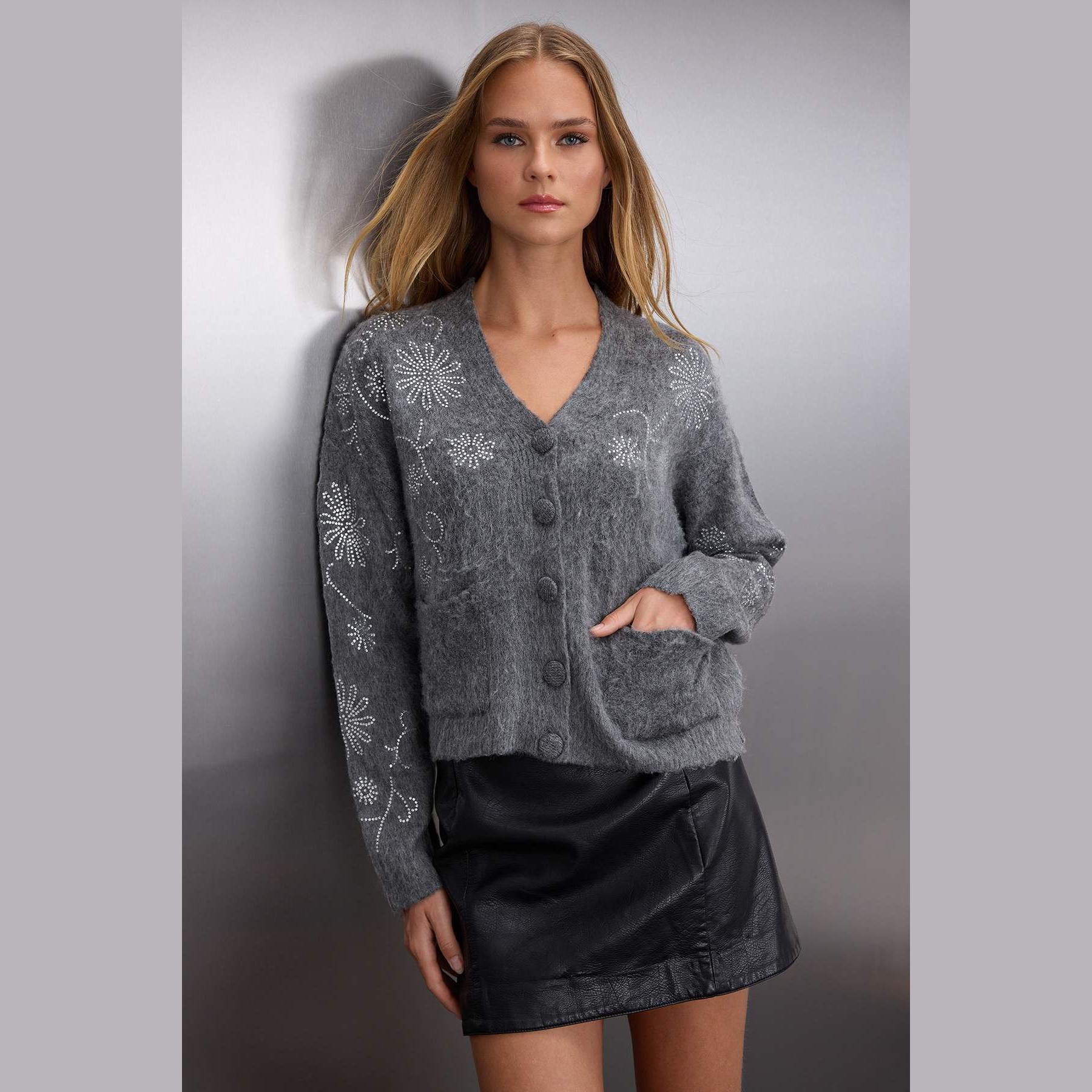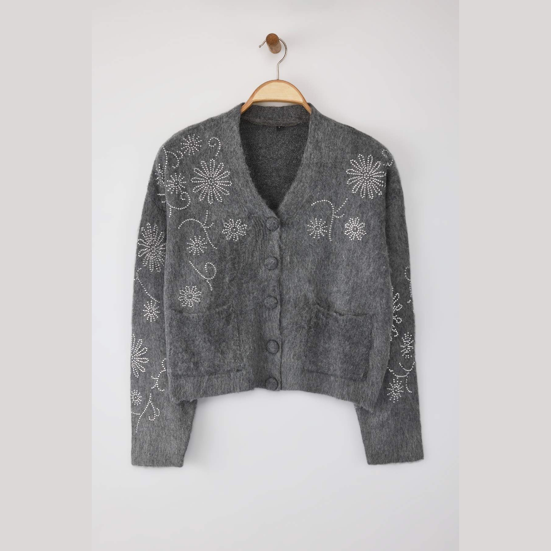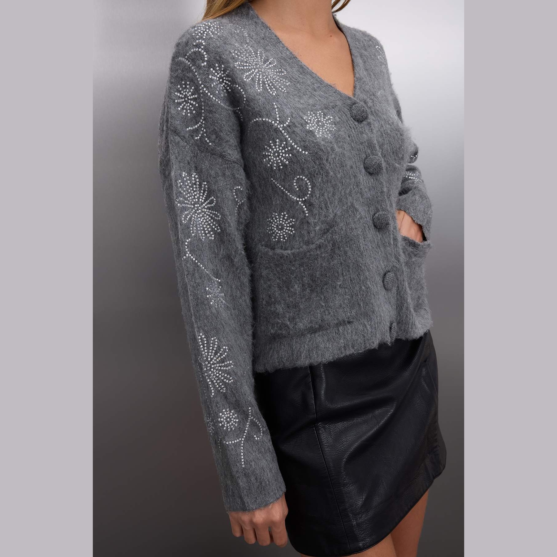 كارديغان نسائي بلون رمادي غامق، مصنوع من خامة تريكو محاكة بتركيبة مزدوجة من الأكريليك والبوليستر، يتميز بملمس ناعم وسُمك متوسط مثالي للأجواء الشتوية. يأتي بقصة واسعة وياقة V وأكمام طويلة بتصميم كتف منخفض، ويبرز بتفاصيل ترتر أنيقة تضيف لمسة لامعة ناعمة.