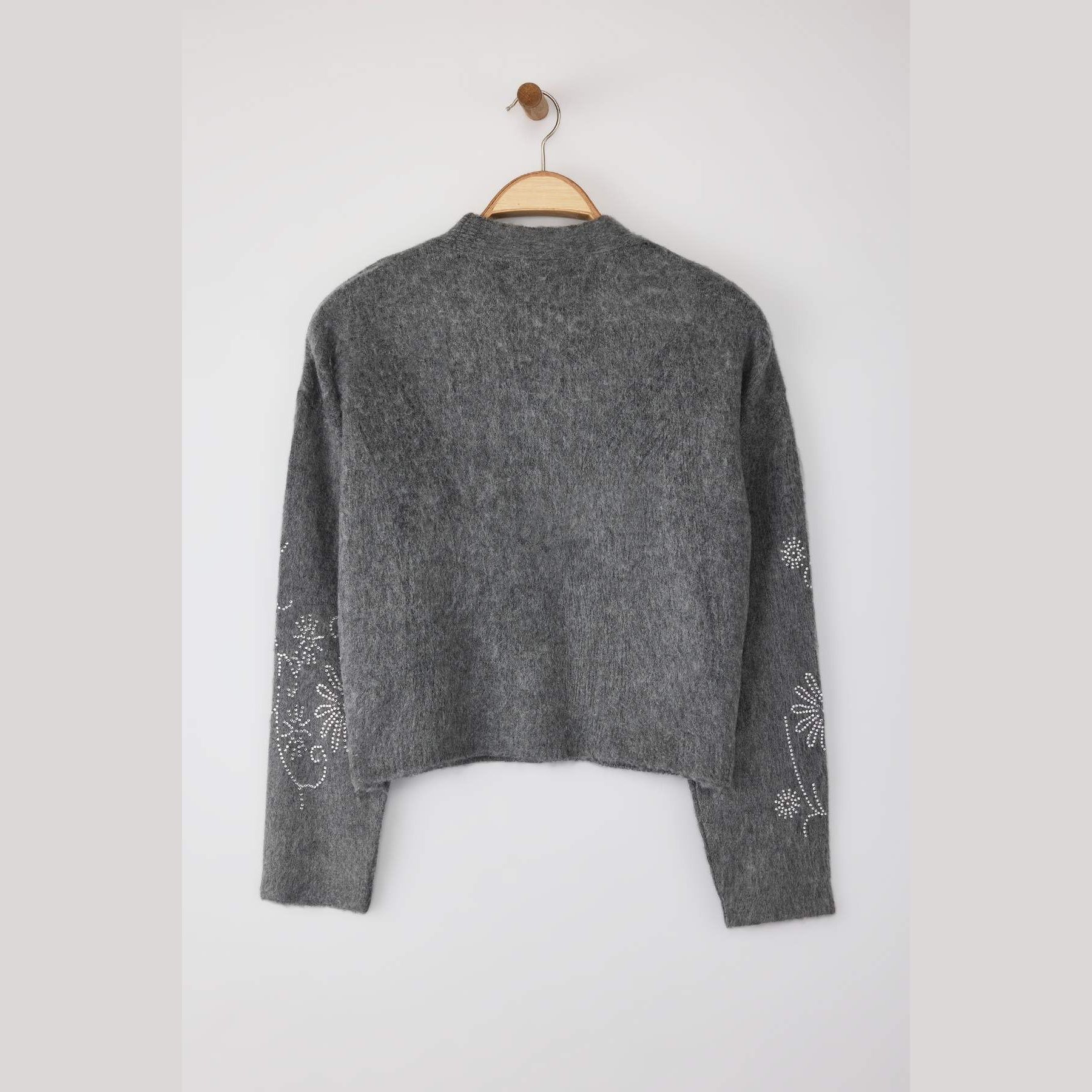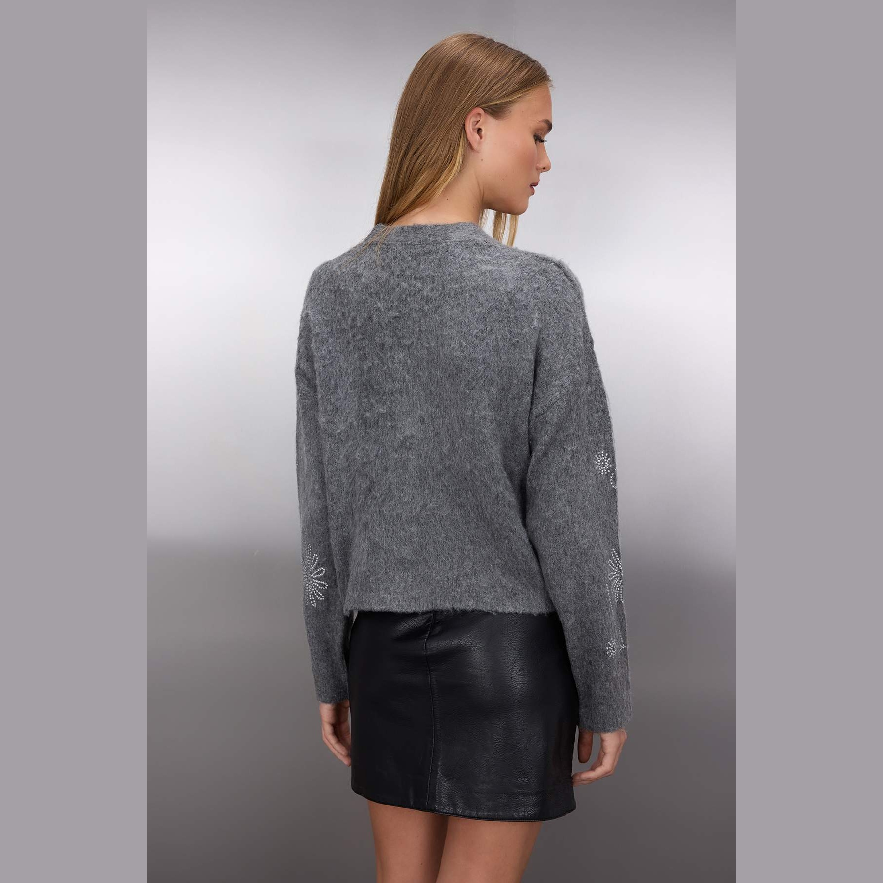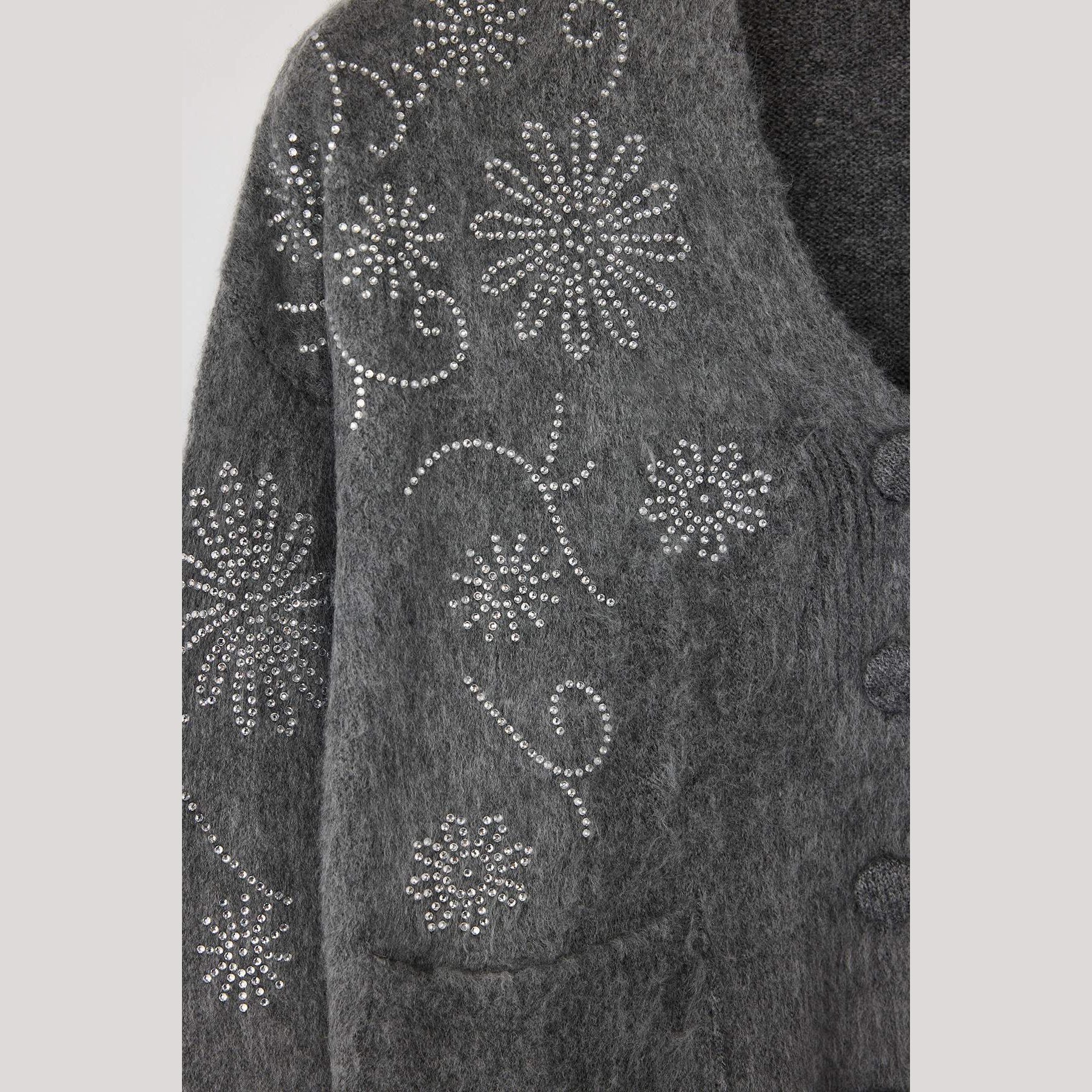 كارديغان نسائي – رمادي غامق بملمس ناعم وتفاصيل ترتر (دفء شتوي بإشراقة أنثوية)