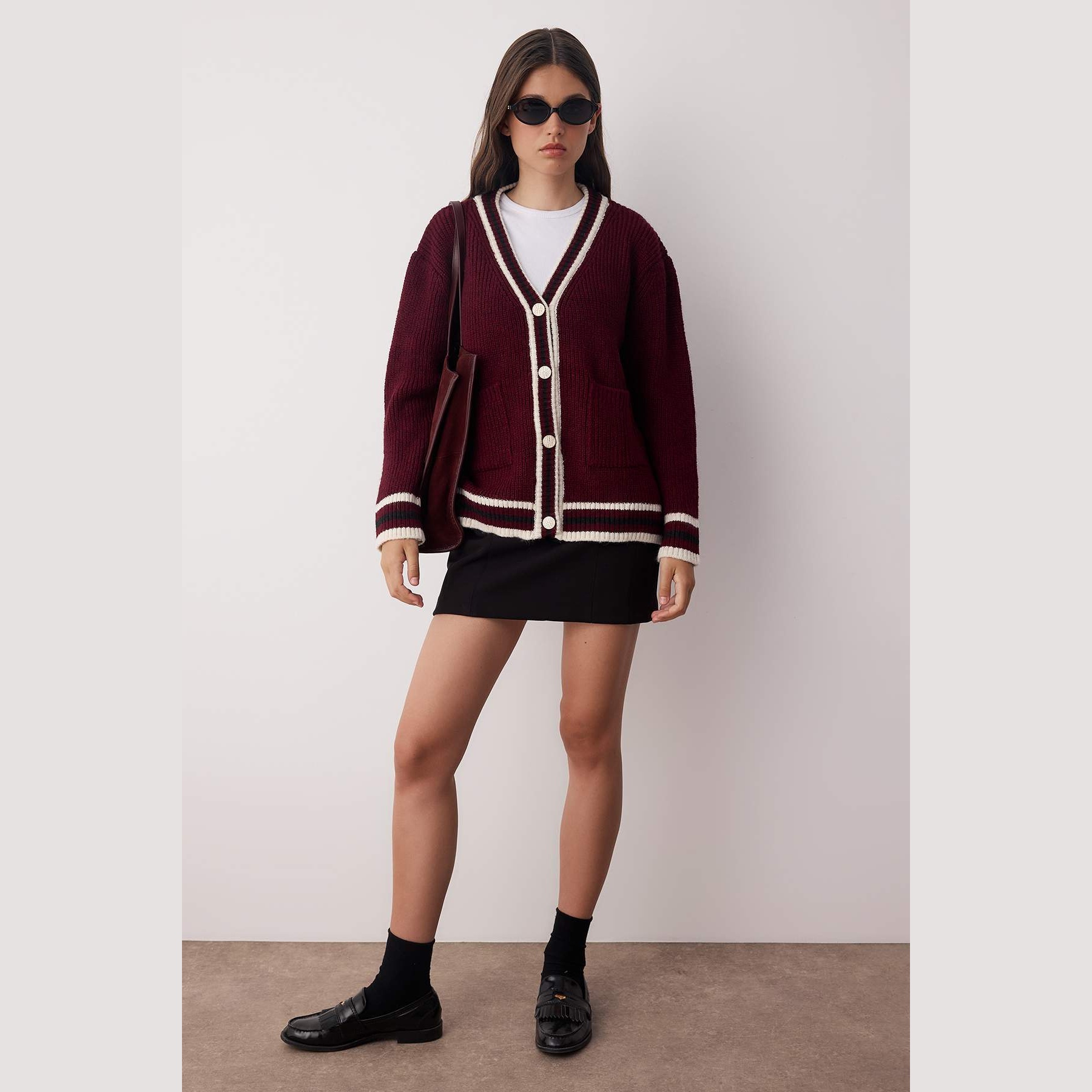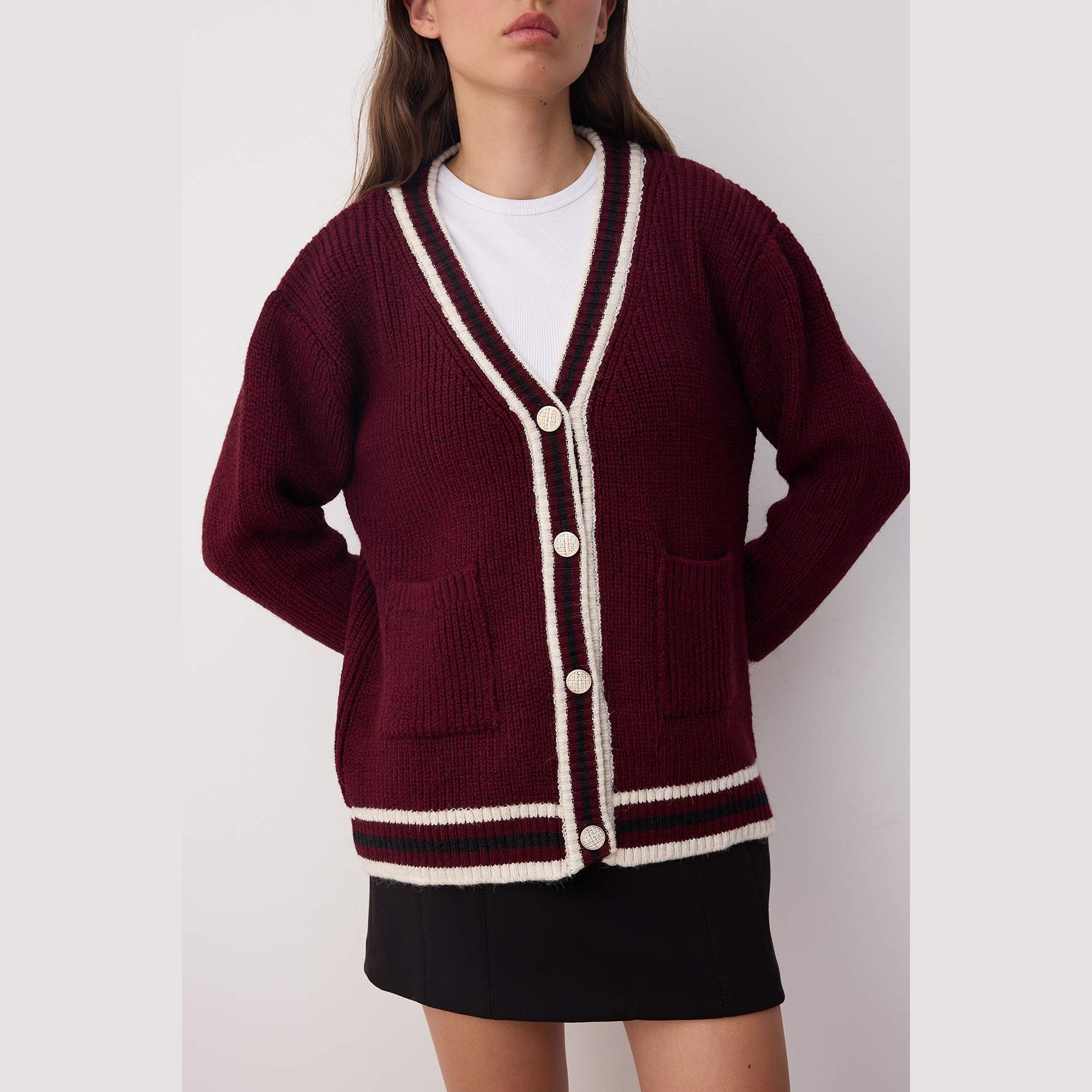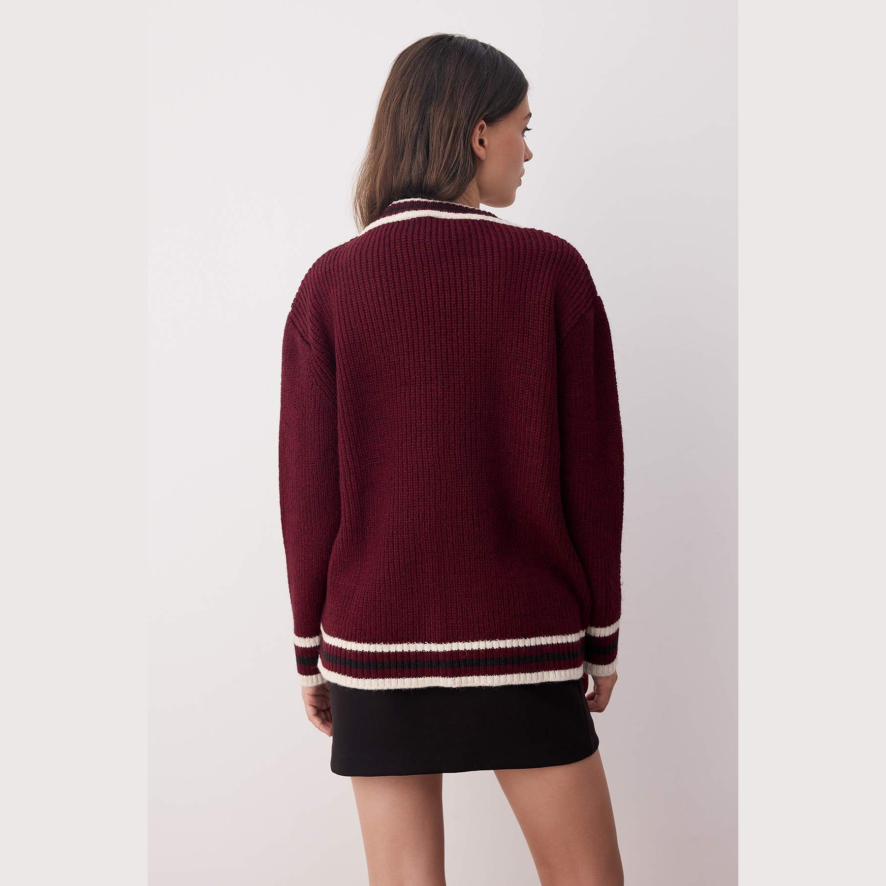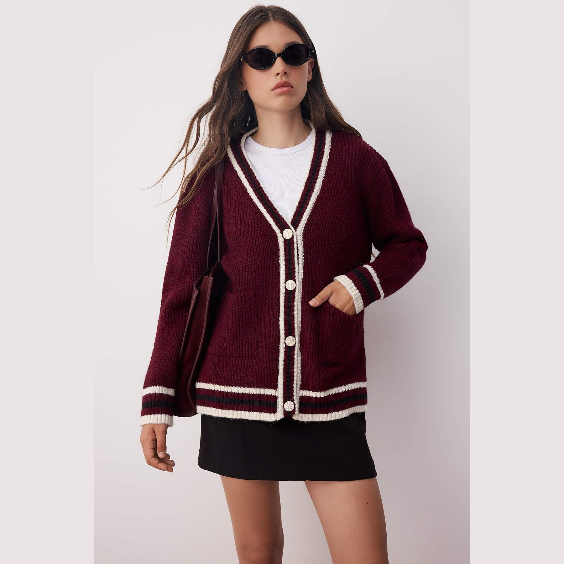 كارديغان نسائي بلون بوردو مع تفاصيل لونية متباينة، مصنوع من خامة تريكو محاكة بتركيبة ثلاثية من الأكريليك والبولياميد والبوليستر، يتميز بملمس متوسط السماكة وقصة واسعة تمنح راحة وأناقة في آنٍ واحد. يأتي بياقة V وأكمام طويلة بتصميم كتف منخفض، ما يجعله خيارًا مثاليًا للإطلالات اليومية في فصل الشتاء.
