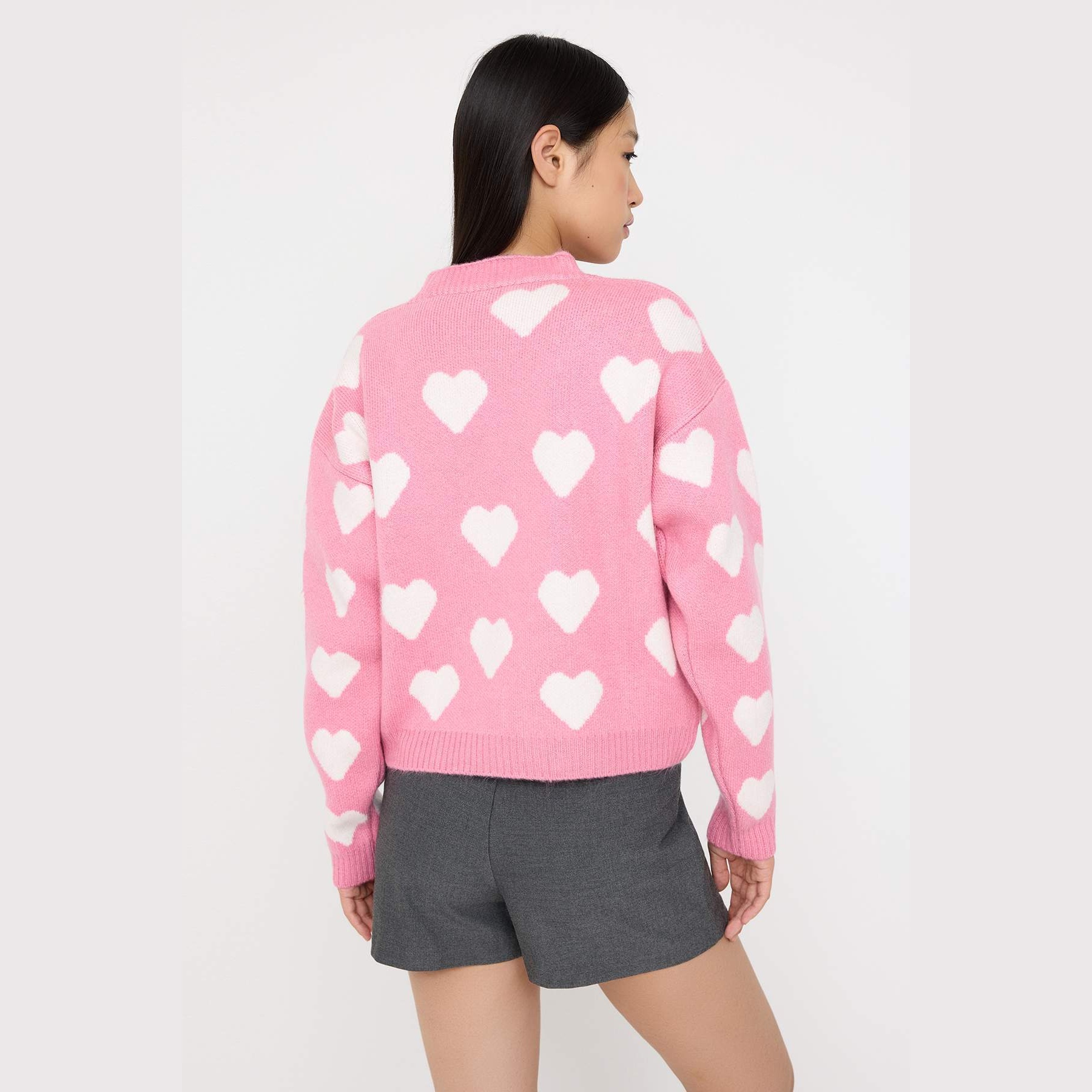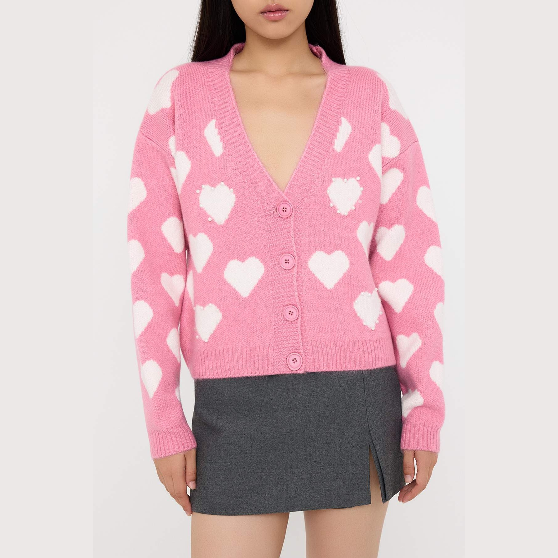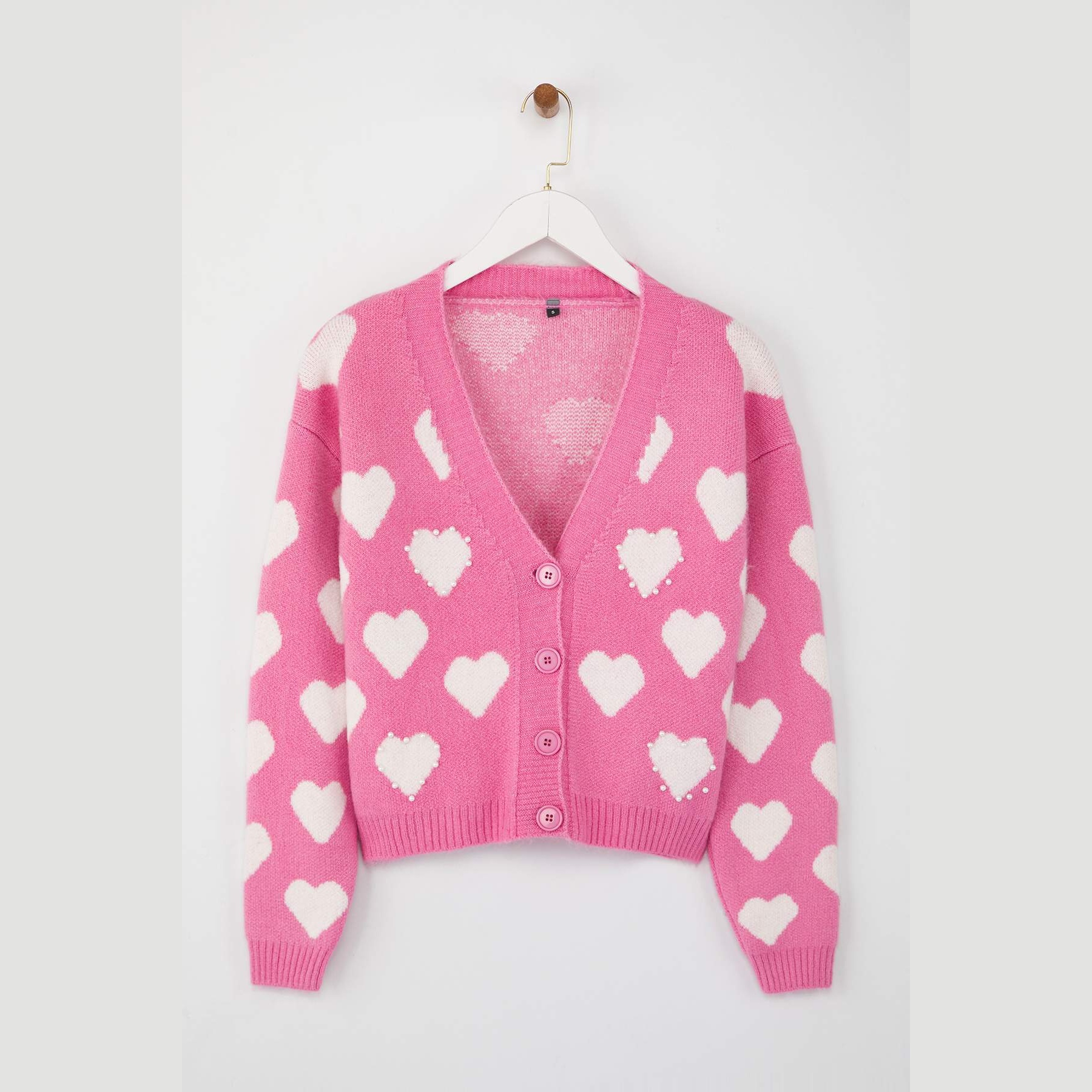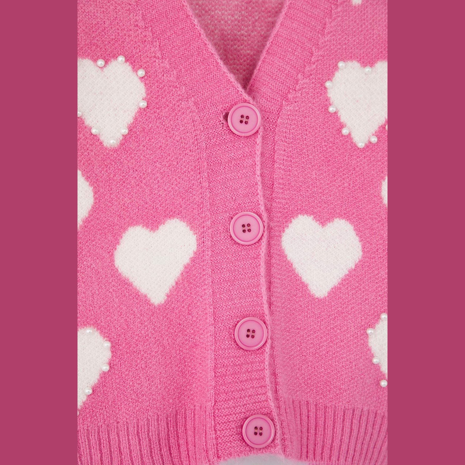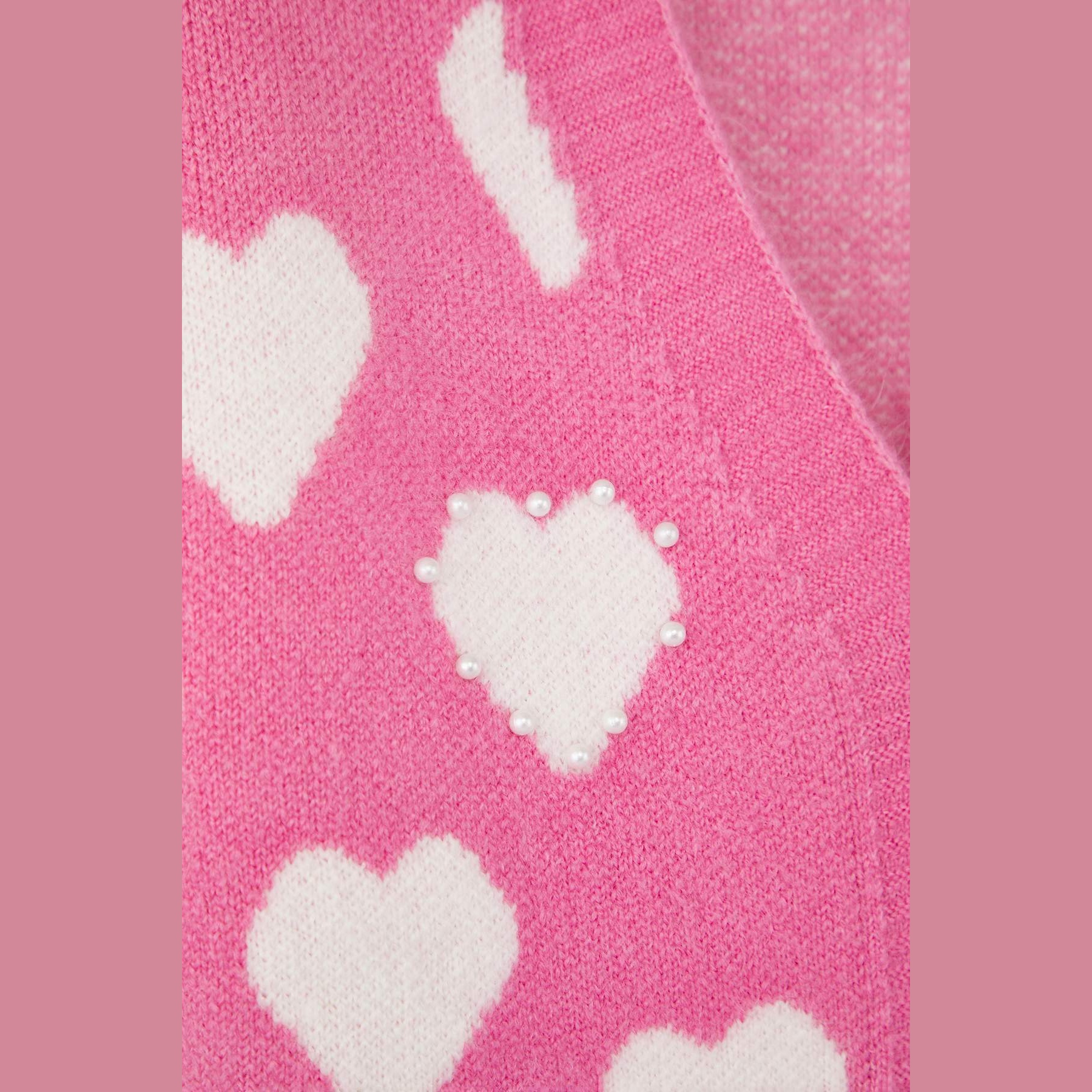 كارديغان بناتي – وردي بنقشة قلوب وتفاصيل لؤلؤ (دفء ناعم بإطلالة طفولية ساحرة)