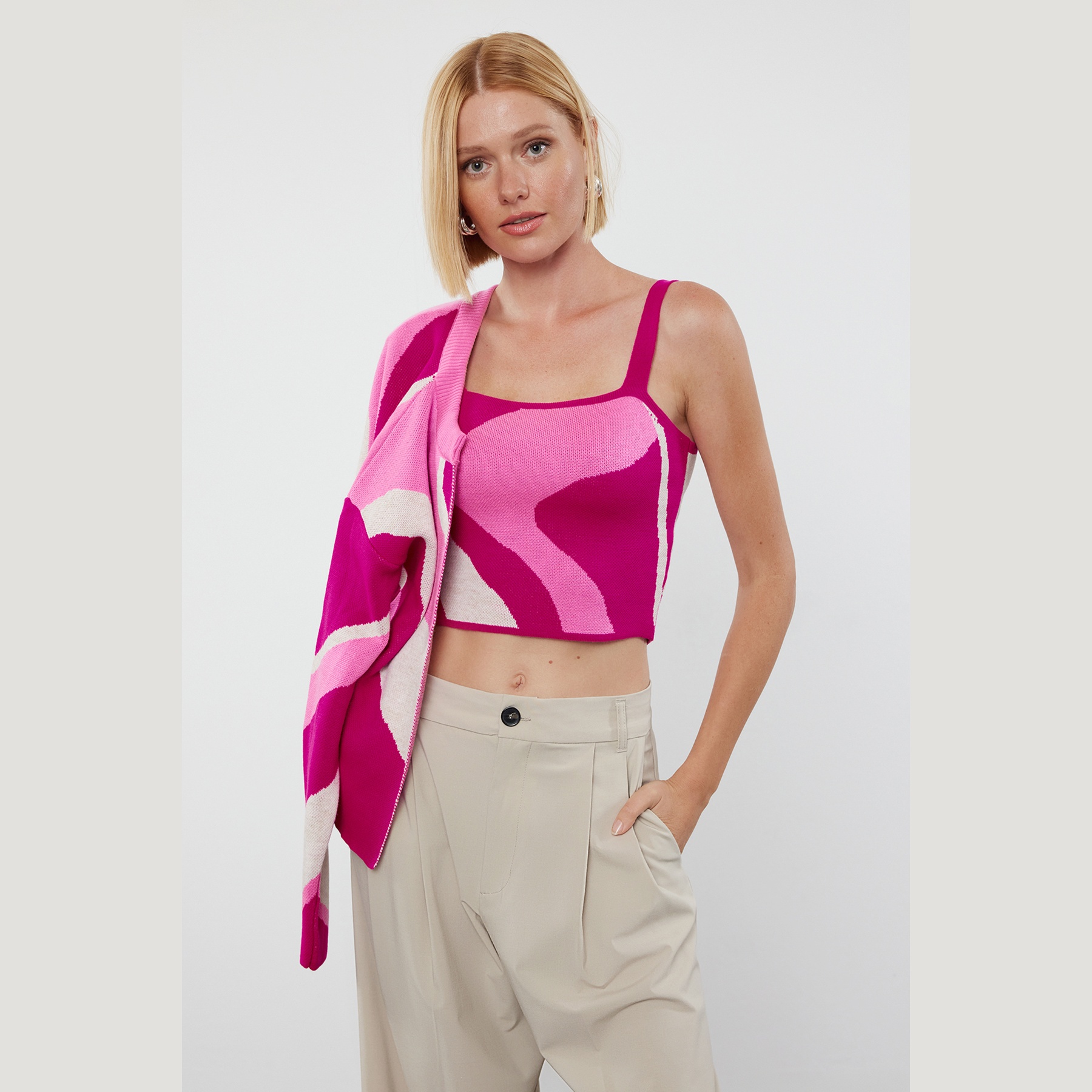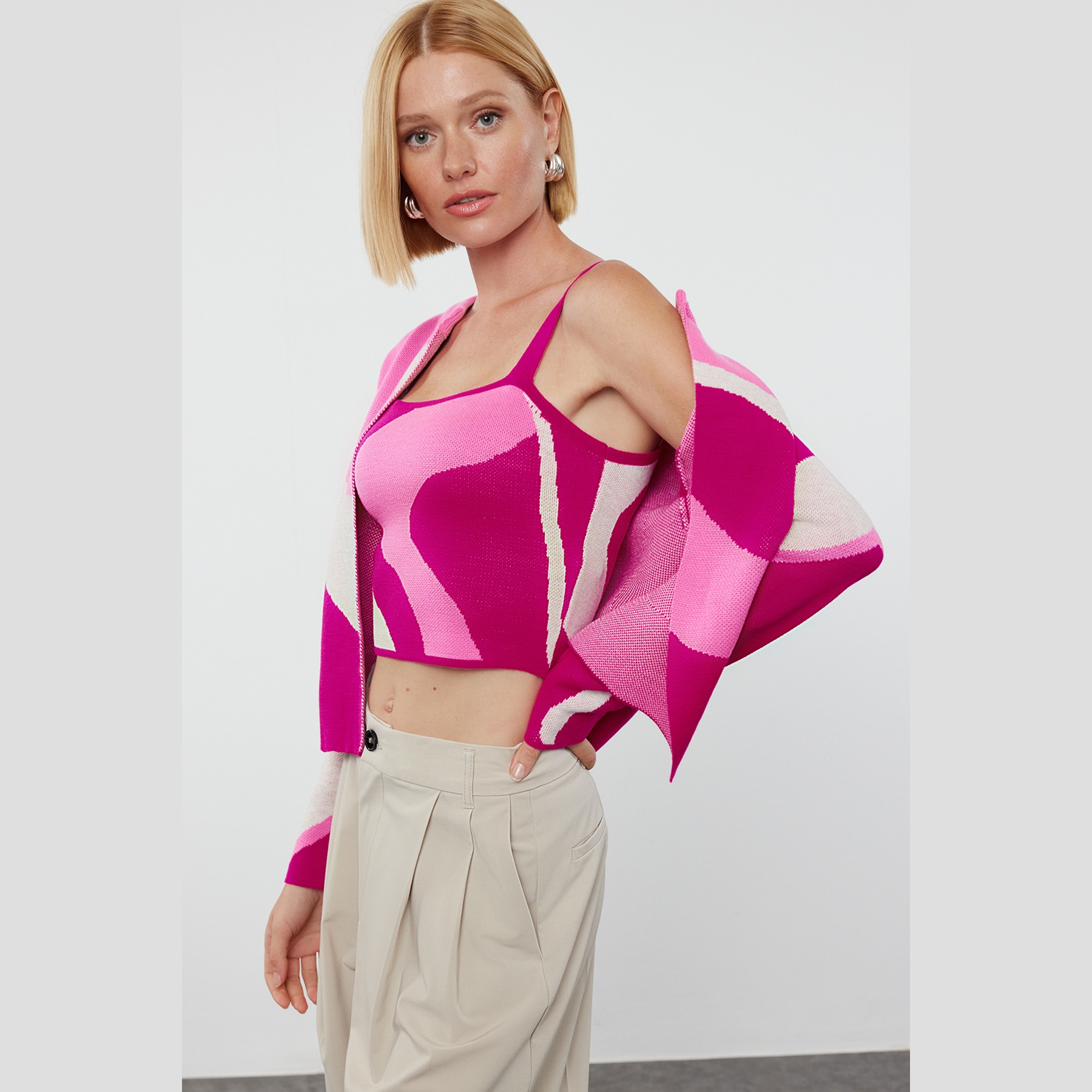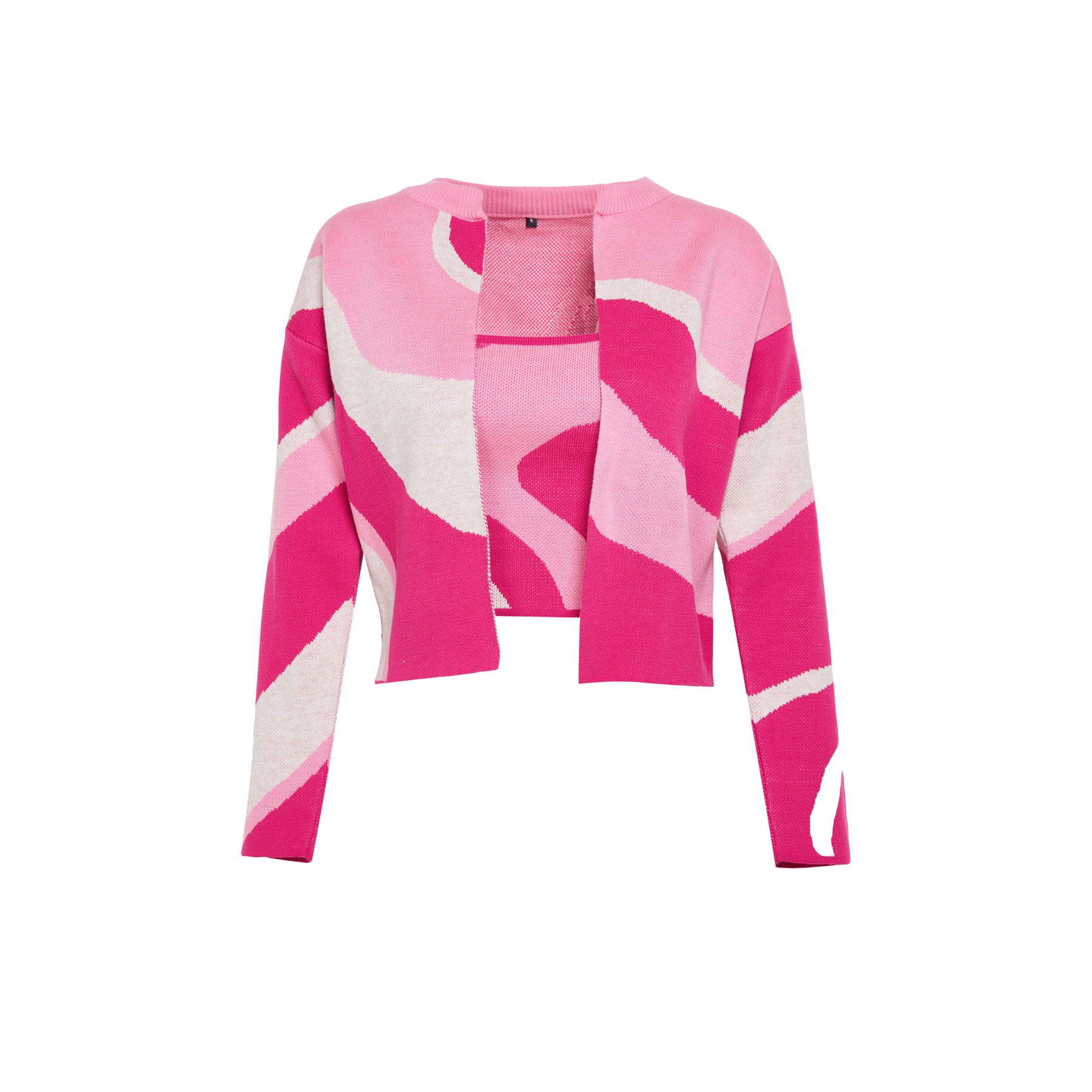 طقم نسائي مكون من بلوزة داخلية بدون أكمام وهُرْكة خارجية طويلة، مصنوع بالكامل من خامة تريكو محاكة من الأكريليك، يتميز بملمس متوسط السماكة ونقشة لونية متباينة تضيف طابعًا عصريًا. مناسب للإطلالات اليومية في مواسم الانتقال، ويمنح تنسيقًا جاهزًا يجمع بين الراحة والأناقة.