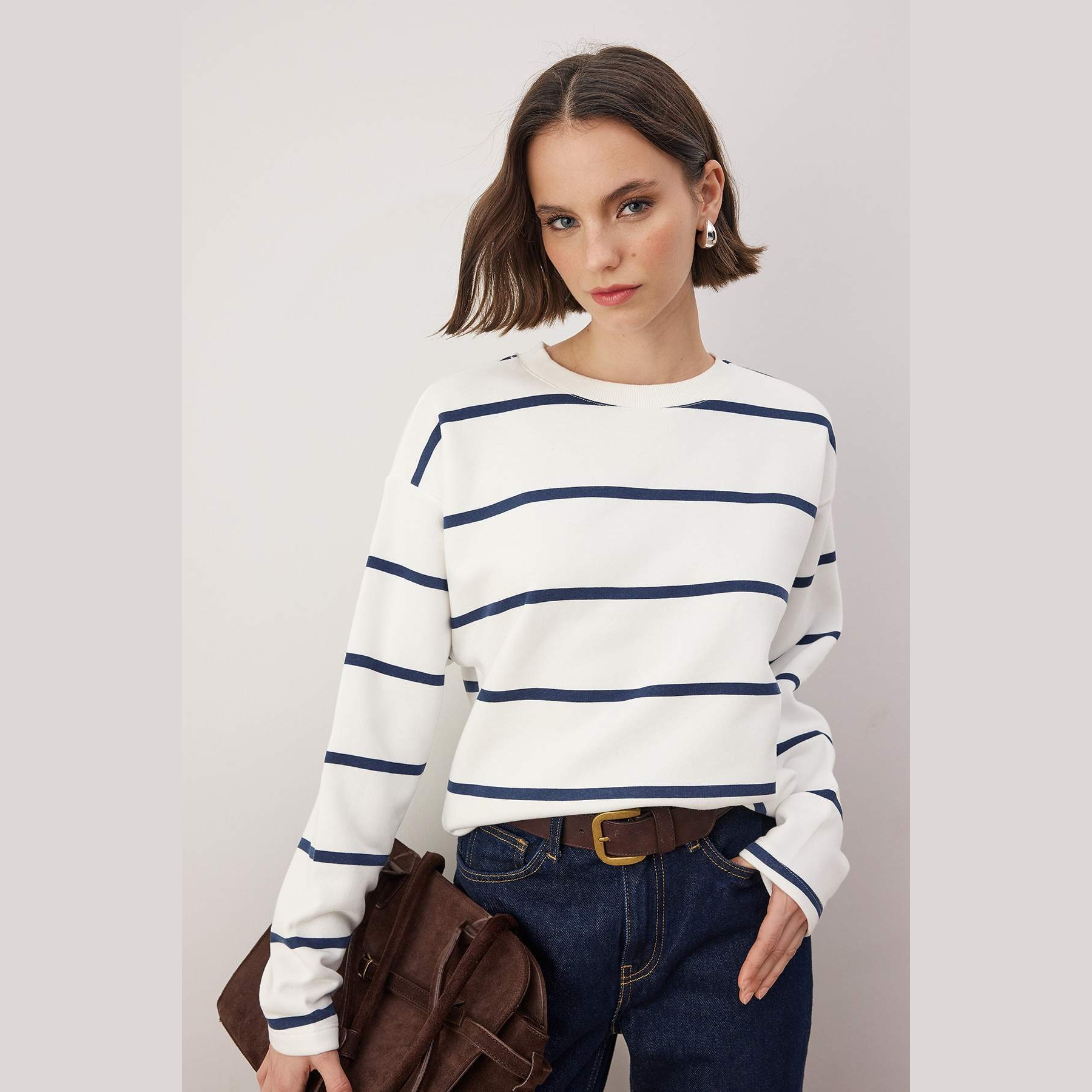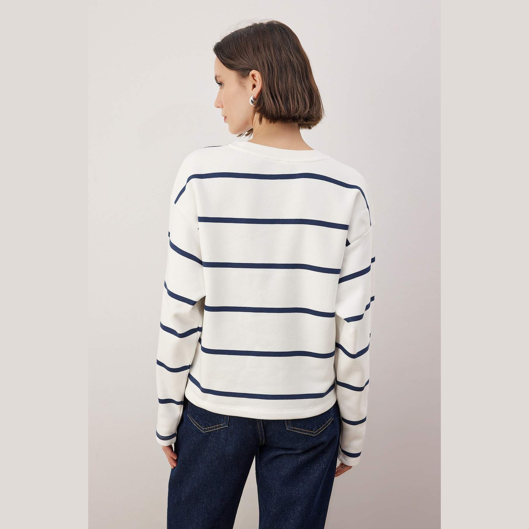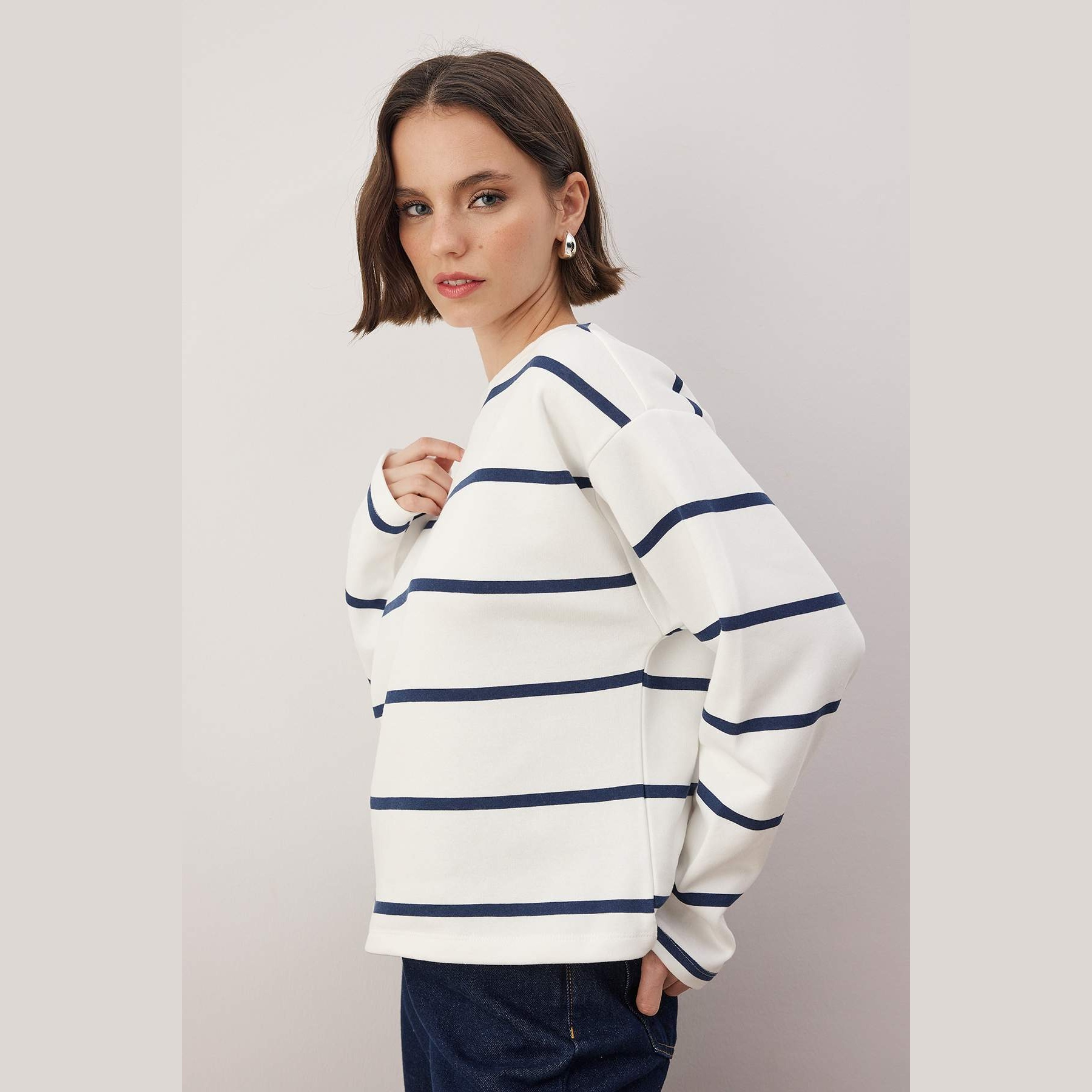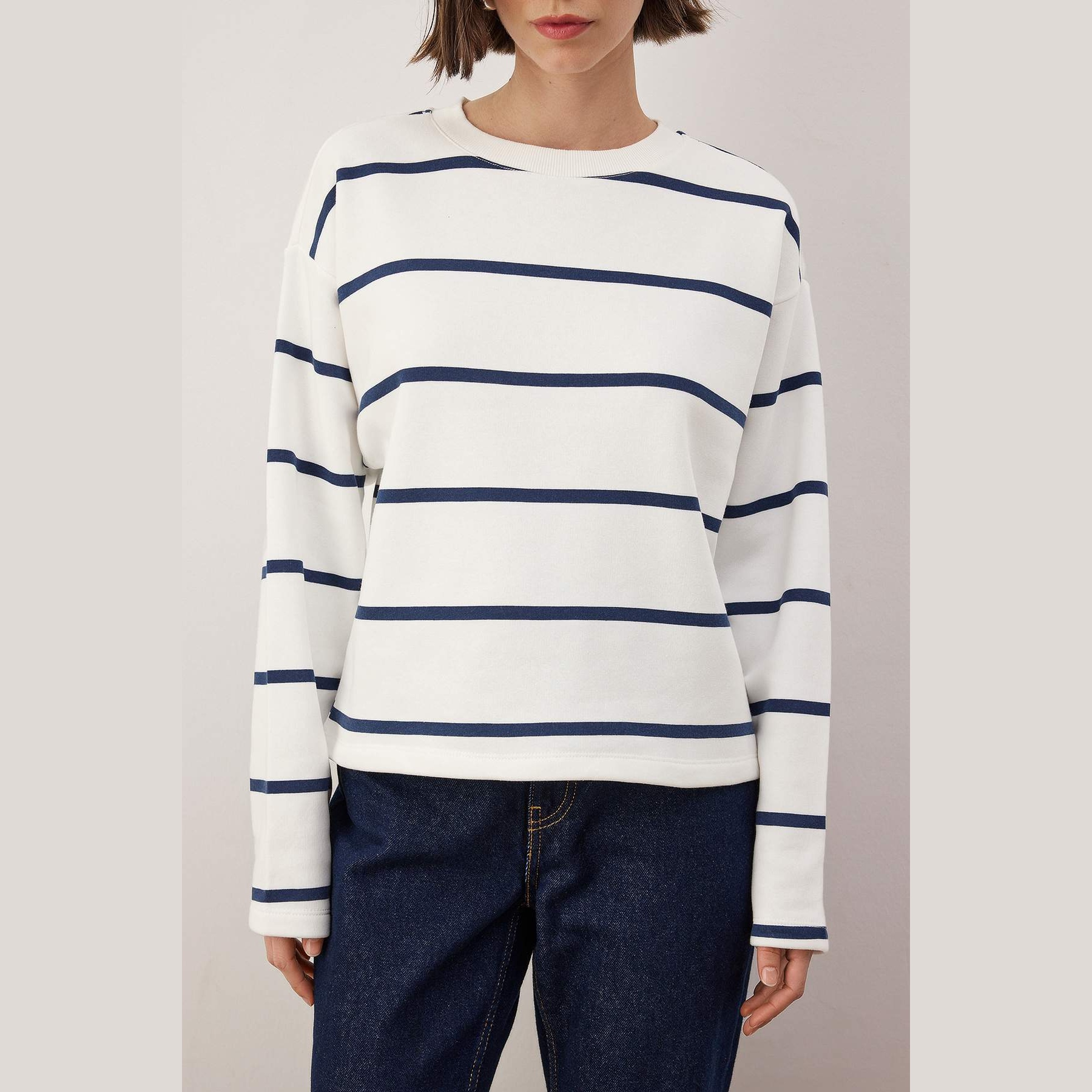 سويت شيرت نسائي بلون إكرُو مع خطوط أفقية، مصنوع من خامة محاكة بتركيبة ثنائية من القطن والبوليستر، يتميز بنسيج شاردونلي بثلاث طبقات يمنح دفئًا ناعمًا وملمسًا مريحًا. يأتي بقصة منتظمة وياقة دائرية وأكمام طويلة بتصميم كتف منخفض، ما يجعله خيارًا مثاليًا للإطلالات اليومية في الأجواء الباردة.
