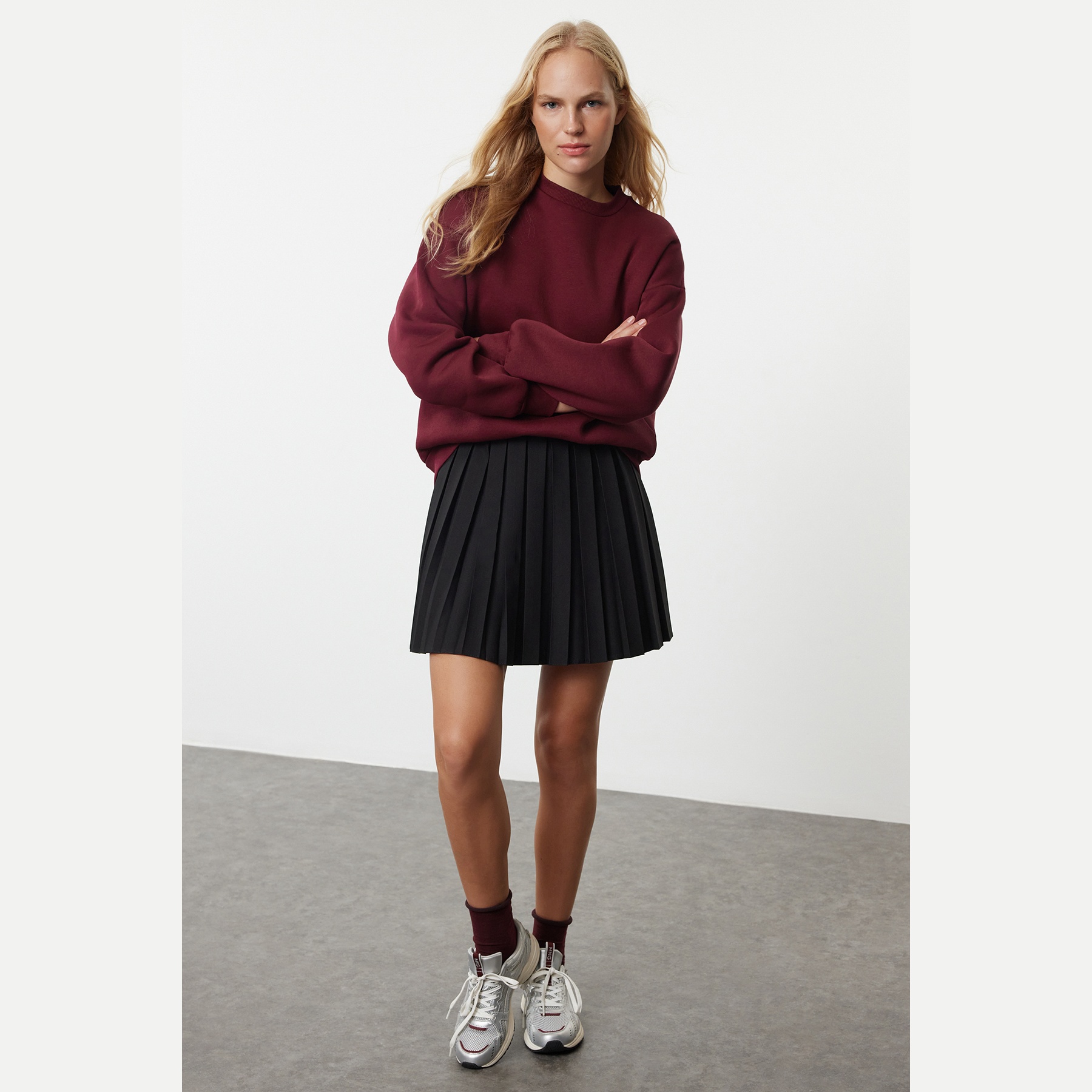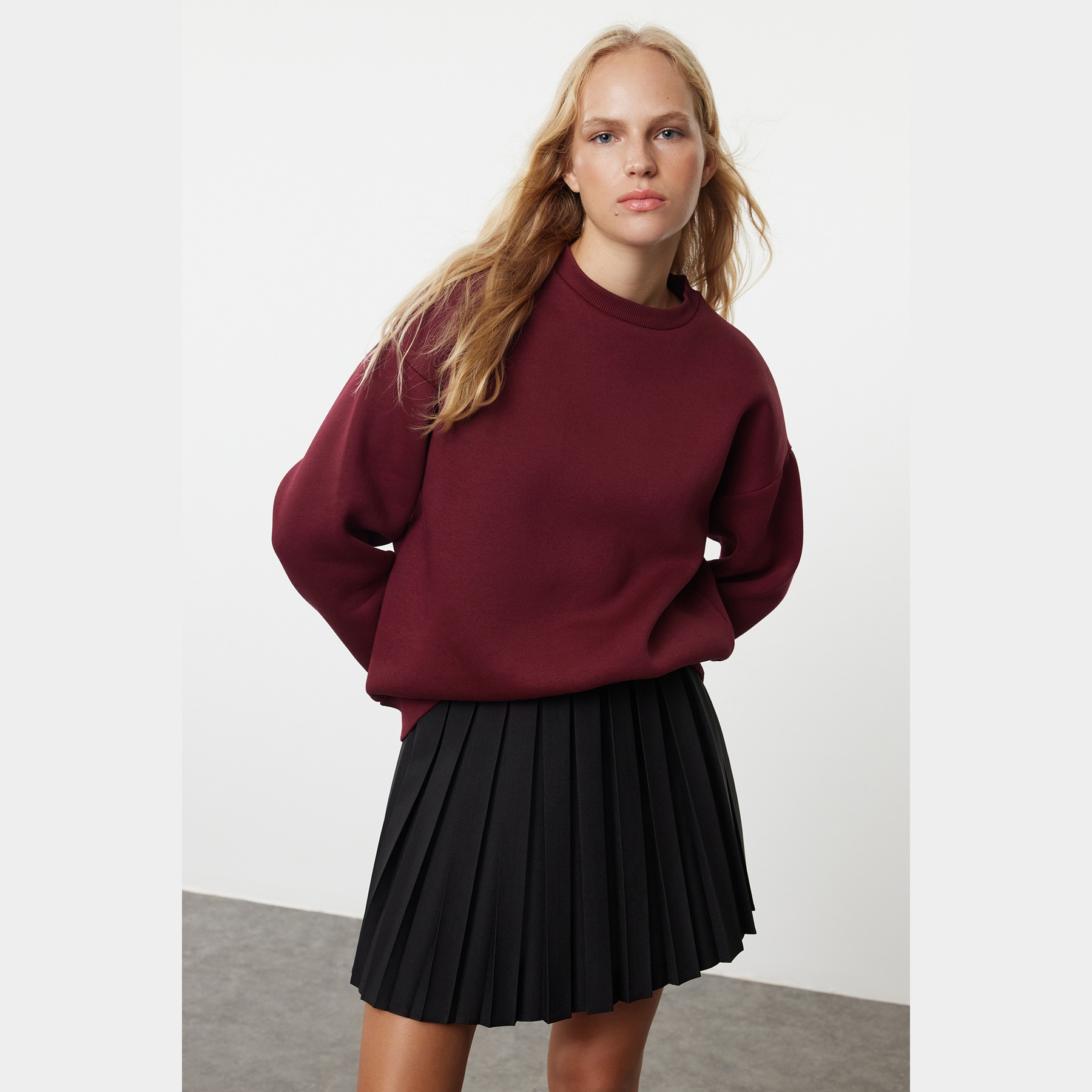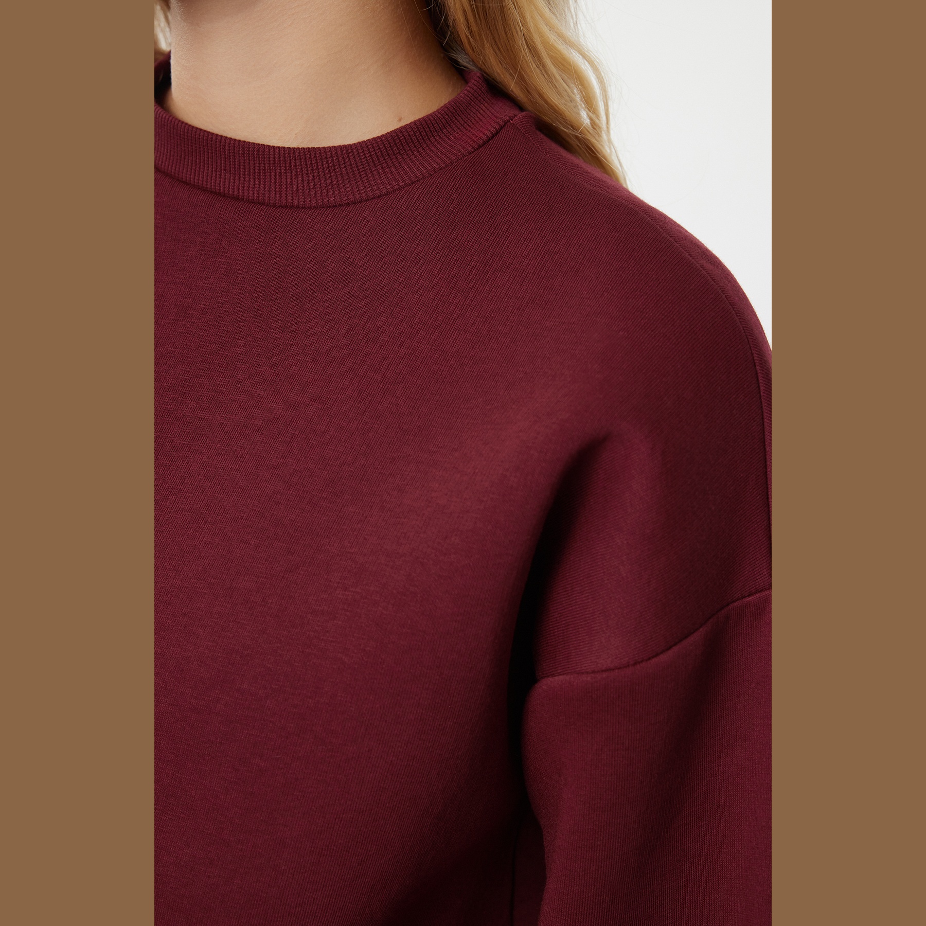 سويت شيرت نسائي بلون بوردو، مصنوع من خامة محاكة بتركيبة ثنائية من القطن والبوليستر، يتميز بملمس متوسط السماكة وقصة واسعة تمنح مظهرًا فضفاضًا ومريحًا. يأتي بياقة دائرية وأكمام طويلة بتصميم كتف منخفض، ما يجعله خيارًا مثاليًا للإطلالات اليومية في فصل الشتاء.