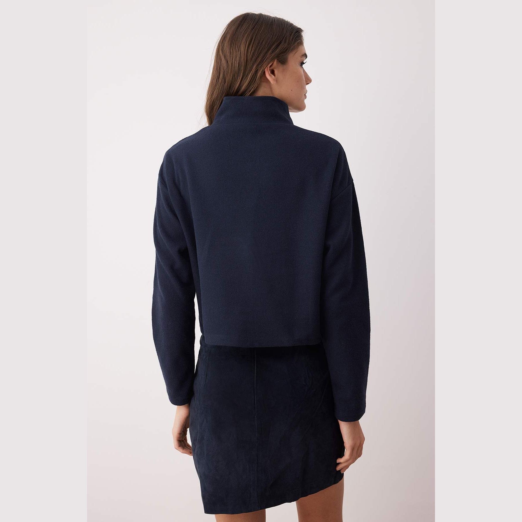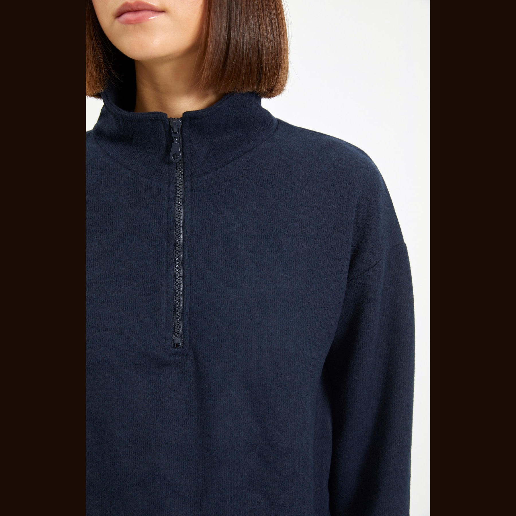 سويت شيرت نسائي بلون كحلي، مصنوع من خامة محاكة بتركيبة ثنائية من البوليستر والقطن، يتميز بملمس متوسط السماكة ومظهر تريكو يمنح طابعًا كلاسيكيًا دافئًا. يأتي بقصة منتظمة وياقة مرتفعة بسحاب أمامي وأكمام طويلة بتصميم كتف منخفض، ما يجعله خيارًا مثاليًا للإطلالات اليومية في فصل الشتاء.