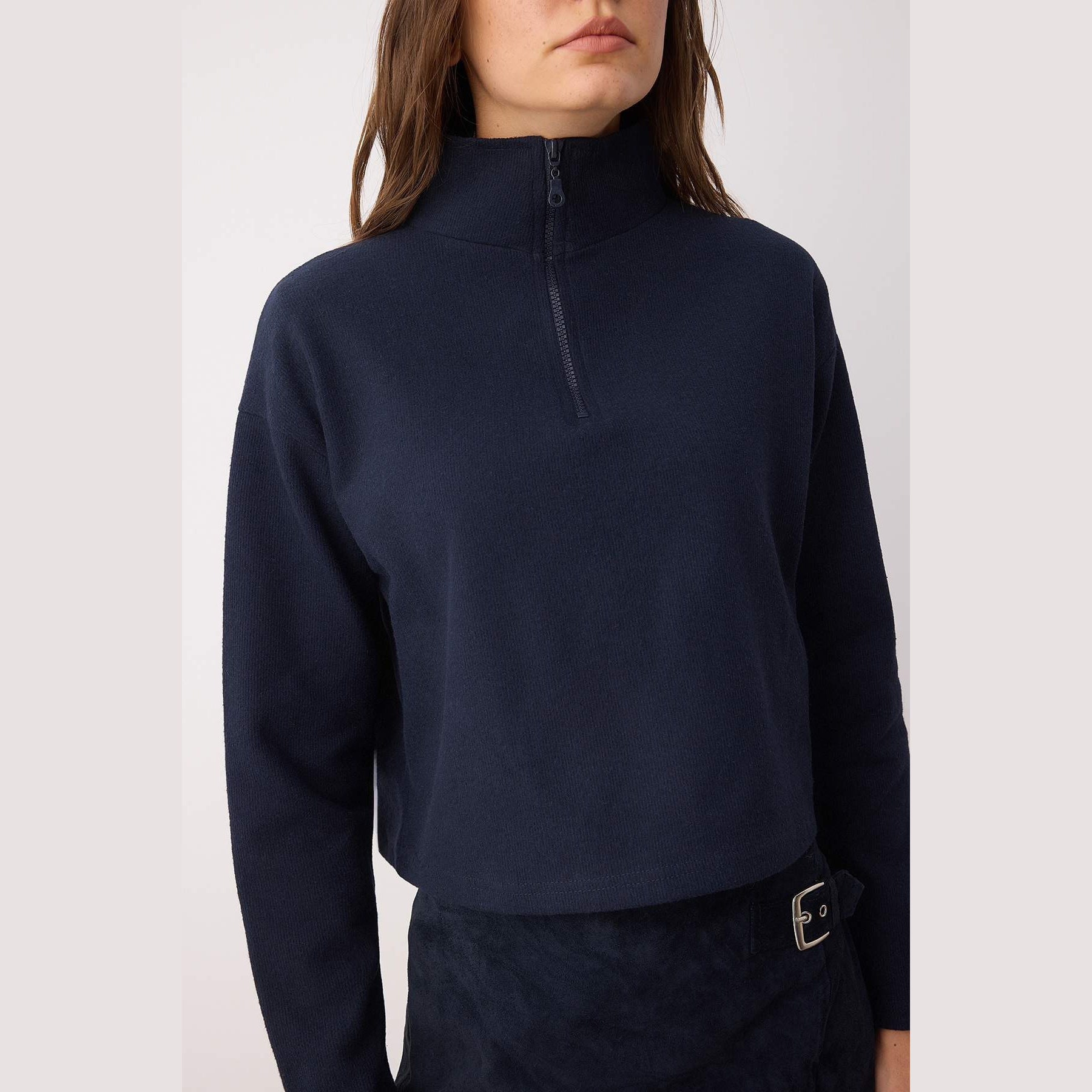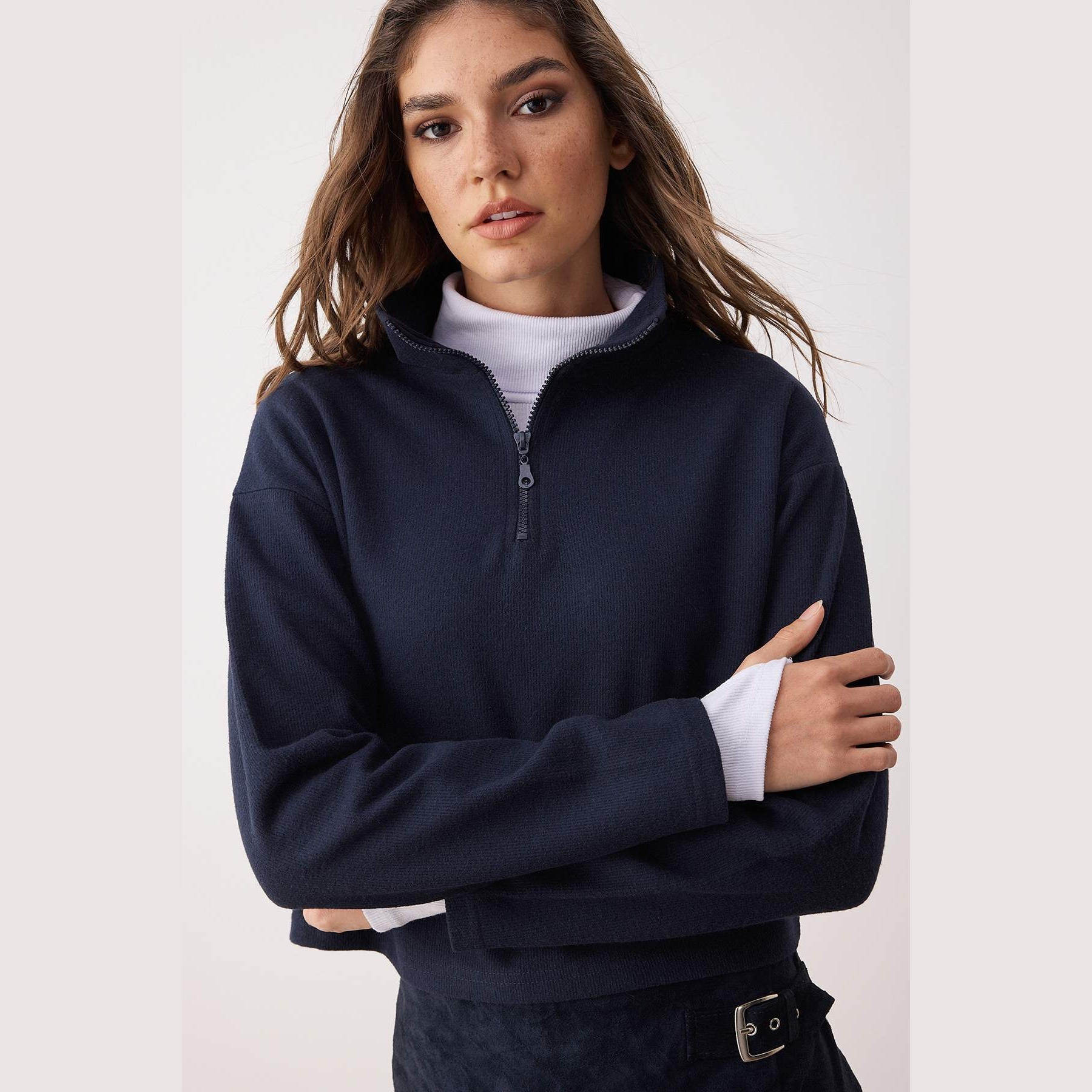 سويت شيرت نسائي – كحلي بياقة بسحاب ومظهر تريكو (دفء عملي بإطلالة أنيقة)