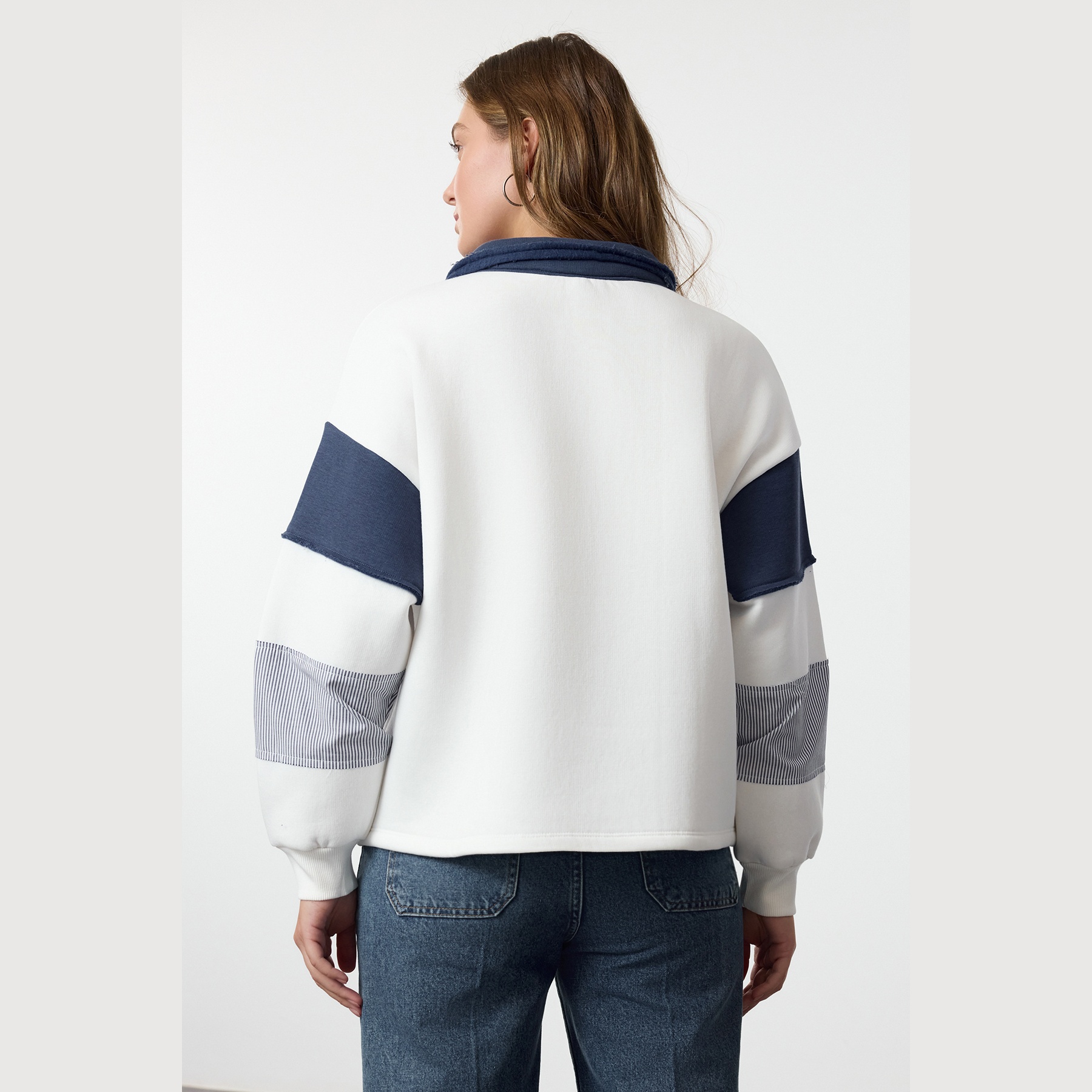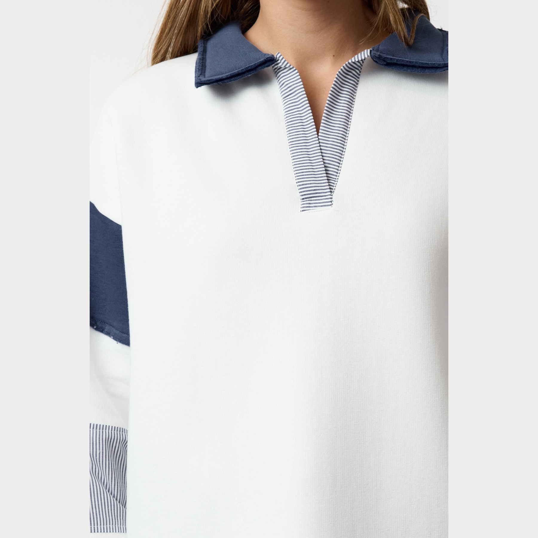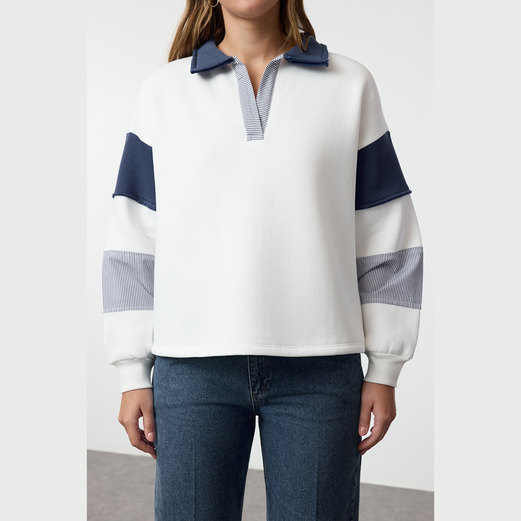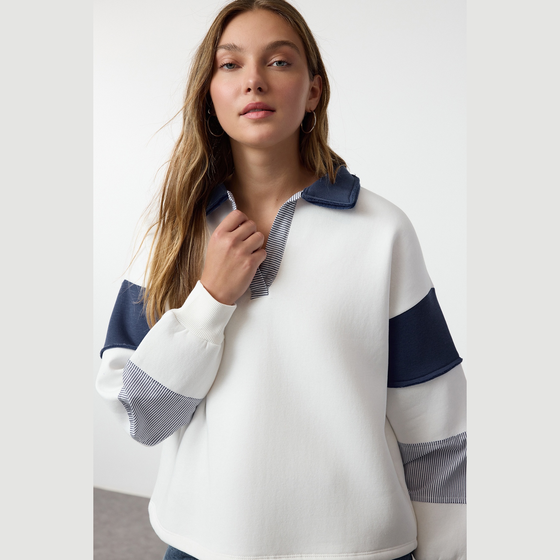 سويت شيرت نسائي بلون إكرُو مع تفاصيل قماشية بلون متباين، مصنوع من خامة محاكة بتركيبة ثلاثية من القطن والبوليستر والفيـسكوز، يتميز بملمس متوسط السماكة وقصة واسعة تمنح مظهرًا فضفاضًا ومريحًا. يأتي بياقة بولو وأكمام طويلة بتصميم كتف منخفض، ويبرز بتفاصيل قماشية تضيف لمسة تصميمية أنيقة.