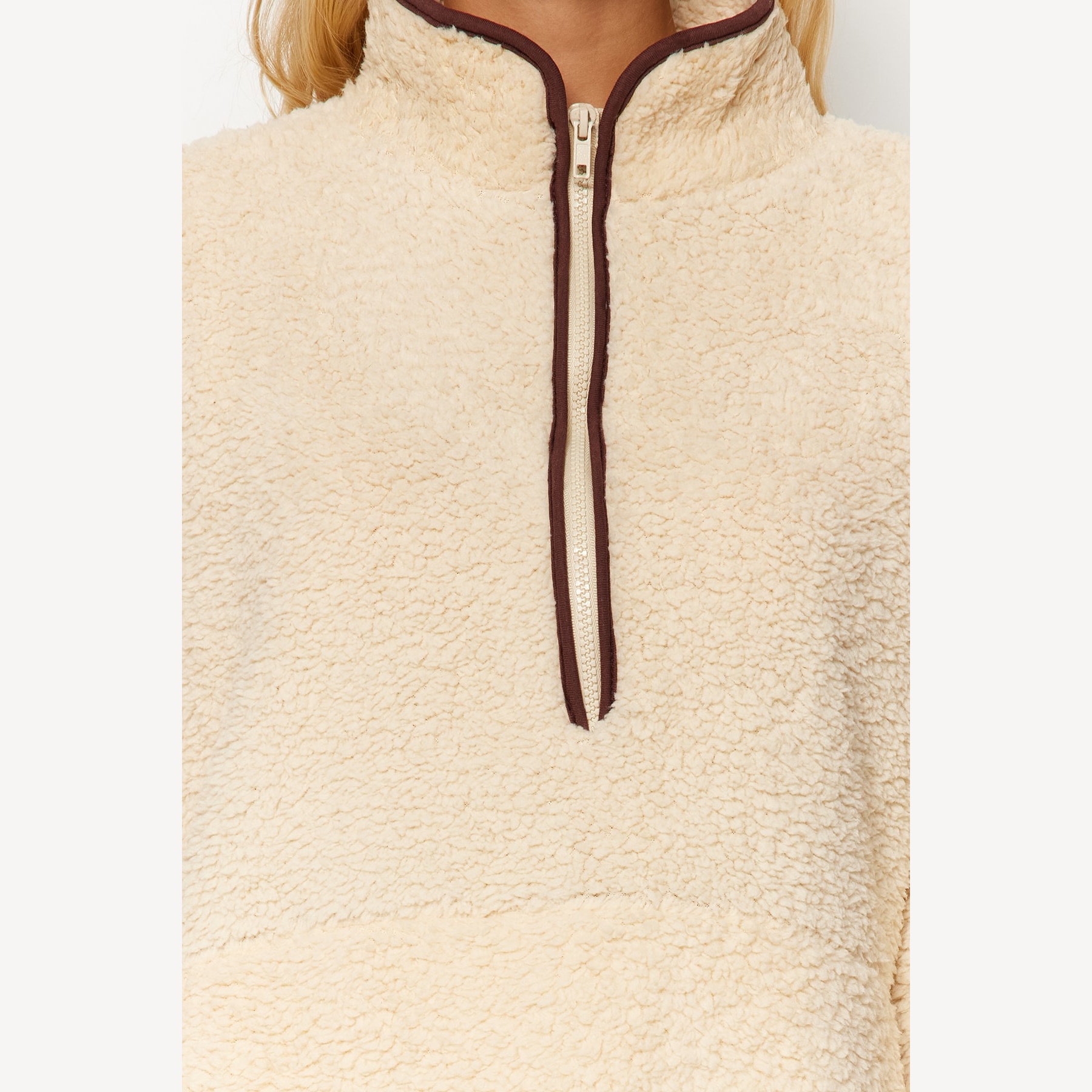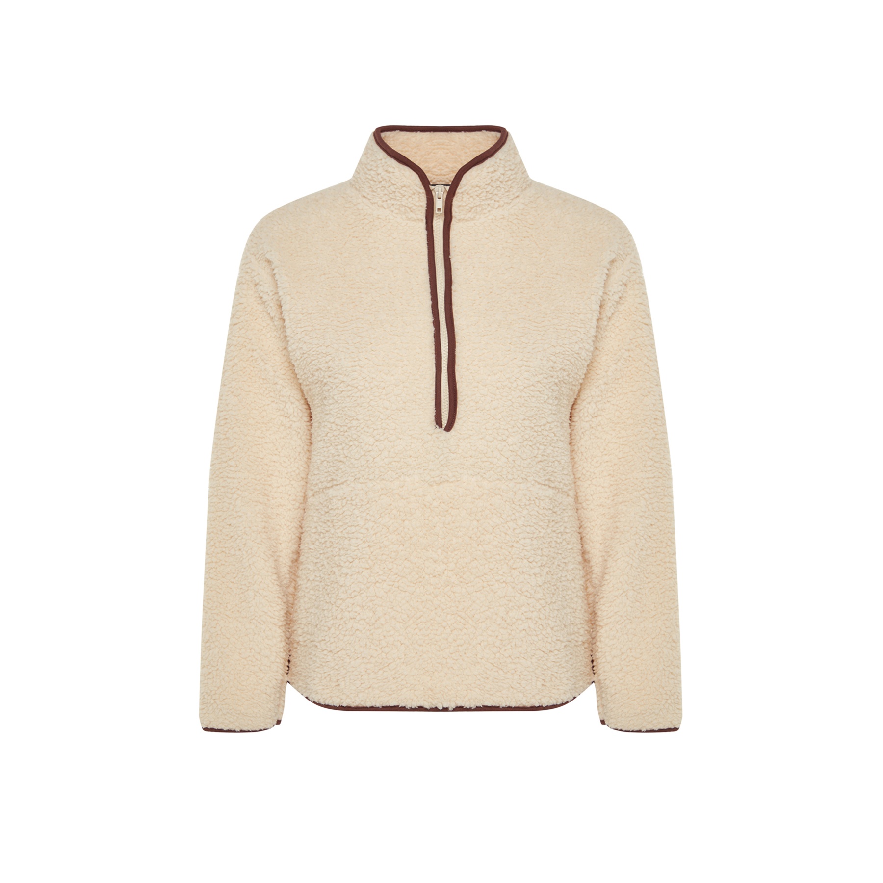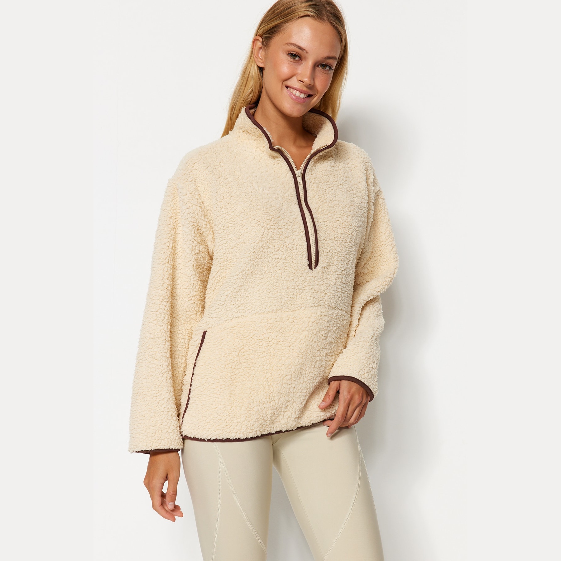 سويت شيرت نسائي بلون إكرُو، مصنوع بالكامل من خامة محاكة من البوليستر، يتميز بملمس فرو صناعي ناعم يمنح دفئًا مثاليًا وراحة فائقة في الأجواء الشتوية. يأتي بقصة منتظمة وياقة مرتفعة وأكمام طويلة بتصميم كتف منخفض، ما يجعله خيارًا مثاليًا للإطلالات اليومية والرياضية.