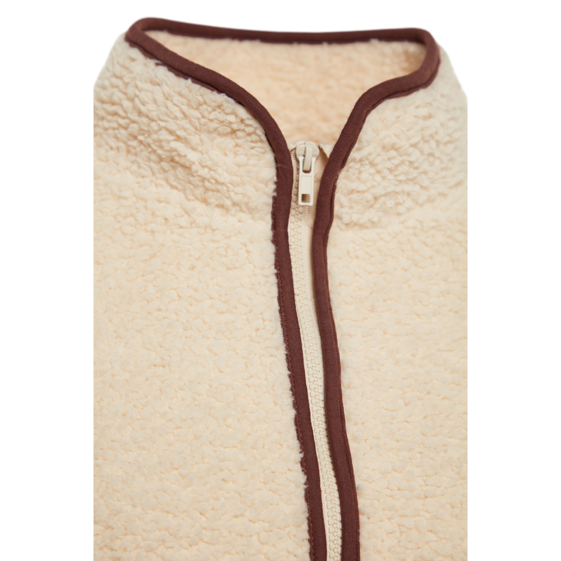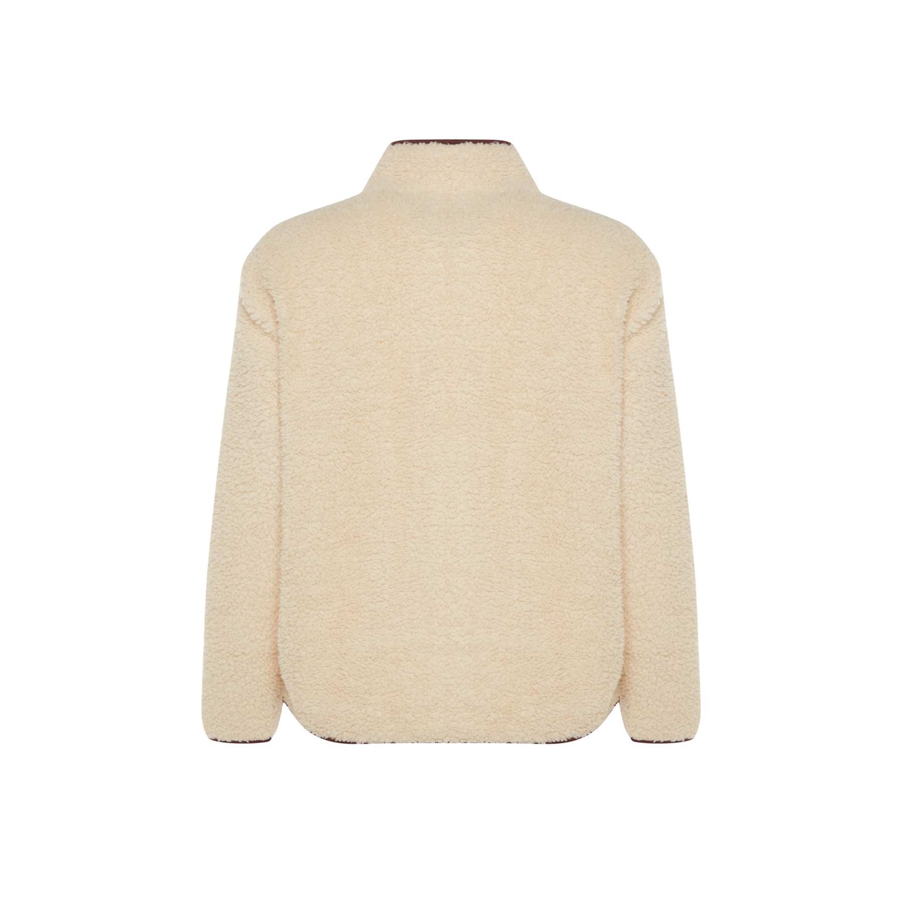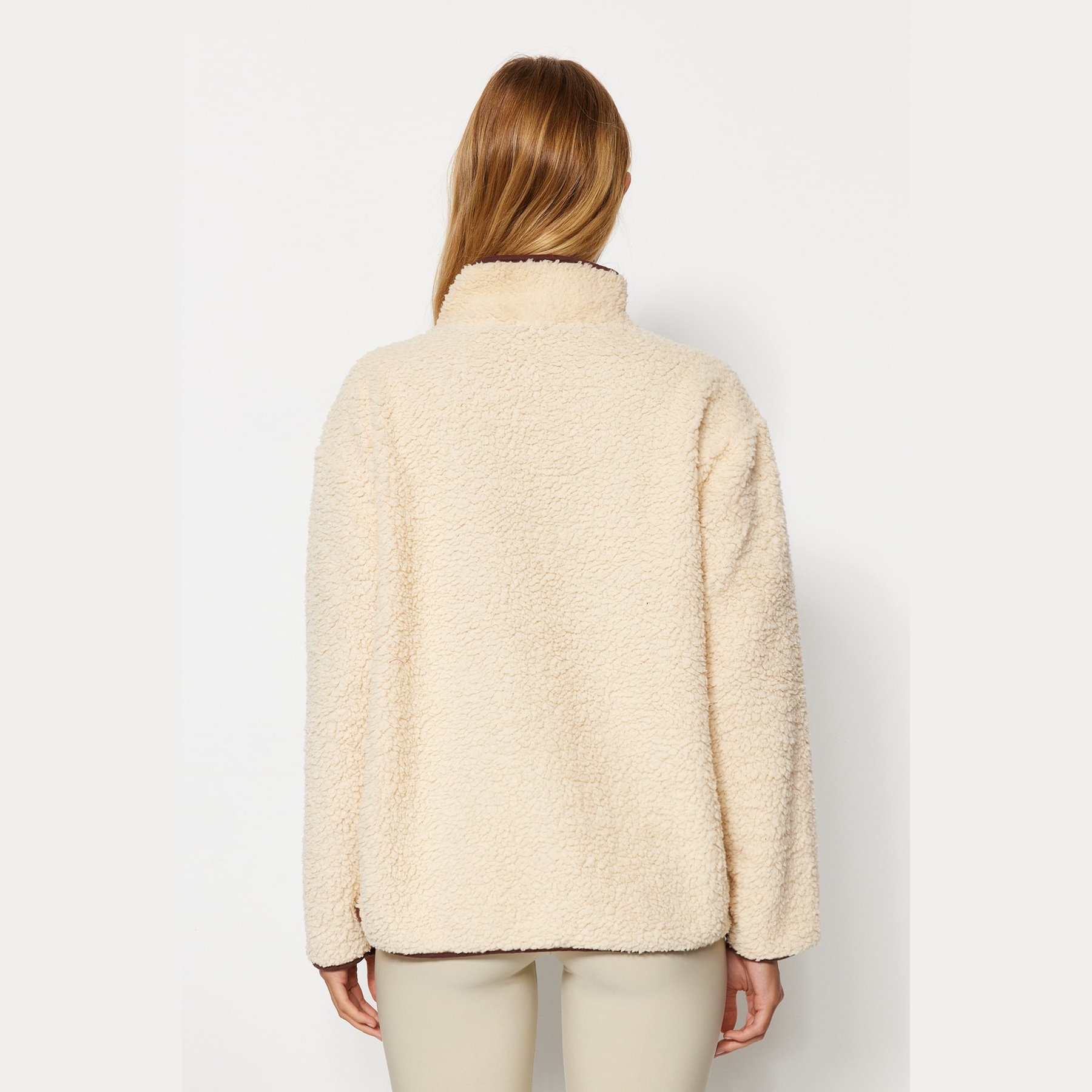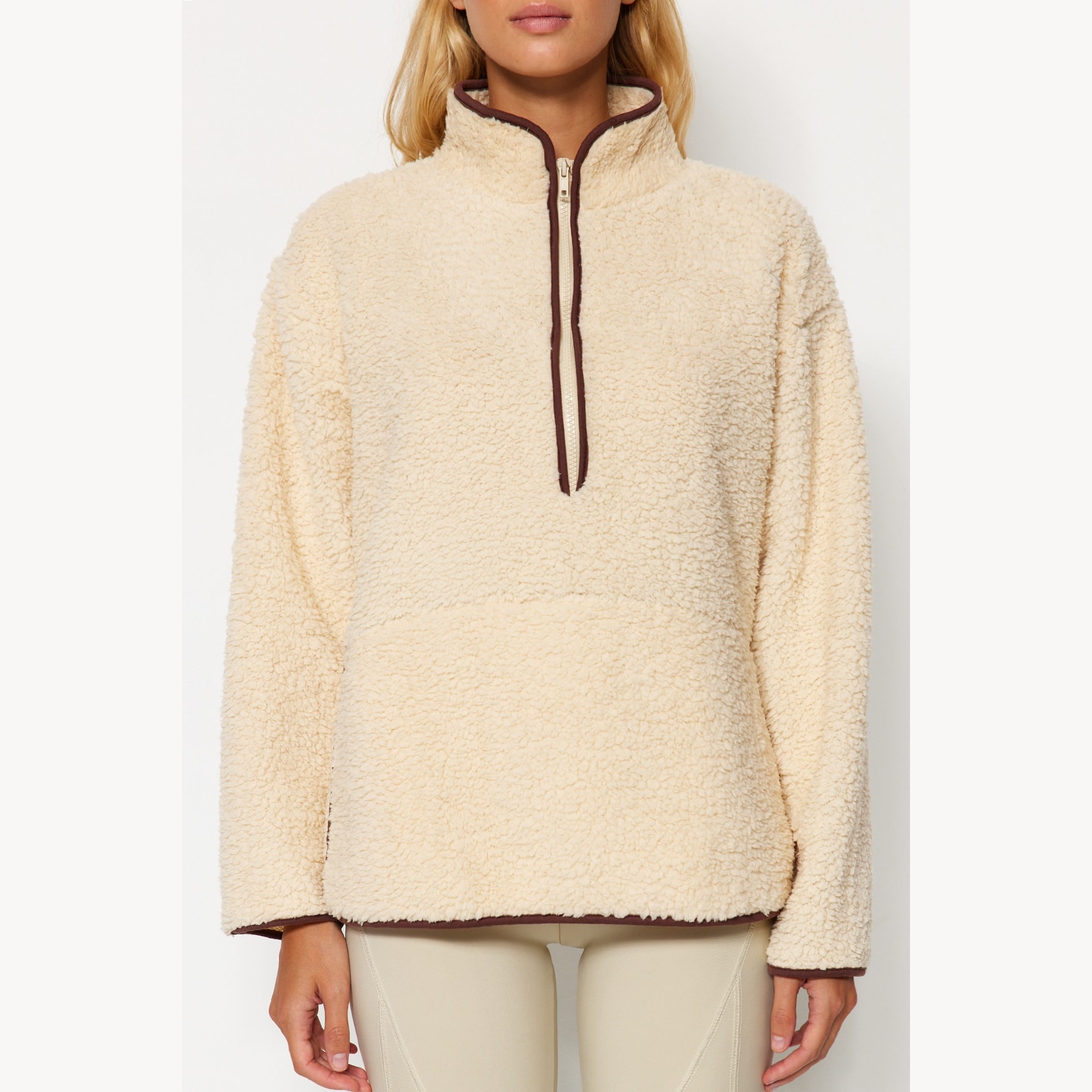 سويت شيرت نسائي بلون إكرُو، مصنوع بالكامل من خامة محاكة من البوليستر، يتميز بملمس فرو صناعي ناعم يمنح دفئًا مثاليًا وراحة فائقة في الأجواء الشتوية. يأتي بقصة منتظمة وياقة مرتفعة وأكمام طويلة بتصميم كتف منخفض، ما يجعله خيارًا مثاليًا للإطلالات اليومية والرياضية.