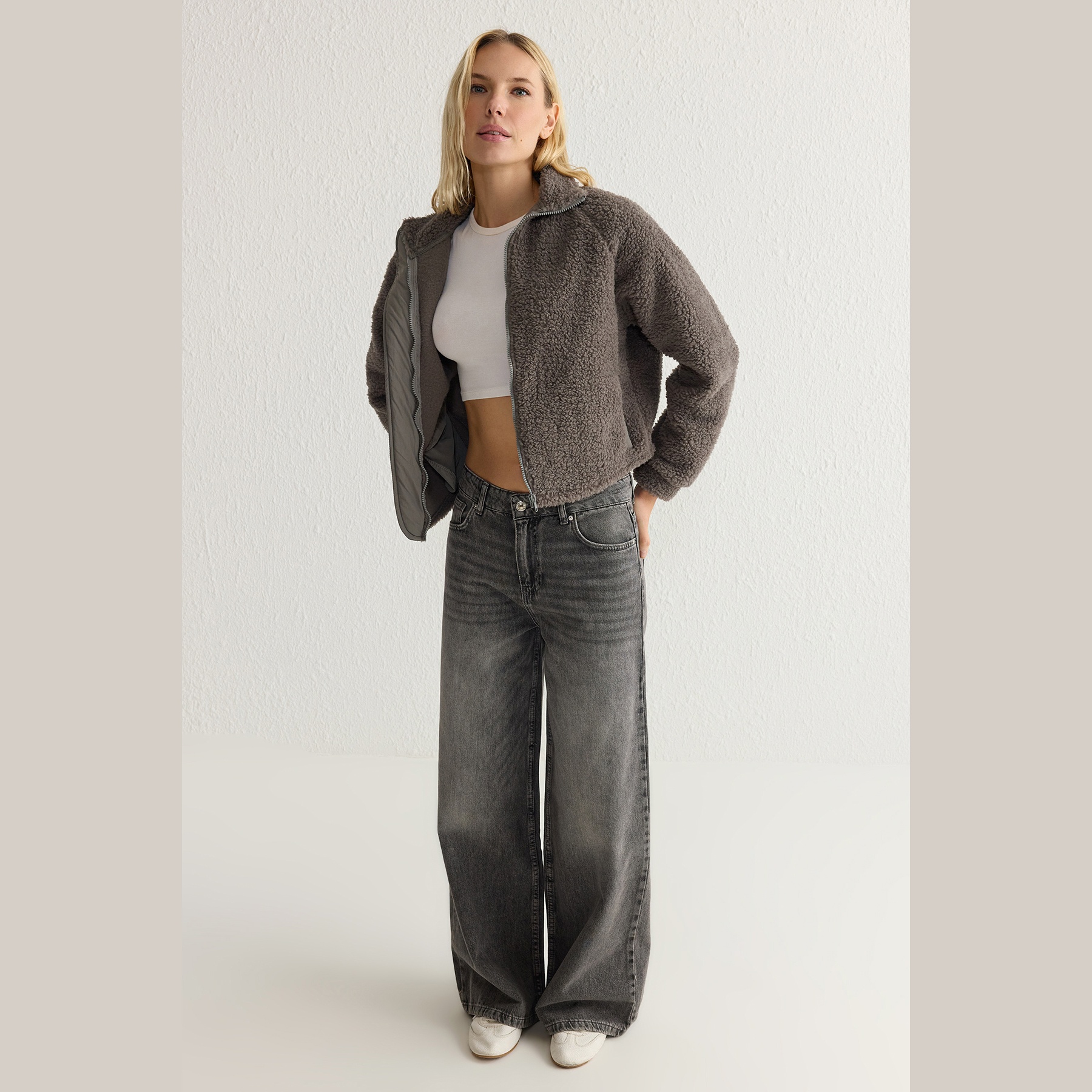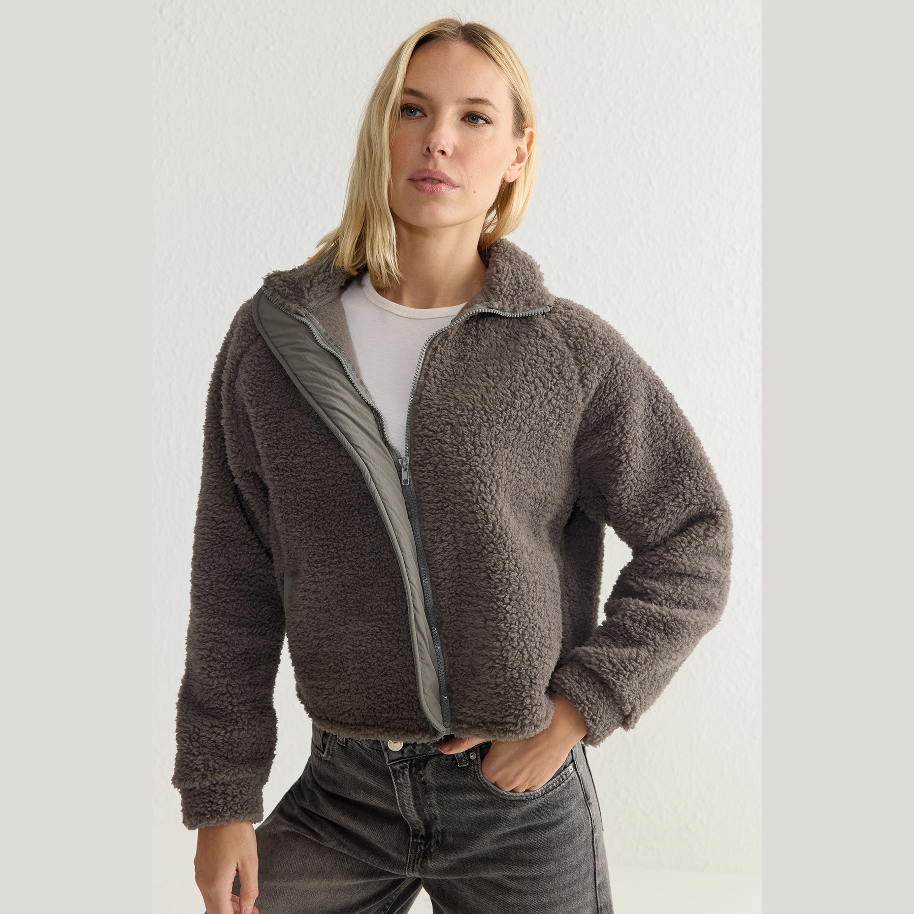 سويت شيرت نسائي – رمادي داكن بخامة فرو صناعي وسحاب أمامي (دفء فائق بإطلالة عملية أنيقة)