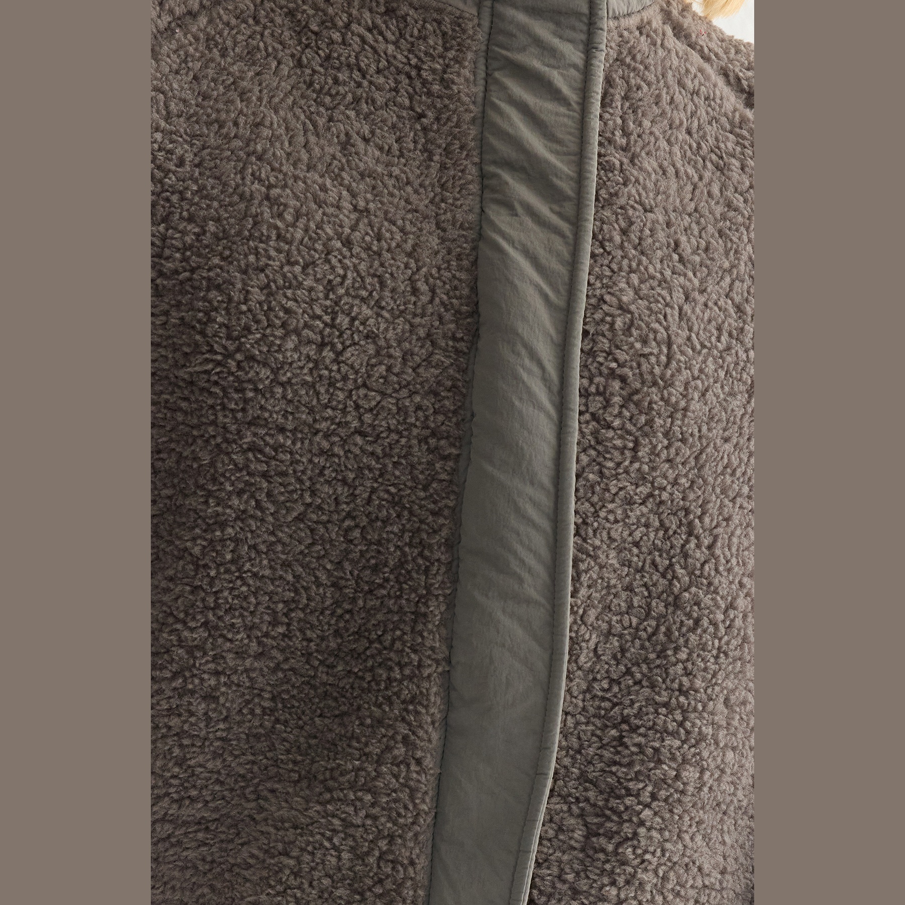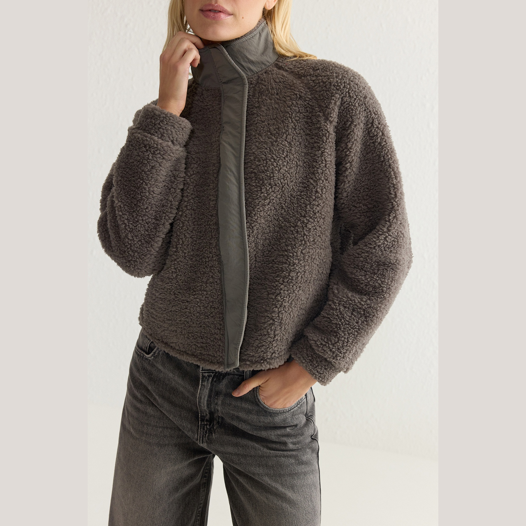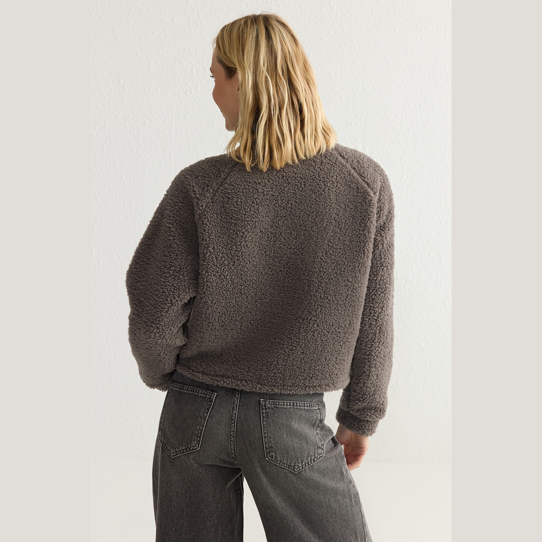 سويت شيرت نسائي بلون رمادي داكن، مصنوع من خامة محاكة سميكة بتركيبة كاملة من البوليستر، يتميز بملمس فرو صناعي ناعم يمنح دفئًا مثاليًا وراحة فائقة في الأجواء الشتوية. يأتي بقصة منتظمة وياقة مرتفعة بسحاب أمامي وأكمام طويلة بتصميم كتف منخفض، ويحتوي على جيوب جانبية عملية، بالإضافة إلى تفاصيل قماشية تضيف لمسة تصميمية أنيقة.