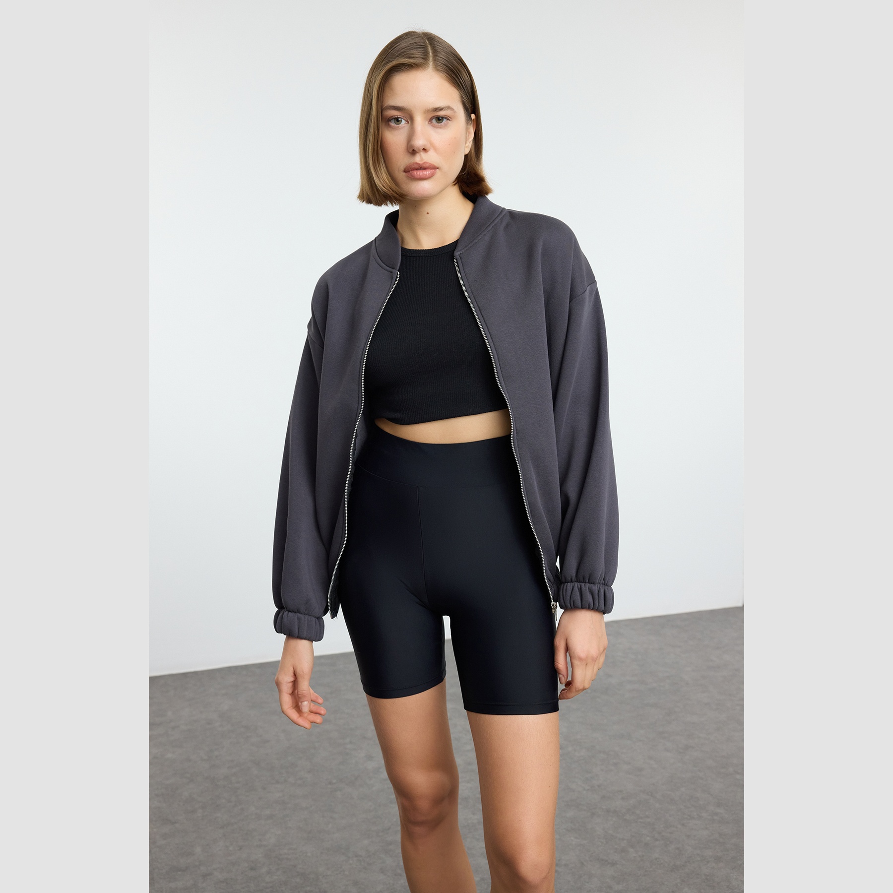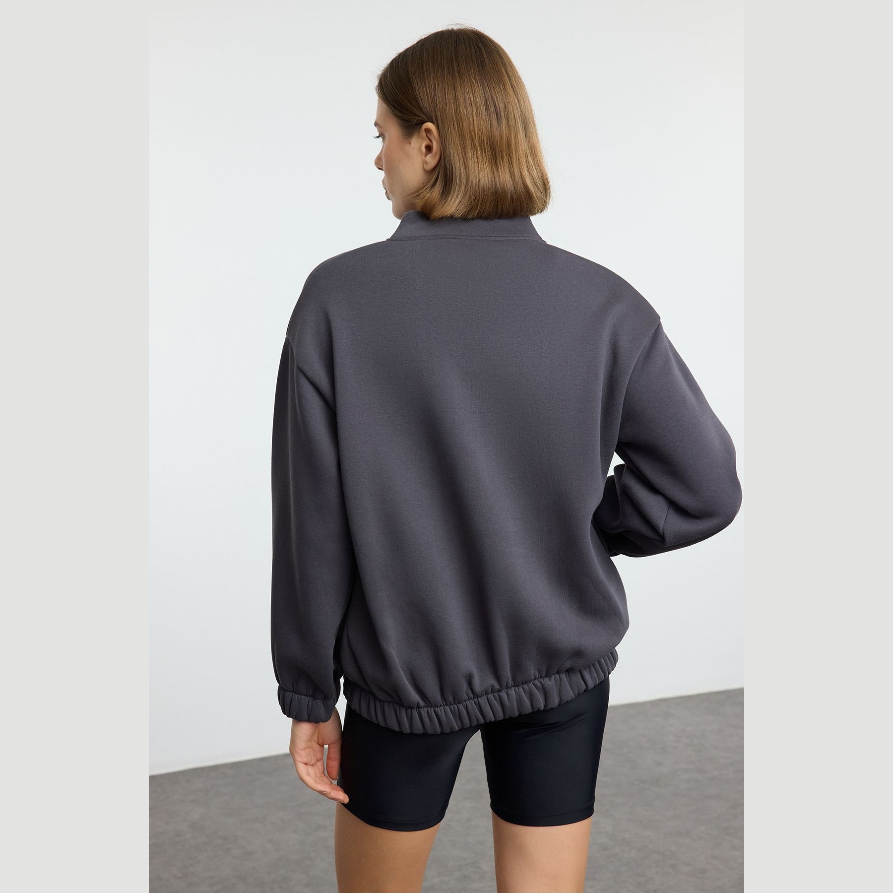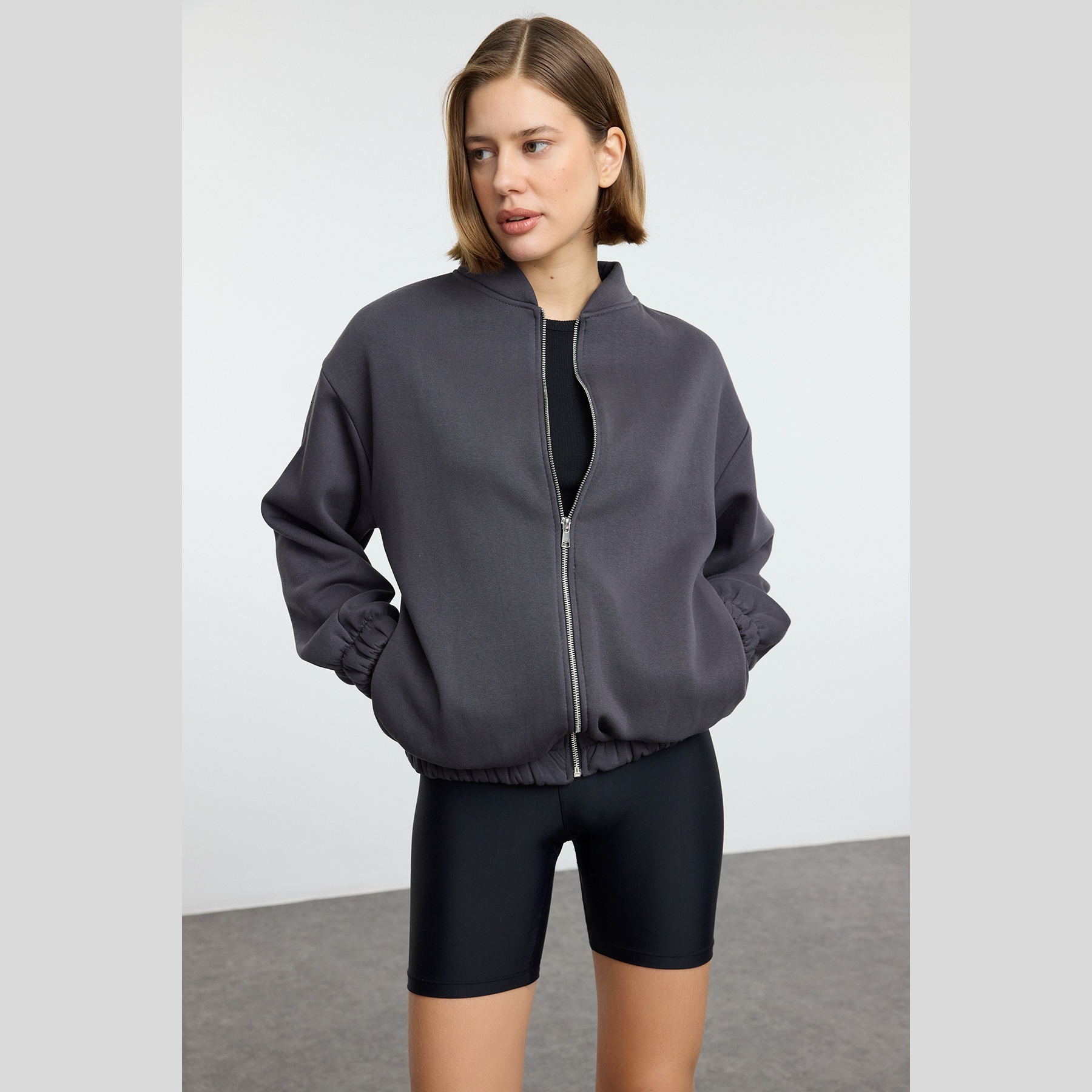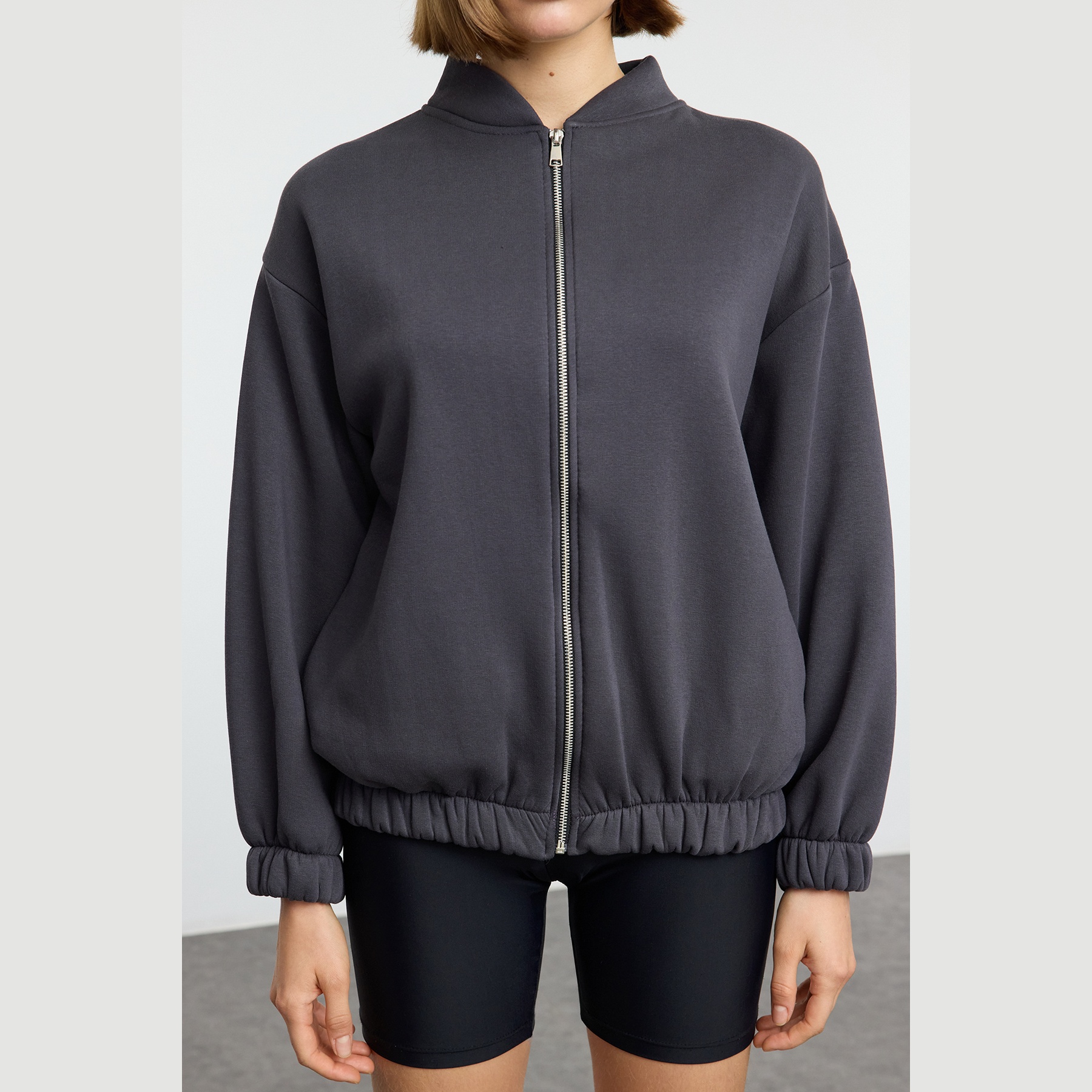 سويت شيرت نسائي – رمادي داكن بسحاب وقصة واسعة وبطانة داخلية (دفء فائق بإطلالة مريحة وعصرية)