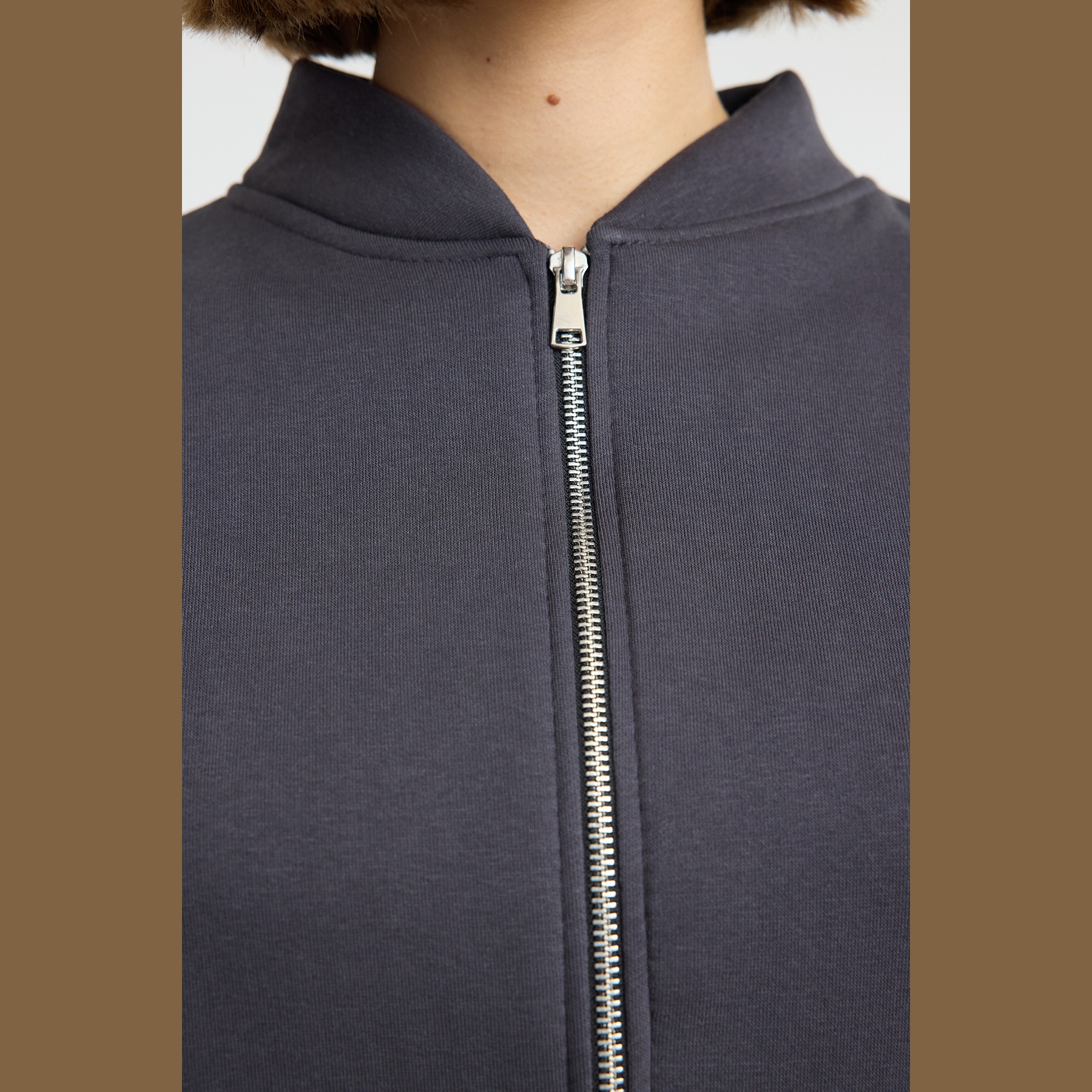 سويت شيرت نسائي بلون رمادي داكن، مصنوع من خامة محاكة بتركيبة ثنائية من القطن والبوليستر، يتميز بنسيج سميك داخلي مبطّن بطبقة فرو صناعي تمنح دفئًا فائقًا وراحة مثالية في الأجواء الشتوية. يأتي بقصة واسعة وسحاب أمامي وياقة دائرية وأكمام طويلة بتصميم كتف منخفض، ما يجعله خيارًا عمليًا للإطلالات اليومية.