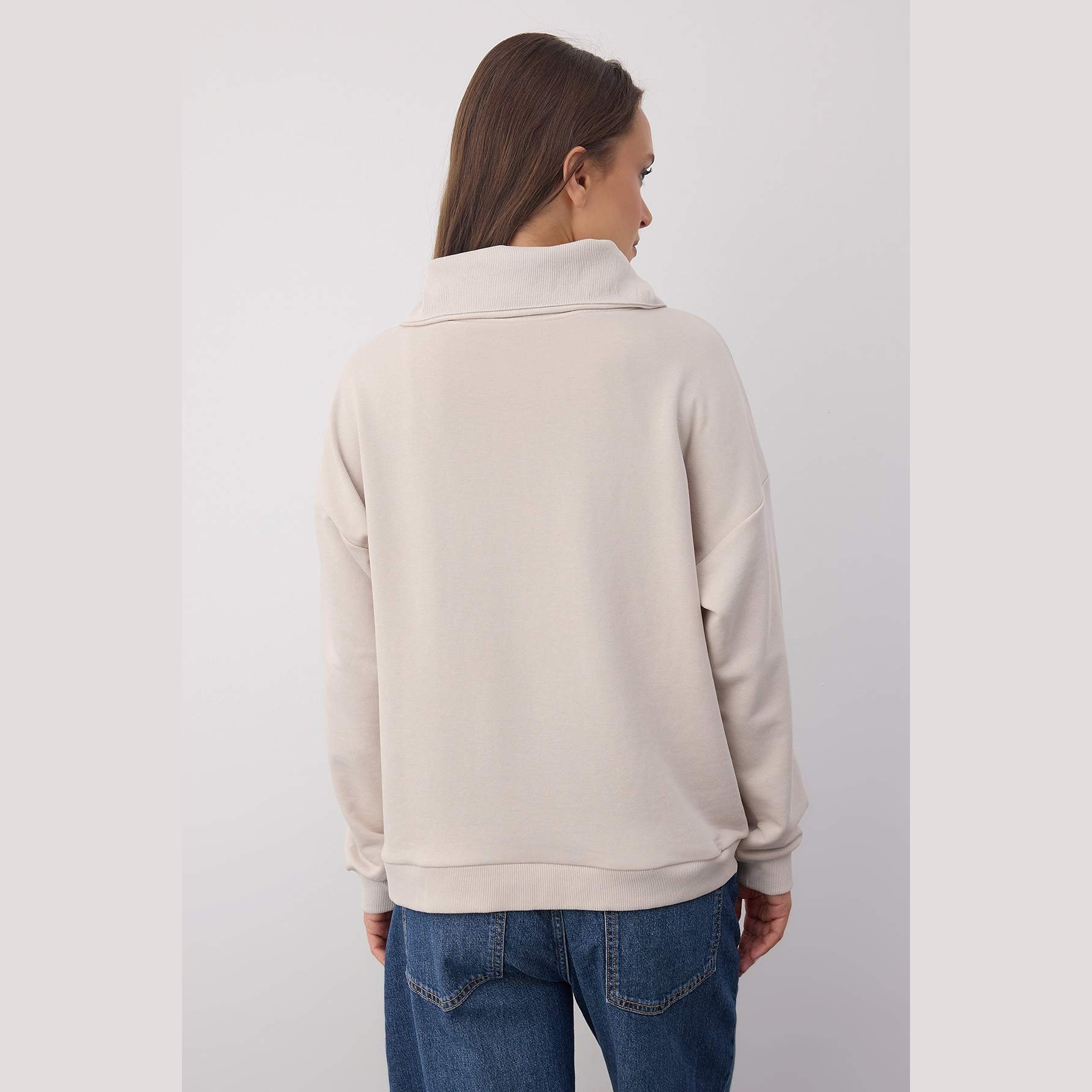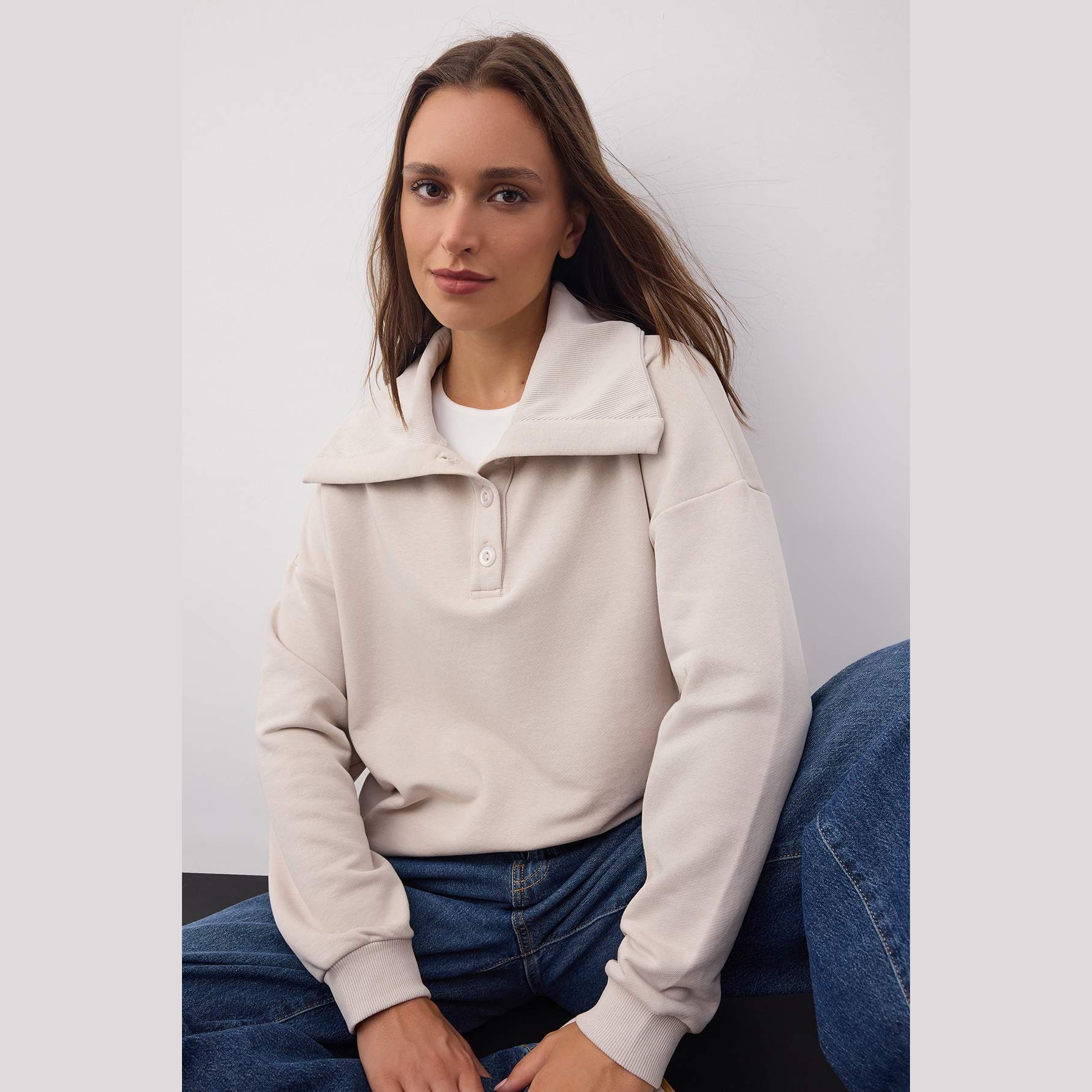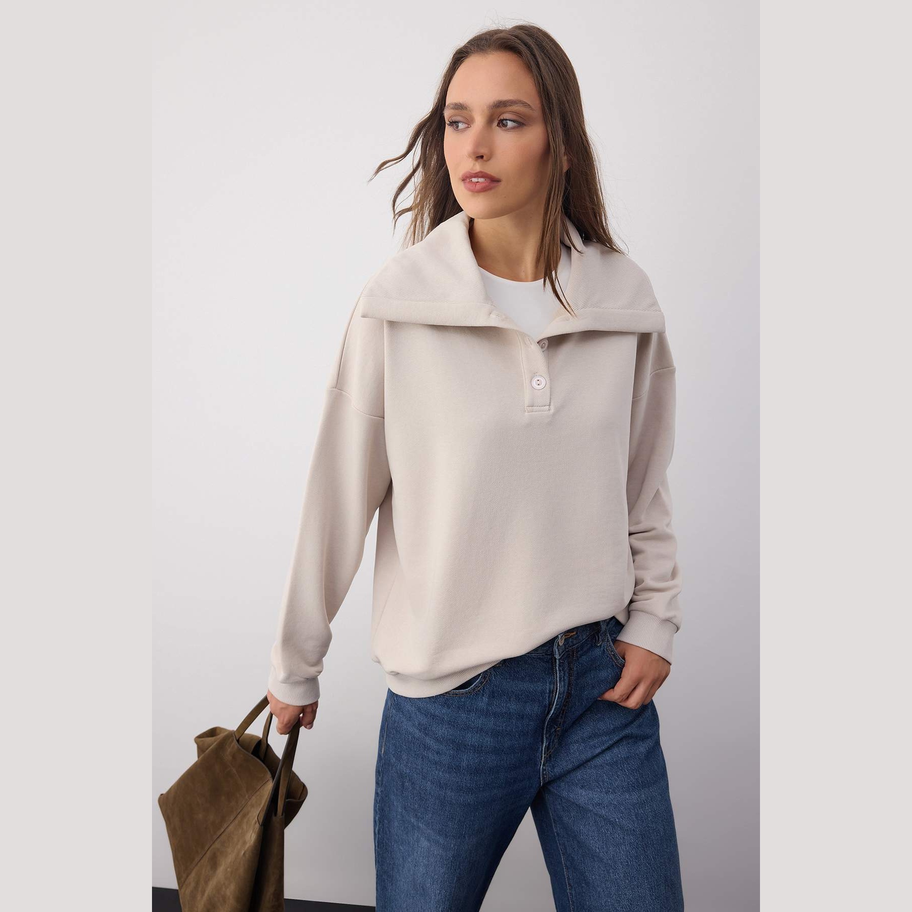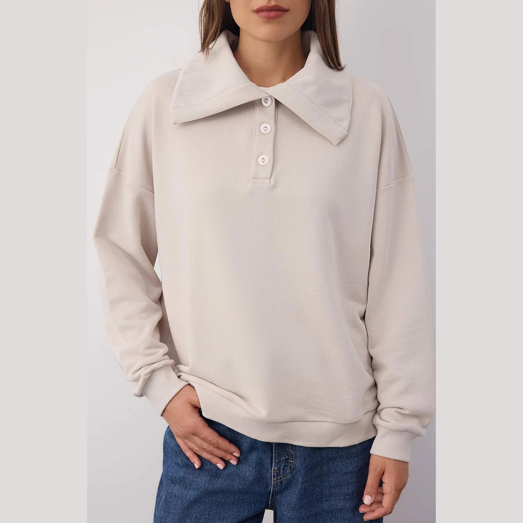سويت شيرت نسائي – بيج بياقة بولو وقصة واسعة (إطلالة خريفية أنيقة بلمسة كلاسيكية)