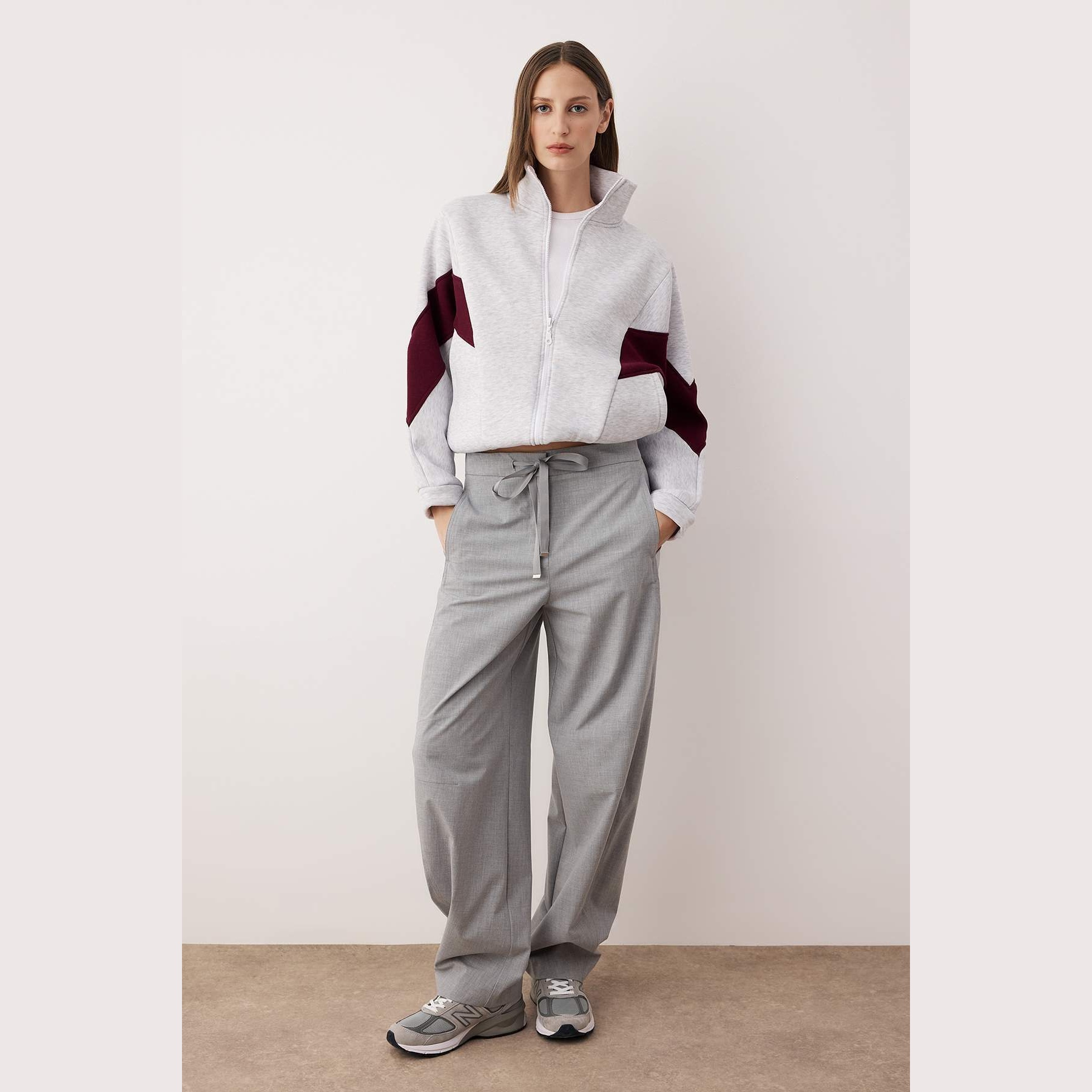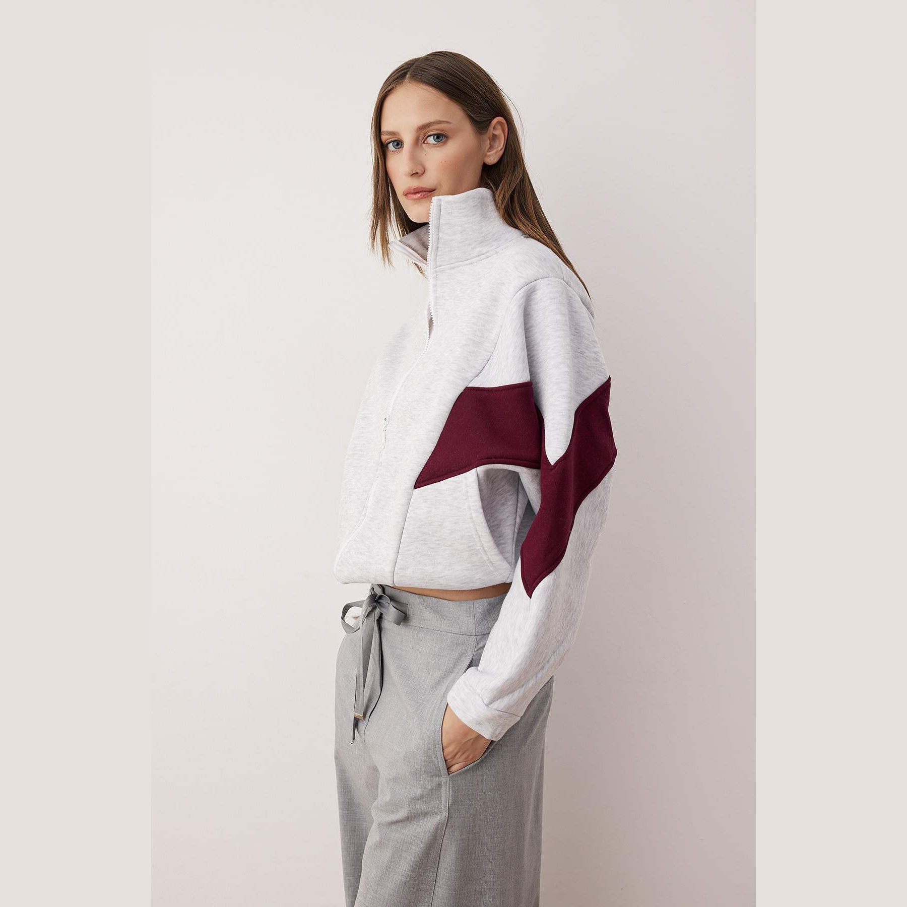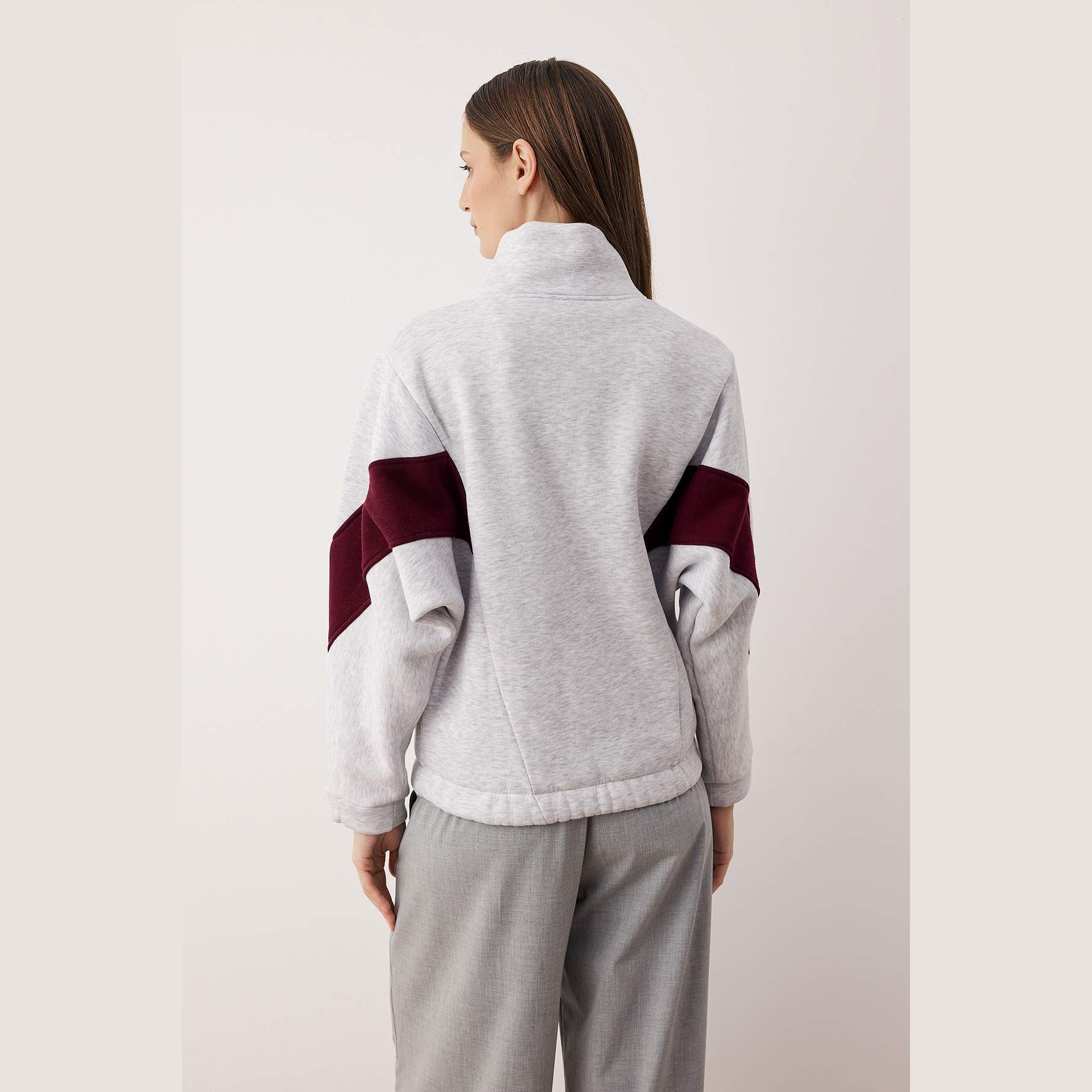 سويت شيرت نسائي بلون رمادي ميلانج مع تفاصيل بلون بوردو، مصنوع من خامة محاكة بتركيبة ثنائية من القطن والبوليستر، يتميز بنسيج سميك داخلي مبطّن بطبقة فرو صناعي تمنح دفئًا فائقًا وراحة مثالية في الأجواء الشتوية. يأتي بقصة واسعة وياقة مرتفعة بسحاب أمامي وأكمام طويلة بتصميم كتف منخفض، ويبرز بتصميم بلوكات لونية يمنح مظهرًا عصريًا مميزًا.