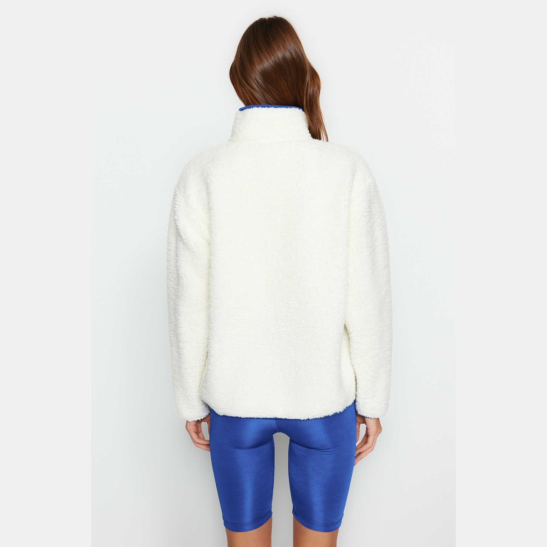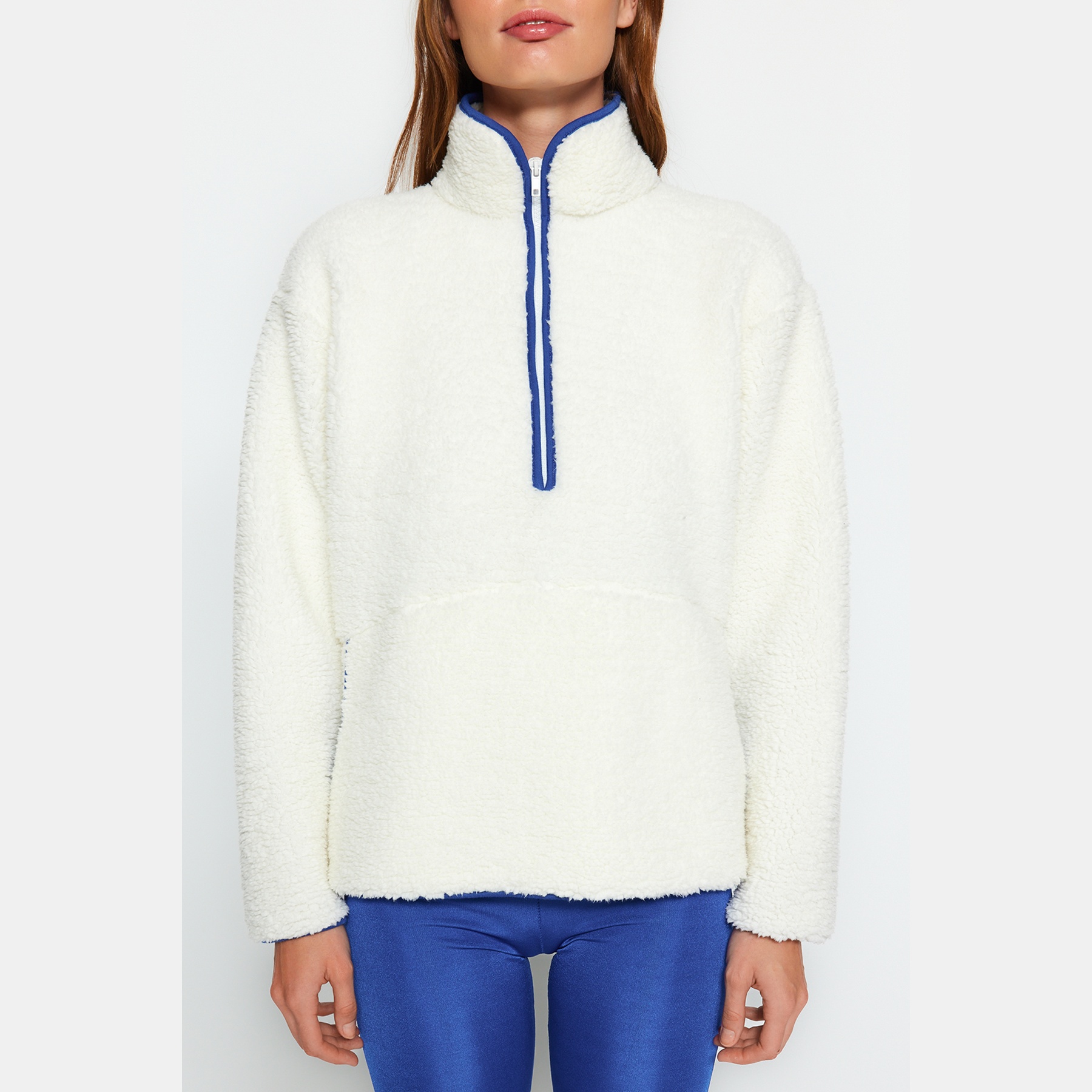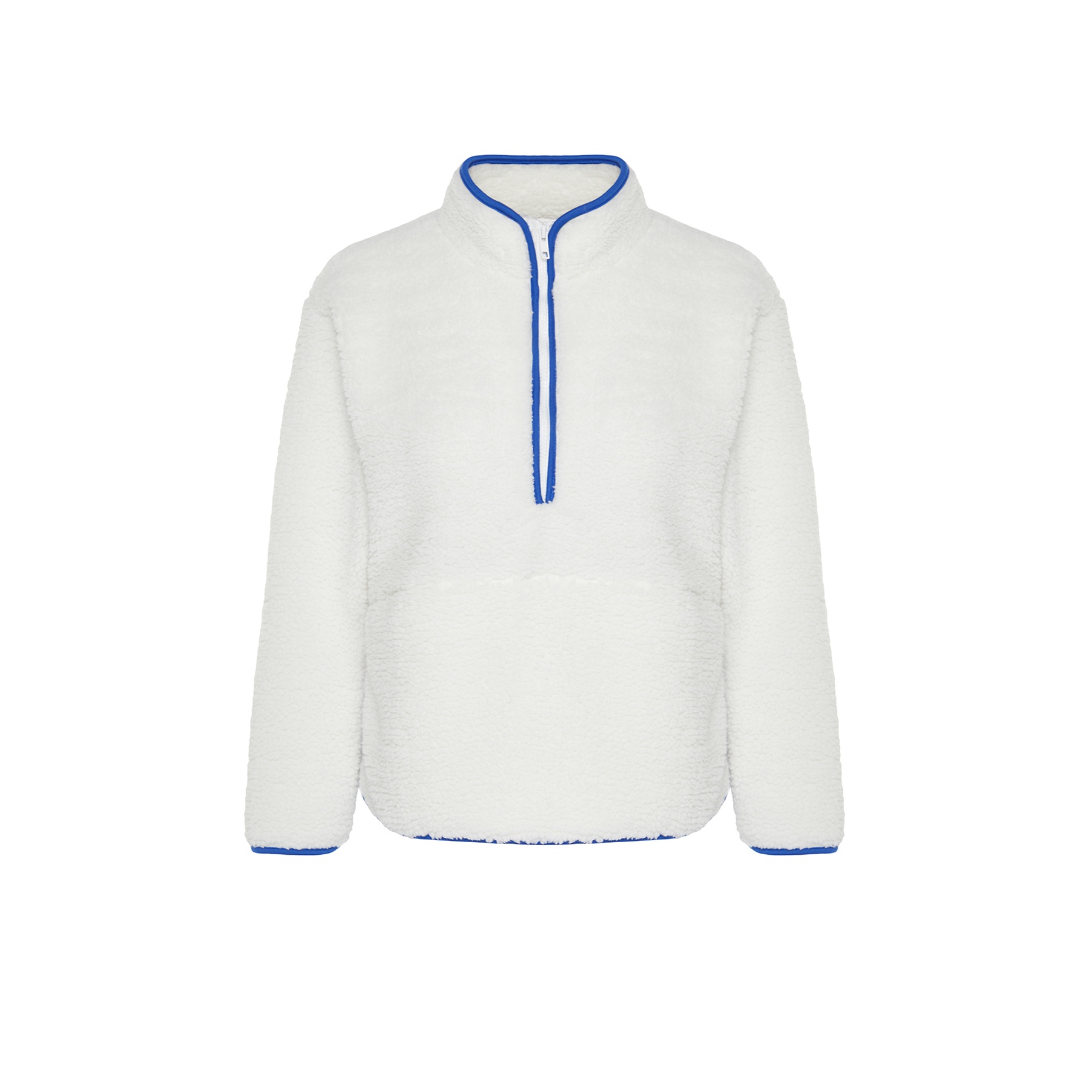 سويت شيرت نسائي – أبيض بخامة فرو صناعي وقصة منتظمة (دفء ناعم بإطلالة رياضية مريحة)