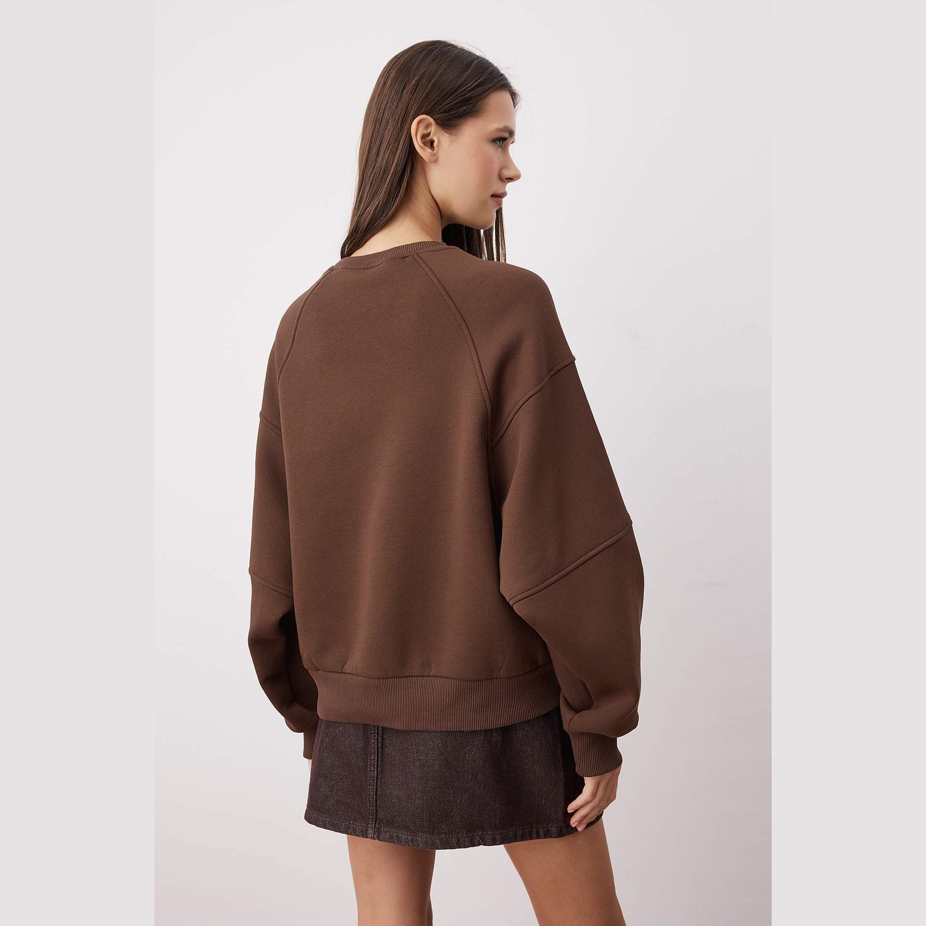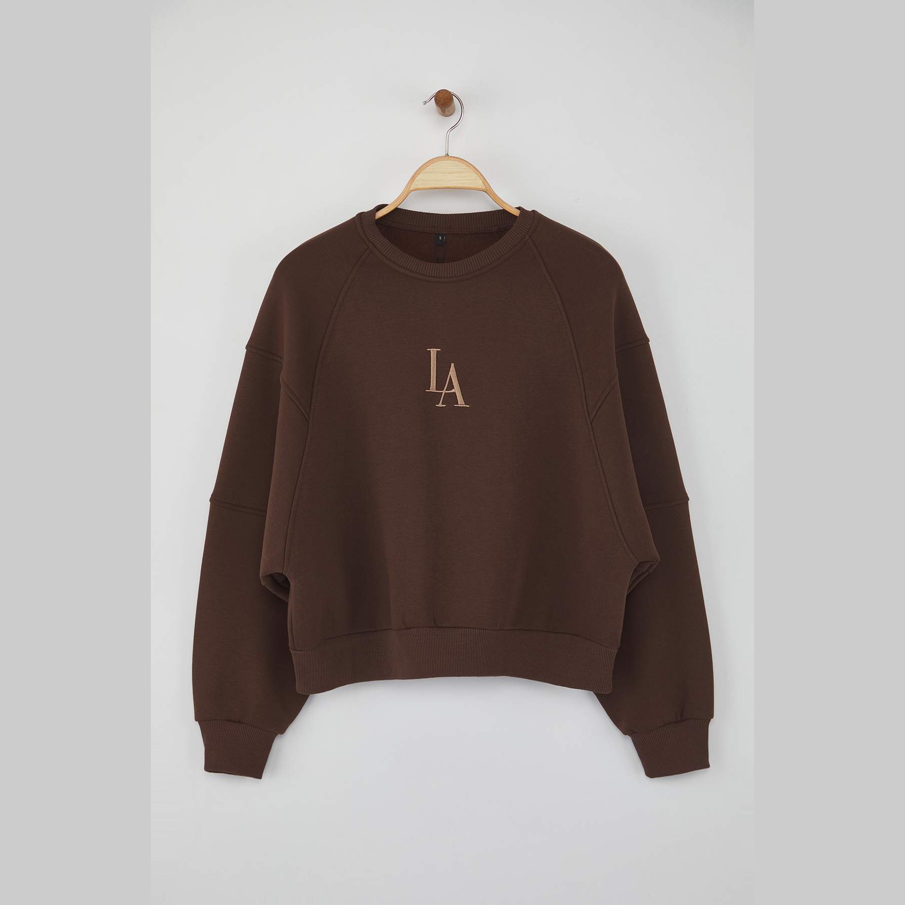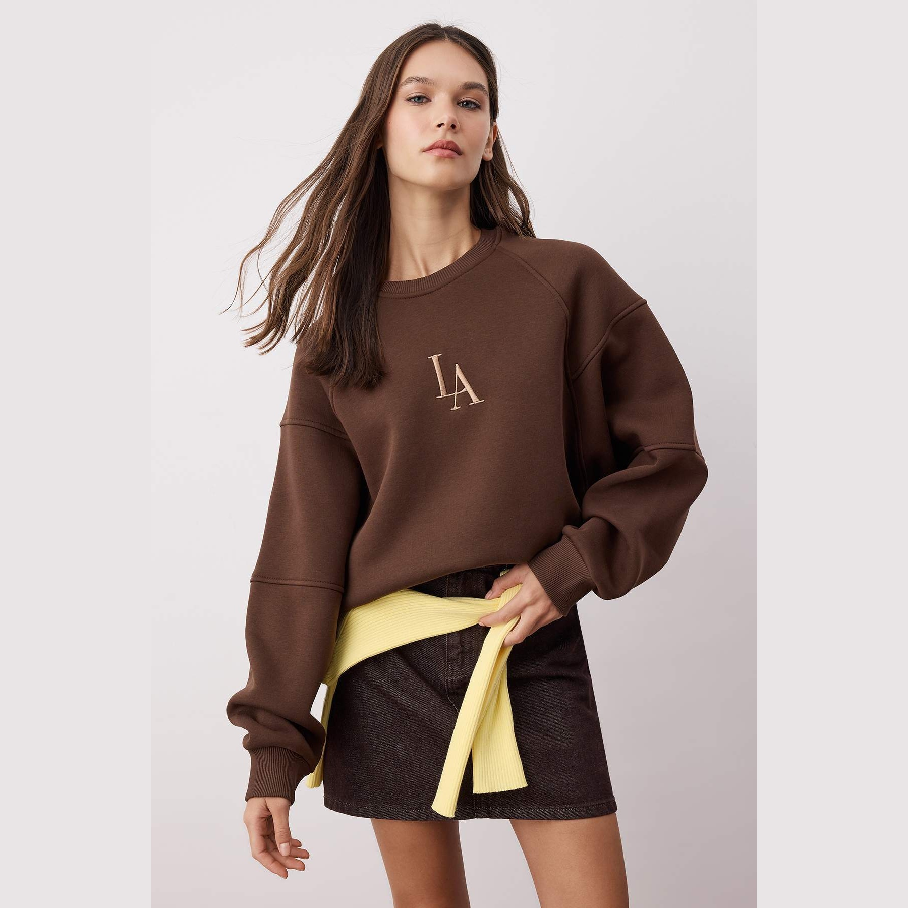 سويت شيرت نسائي – بني بتطريز أمامي وقصة منتظمة (دفء شتوي بإطلالة أساسية أنيقة)