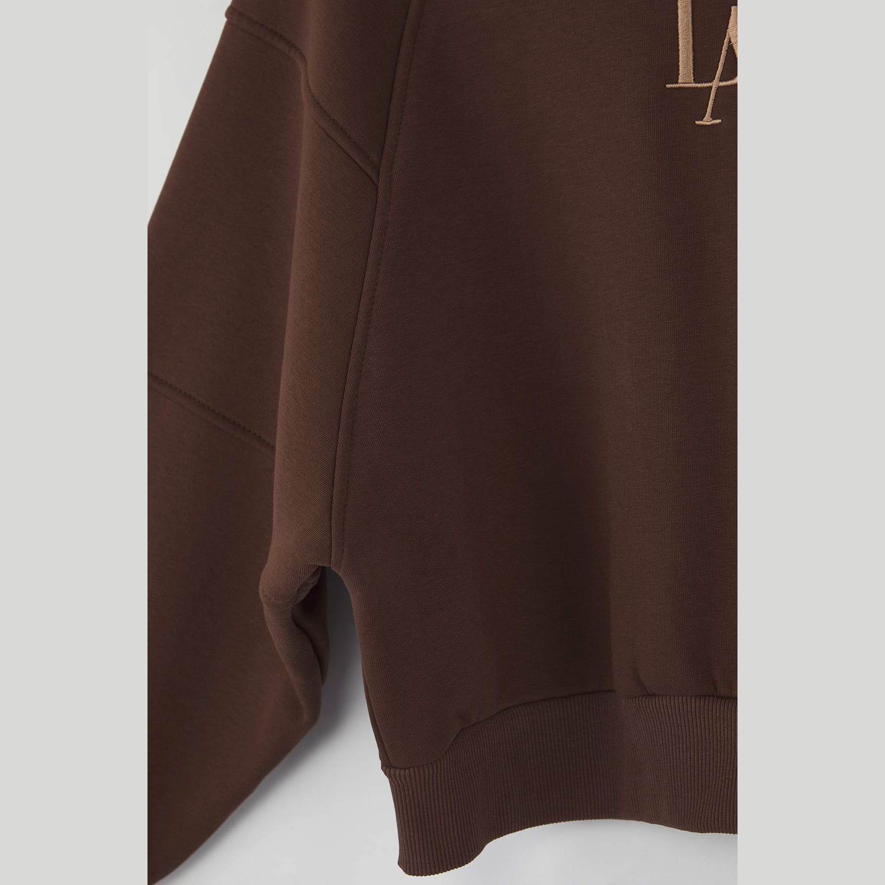 سويت شيرت نسائي بلون بني، مصنوع من خامة محاكة بتركيبة ثلاثية من القطن والبوليستر والفسكوز، يتميز بنسيج سميك داخلي مبطّن بطبقة فرو صناعي تمنح دفئًا فائقًا وراحة مثالية في الأجواء الشتوية. يأتي بقصة منتظمة وياقة دائرية وأكمام طويلة بتصميم كتف منخفض، ويبرز بتطريز بسيط يمنح لمسة أنيقة وعصرية.