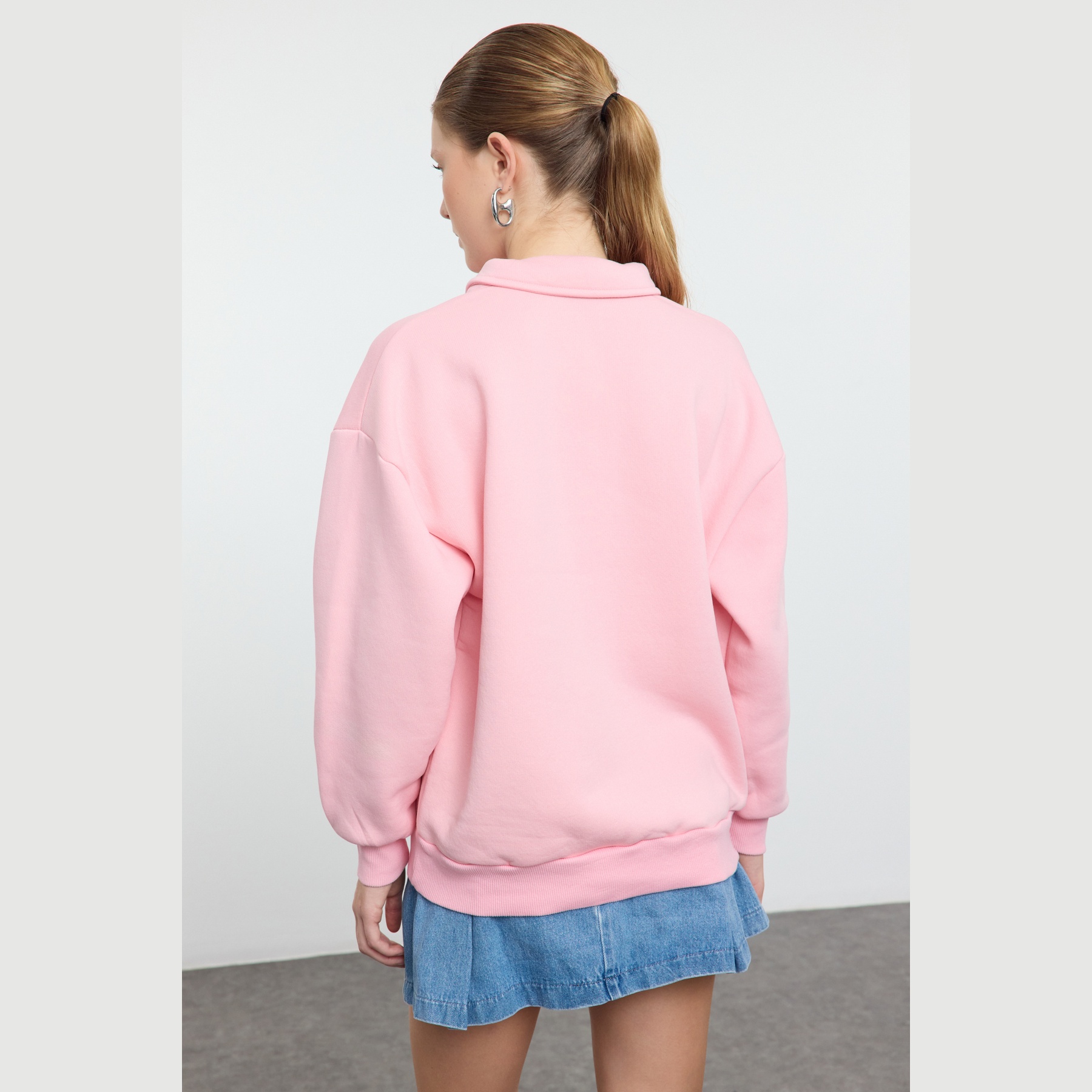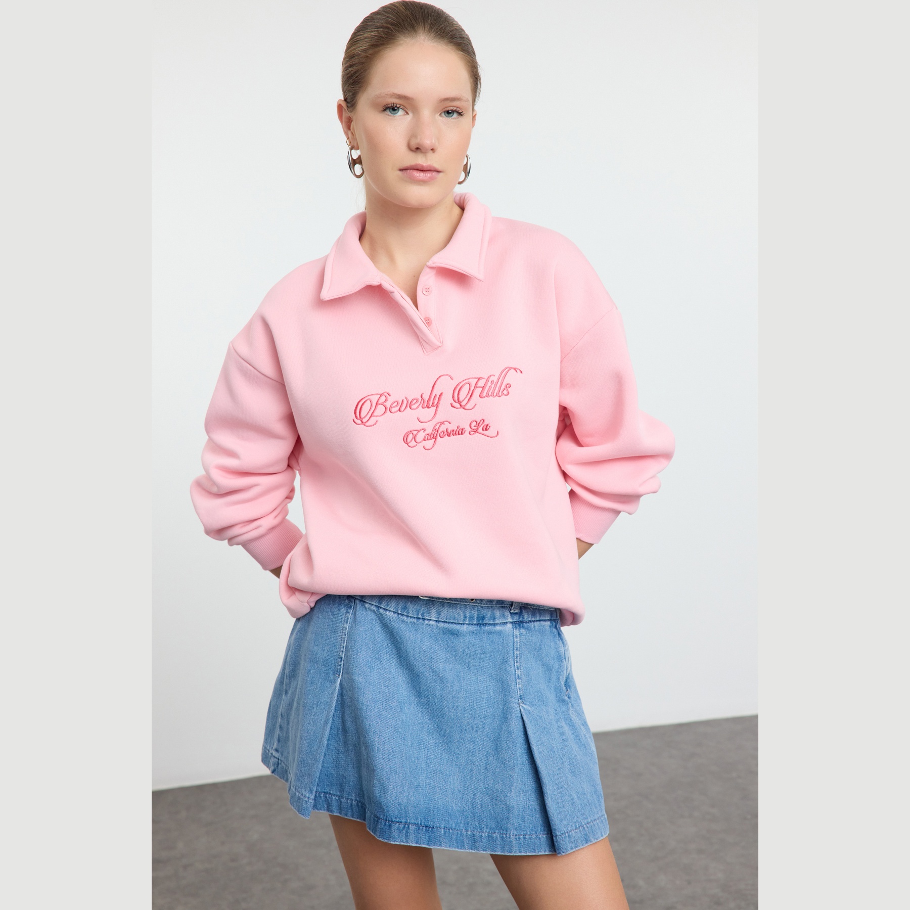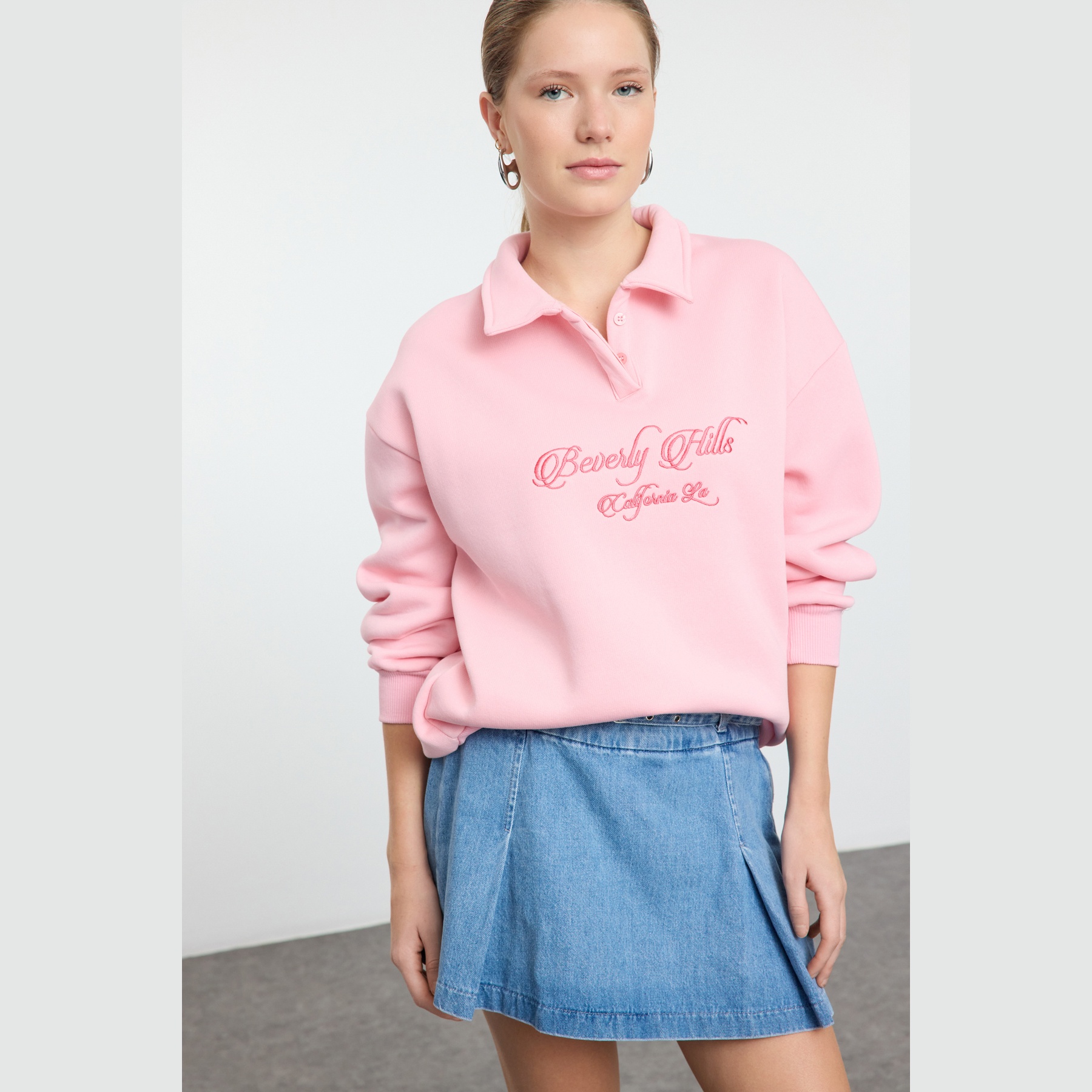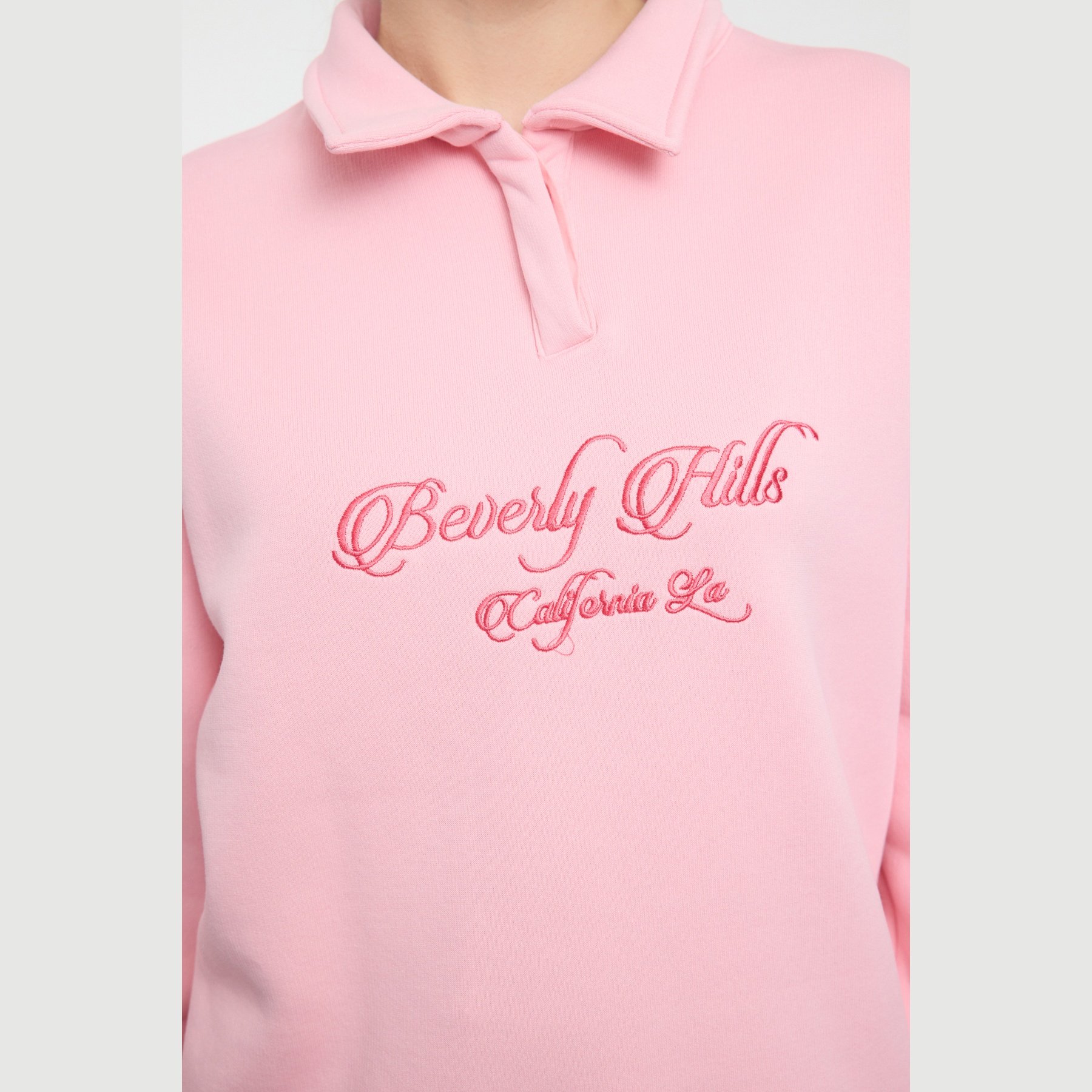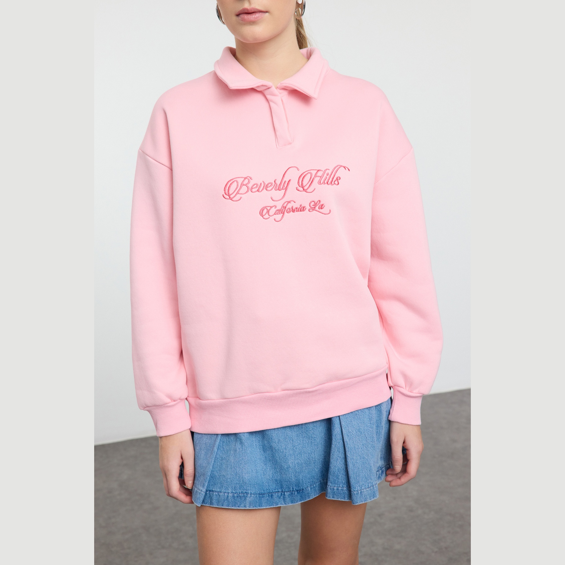 سويت شيرت نسائي – وردي فاتح بياقة قميص وتطريز أمامي (دفء شتوي بلمسة كلاسيكية ناعمة)