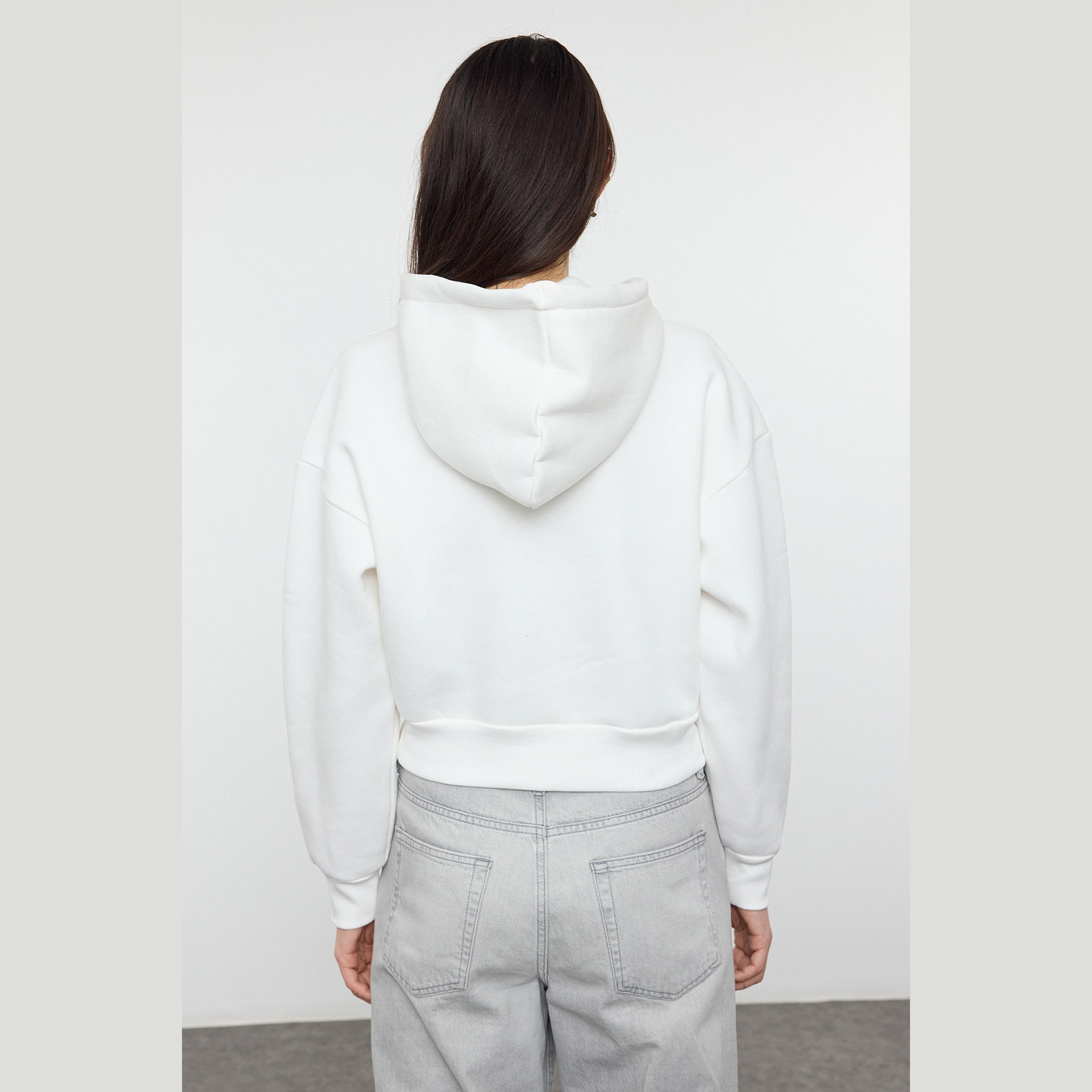 سويت شيرت نسائي بلون أوف وايت، مصنوع من خامة محاكة بتركيبة ثنائية من القطن والبوليستر، يتميز بنسيج سميك داخلي مبطّن بطبقة فرو صناعي تمنح دفئًا فائقًا وراحة مثالية في الأجواء الشتوية. يأتي بقصة قصيرة مريحة وياقة بغطاء رأس وأكمام طويلة بتصميم كتف منخفض، ما يجعله خيارًا مثاليًا للإطلالات اليومية مع بناطيل عالية الخصر.