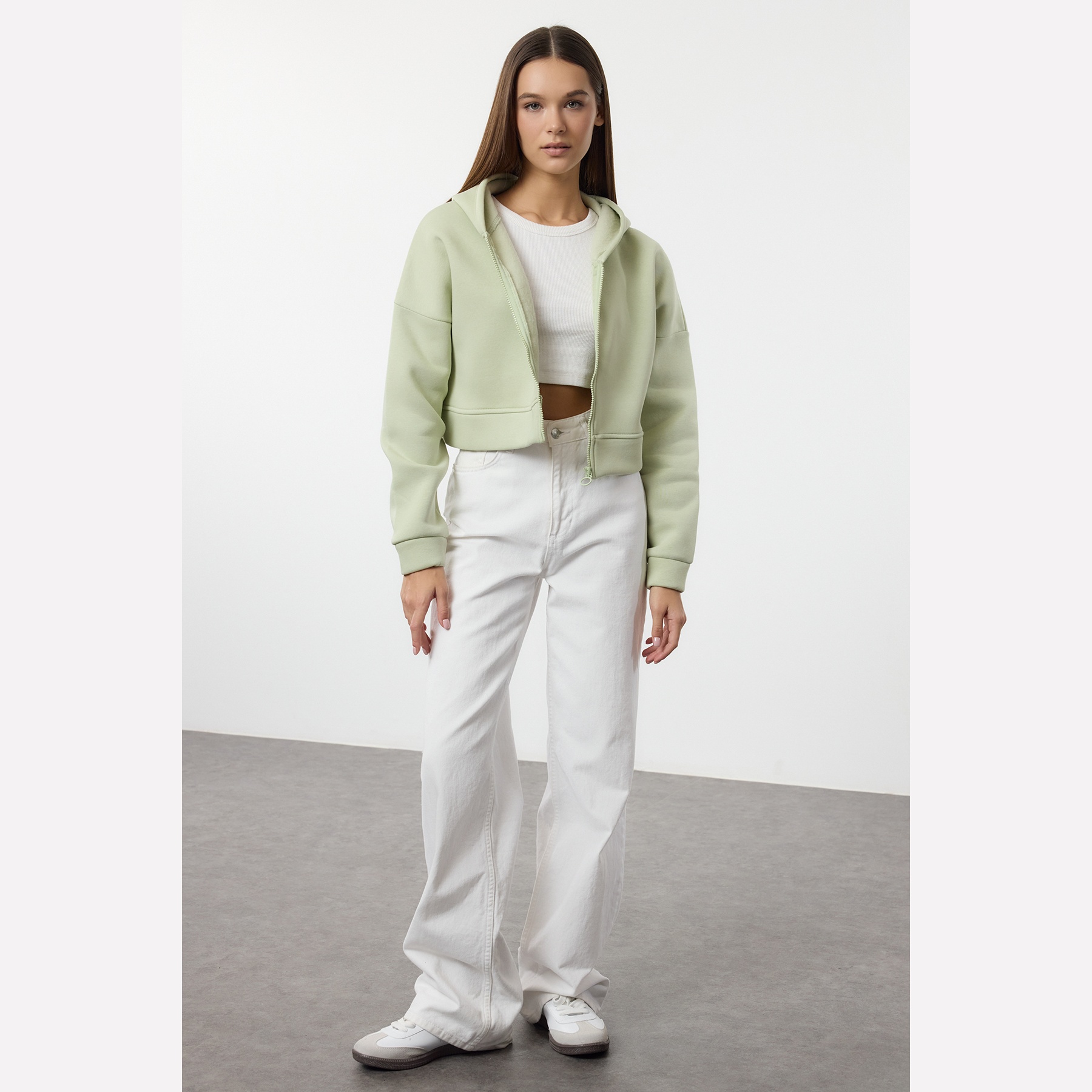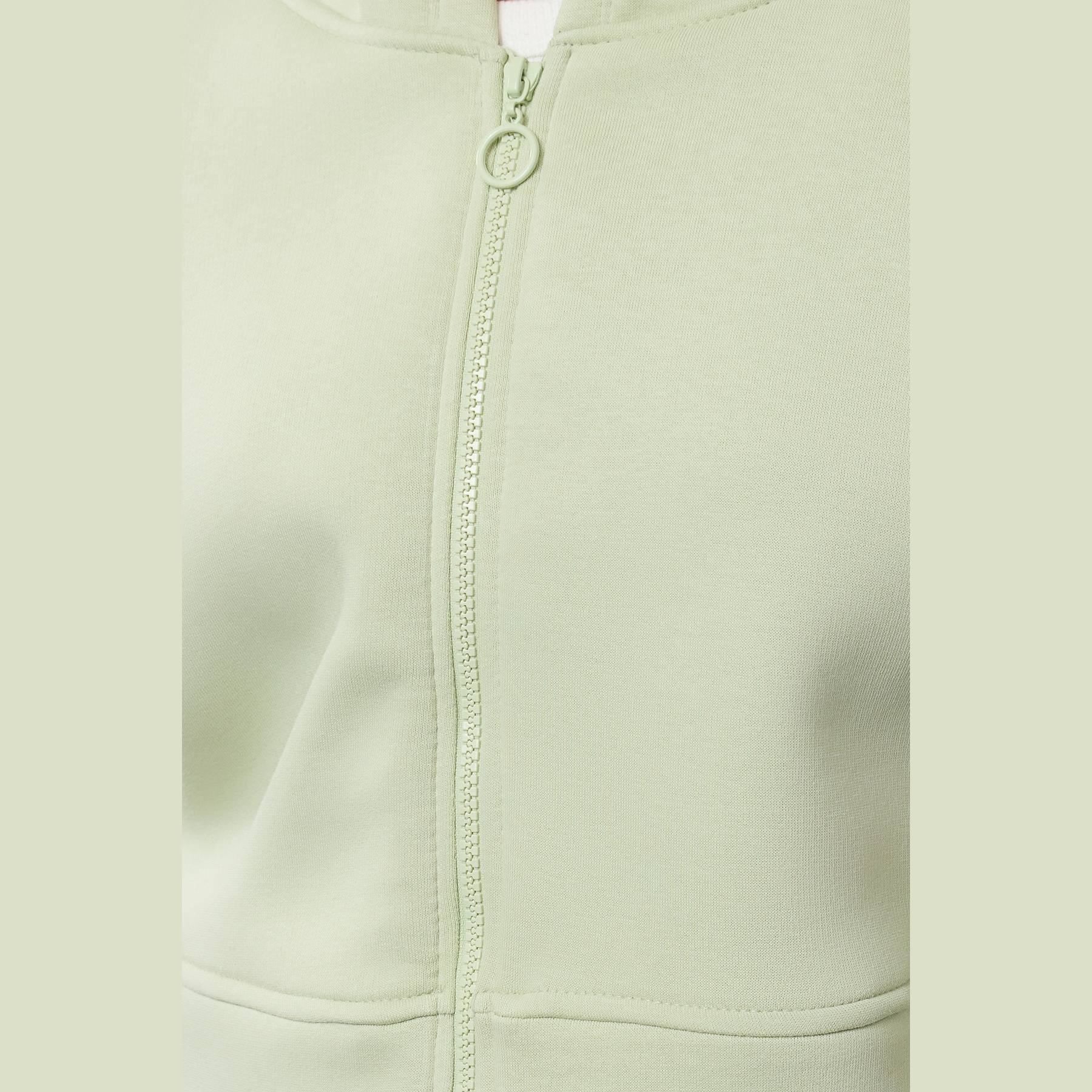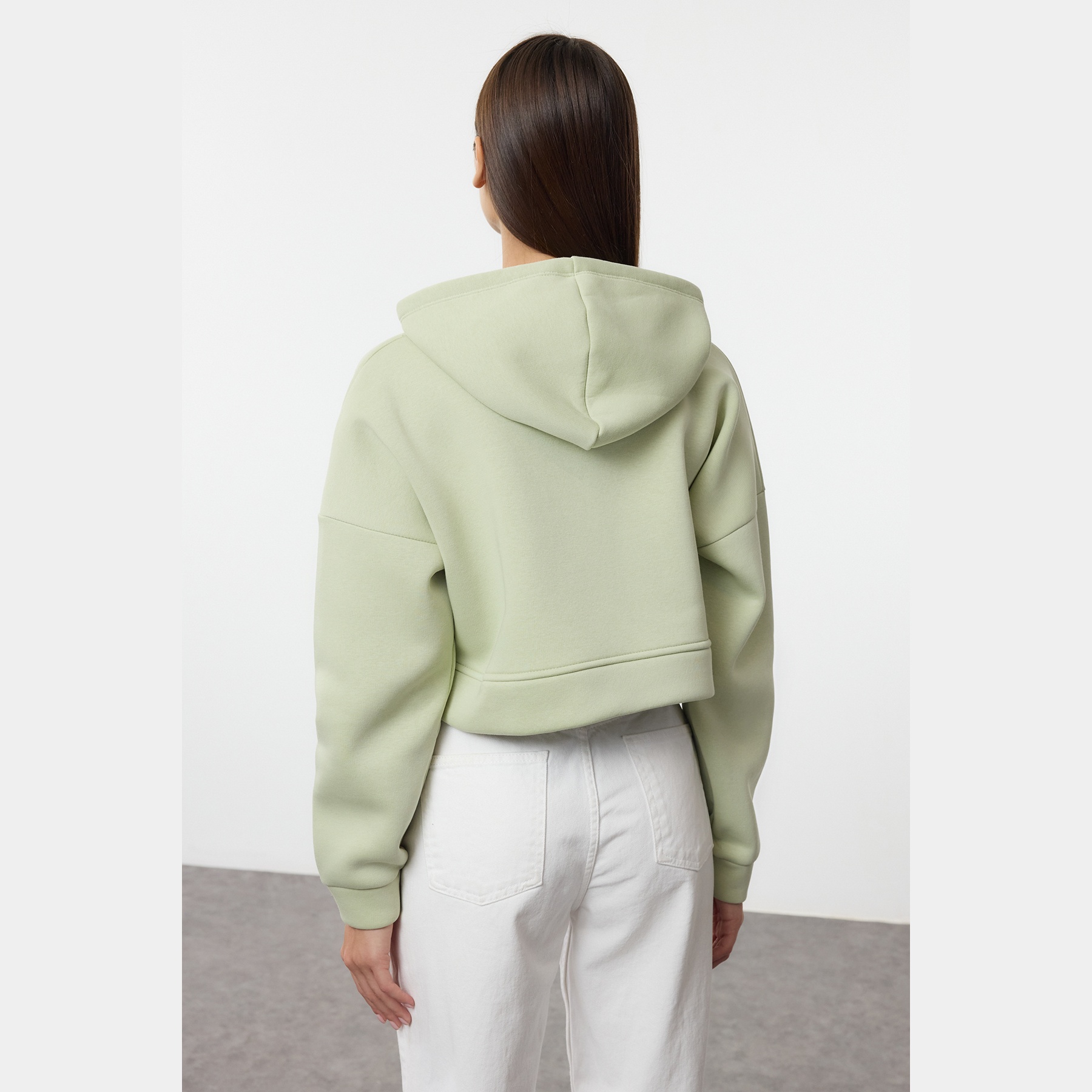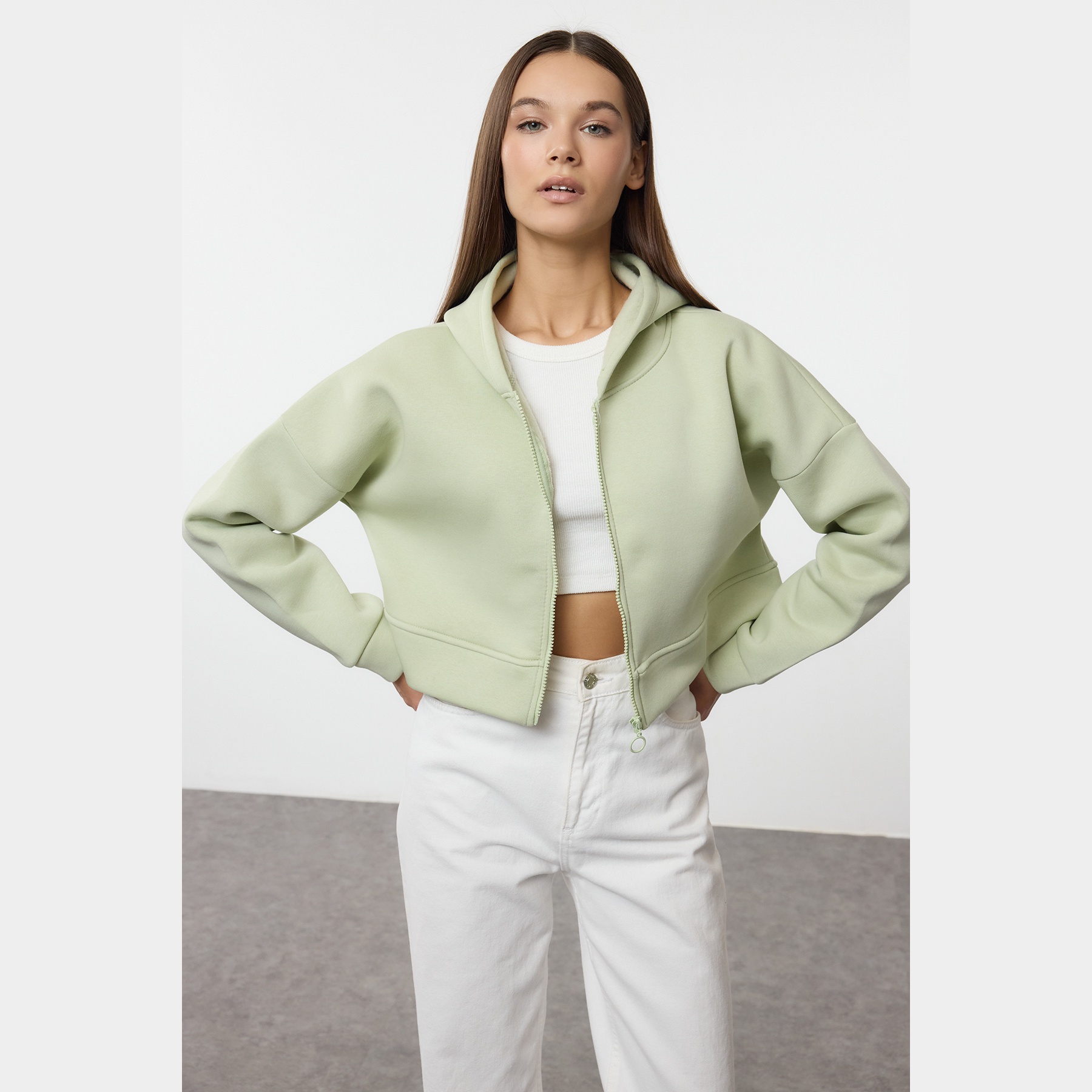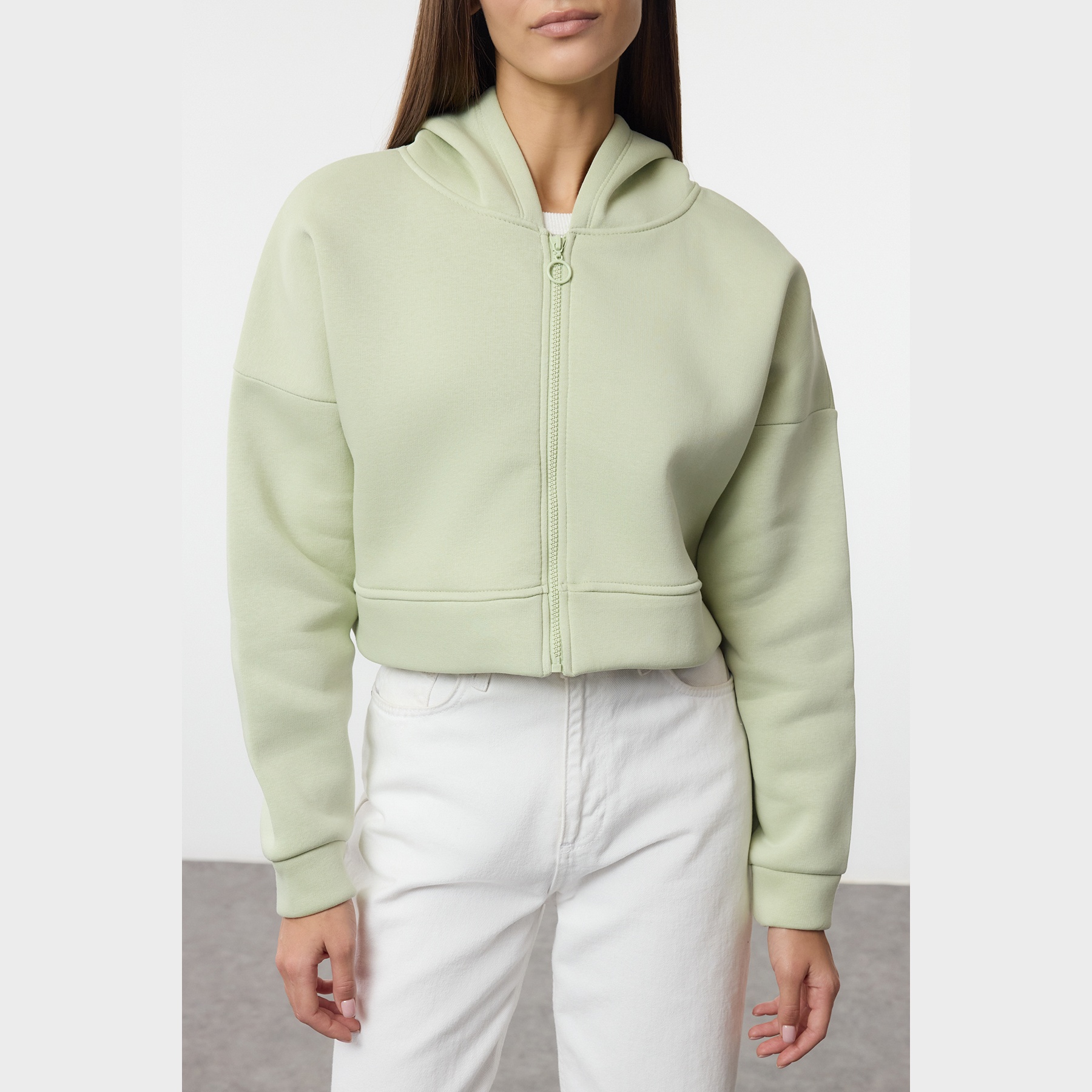 سويت شيرت نسائي بلون نعناعي، مصنوع من خامة محاكة بتركيبة ثنائية من القطن والبوليستر، يتميز بنسيج سميك داخلي مبطّن بطبقة فرو صناعي تمنح دفئًا فائقًا وراحة مثالية في الأجواء الشتوية. يأتي بقصة قصيرة مريحة وياقة بغطاء رأس وسحاب أمامي وأكمام طويلة بتصميم كتف منخفض، ما يجعله خيارًا مثاليًا للإطلالات اليومية مع بناطيل عالية الخصر.