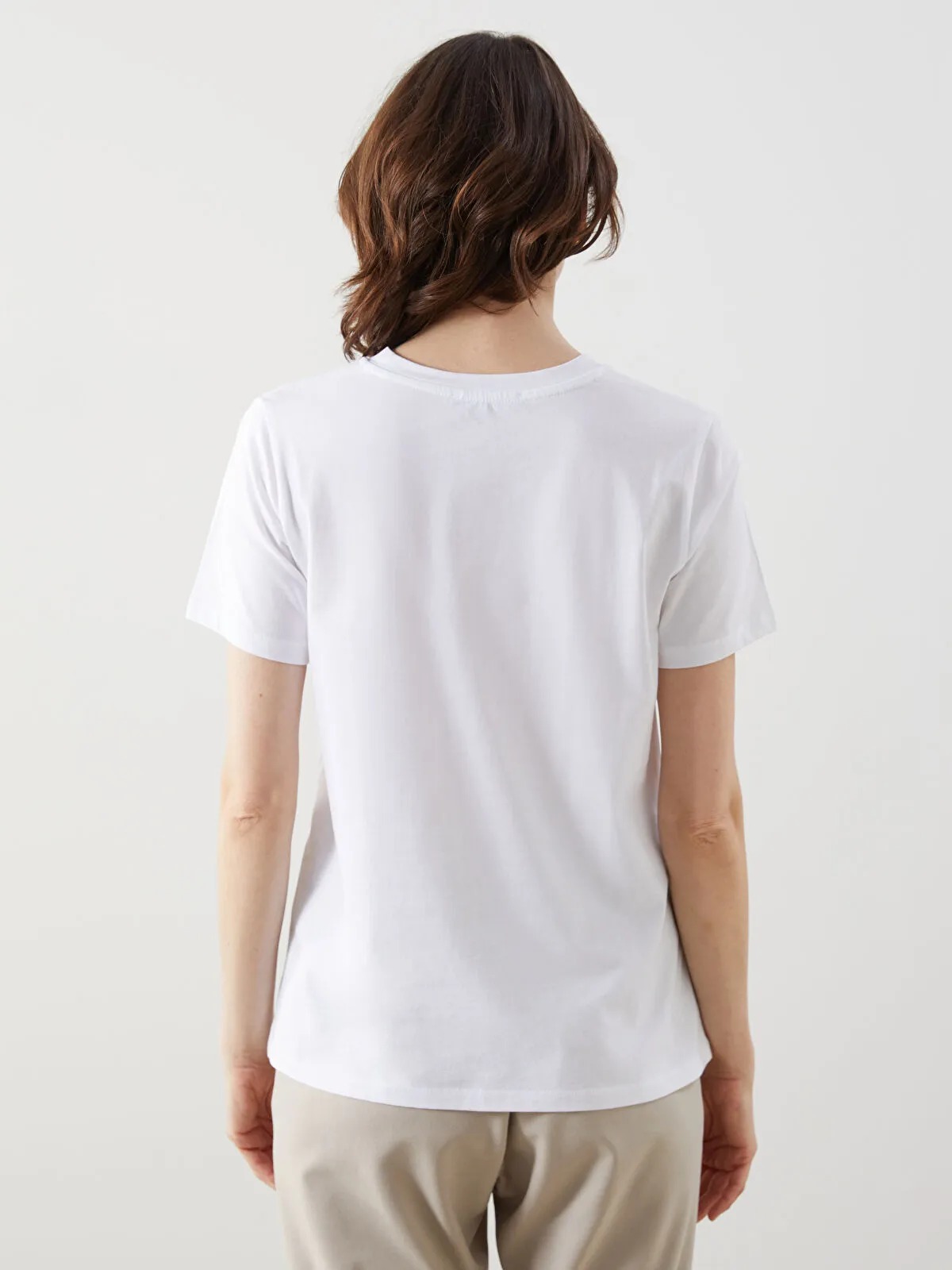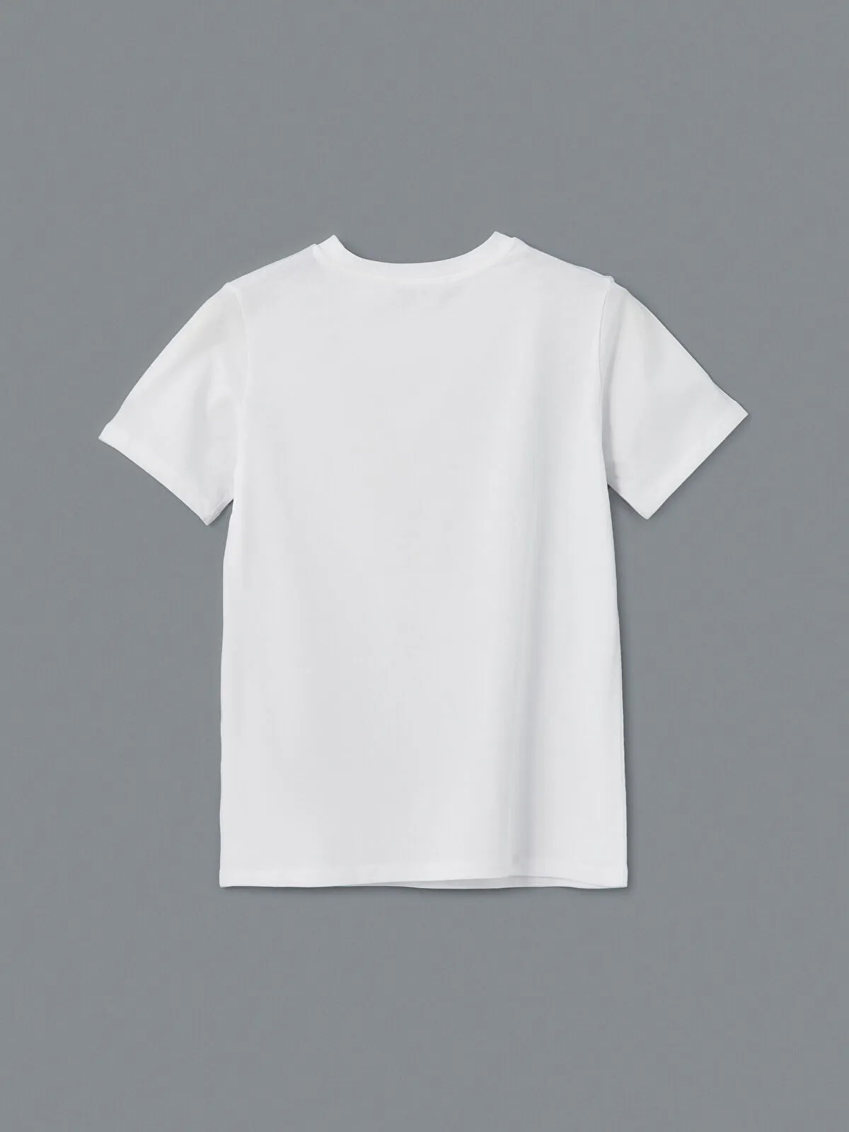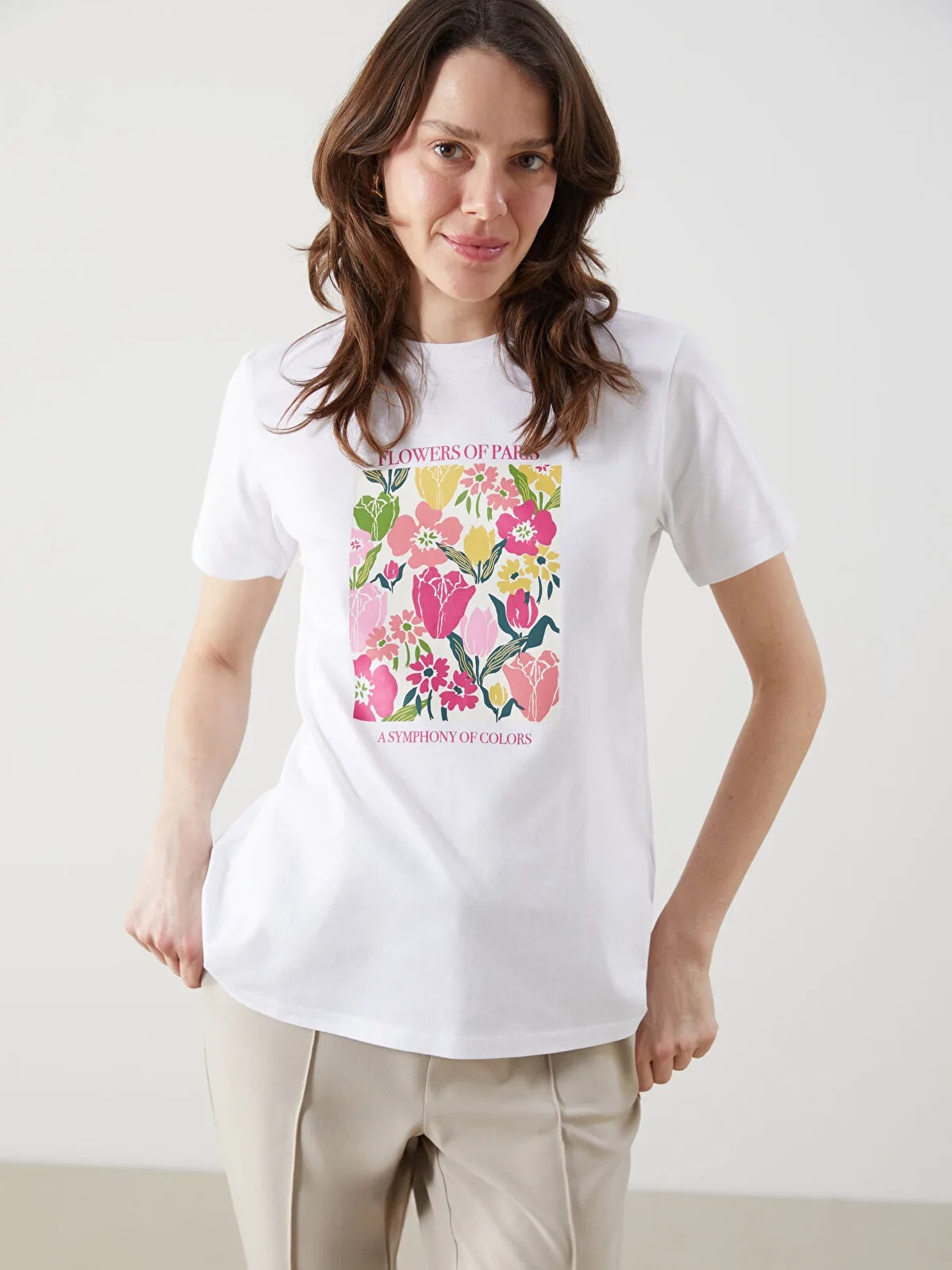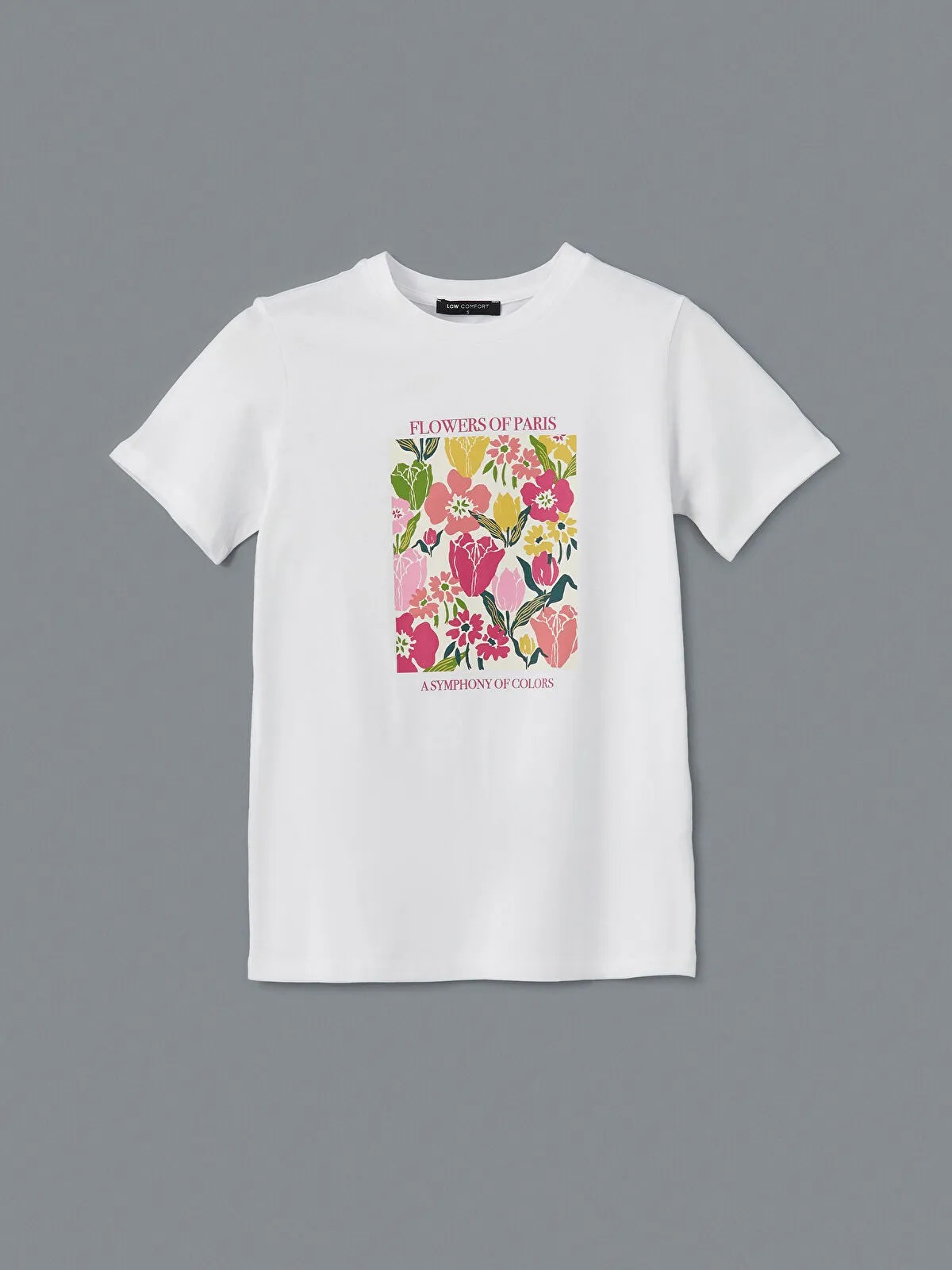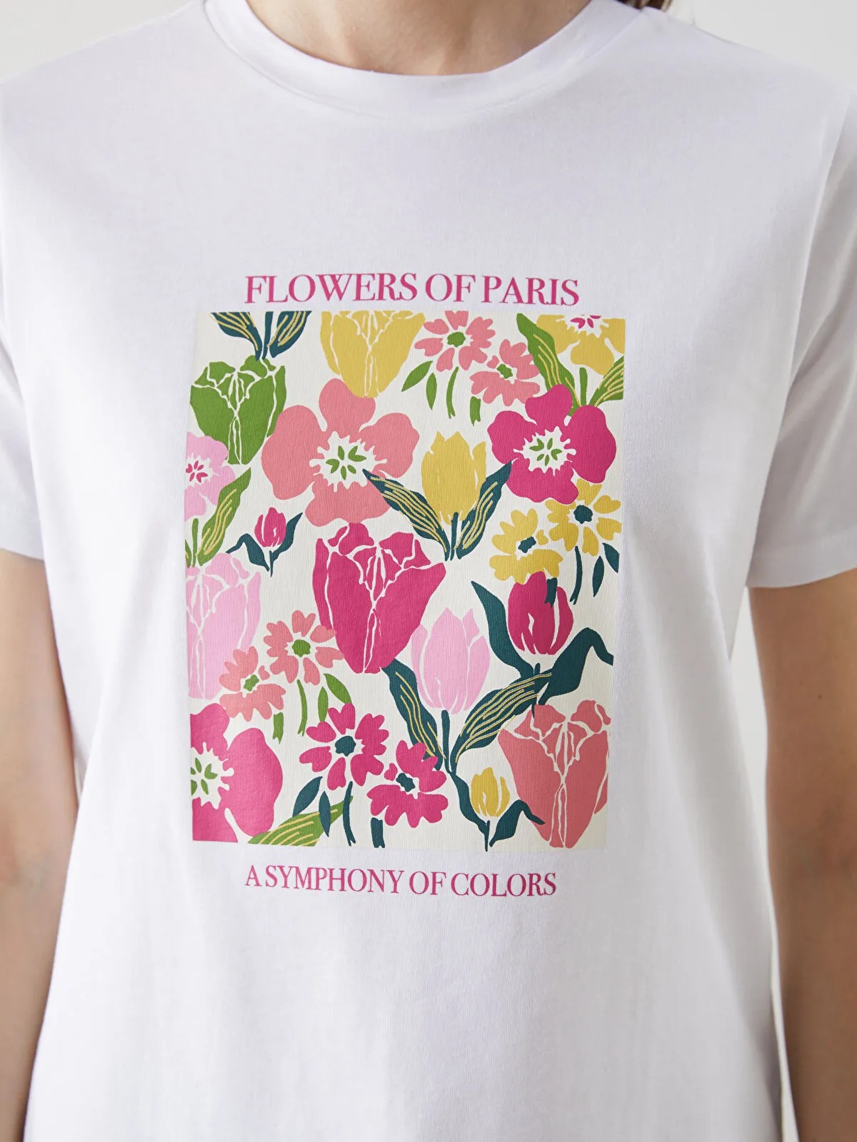 تيشيرت نسائي بلون أبيض ناصع مزين بنقشة أزهار ناعمة على الصدر، بياقة دائرية قصيرة وأكمام قصيرة. تصميم Loose & Bol يمنح حرية حركة وراحة طوال اليوم، مثالي للإطلالة الكاجوال الجميلة والعصرية.