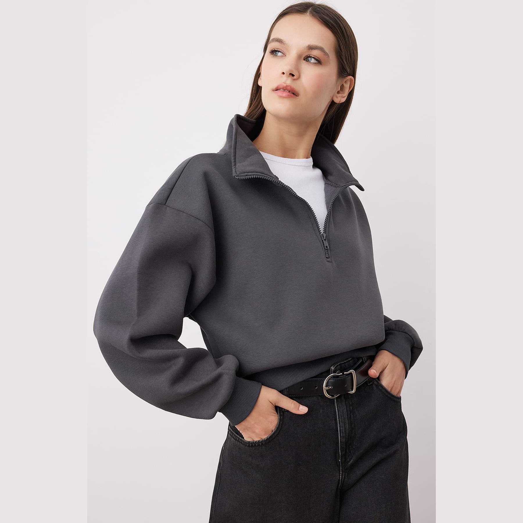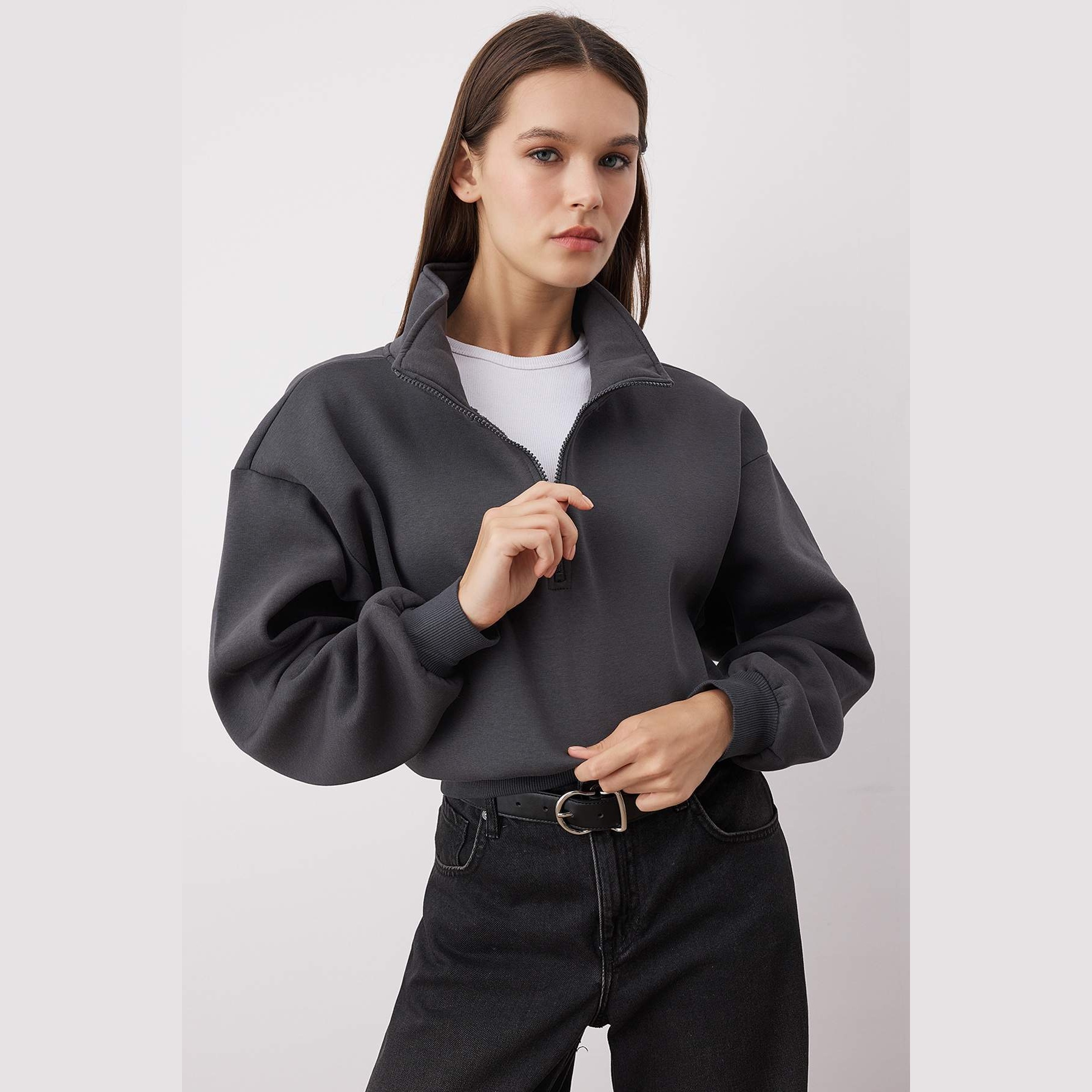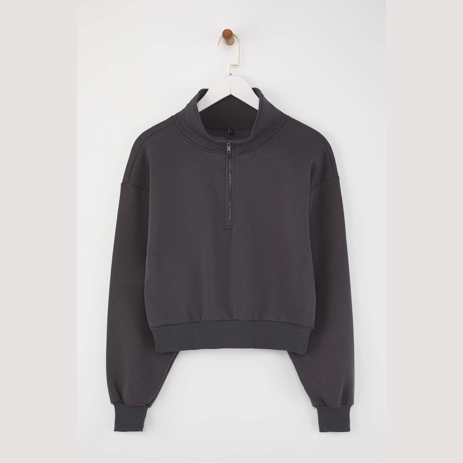 سويت شيرت نسائي – رمادي داكن بسحاب وياقة مرتفعة وقصة قصيرة مريحة (دفء شتوي بإطلالة كاجوال أنيقة)