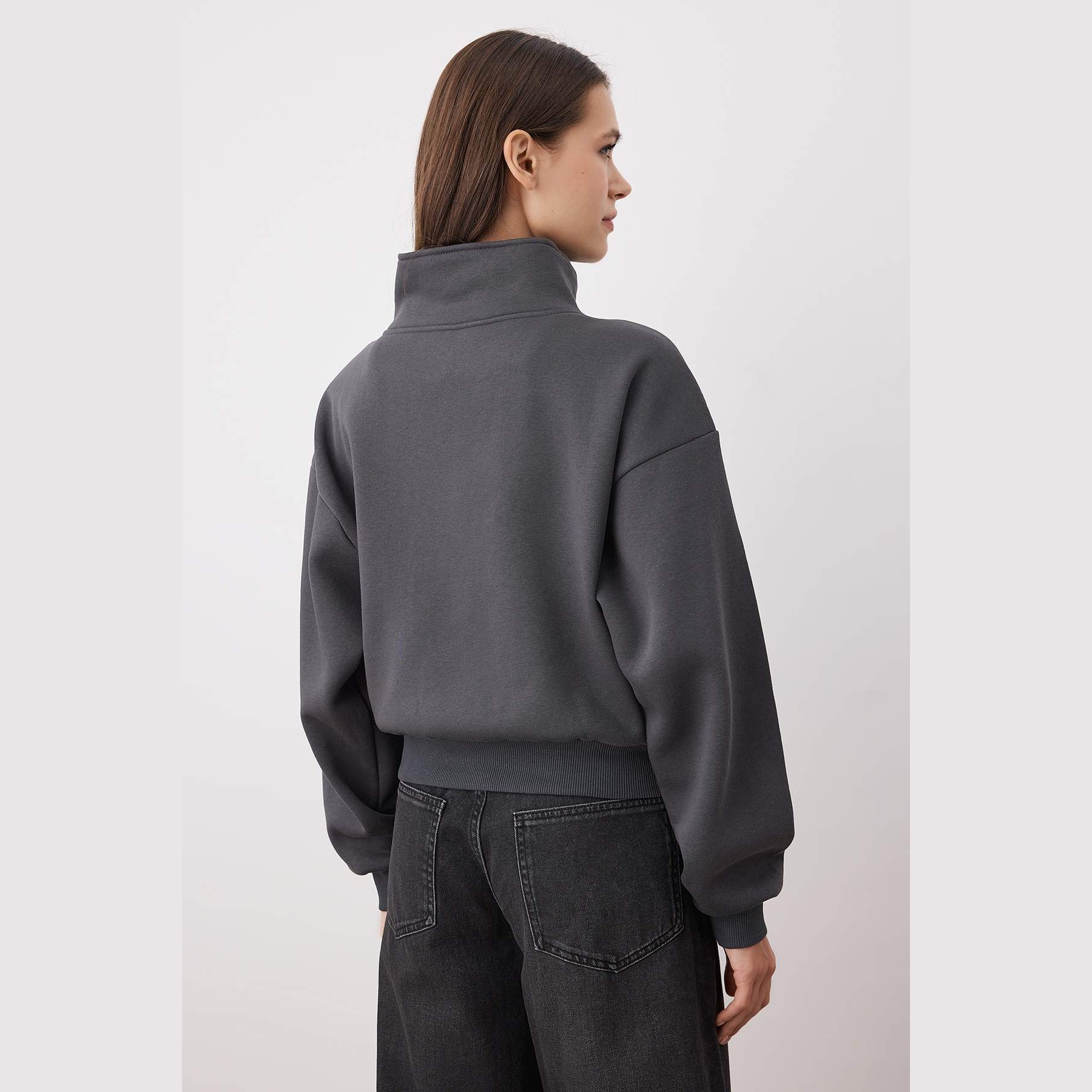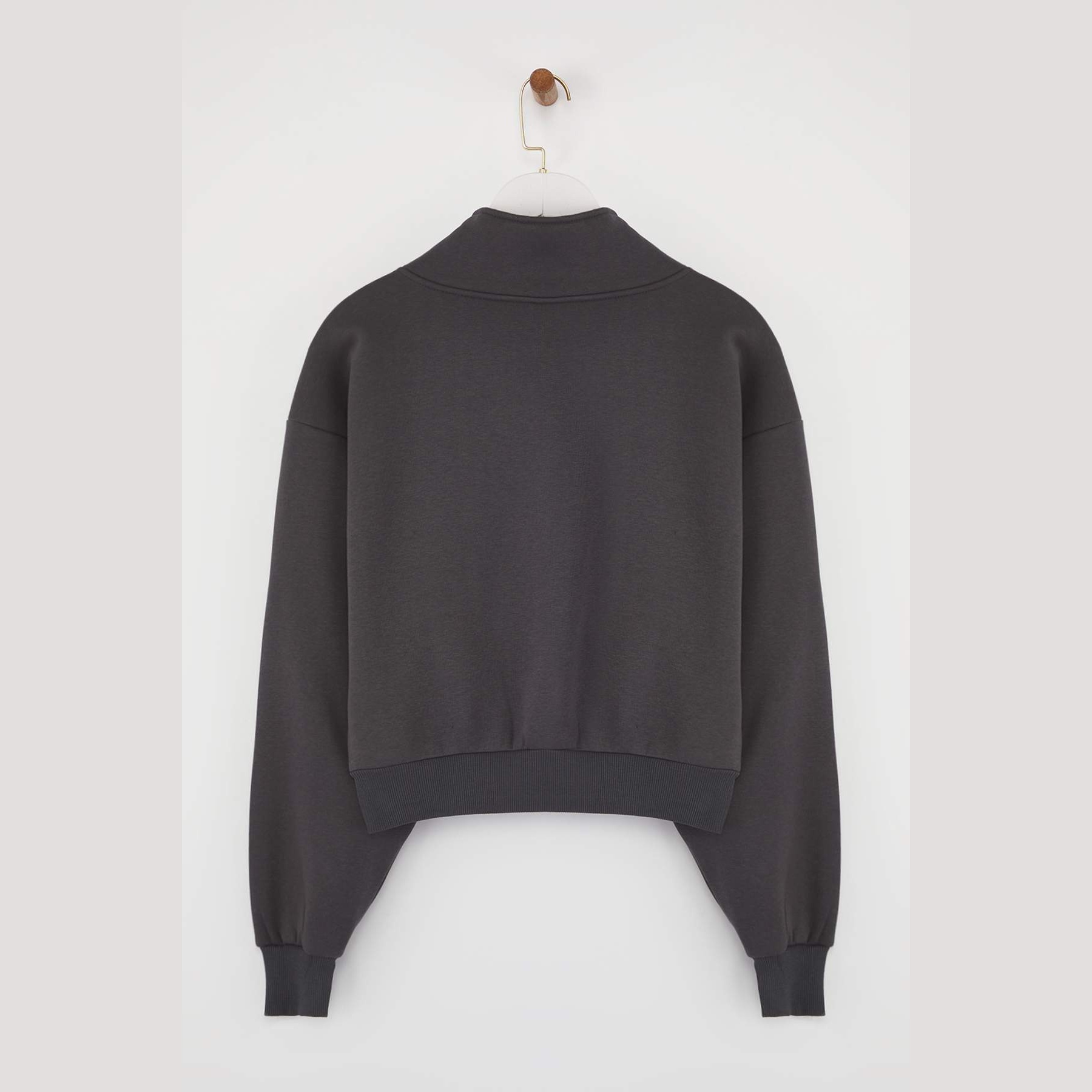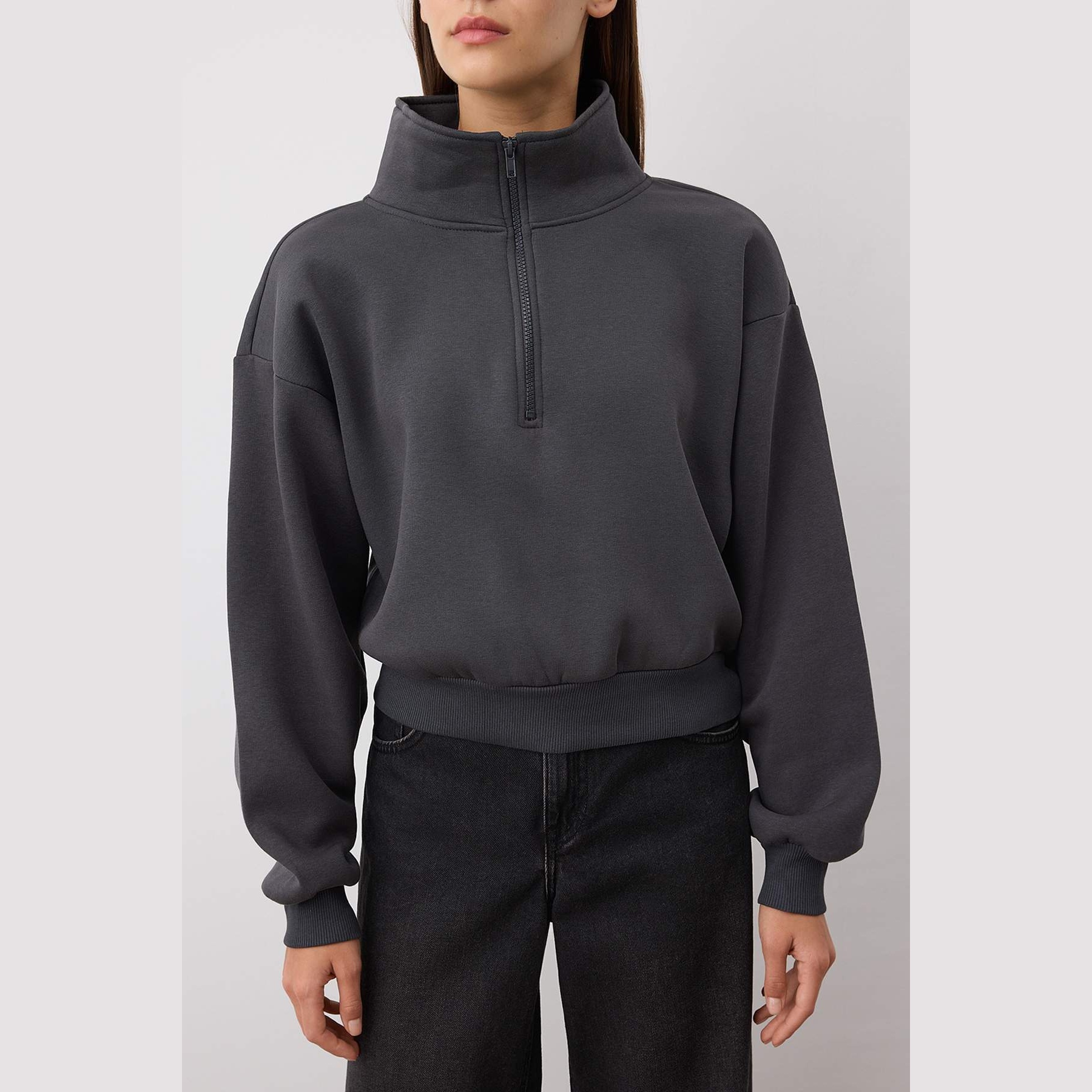 سويت شيرت نسائي – رمادي داكن بسحاب وياقة مرتفعة وقصة قصيرة مريحة (دفء شتوي بإطلالة كاجوال أنيقة)
