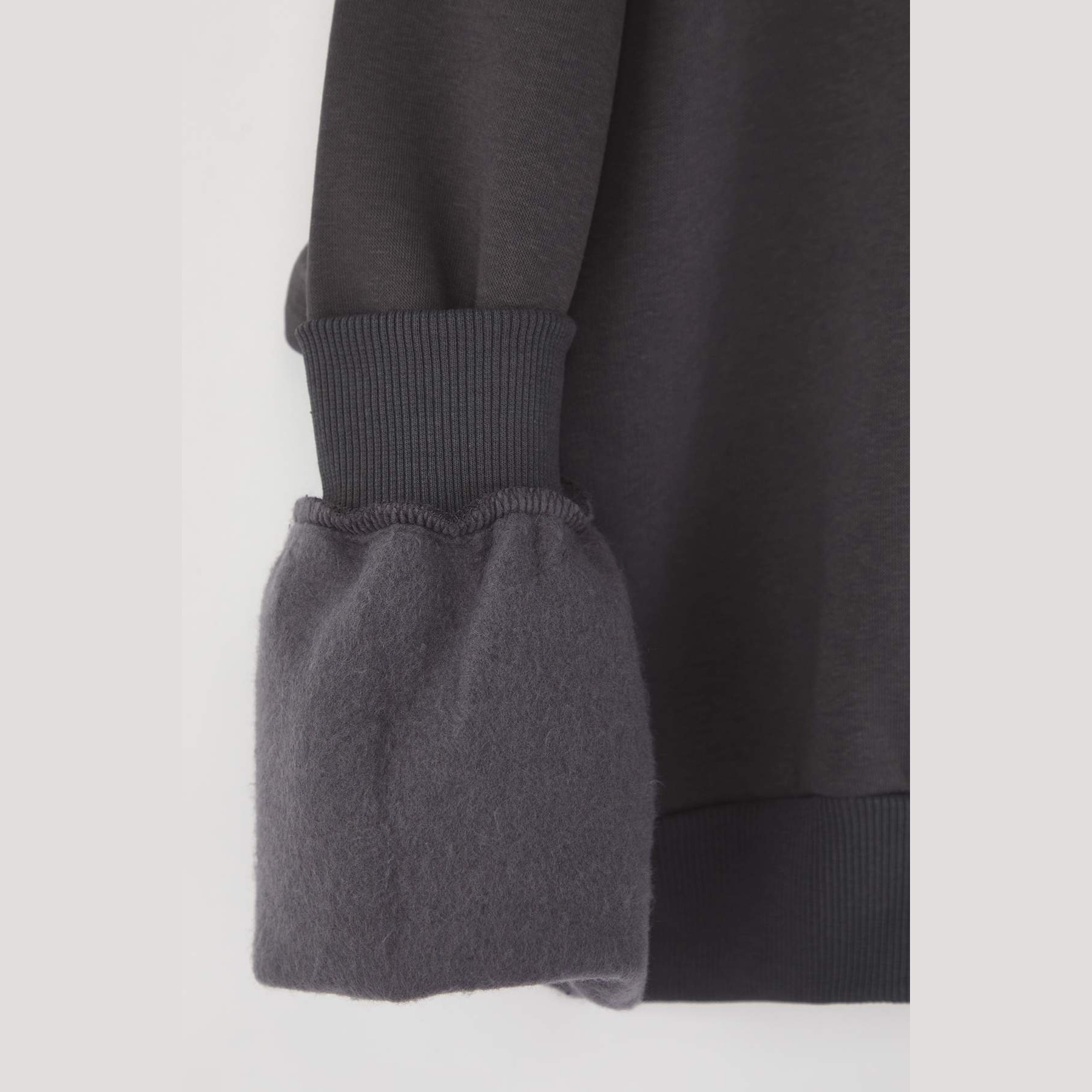 سويت شيرت نسائي بلون رمادي داكن، مصنوع من خامة محاكة بتركيبة ثنائية من القطن والبوليستر، يتميز بنسيج سميك داخلي مبطّن بطبقة فرو صناعي تمنح دفئًا فائقًا وراحة مثالية في الأجواء الشتوية. يأتي بقصة قصيرة مريحة وياقة مرتفعة بسحاب أمامي وأكمام طويلة بتصميم كتف منخفض، ما يجعله خيارًا مثاليًا للإطلالات اليومية مع بناطيل عالية الخصر.