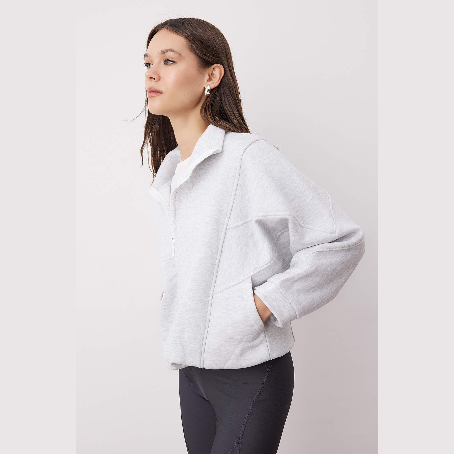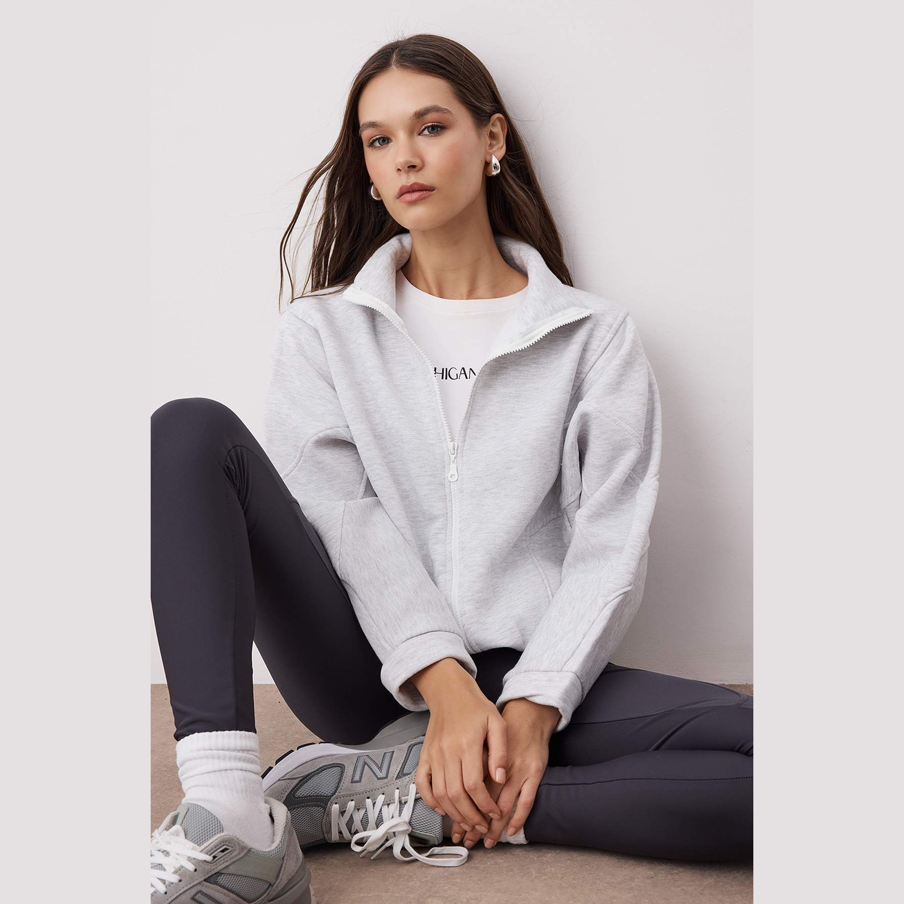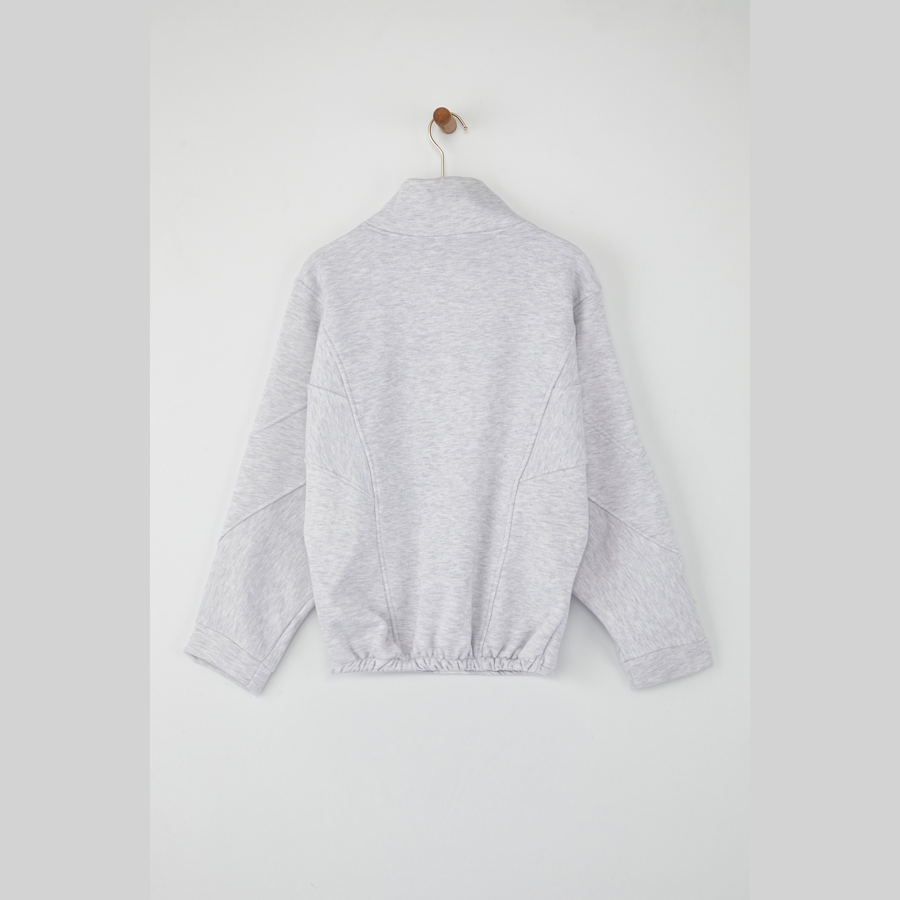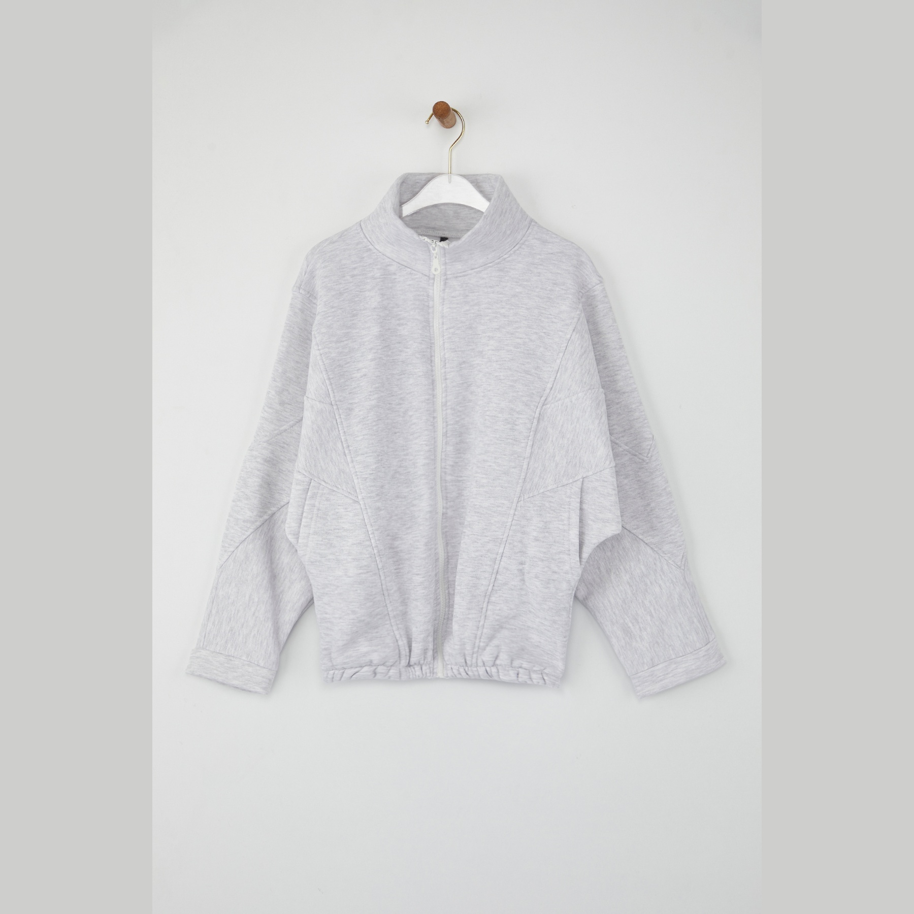 سويت شيرت نسائي – رمادي ميلانج بسحاب وياقة مرتفعة وتفاصيل خياطة (دفء شتوي بإطلالة كاجوال عصرية)