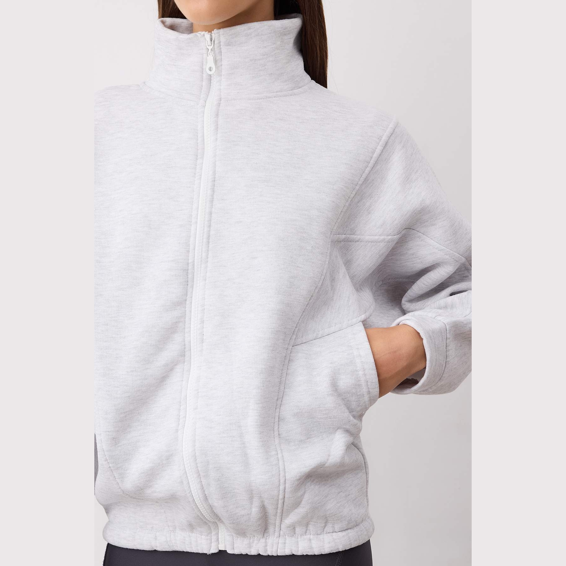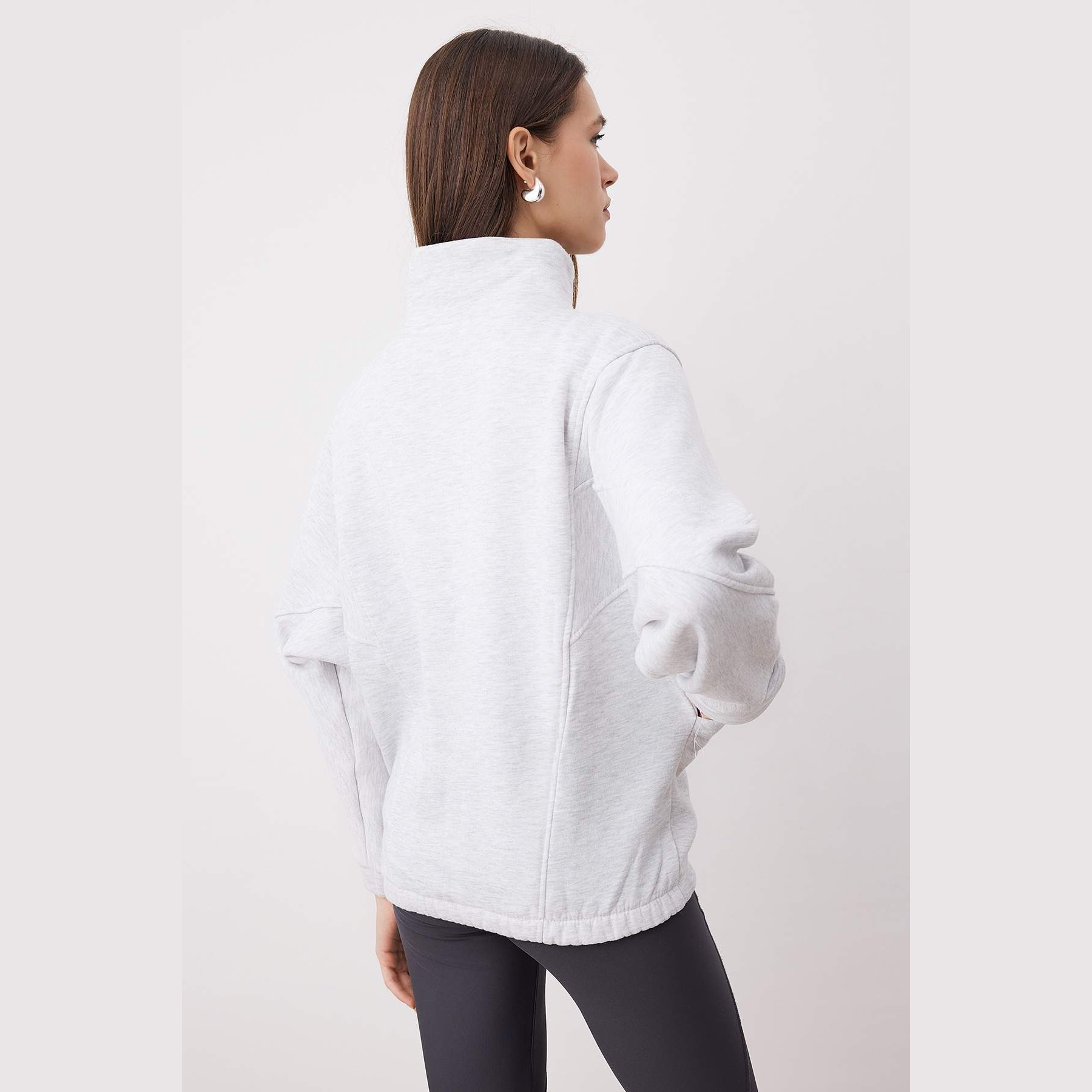 سويت شيرت نسائي بلون رمادي ميلانج، مصنوع من خامة محاكة بتركيبة ثنائية من القطن والبوليستر، يتميز بنسيج سميك داخلي مبطّن بطبقة فرو صناعي تمنح دفئًا فائقًا وراحة مثالية في الأجواء الشتوية. يأتي بقصة واسعة وياقة مرتفعة بسحاب أمامي وأكمام طويلة بتصميم كتف منخفض، ويبرز بتفاصيل خياطة بارزة تمنح لمسة تصميمية عصرية.