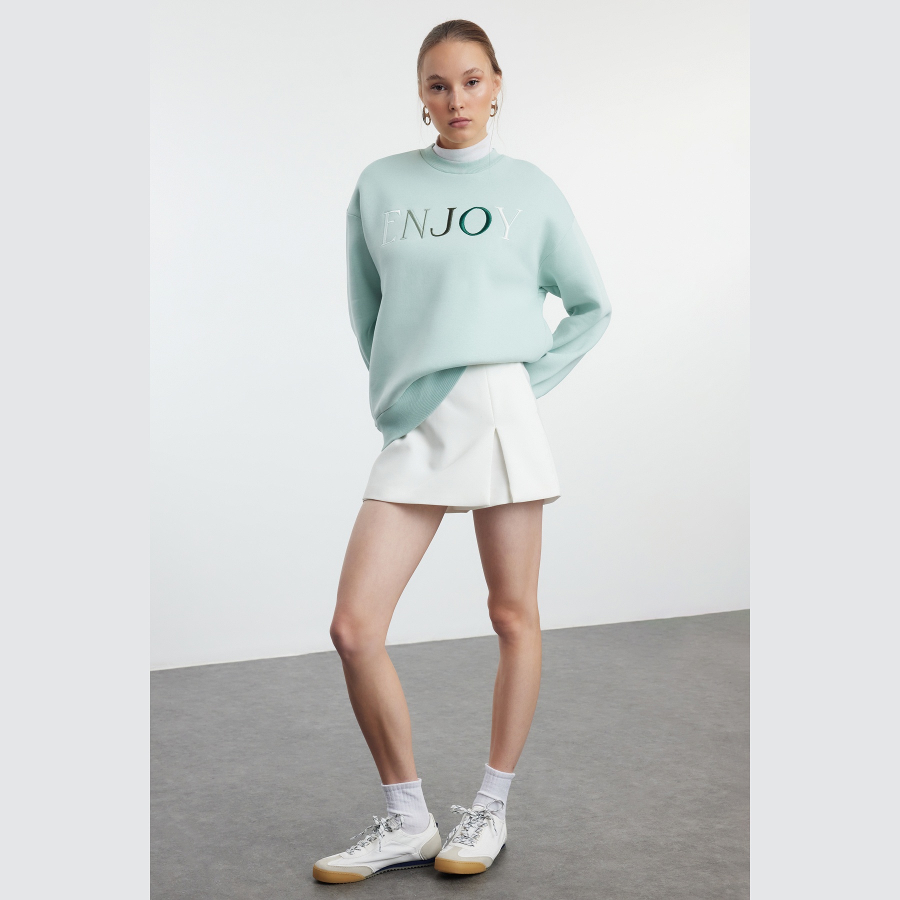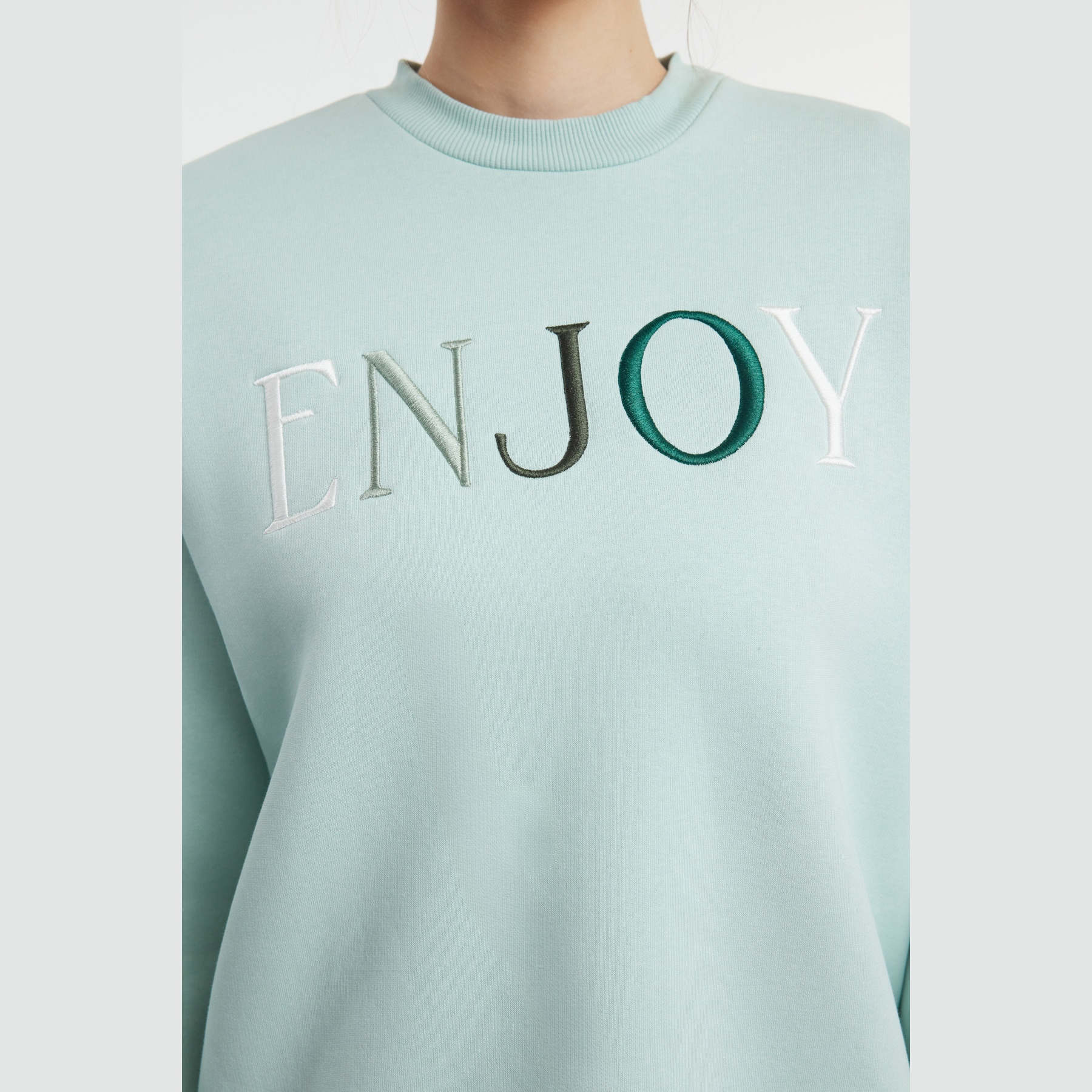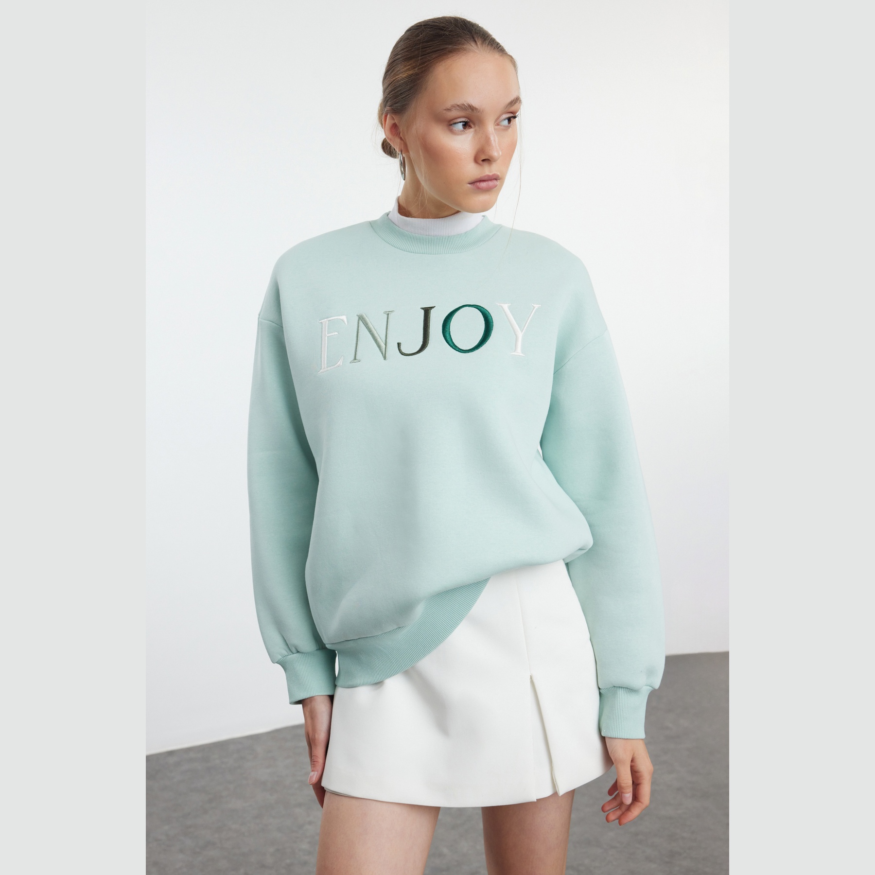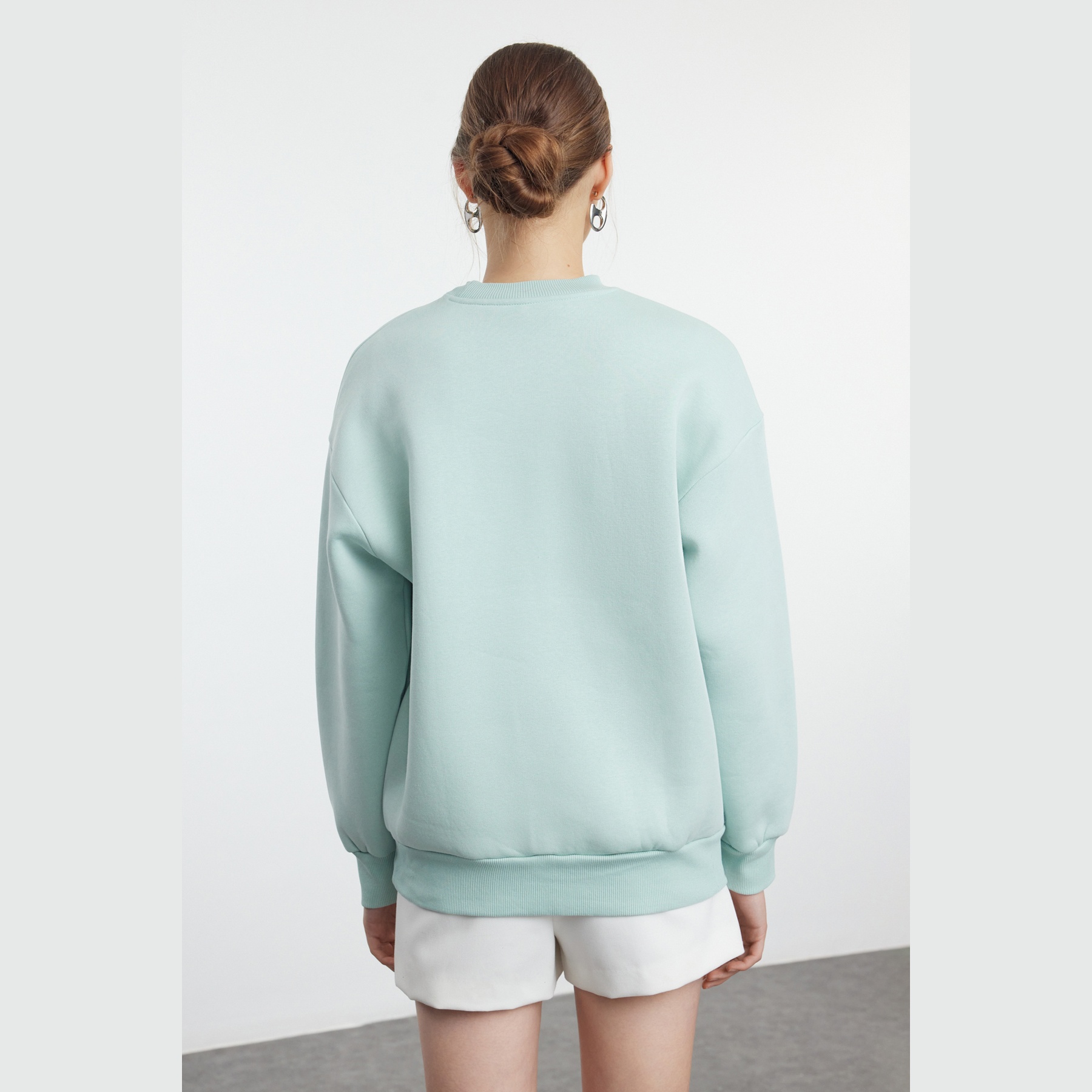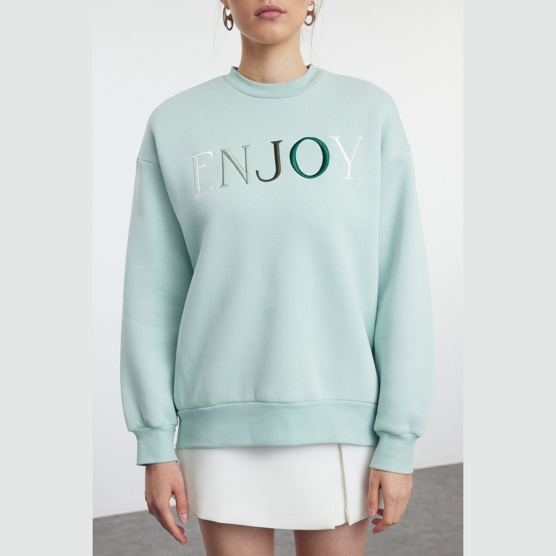 سويت شيرت نسائي – أخضر نعناعي بتطريز شعار وقصة واسعة (دفء شتوي بإطلالة كاجوال ناعمة)