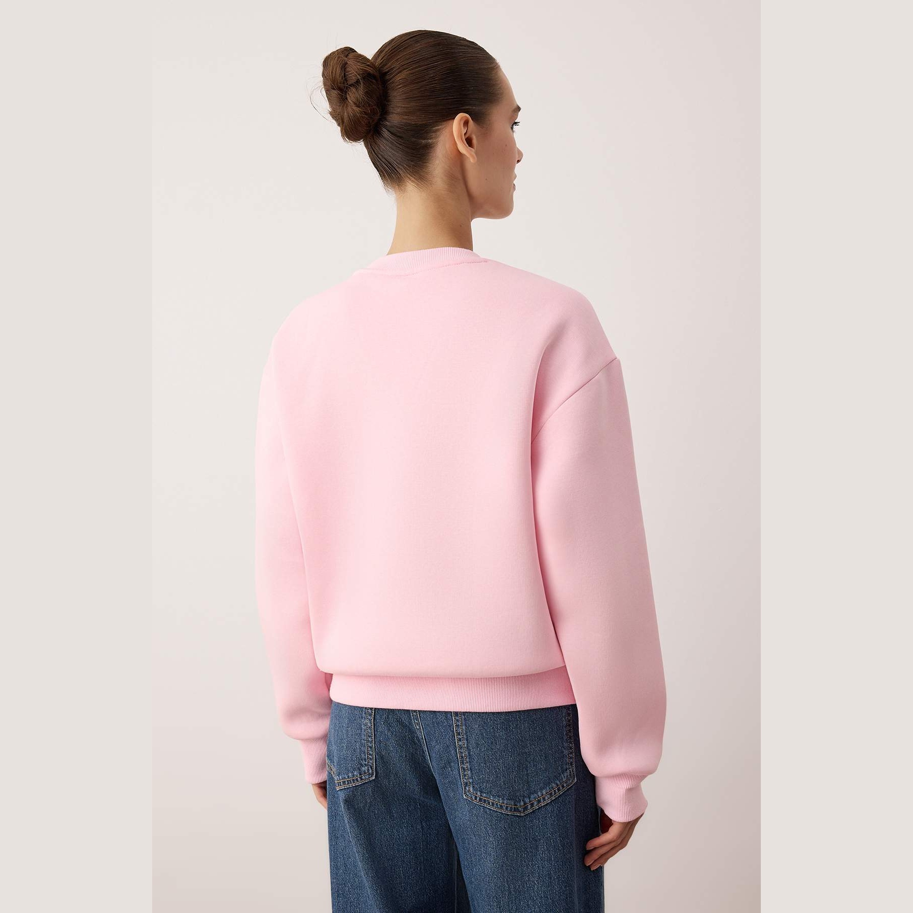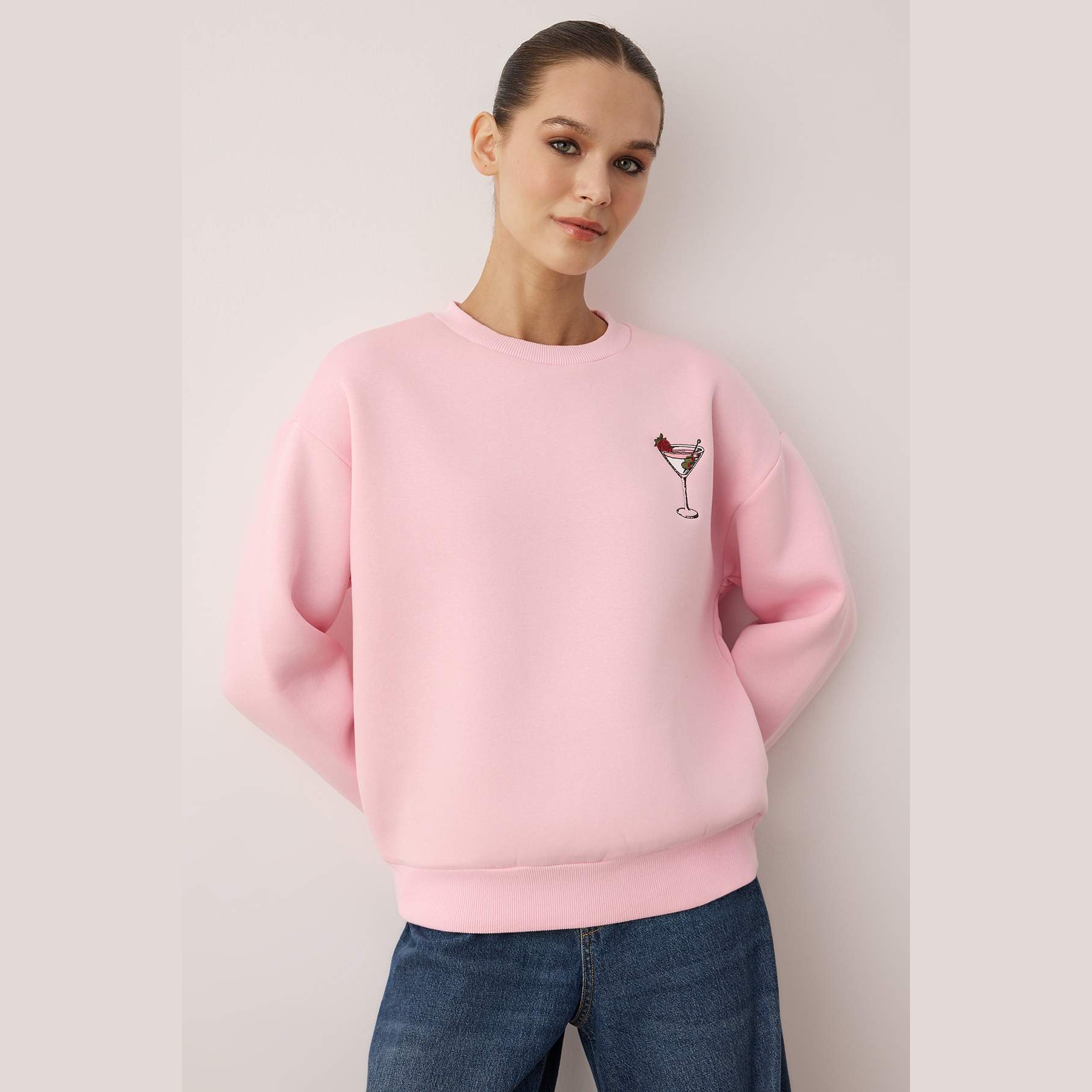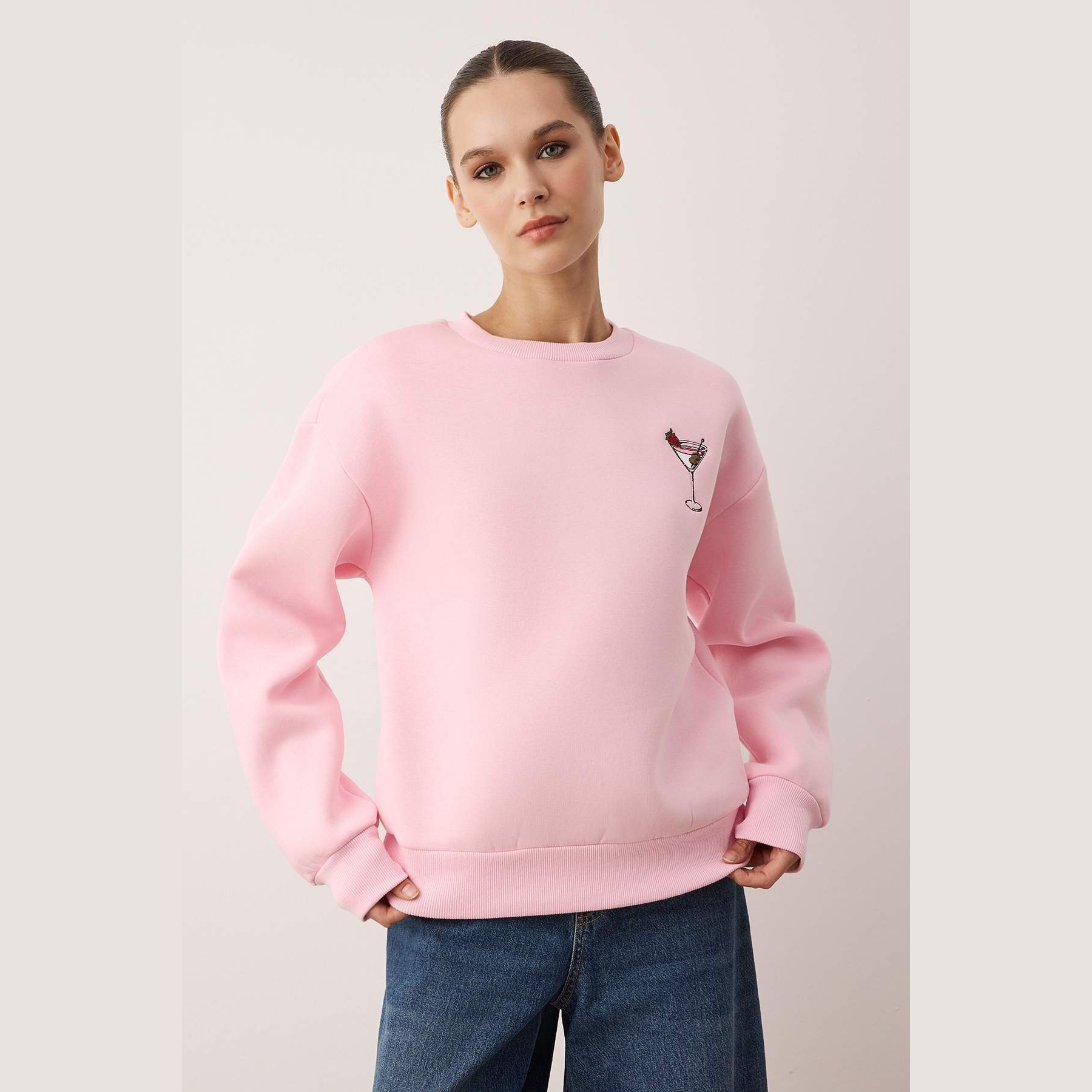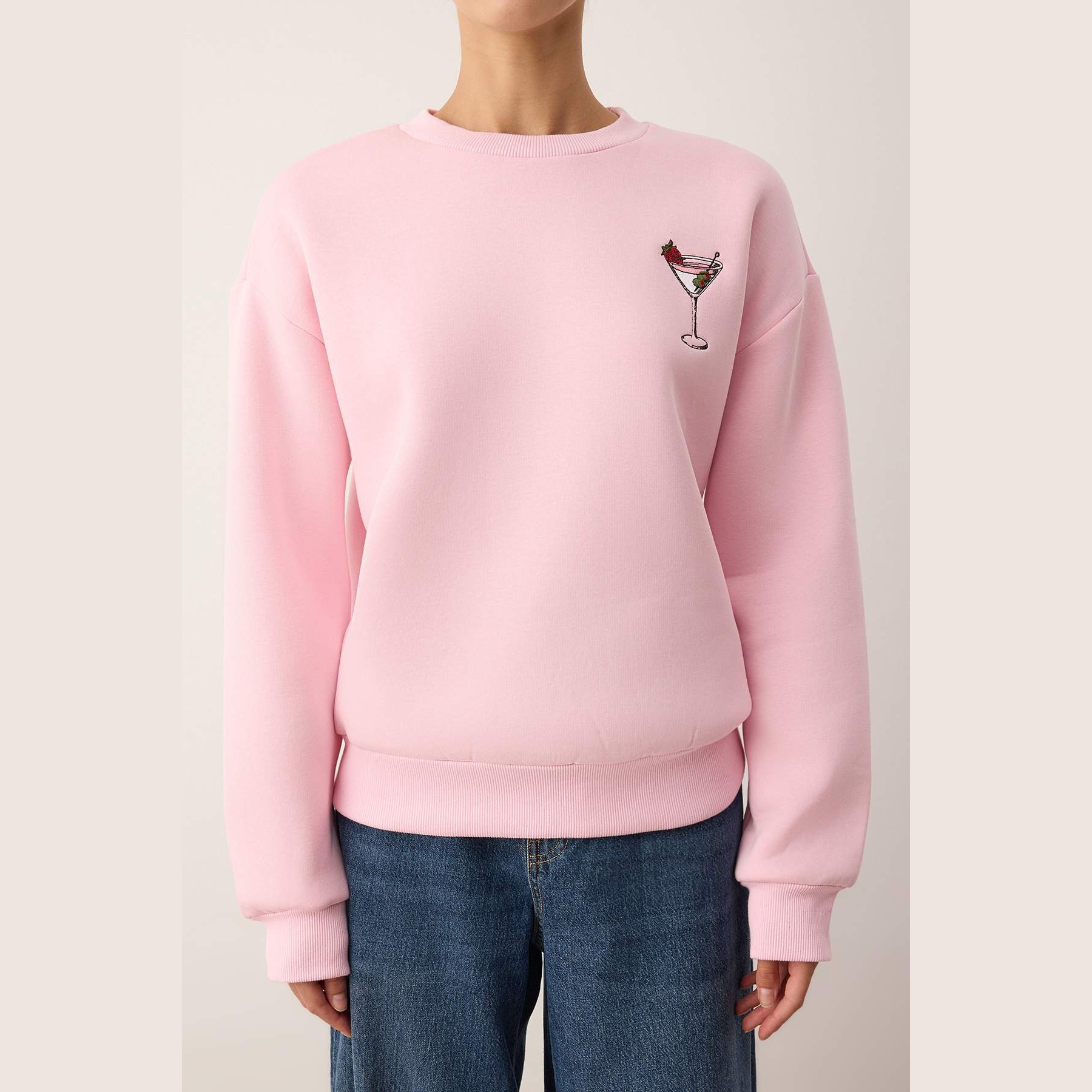 سويت شيرت نسائي – وردي فاتح بتطريز حيوانات وقصة منتظمة (دفء شتوي بإطلالة مرحة ناعمة)