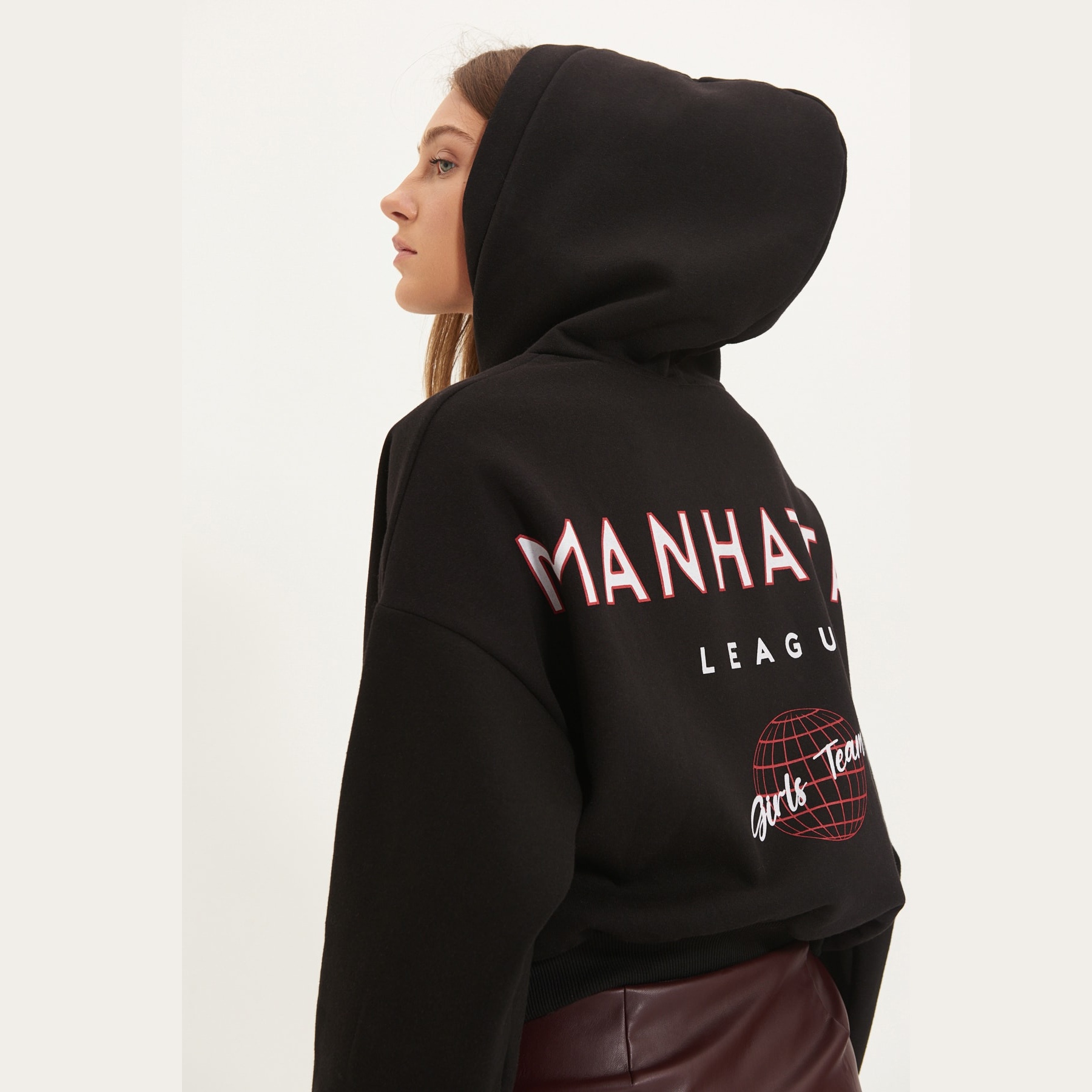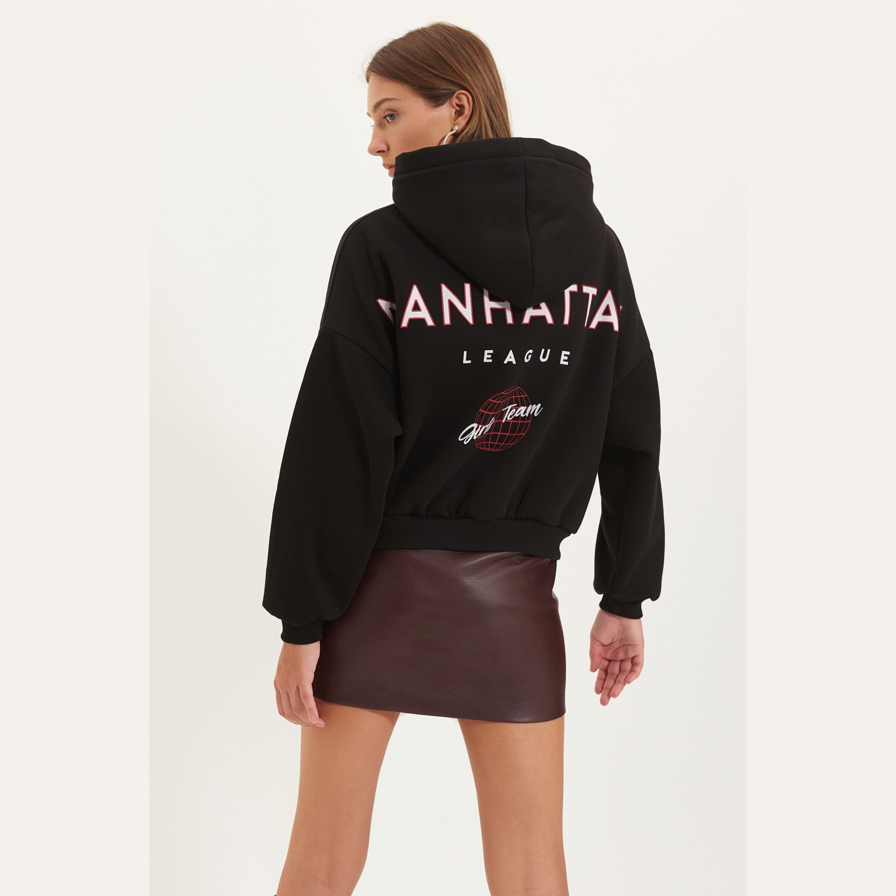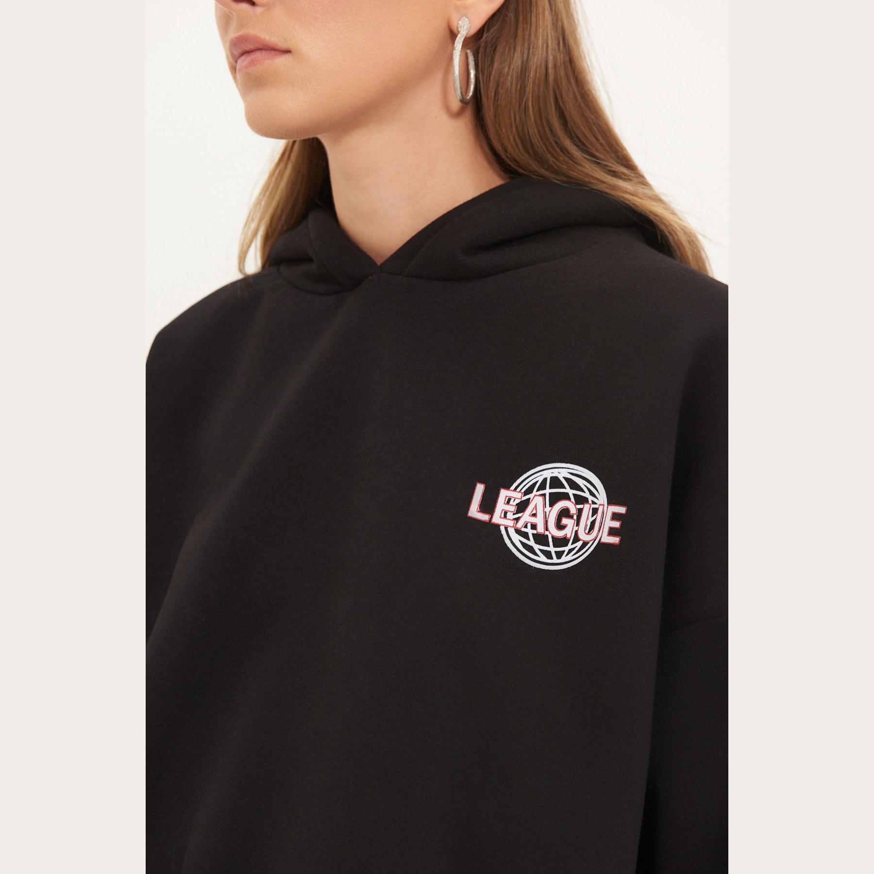 سويت شيرت نسائي بلون أسود، مصنوع من خامة محاكة بتركيبة ثنائية من القطن والبوليستر، يتميز بنسيج سميك داخلي مبطّن بطبقة فرو صناعي تمنح دفئًا فائقًا وراحة مثالية في الأجواء الشتوية. يأتي بقصة واسعة وياقة بغطاء رأس وأكمام طويلة بتصميم كتف منخفض، ويبرز بطباعة خلفية تضيف لمسة شبابية عصرية.