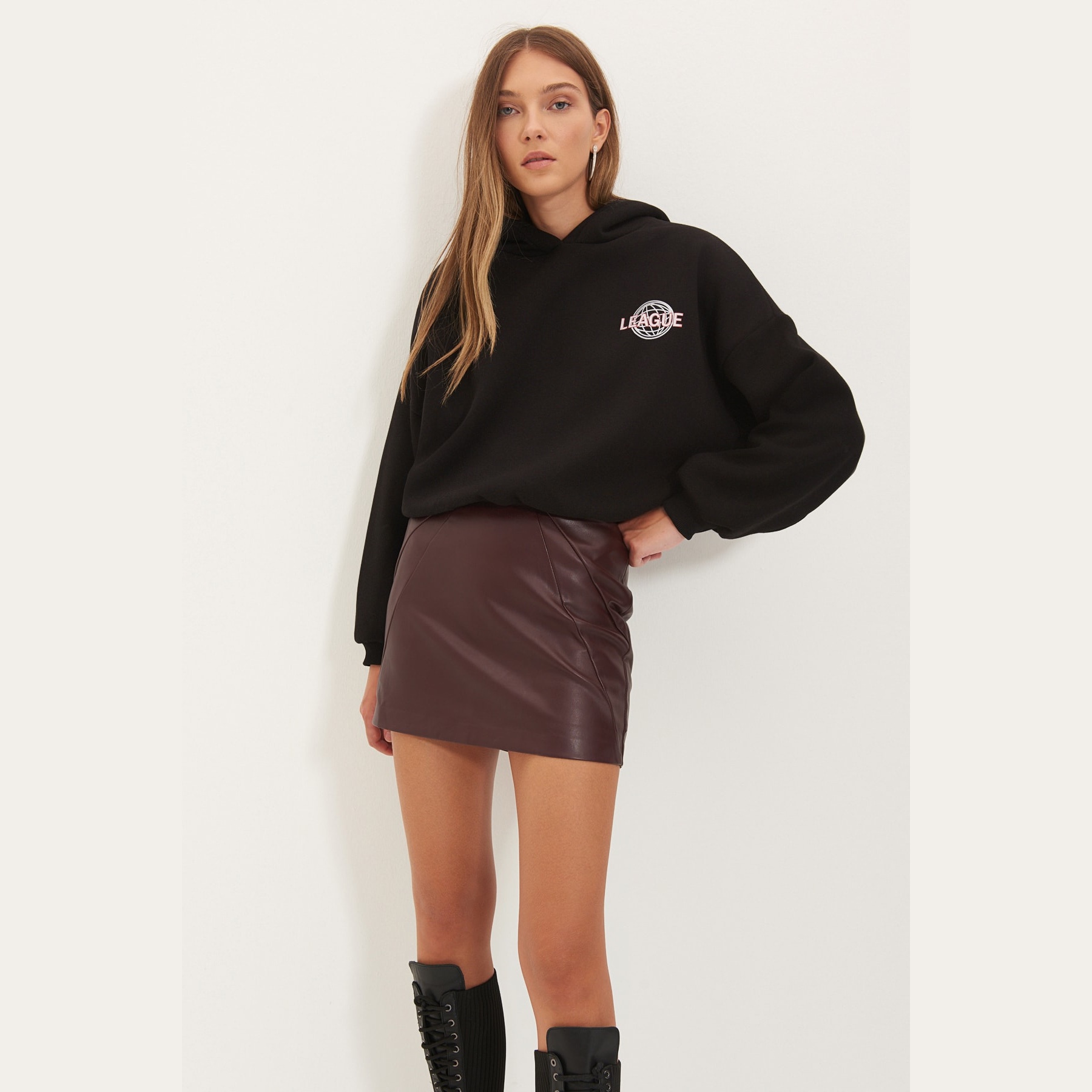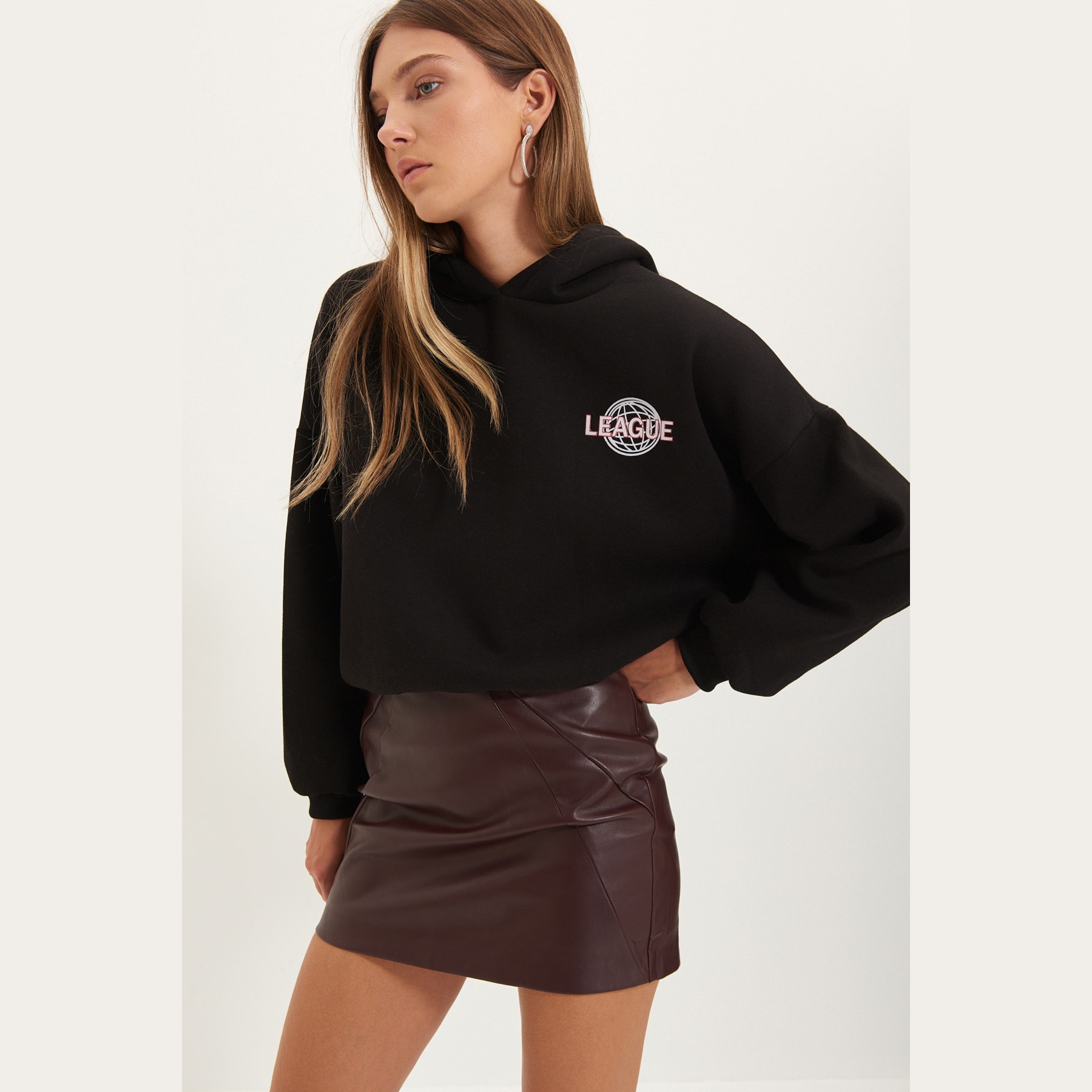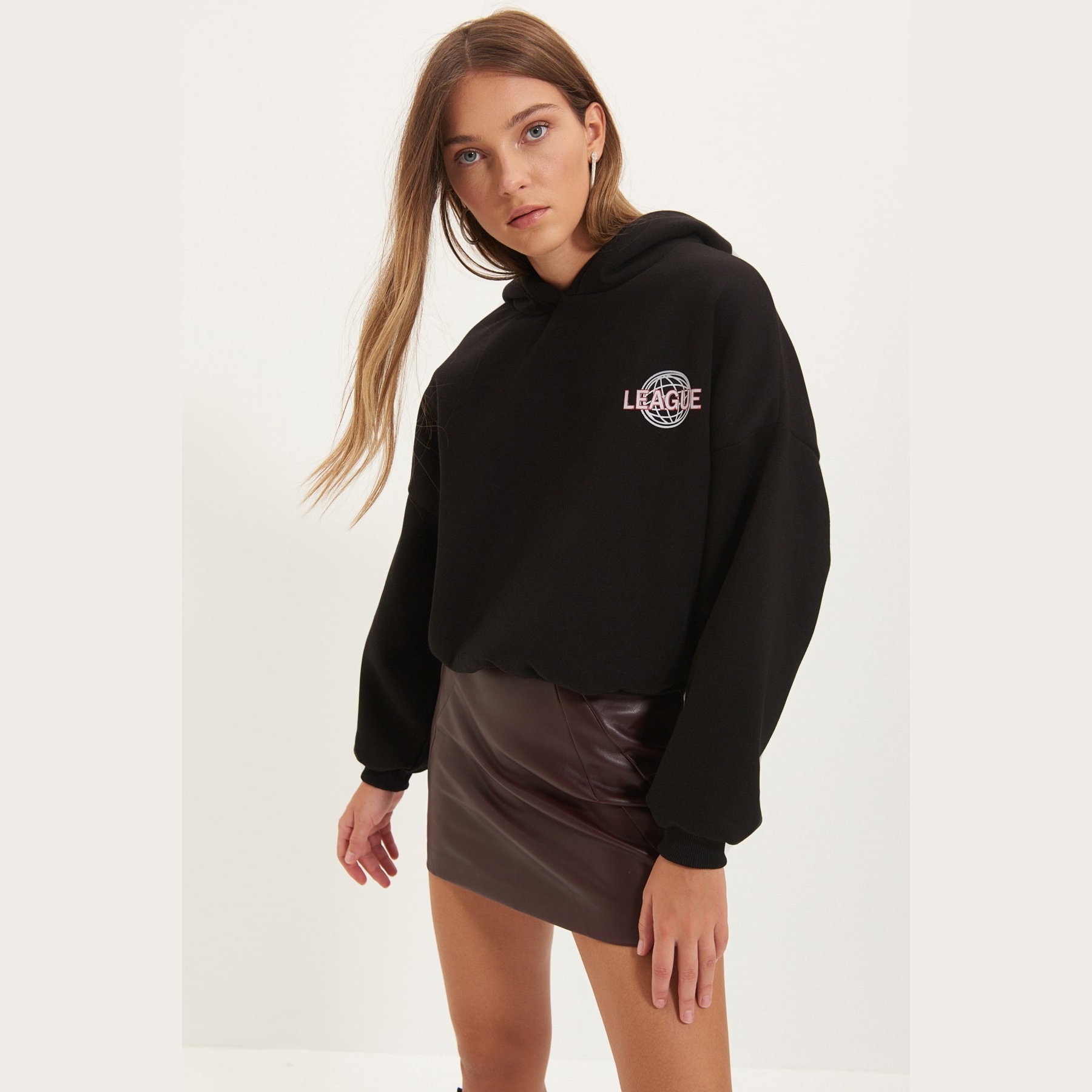 سويت شيرت نسائي بلون أسود، مصنوع من خامة محاكة بتركيبة ثنائية من القطن والبوليستر، يتميز بنسيج سميك داخلي مبطّن بطبقة فرو صناعي تمنح دفئًا فائقًا وراحة مثالية في الأجواء الشتوية. يأتي بقصة واسعة وياقة بغطاء رأس وأكمام طويلة بتصميم كتف منخفض، ويبرز بطباعة خلفية تضيف لمسة شبابية عصرية.