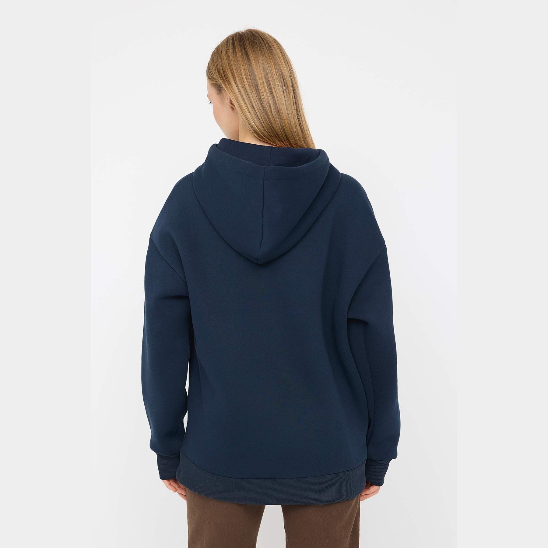 سويت شيرت تين بلون كحلي، مصنوع من خامة محاكة بتركيبة ثنائية من القطن والبوليستر، يتميز بنسيج شاردون ثلاثي الطبقات يمنح دفئًا فائقًا وراحة مثالية في الأجواء الشتوية. يأتي بقصة واسعة وياقة بغطاء رأس وأكمام طويلة بتصميم كتف منخفض، ويبرز بتطريز شعار بسيط يمنح لمسة شبابية عملية.