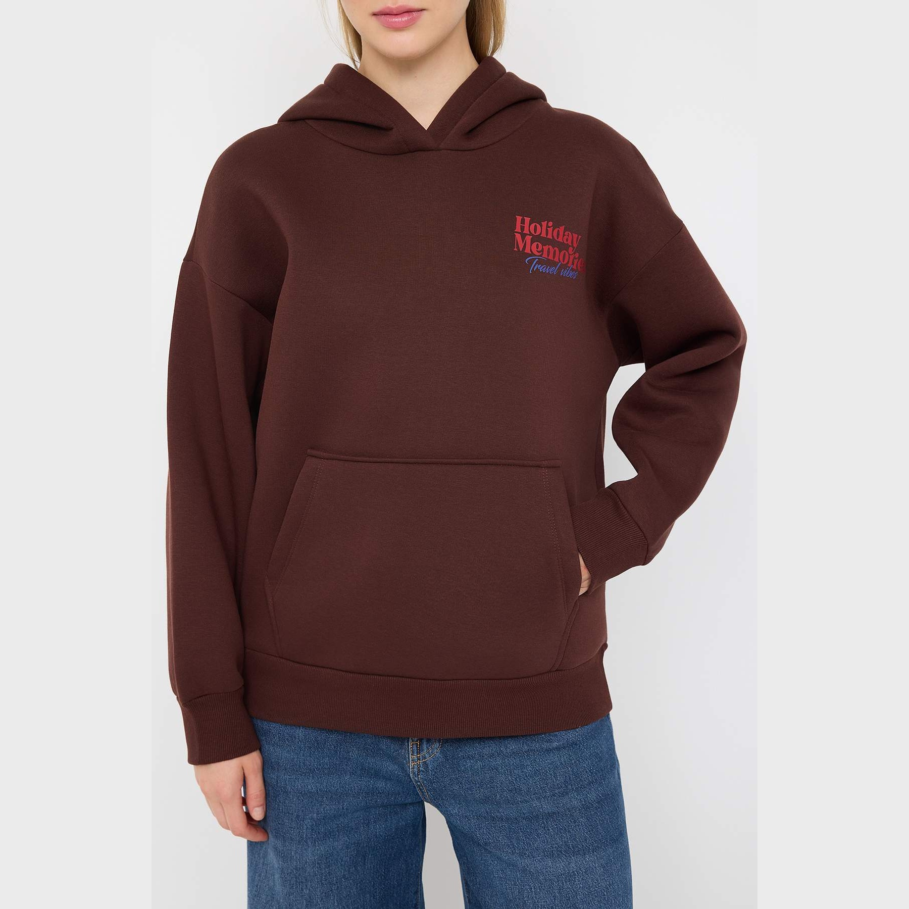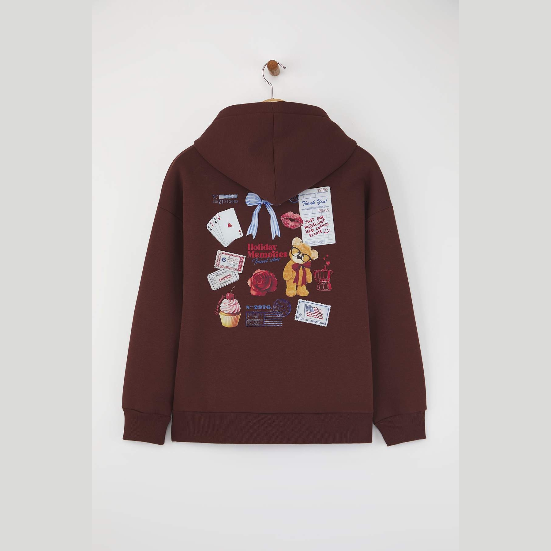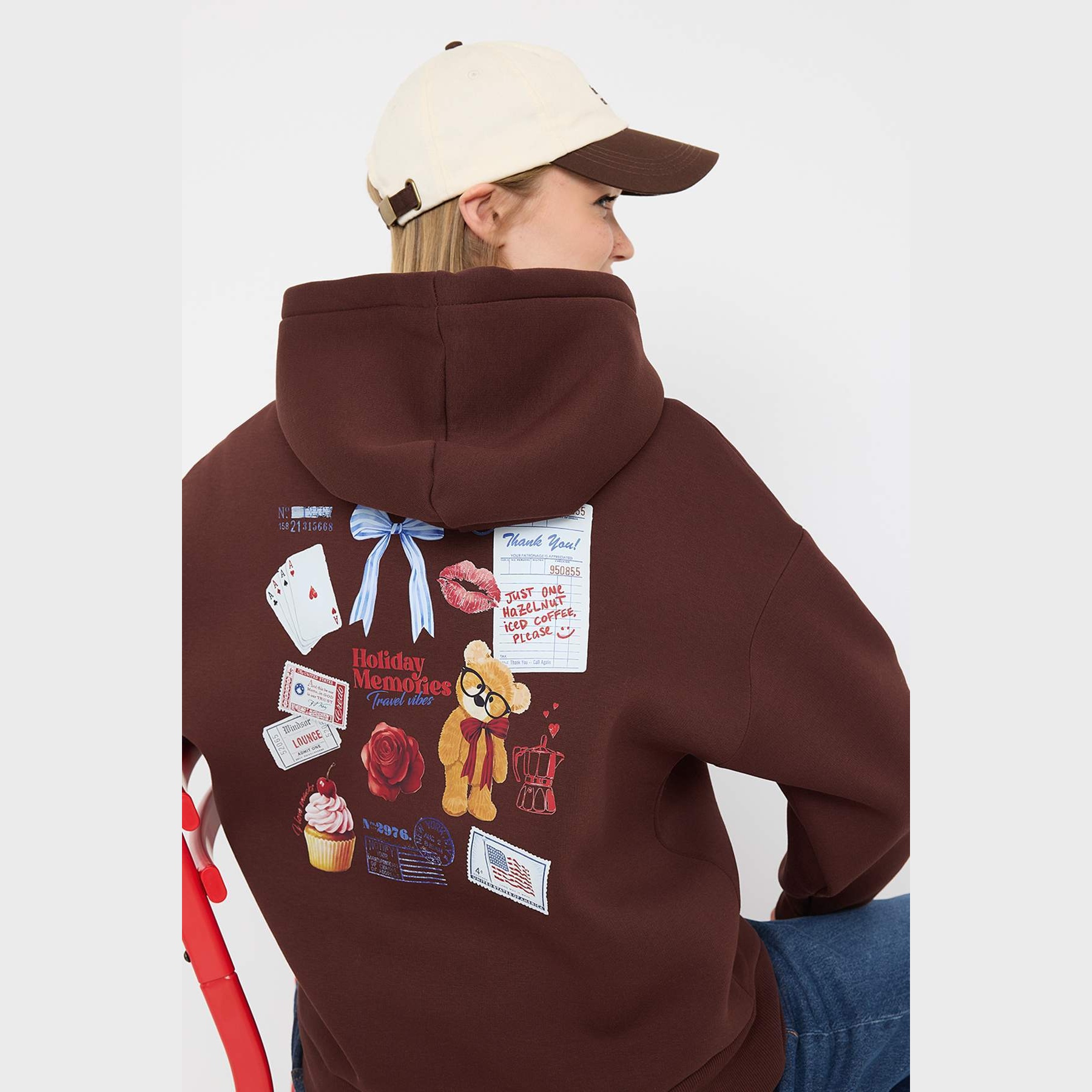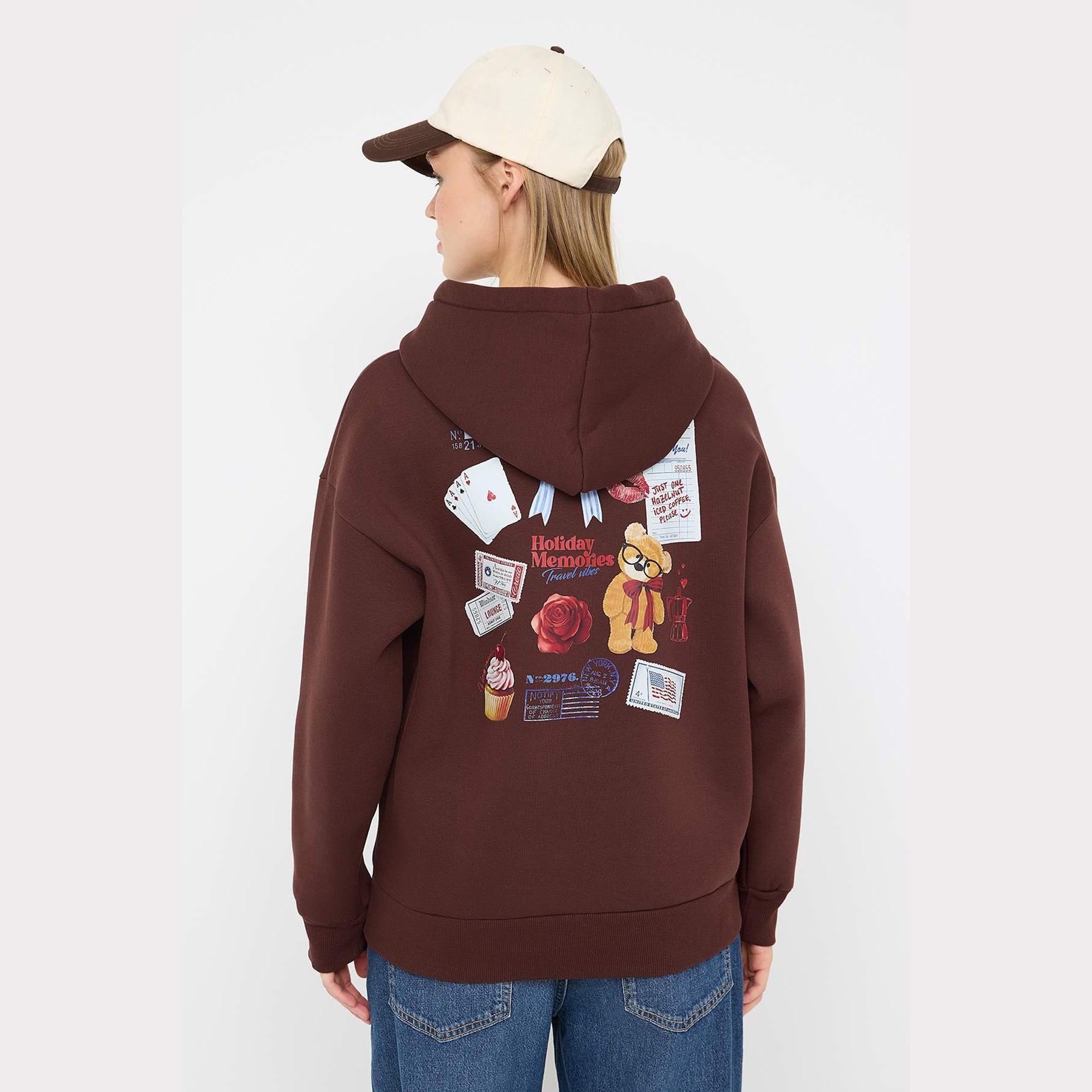 سويت شيرت تين – بني بطباعة خلفية وغطاء رأس وقصة واسعة (دفء شتوي بإطلالة شبابية عملية)