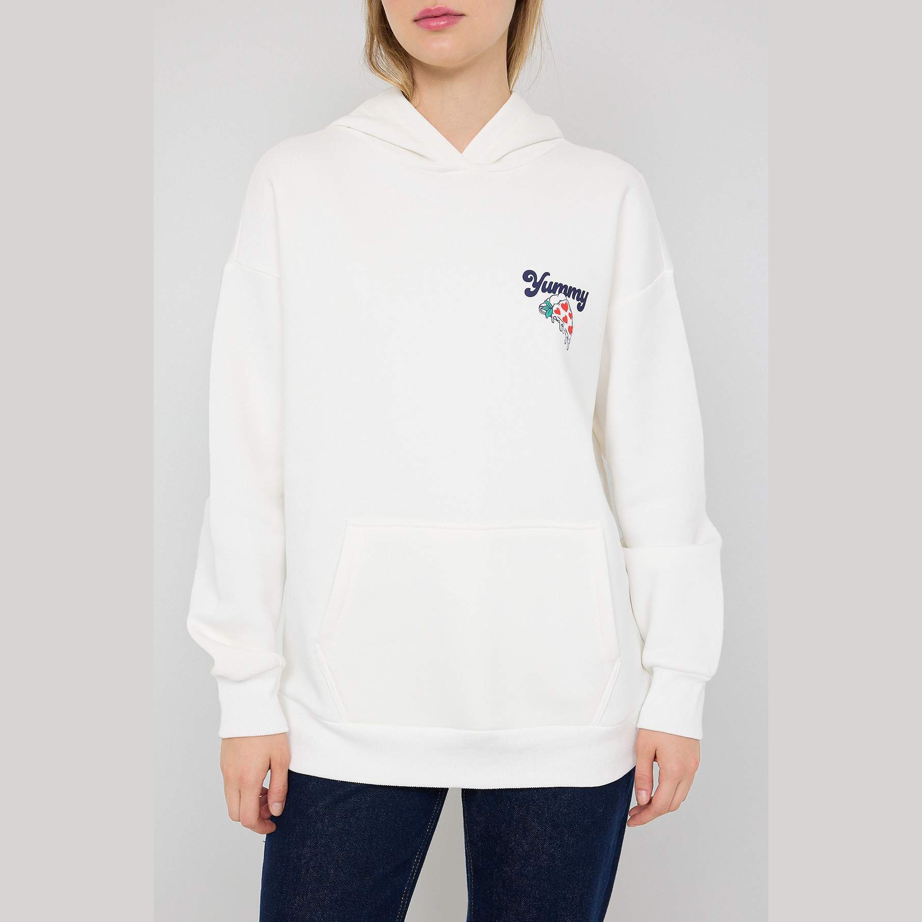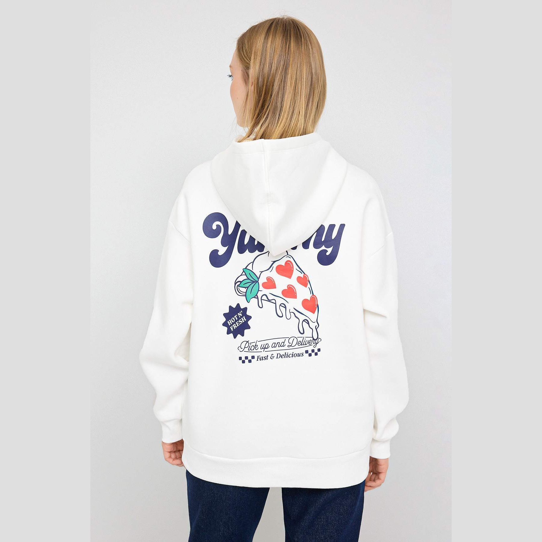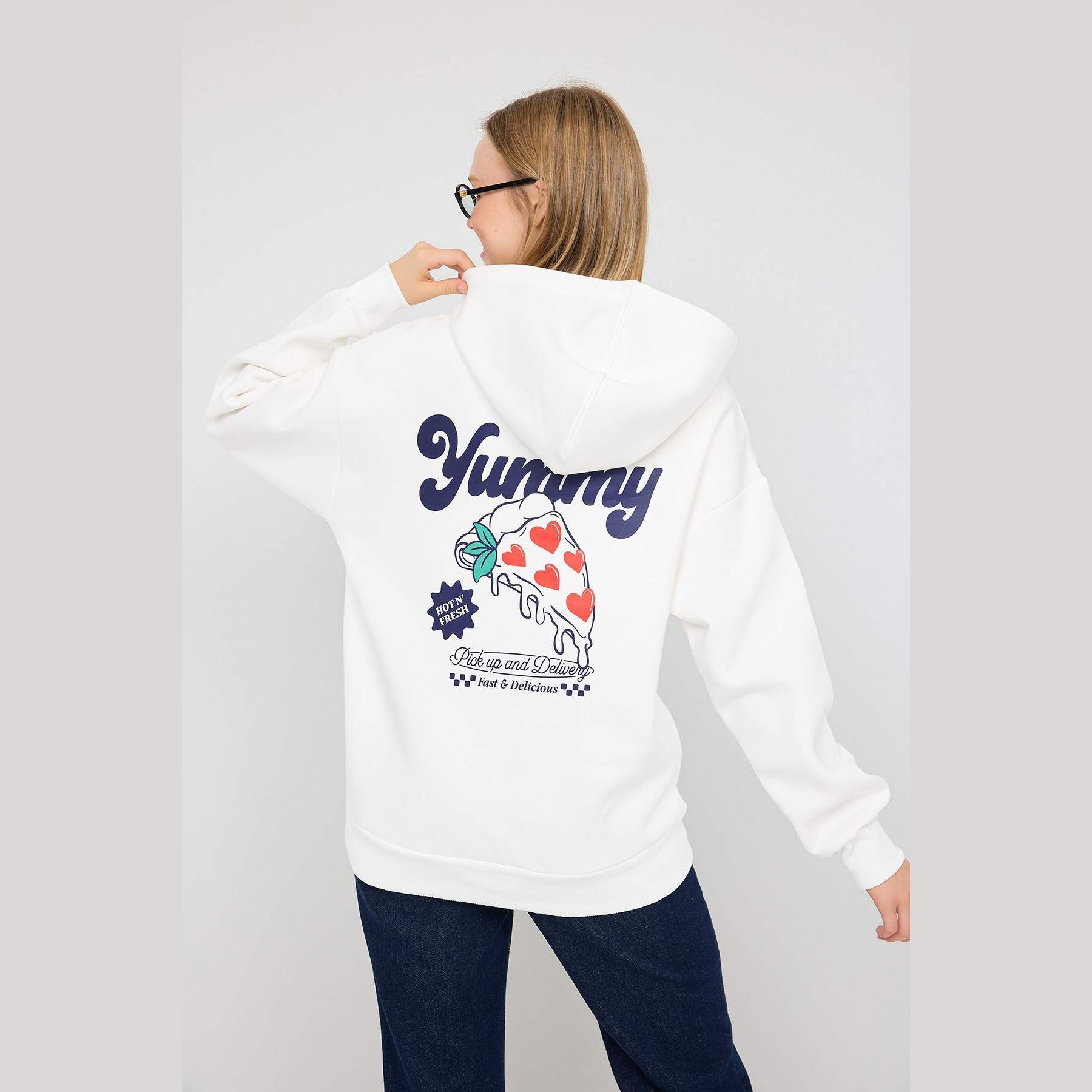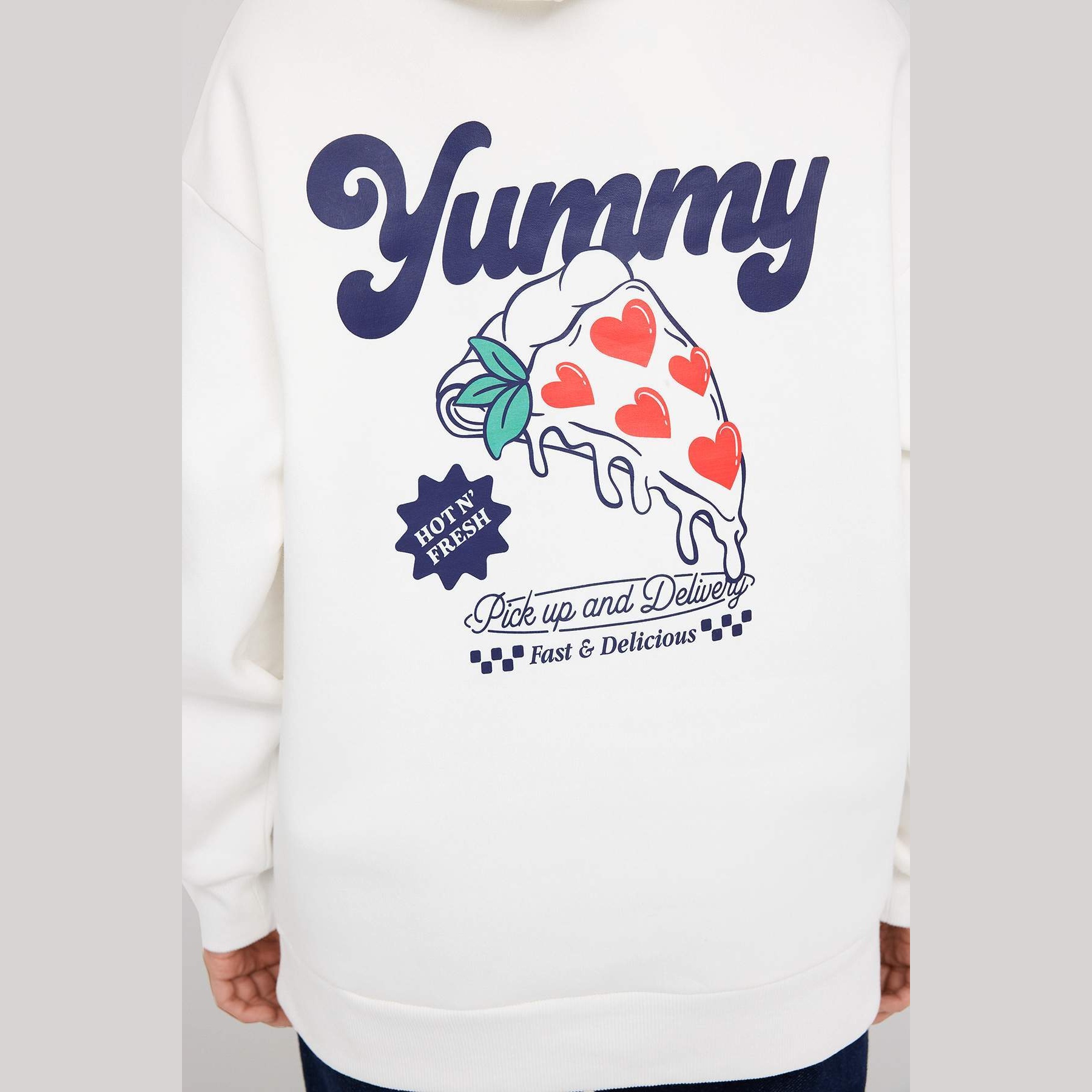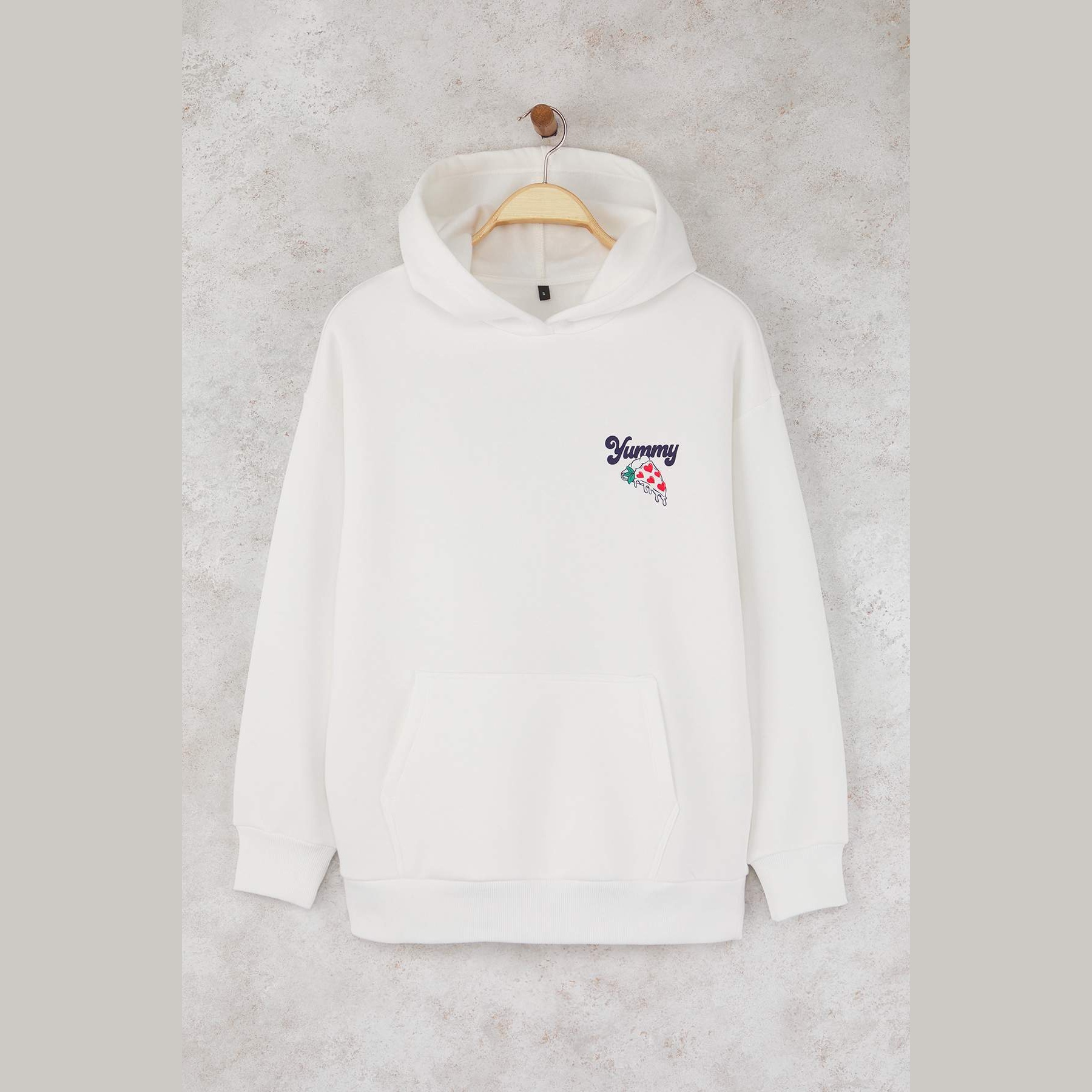 سويت شيرت تين – أوف وايت بطباعة خلفية وغطاء رأس وقصة واسعة (دفء شتوي بإطلالة شبابية عملية)
