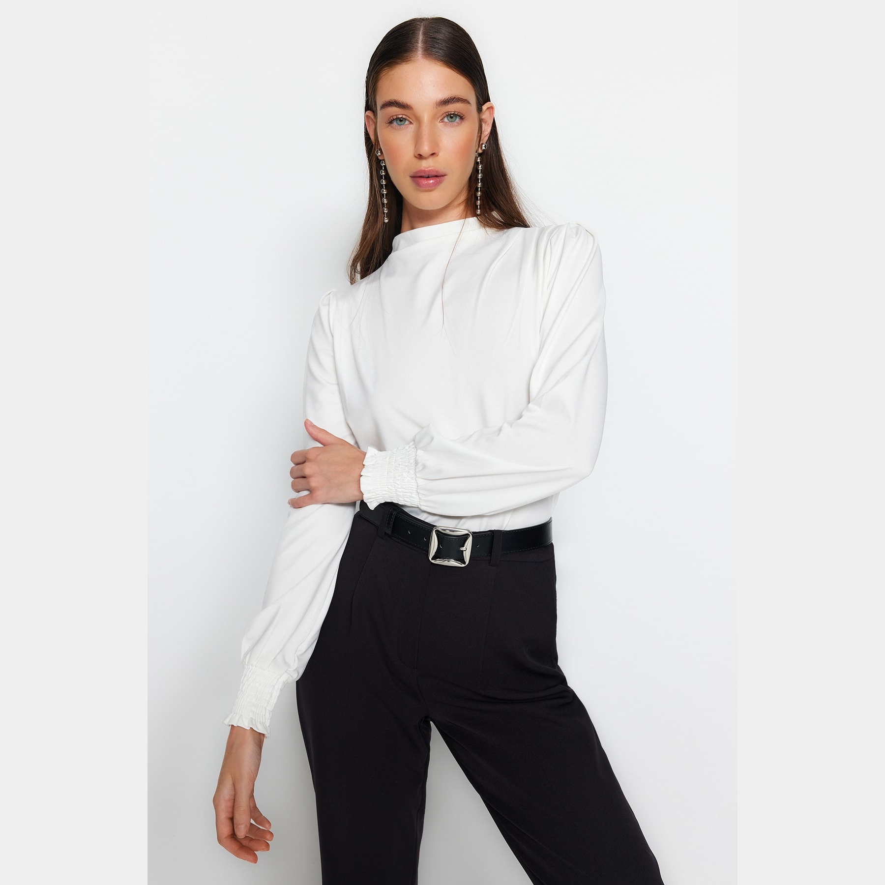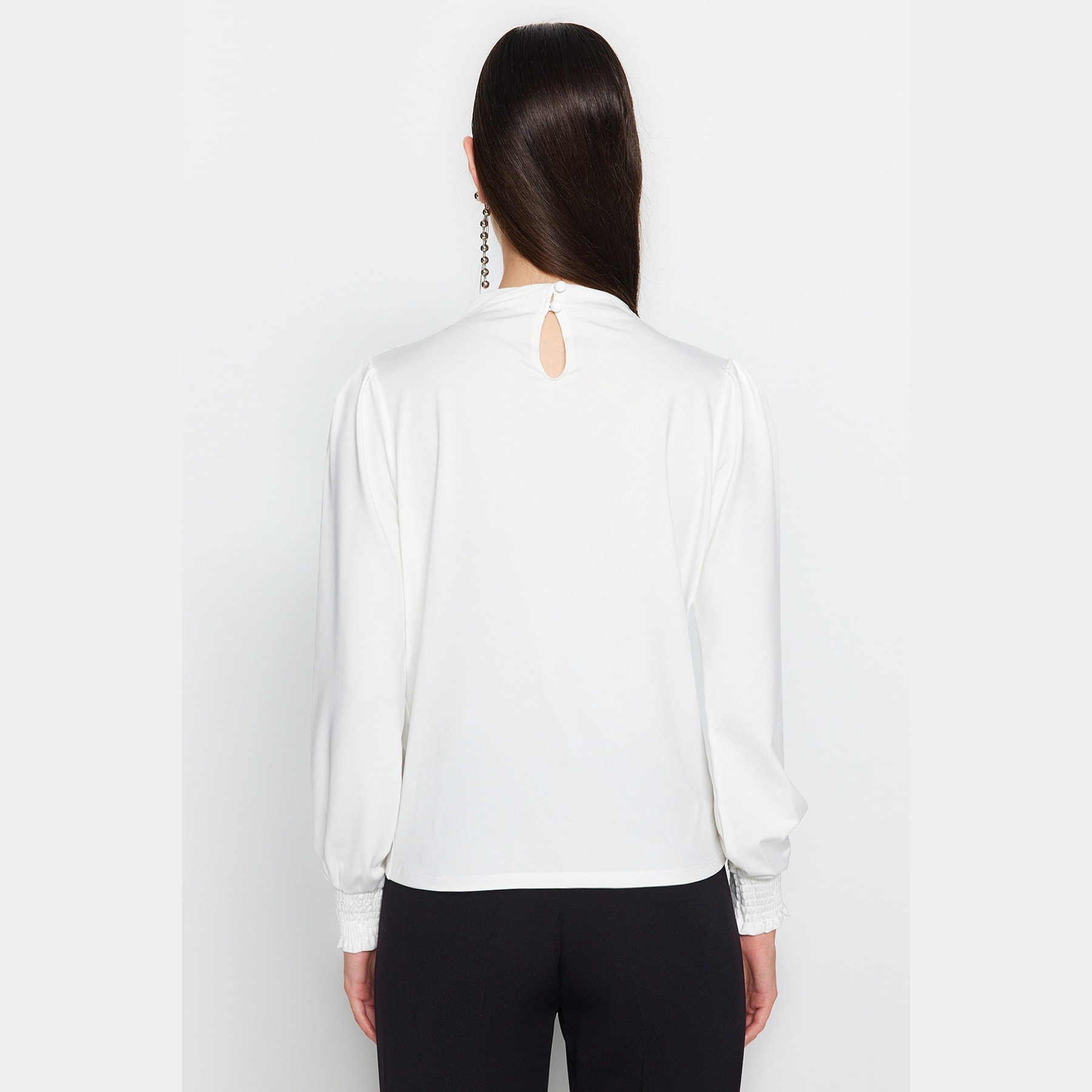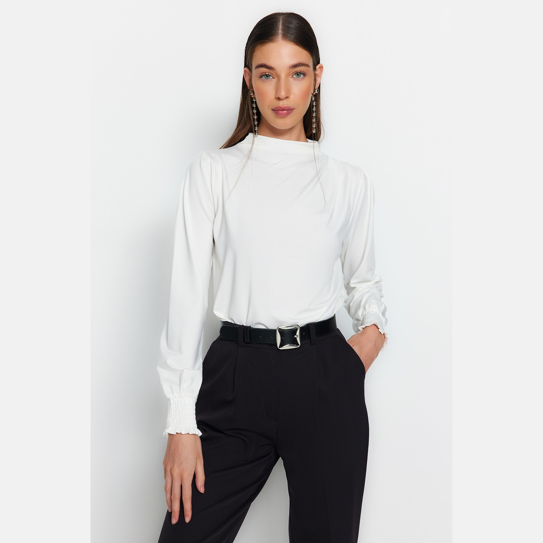بلوزة نسائية بلون أوف وايت، مصنوعة من خامة محاكة مرنة بتركيبة من البوليستر والإيلاستان، تمنح راحة مثالية وملمسًا ناعمًا على البشرة. تأتي بقصة منتظمة وياقة مرتفعة وأكمام طويلة، وتتميز بتفاصيل مطاطية عند الأطراف تضيف لمسة أنثوية عملية.